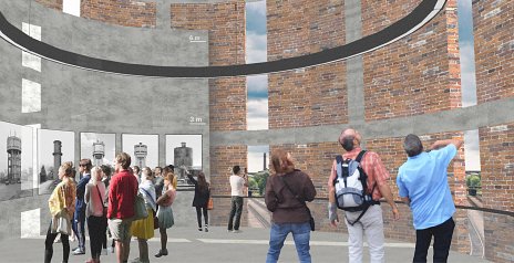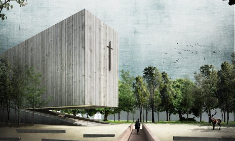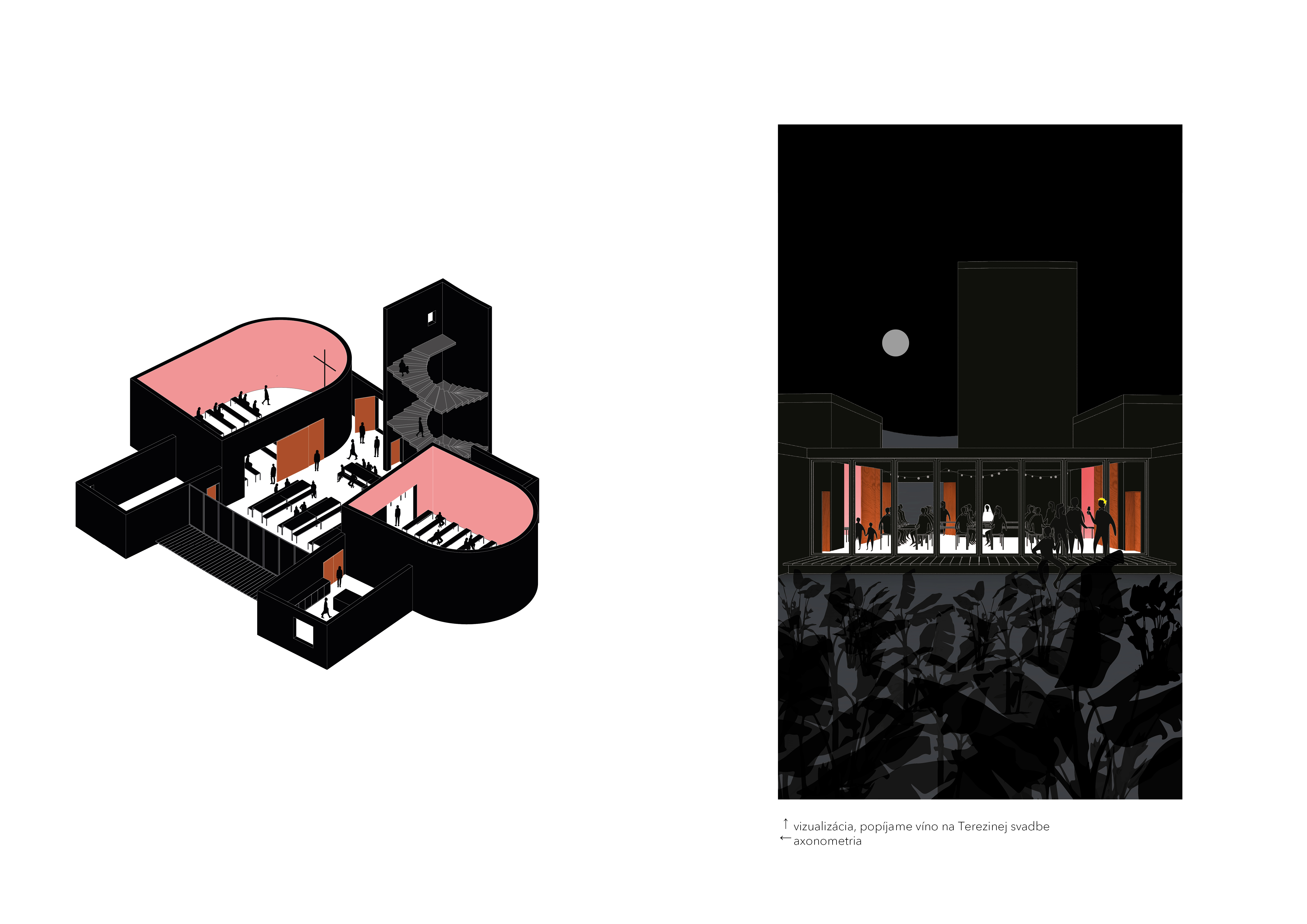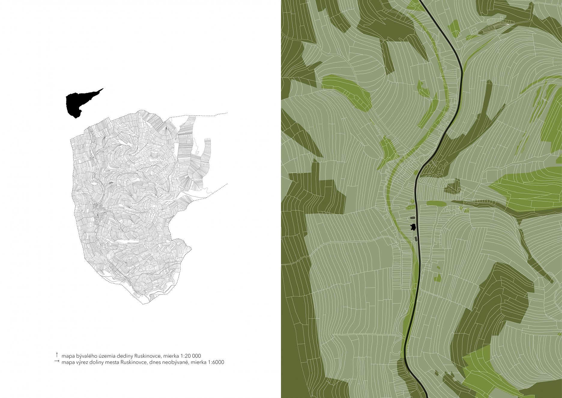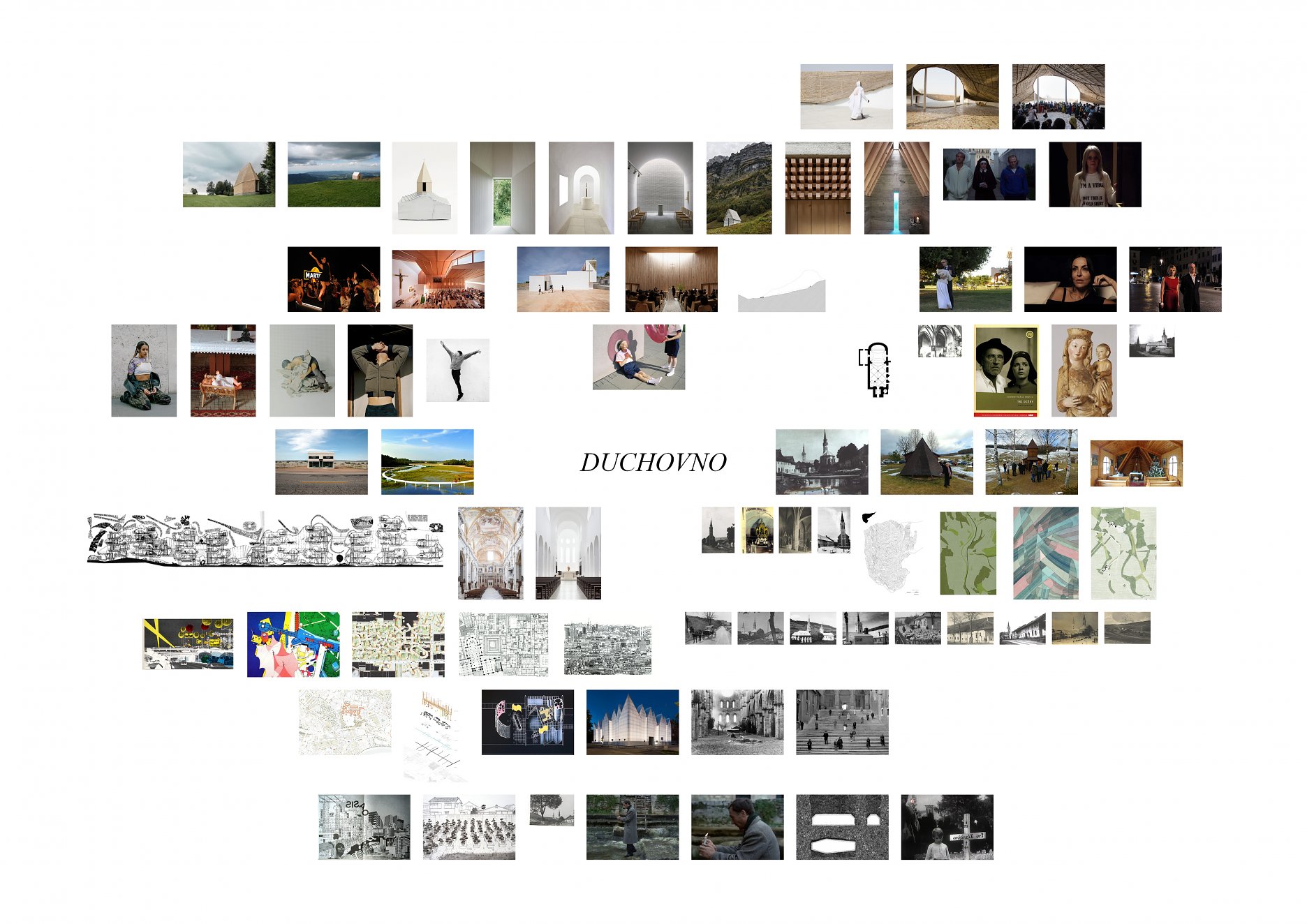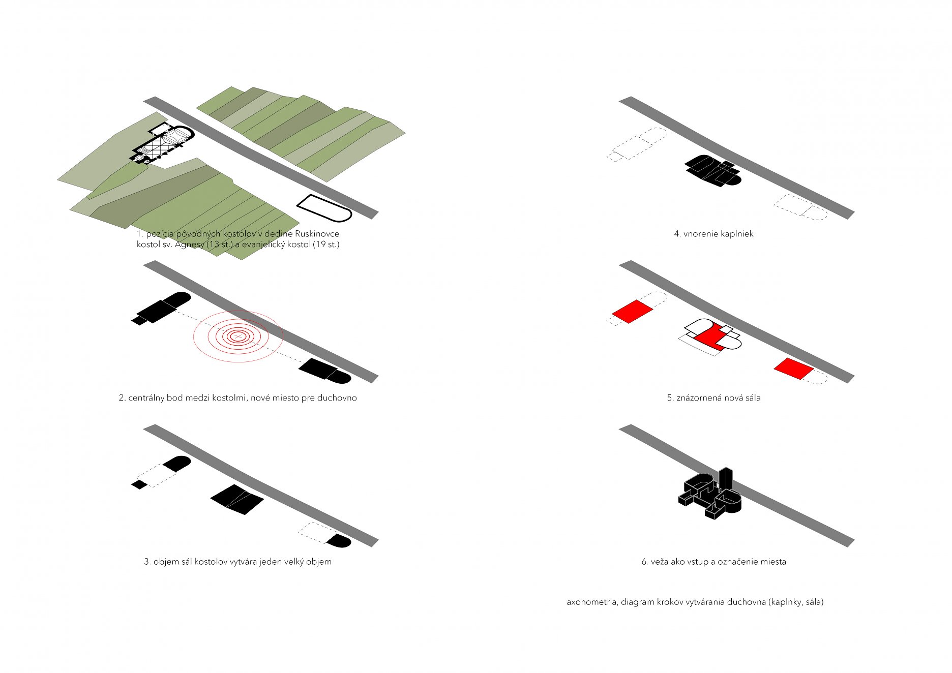 Čo je to duchovno? Spomienka na dedinu, ktorá už neexistuje , spomienka na nedeľnú omšu v kostole Sv. Agnesy zo 13. storočia. Nič dnes neostalo len pustatina. Ako sa zachovať k takému miestu? Ruskinovce mali kedysi dva kostoly, nedávam prednosť žiadnemu, uvažujem nad spomienkou stretnutia. Objemy hlavných lodí oboch kostolov vrážam do seba, vytváram sálu, miesto stretnutia. Spomienka spôsobuje nejasnosť, nekonkrétnosť, nepamätám si už na presné hmoty kostolov preto ich prinavraciam len ako jednoduchý objem kaplniek, ktoré vnárajú do objemu sály. Pridávam vežu ale len jednu na označenie vstupu a na označenie bodu kde kedysi stálo malé mesto. Dnes sa tu dejú oslavy, svadby, stretnutia, kary (umrieť tam kde som sa narodil).