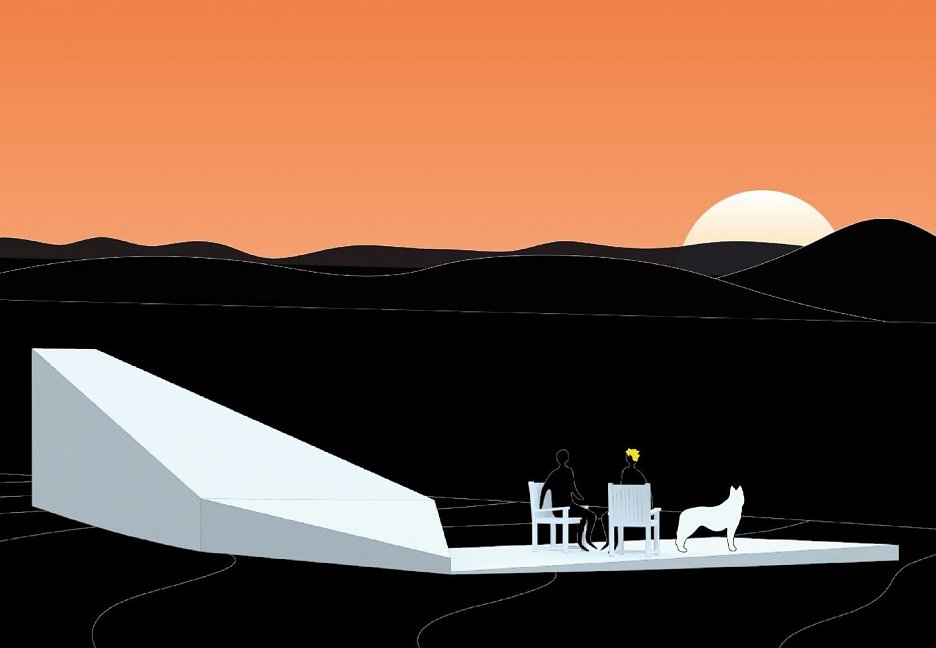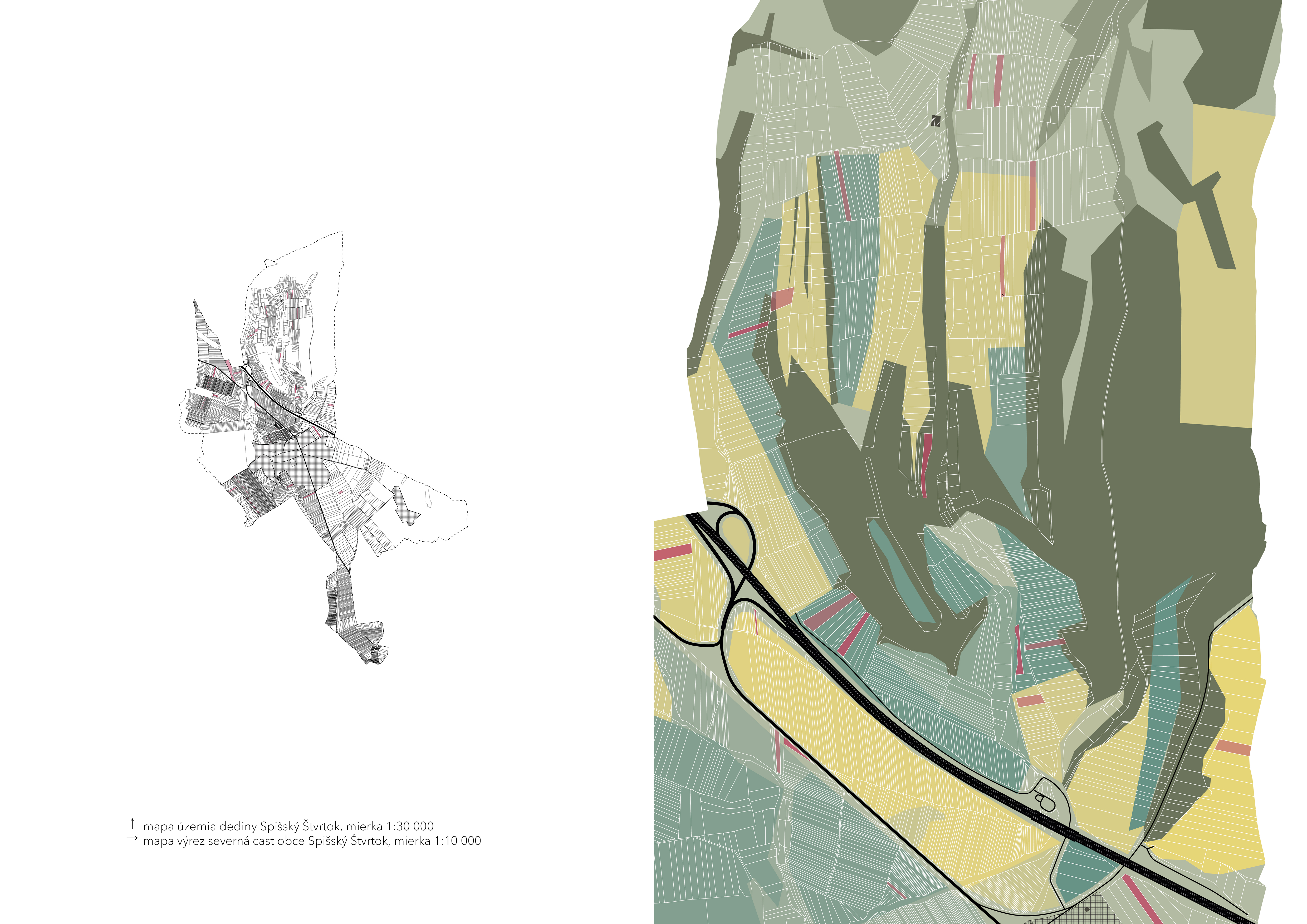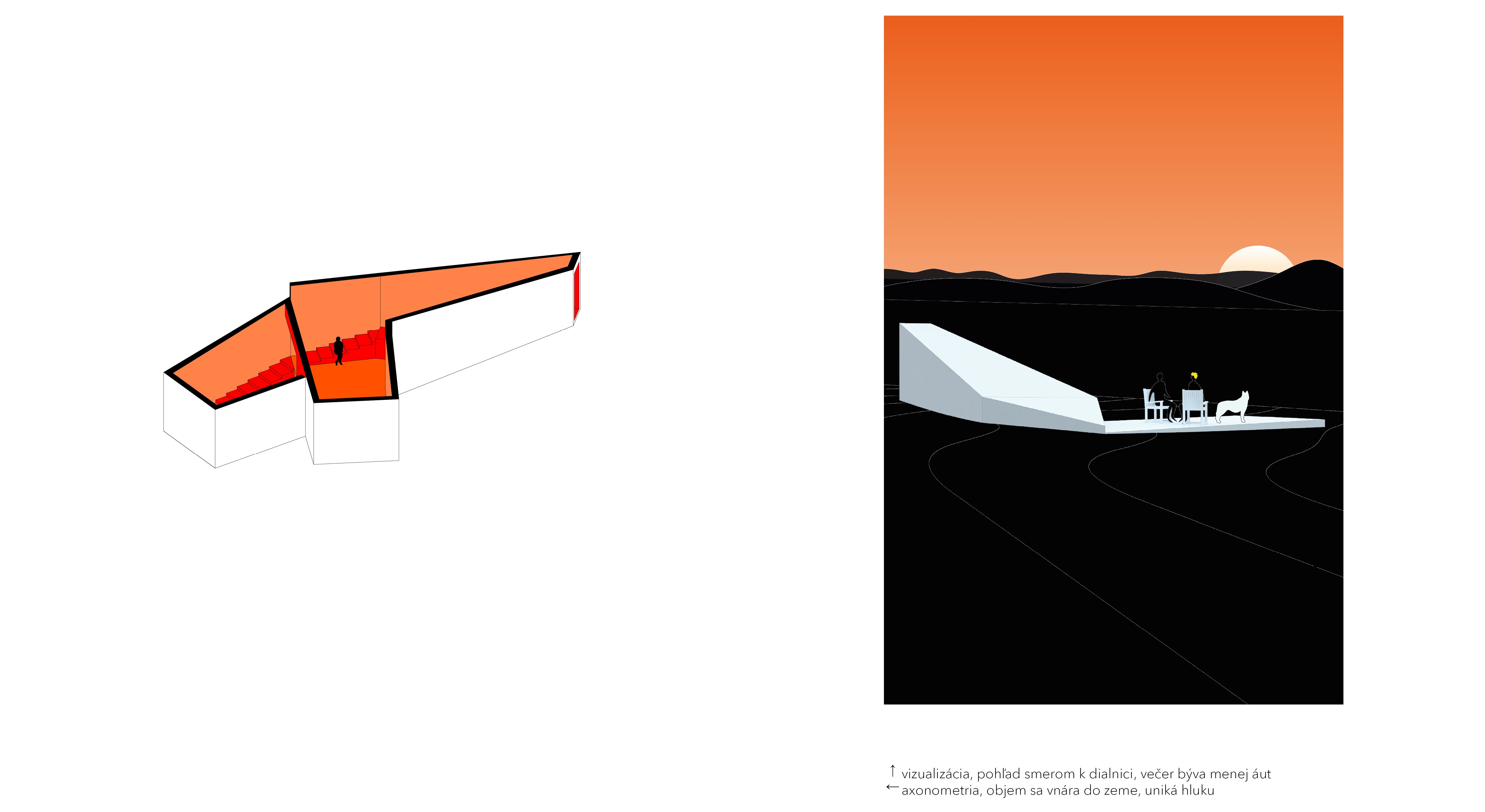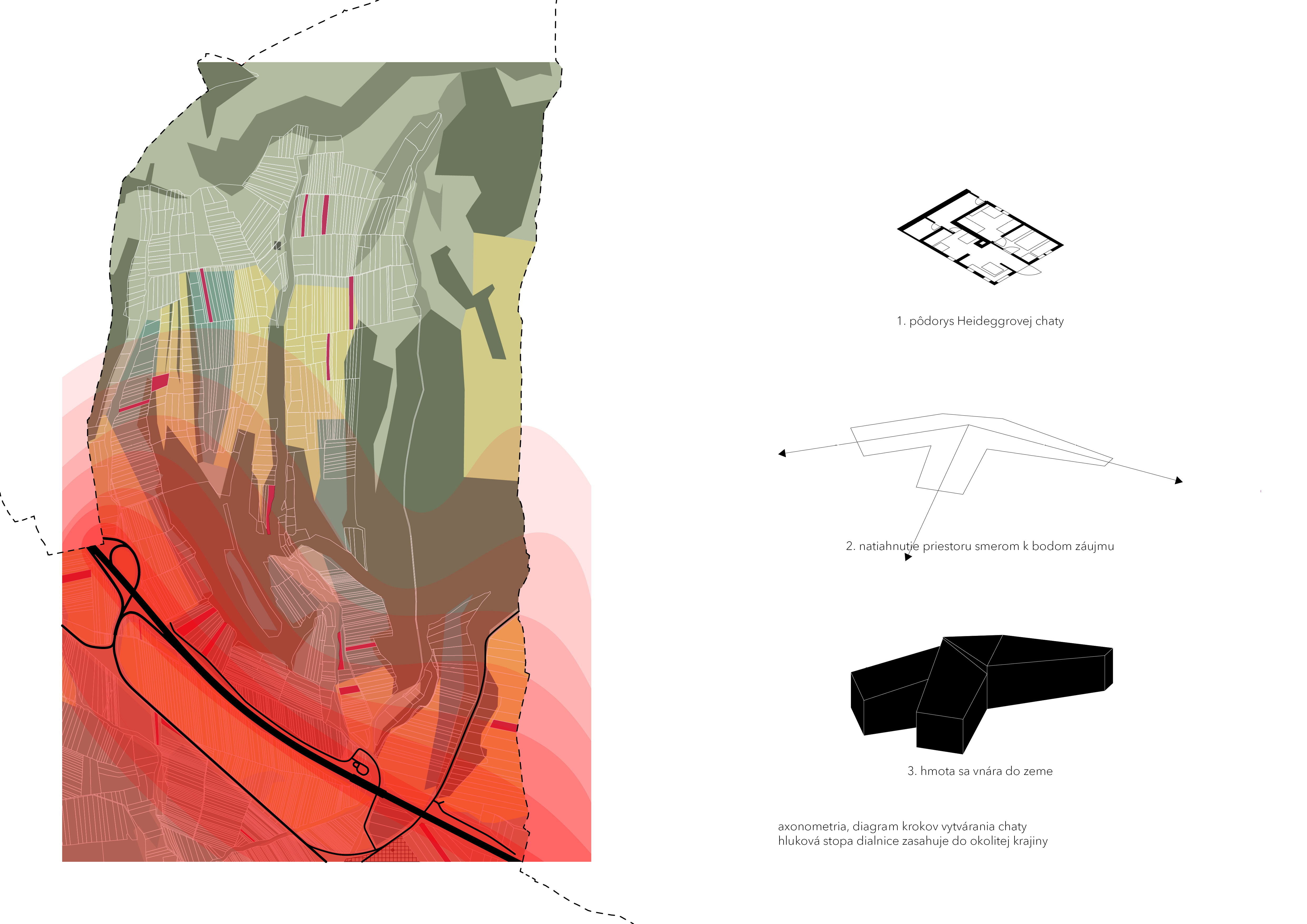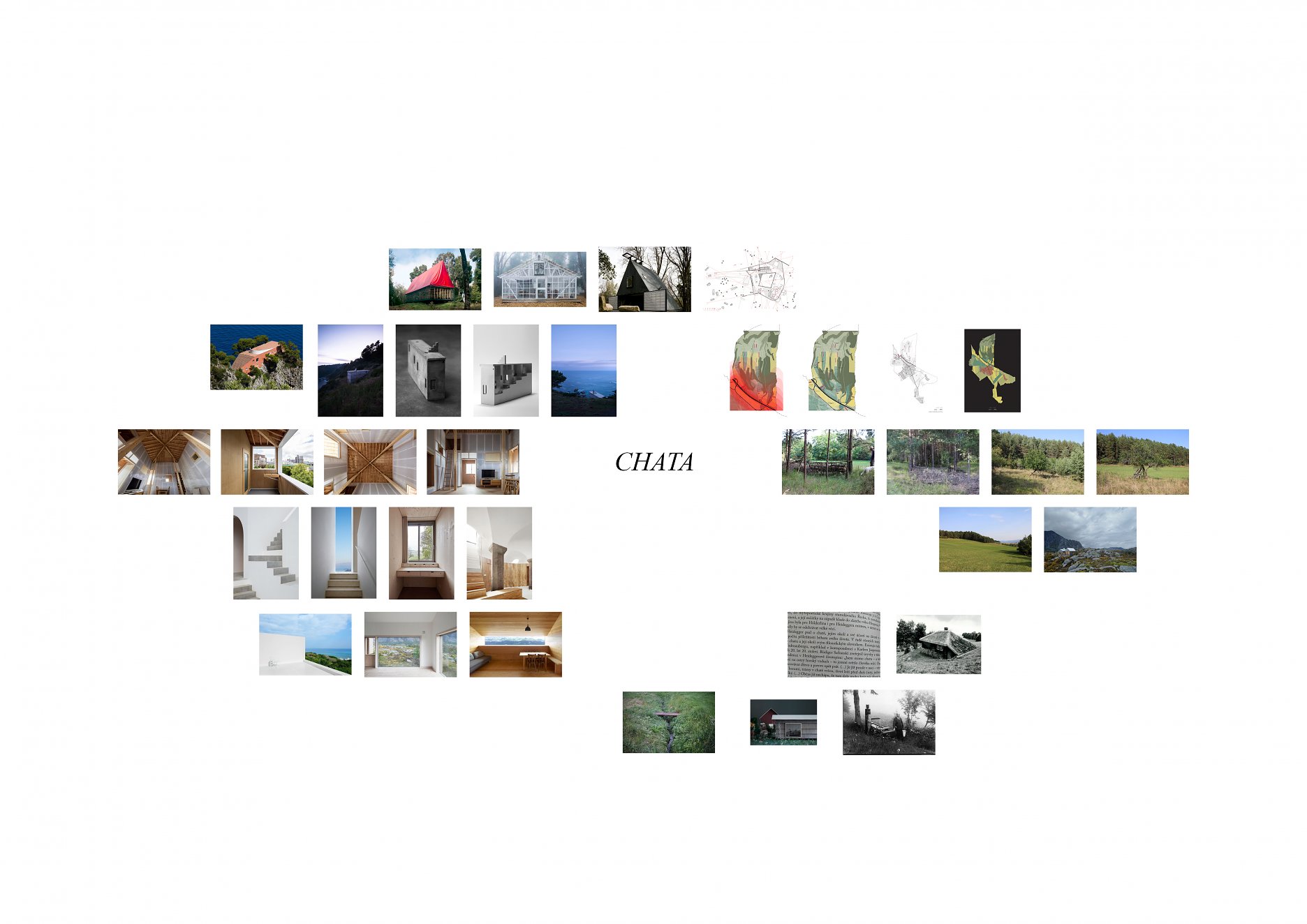 Čo je to chata? V mieste kde každý obrábal spoločné pole dnes už prerušené diaľničnou výstavbou, silnou rozdeľovacou čiarou budujem rodinnú chatu. Otec sa tu narodil a vyrastal, pozná to tu, kreslil mi mapu s názvami miest s trajektóriami. Chata sa pozerá , natáča sa tromi smermi k bodom záujmu prevažne krajinného charakteru. Okrem toho, že sa jej objem natáča vnára sa tiež do zeme, vyhýba sa zvuku z diaľnice. Upozorňuje na nešetrné chovanie dnešného rýchleho sveta. Je takmer neviditeľnou.