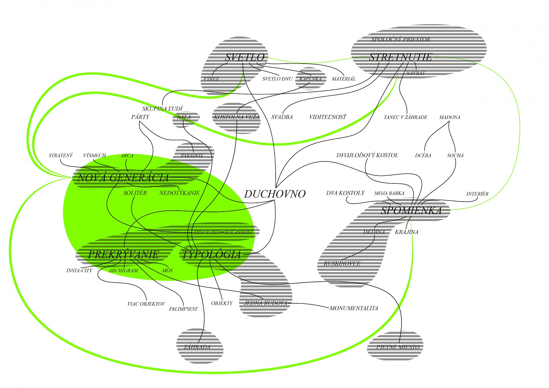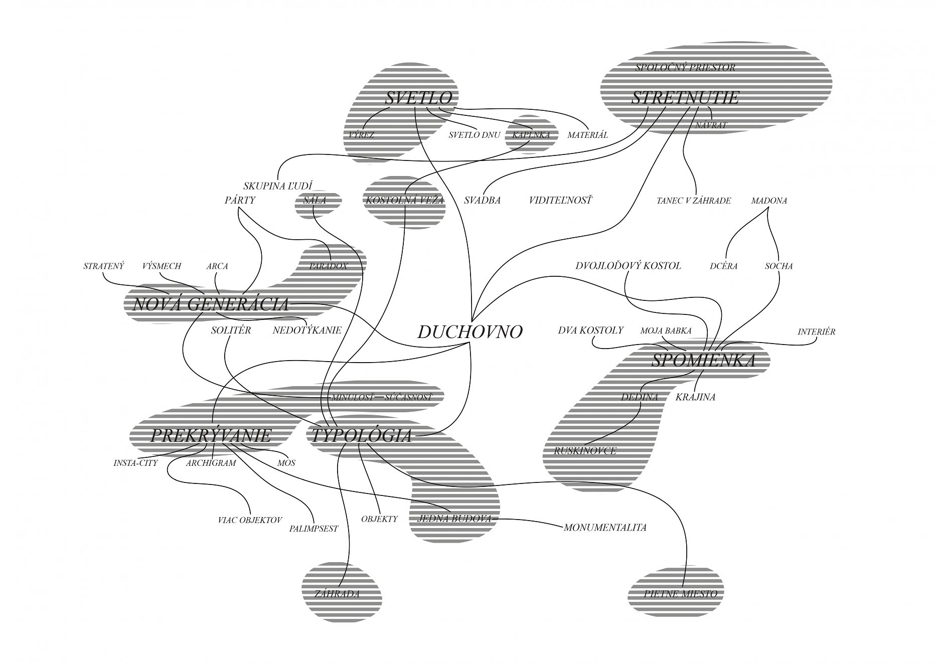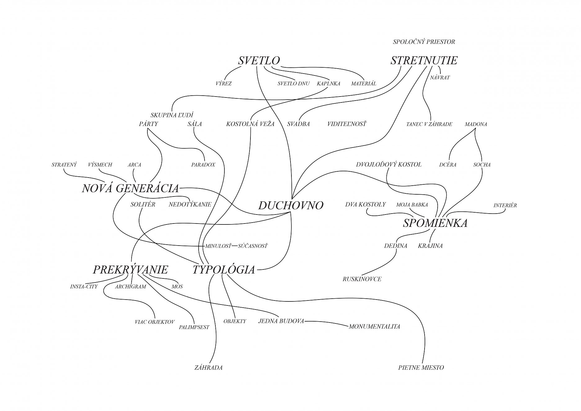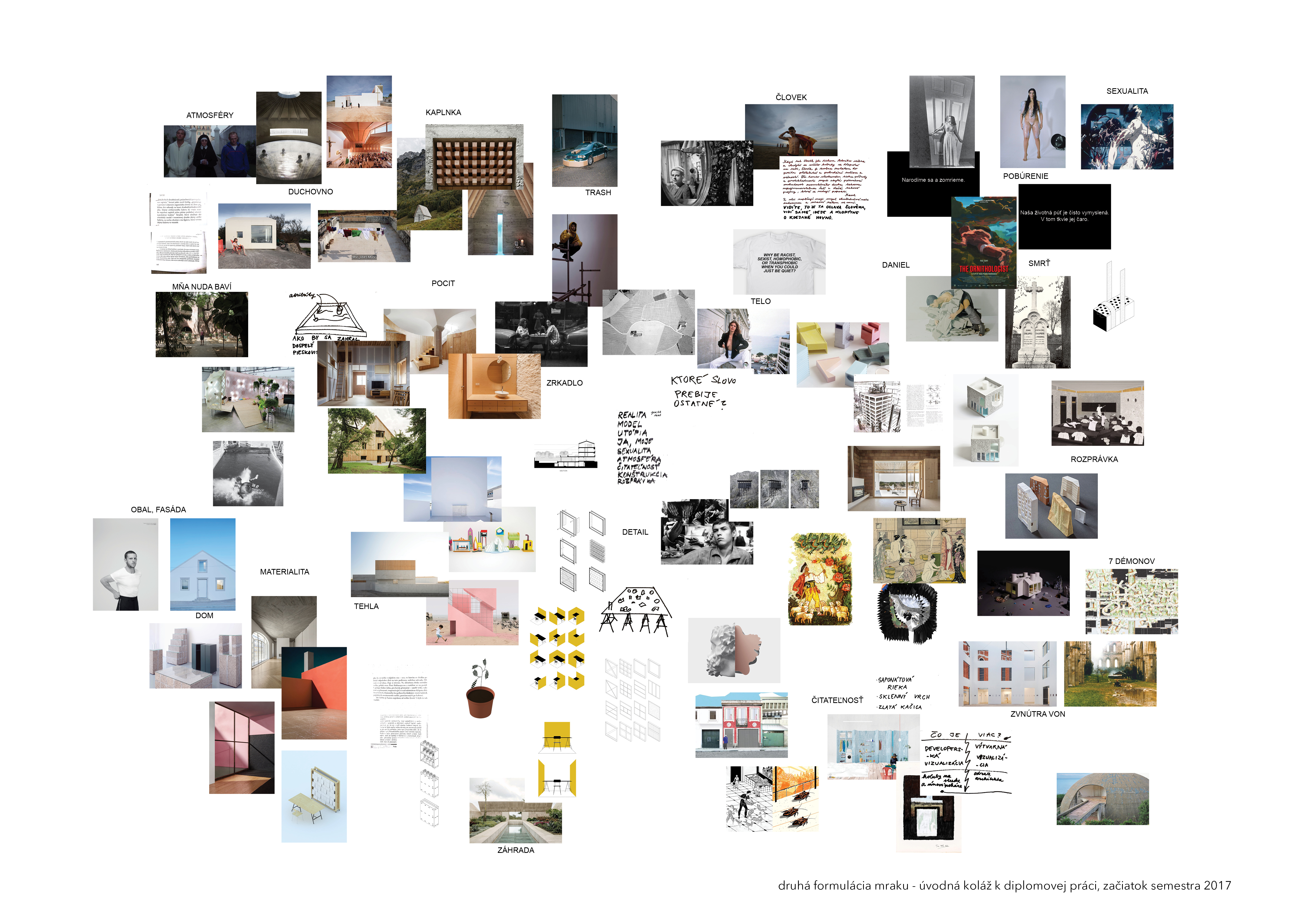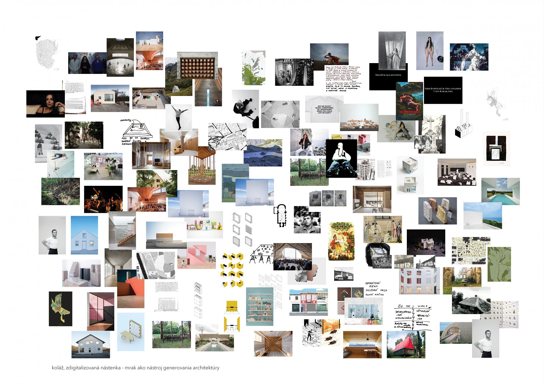 V diplomovej práci sa snažím priblížiť pojem architektúry, hľadám čo pre mňa znamená, ako sa generuje, ako dokáže byť sebaobjavná, ako je neuchopiteľná. Snažím sa vymotať zo súčasnej skepsy a hľadám príležitosť vo vytváraní budúcej architektúry práve jej nepolapiteľnosťou. Používam na to mrak/diagram/nástenku. Z mraku architektúry vyberám obrazy/informácie/texty tie prehodnocujem a znova miešam, architektúra súčasnosti nemôže byť formálna, nemôže byť jednoducho čitateľná, taký nie je ani svet, v ktorom práve žijeme.