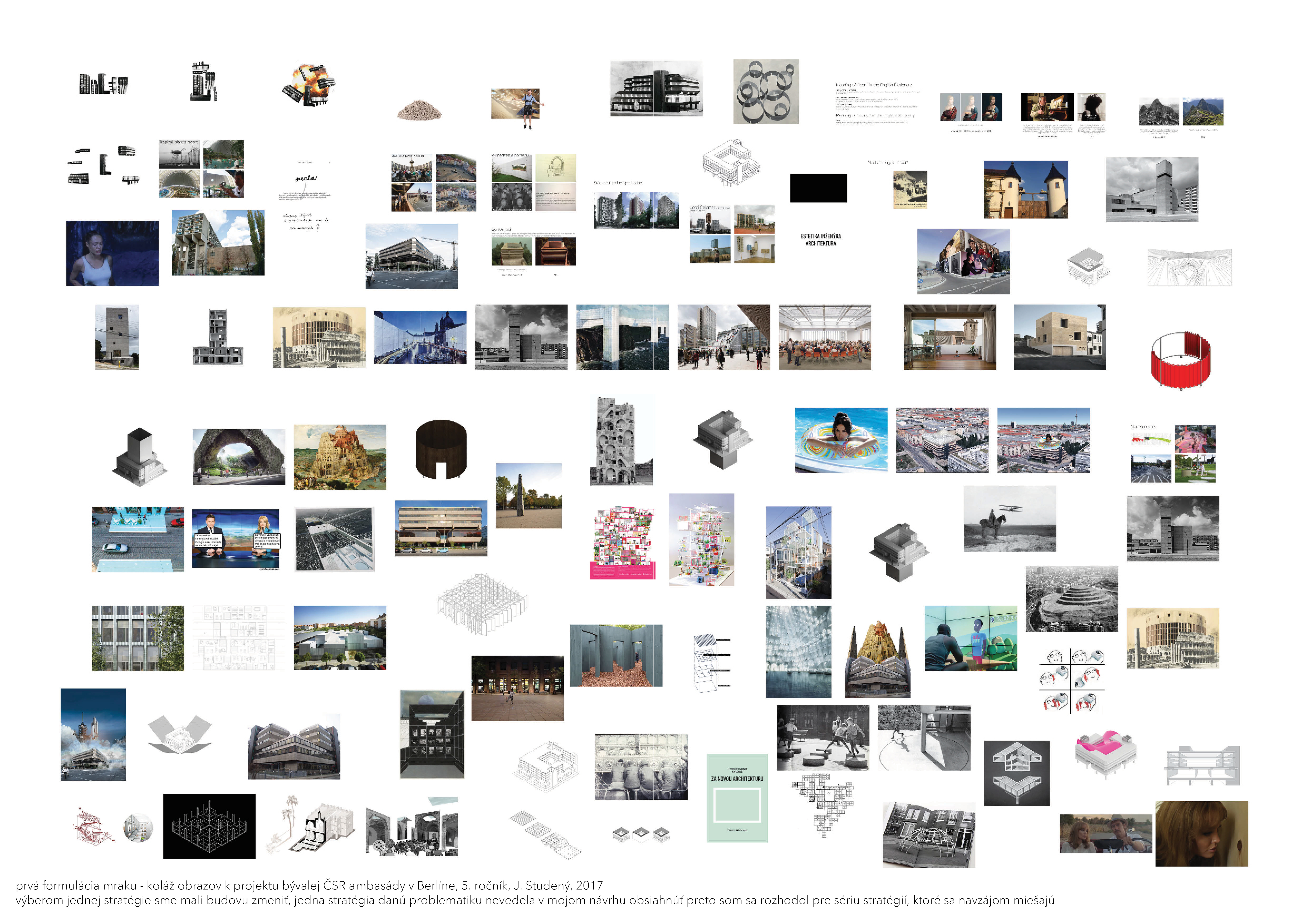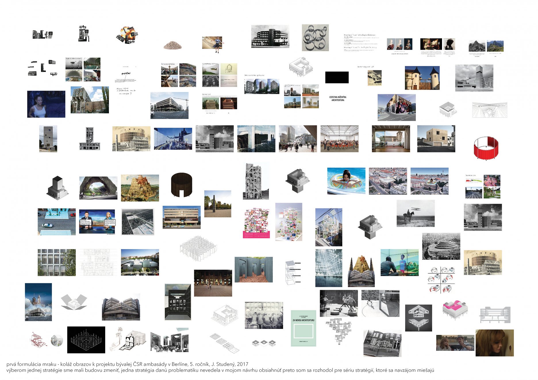 Retrospektívne hľadám vo svojej doterajšej tvorbe procesy a spôsoby záznamu mraku. Tak sa dostávam k svojim denníkom, denník ako denný kresebný záznam, ktorý neskôr dopĺňam o digitálne médium záznamu – tumblr. Rok pred začatím diplomovej práce som v ateliéri Jána Studeného absolvoval semester, ktorý zásadne určil moje neskoršie uvažovanie o architektúre. Témou semestra bola budova bývalej československej ambasády v Berlíne. Tento semester bol súčasťou väčšieho celku s názvom ikonické ruiny, ktorý sa venoval otázkou veľkých architektonických diel, ktoré sa svojou politickou orientáciou dostali do nemilosti spoločnosti. Väčšinou sa študenti snažili vyextrahovať problém /stratégiu a tú uplatňovali na danú budovu. Totožný postup výberu stratégie a následné aplikovanie sa udial aj v mojom projekte lenže namiesto jednej stratégie som postupom času uplatnil na budovu stratégií viac. V tomto semestri sa vykryštalizovala moja obesia vytvárať nástenku ako nástroj pracovného záznamu (prvá formulácia nástenky – mrak), nástenka sa prezentovala ako rovnocenné médium zápisu architektúry.