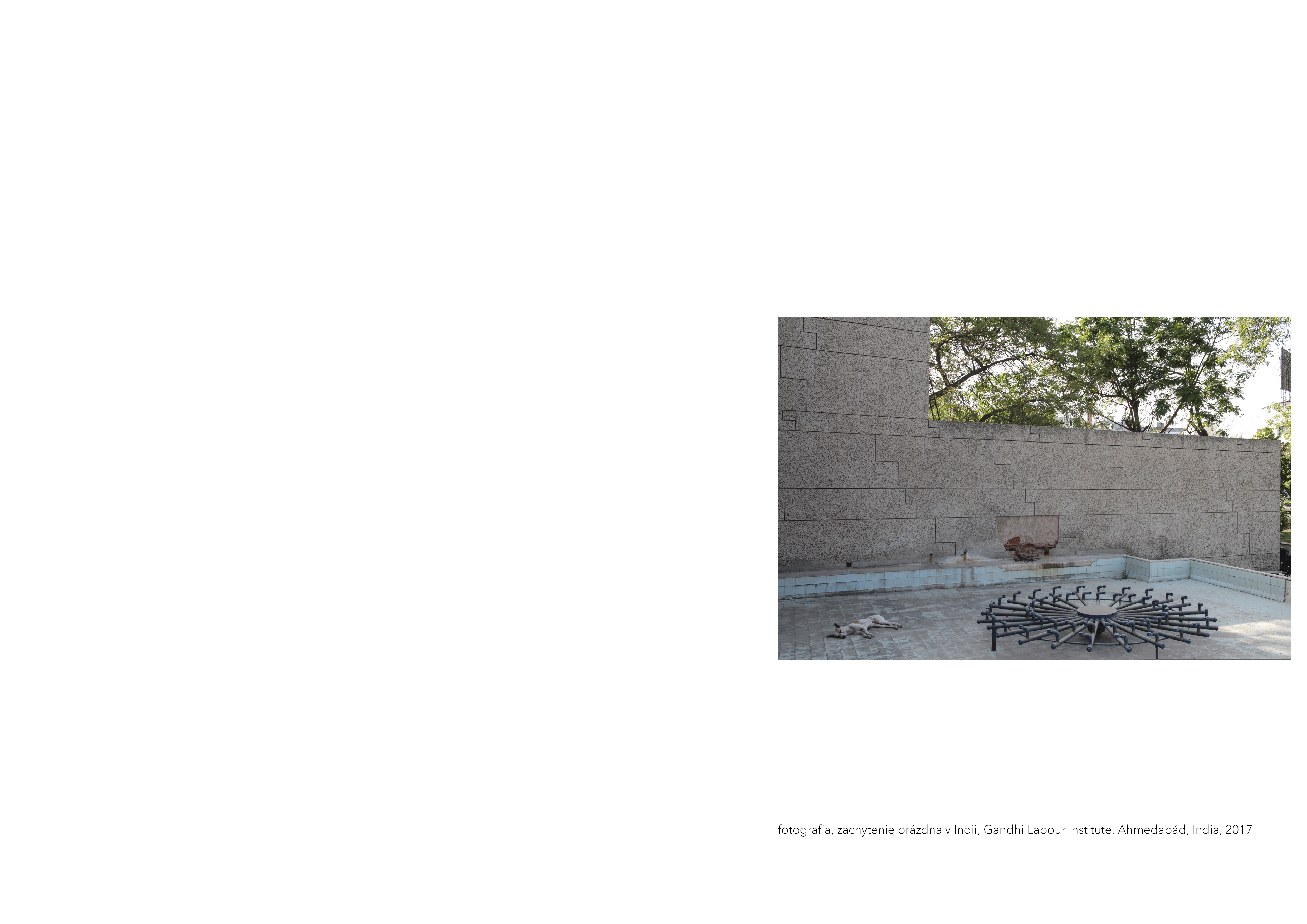 Spolu s ostatnými predmetmi som si v Indii zvolil predmet Interior Photography, ktorý spočíval najskôr v teoretickej príprave a potom v praktickom aplikovaní fotografie ako média, cez ktoré hľadíme na architektúru. Slovo „interiér“ nebolo veľmi príznačné, keďže sme fotografovali zväčša celé budovy zvonku aj zvnútra a trávili tak celé hodiny sledovaním svetla a prostredia, ktoré v „indickom lete“ vytváralo veľmi veľké kontrasty osvetlenia povrchu budov a ich vnútorných prostredí. Ahmedabád, miesto, kde sídlila moja nová škola, bolo preplnené ľuďmi, len samotné mesto sa vyrovnalo počtom obyvateľov na Slovensku a keď sa prirátali suburby, bolo ich oveľa viac. Vždy na začiatku hodiny sa premietali fotografie z minulej hodiny, ktorú sme strávili von v teréne. Bolo zvláštne sledovať v kontraste s inými spolužiakmi (ktorí boli vlastne všetci Indovia) vyprázdnenosť mojich záberov. Častokrát som si to obhajoval tým, že mňa nuda baví. Že sa takýmto spôsobom vyrovnávam s preplneným prostredím. Vo väčšine fotografií sa človek ani nenachádzal. Na samotné zábery som čakal niekoľko minút, kým sa fotografované miesto úplne vyprázdnilo. Táto fotografia, ktorá pre mňa reflektuje celú Indiu, paradoxne je to záber, ktorý by hocikto prehliadol, lebo tam nič nie je. Ide o budovu Gandi Ashram Labour Institute od B.V. Doshi-ho, presnejšie jej vstupná časť kde fotografujem fontánu bez vody so spiacim psom. Fotografia je plná paradoxov - zatienený prvý plán fotografie kontrastuje s pozadím oslneného mesta, samotné popretie fontány jej nefunkčnosťou a novým spôsobom využitia, ako aj zachytenie staroby materiálov, ktoré sa pomaly opotrebúvajú. Táto fotografia v sebe nesie určitý druh udalosti, kde sa stretáva svetlo, budova, krajina a zviera v jednom zábere. Ponúkam obraz preplnenej krajiny v jeho prázdne? Spätne uvažujem nad touto formou, je určitým spôsobom pre mňa atraktívna, fascinuje ma. Preto je na mieste opýtať sa architektúry, či obstojí svojou vyprázdnenosťou vo forme udalostí, ktoré ju stvoria. Čo je vyprázdnenosť v architektúre? Je to plnosť jej obrazov?