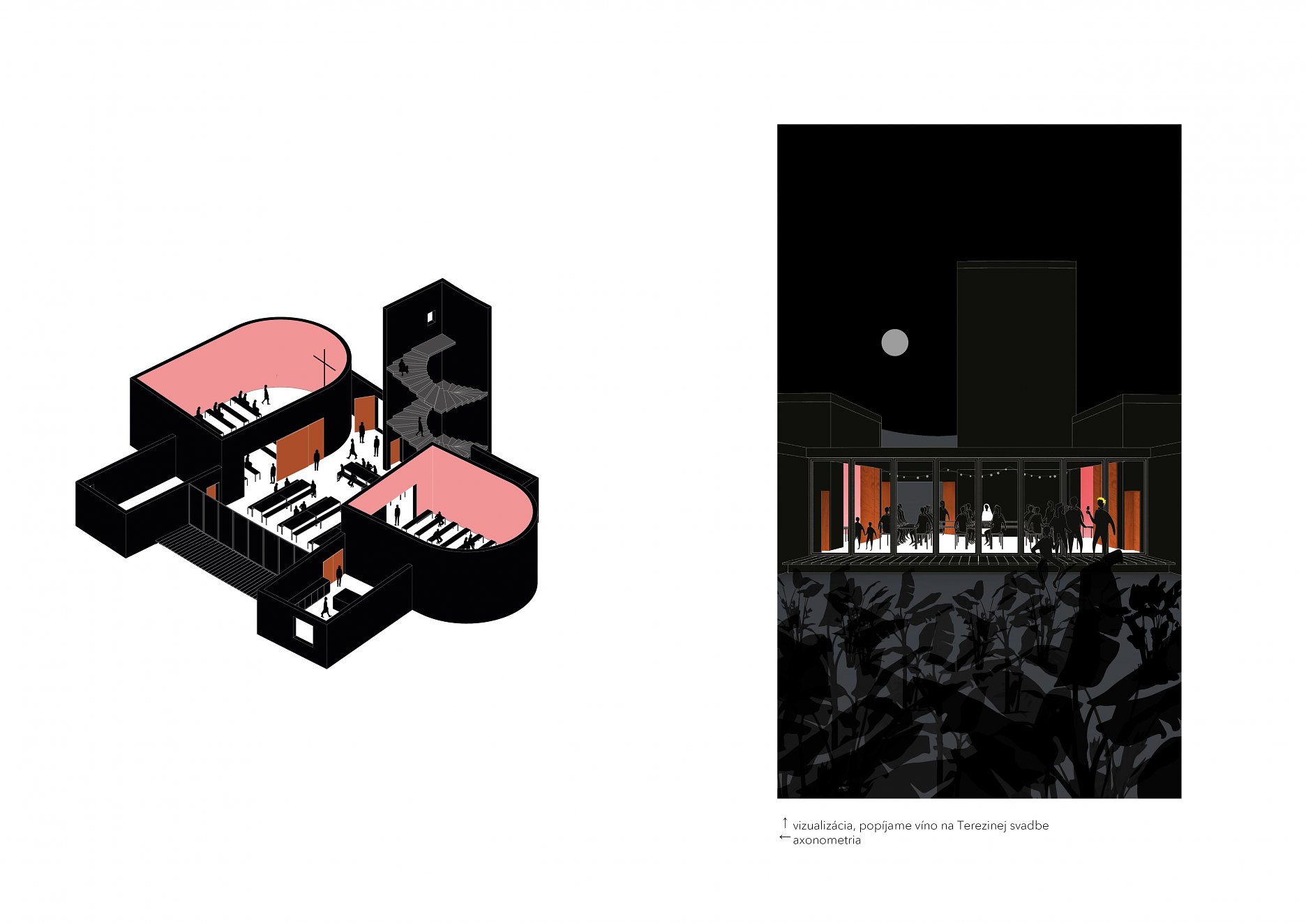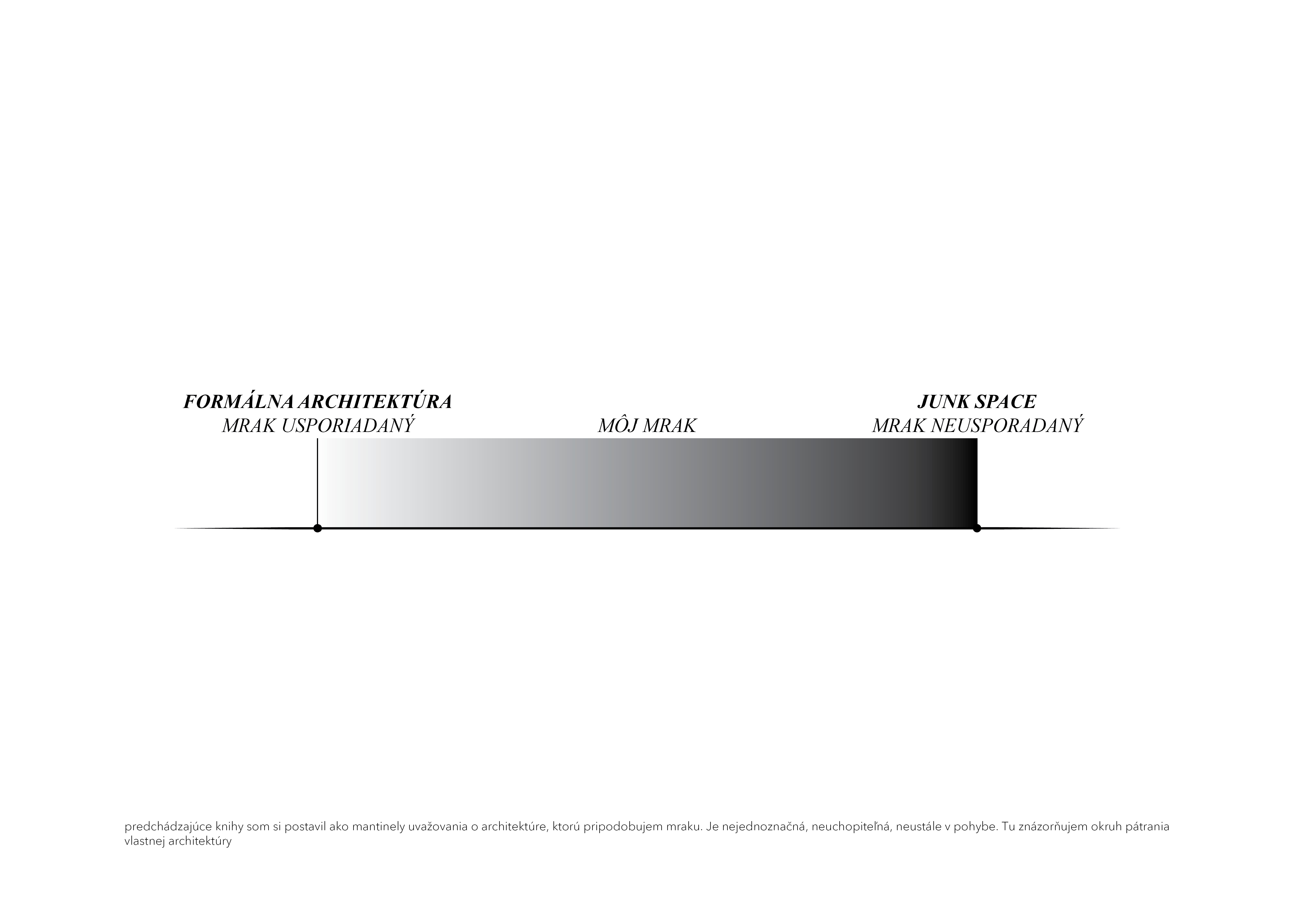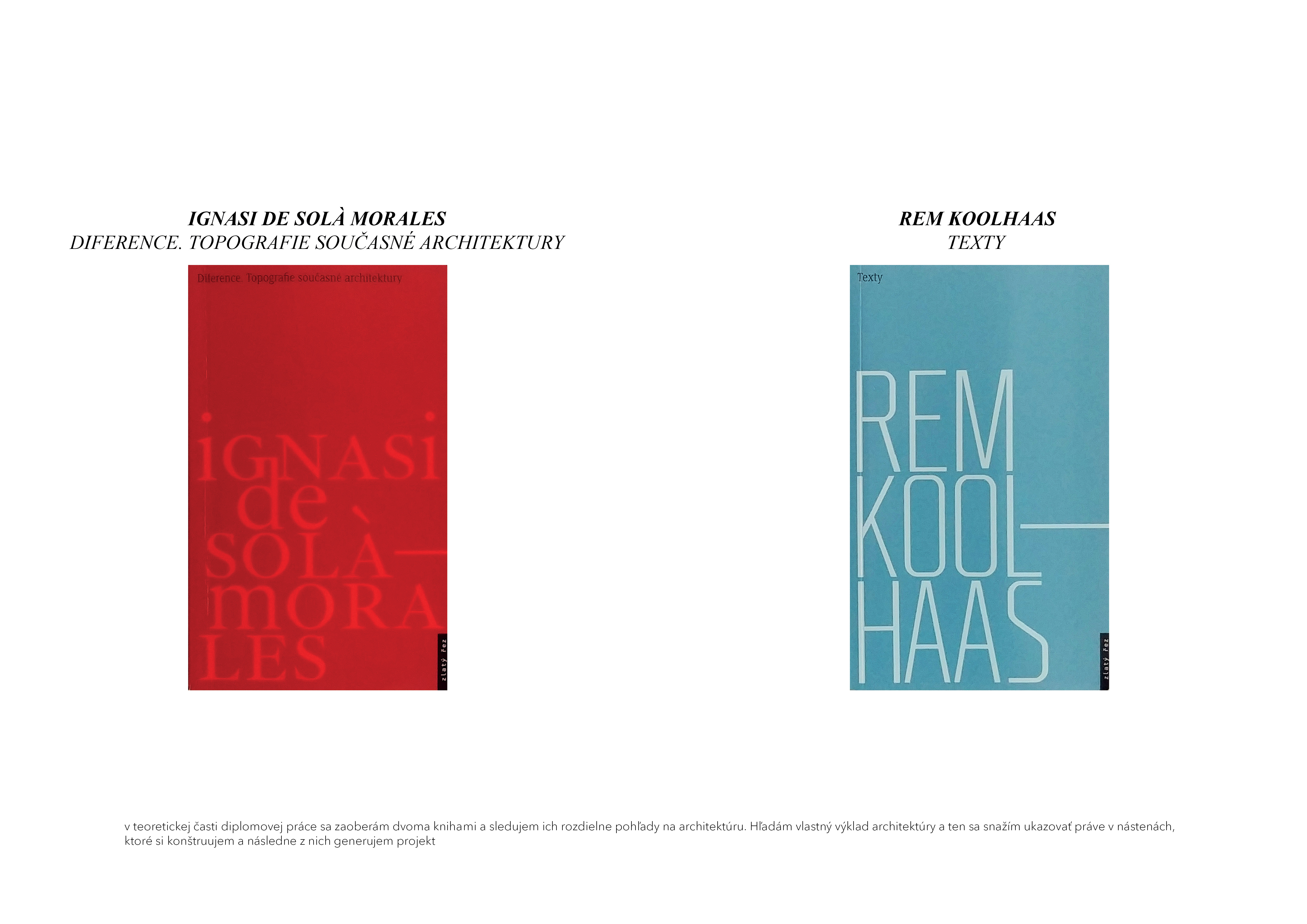 V teoretickej časti diplomovej práce sa zaoberám najmä dvomi knihami a to Diferencie, topografie súčasnej architektúry, autor Ignasi de Sola-Morales a knihou textov od Rema Koolhaasa Texty. Tieto knihy som si postavil ako proti sebe stojace mantinely, ktoré určujú hranice medzi architektúrou v akej sa chcem pohybovať na jednej strane architektúra prázdna, mrak usporiadaný a na strane druhej architektúra preplnenosti, mrak neusporiadaný. Vymedzujem si gradient, v ktorom uvažujem o architektúre, nie je to pevný a stály bod, ale dynamický pohyb, ktorý by mal s každým novým premýšľaním o architektúre priniesť novú pozíciu gradientu, tá bude pomaly bádať a bude hodnotiť.