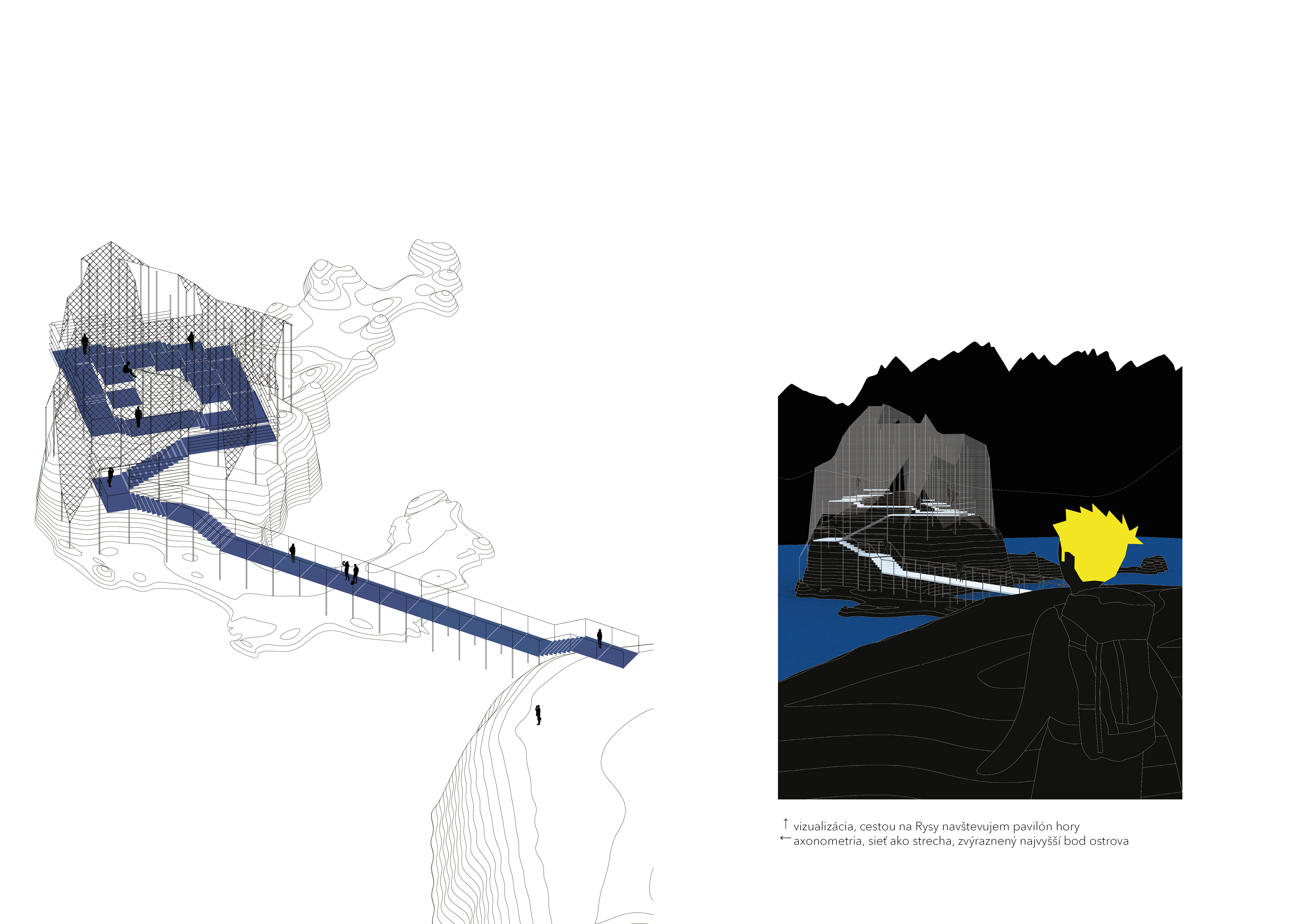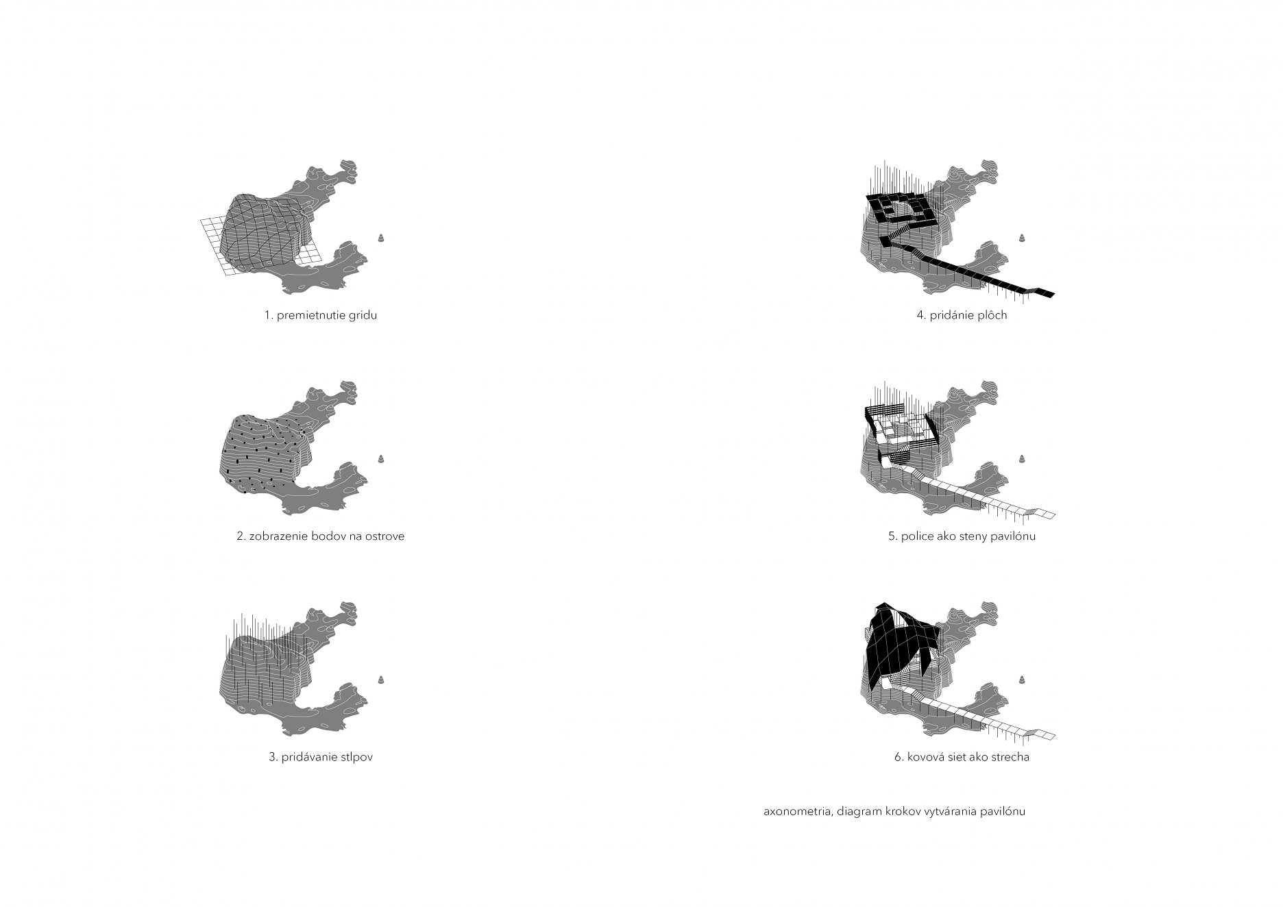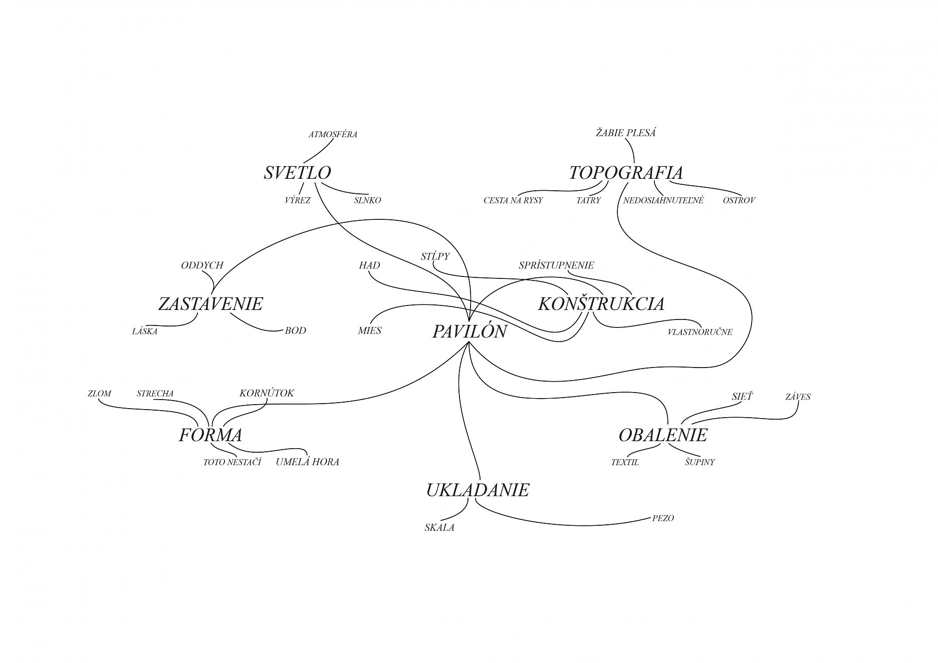 Čo je pavilón? Ako sa vytvára? Okupujem ostrov “spadnutý kameň“ v Žabom plese smerom na Rysy vo Vysokých Tatrách. Označujem na mape nový bod zastavenia tým, že sprístupňujem ostrov. Topografiou ostrova, stĺpmi a plochami vytváram novú umelú horu, pavilón. Pristupujem k nemu z pevniny, vstupujem do neho schodiskom , sledujem jeho jadro- najvyšší bod spadnutého kameňa. Mohol byť tento kameň kedysi vrcholom? Siahnem do vrecka uložím kameň, ktorý si zo sebou nesiem do priľahlej police, ja budujem tento pavilón, ja zapĺňam jeho steny.