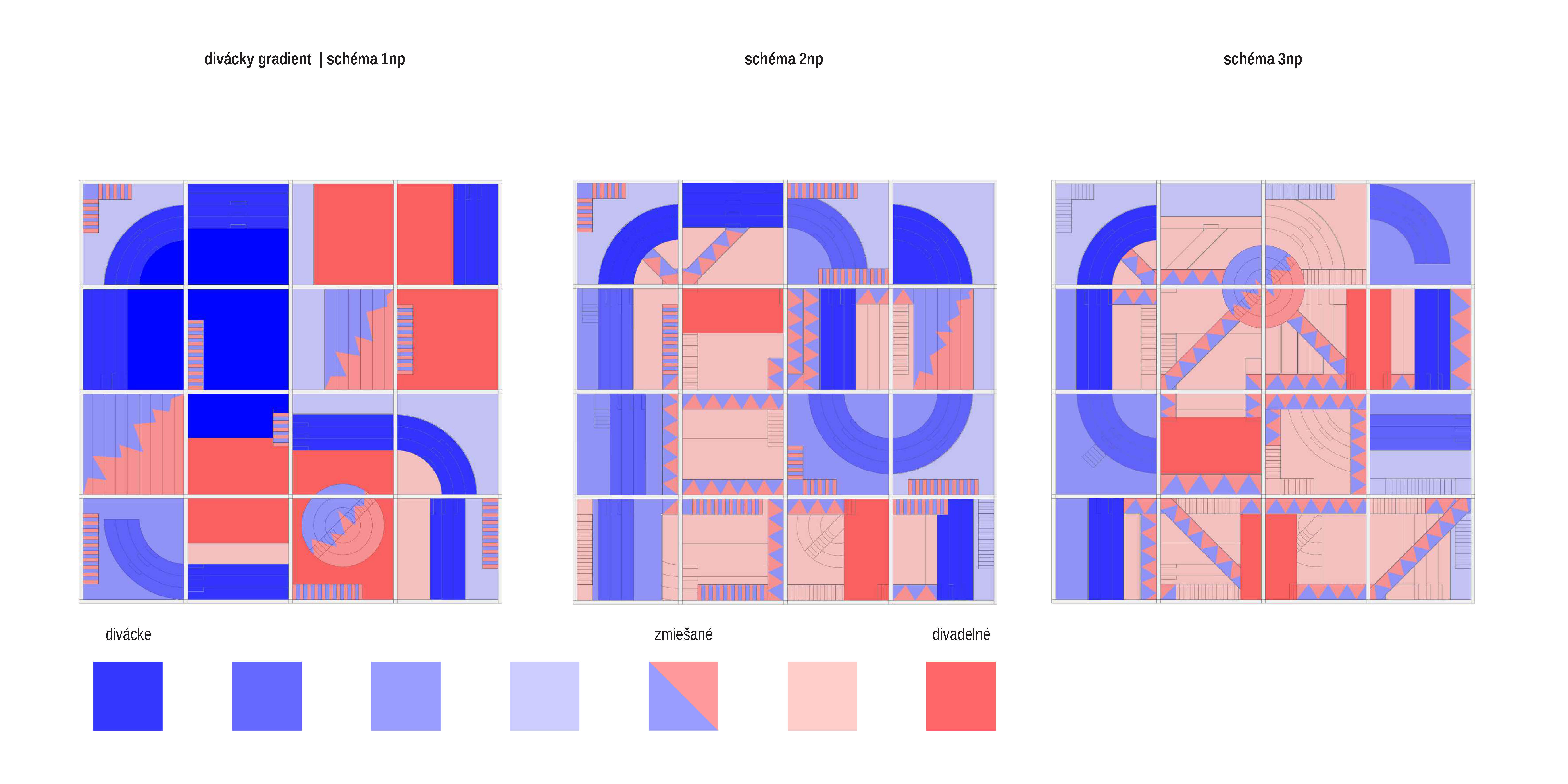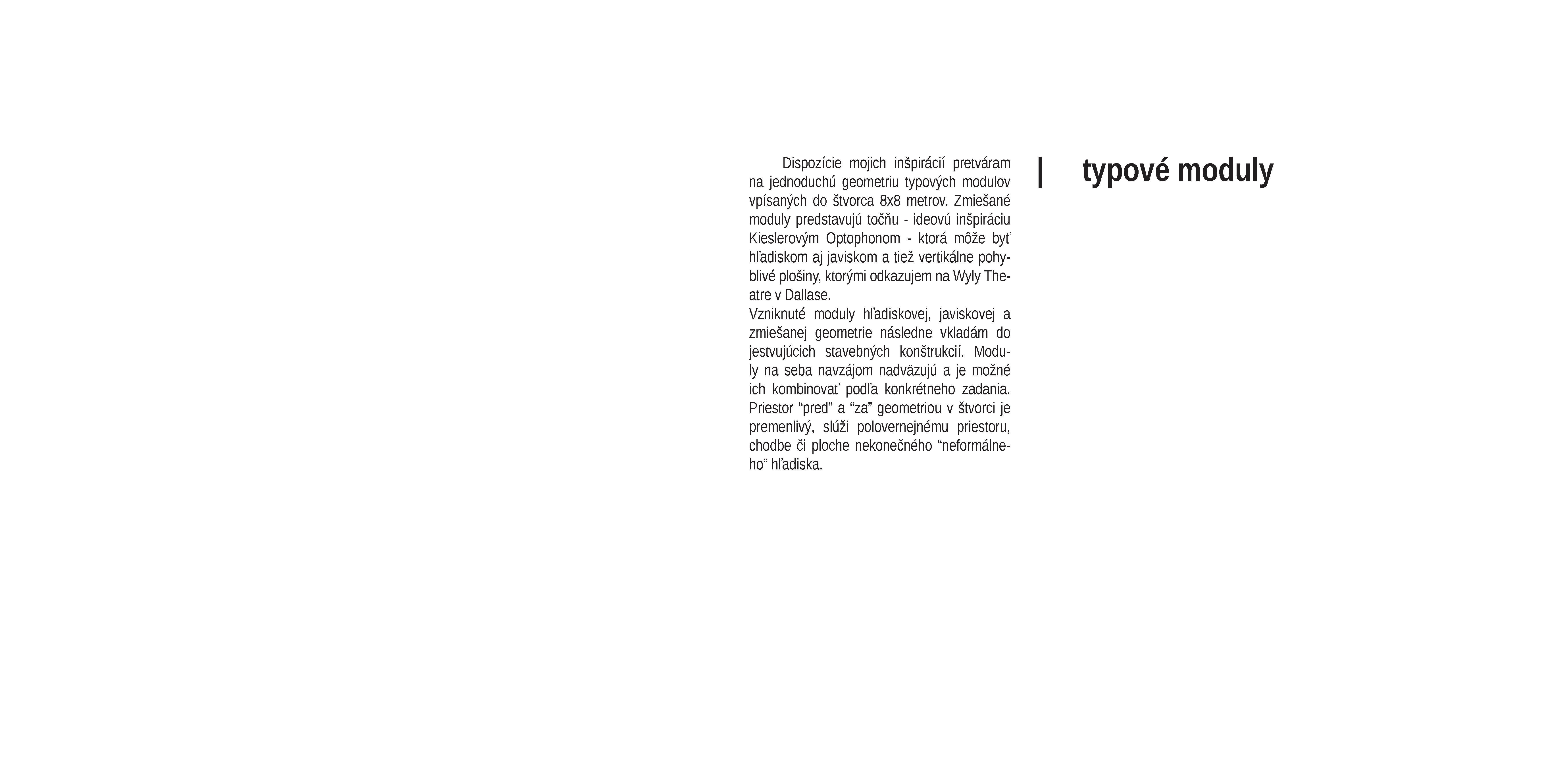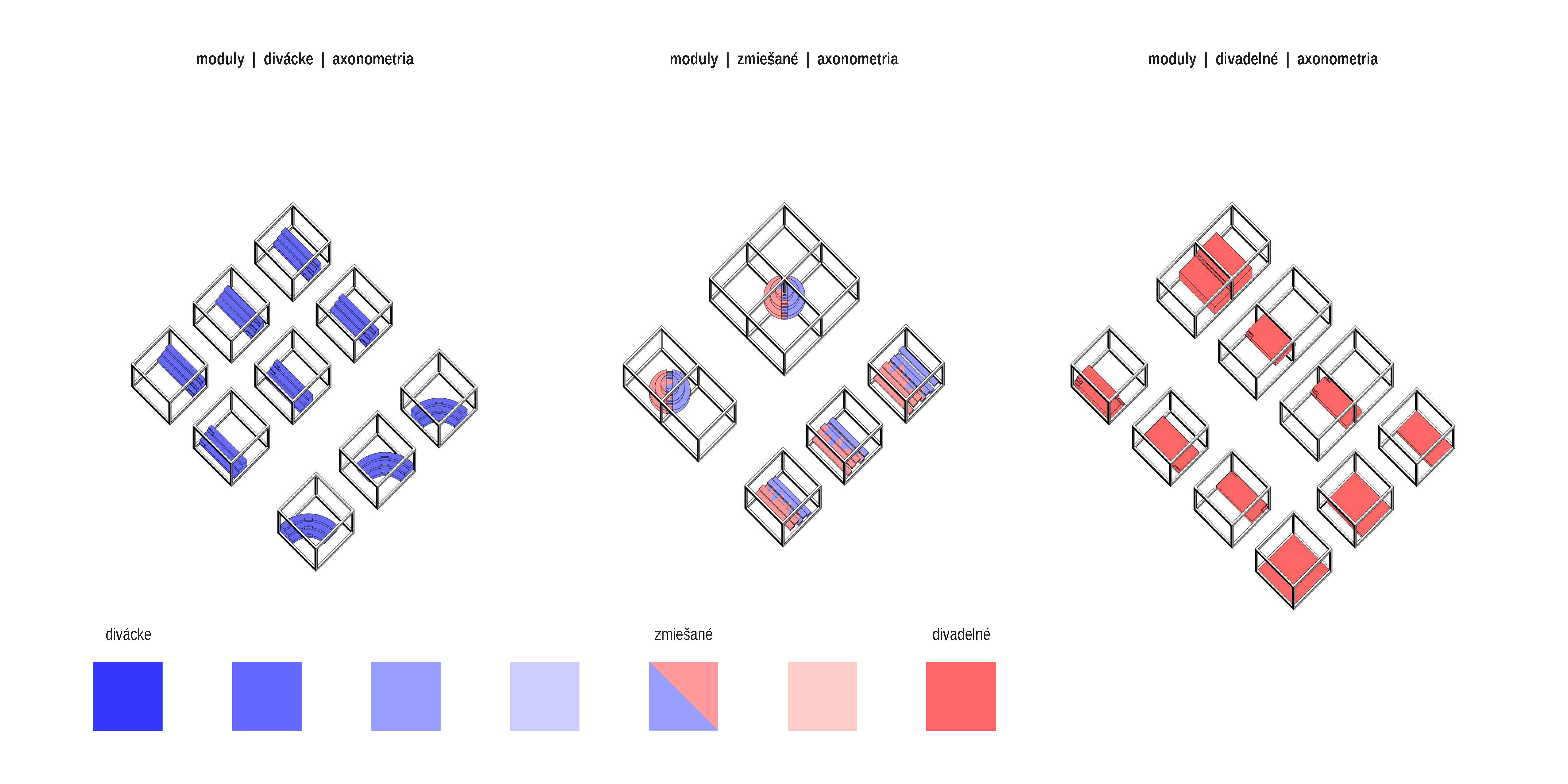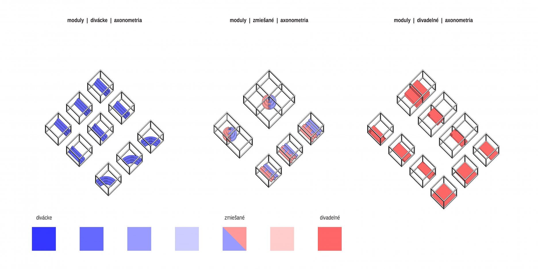 Analýzou viacerých konceptov divadelného priestoru, sústrediac sa na vzťah javiska s hľadiskom, dospievam k výberu niekoľkých divadelných typov, ktoré v praktickej časti pretváram do jednoduchej geometrie a uvádzam do nových súvislostí. Moduly, navrhnuté v javiskovej, hľadiskovej a zmiešanej geometrii tvoria priestor, ktorého (ne)determinácia spočíva v priestorovej vrstevnatosti, v rozochvení hraníc divadelnej dispozície, kedy sa stierajú rozmedzia medzi divadelným a diváckym, diváckym a verejným, verejným a divadelným a divák sa mimovoľne stáva horizontom performačného diania. Mojim záujmom je sprostredkovať divadelný zážitok širokej skupine obyvateľstva na rôznych diváckych úrovniach, v rôznej miere interaktivity a v rôznom čase, vzbudiť diskusiu o (re)forme súčasnej divadelnej architektúry."