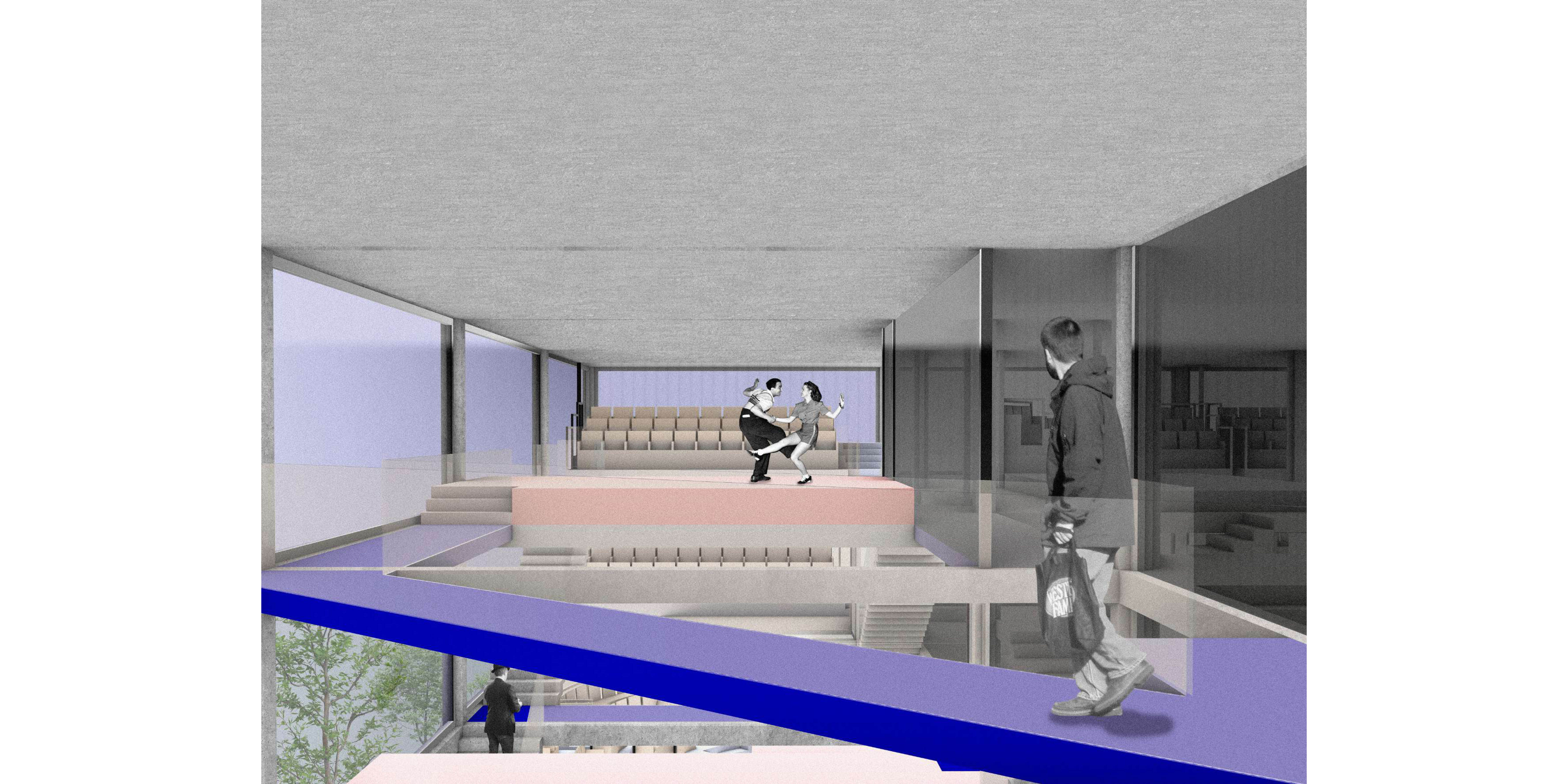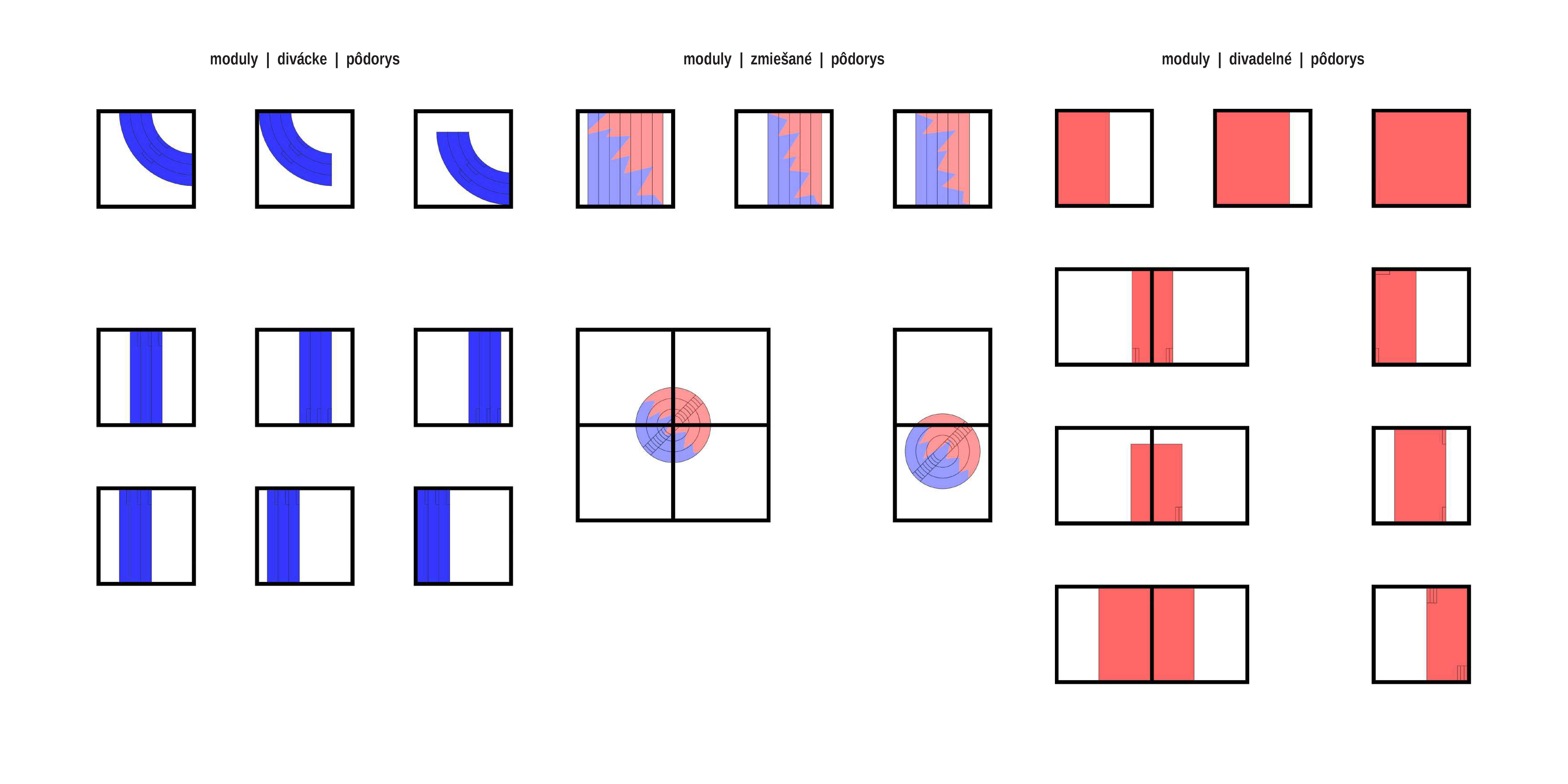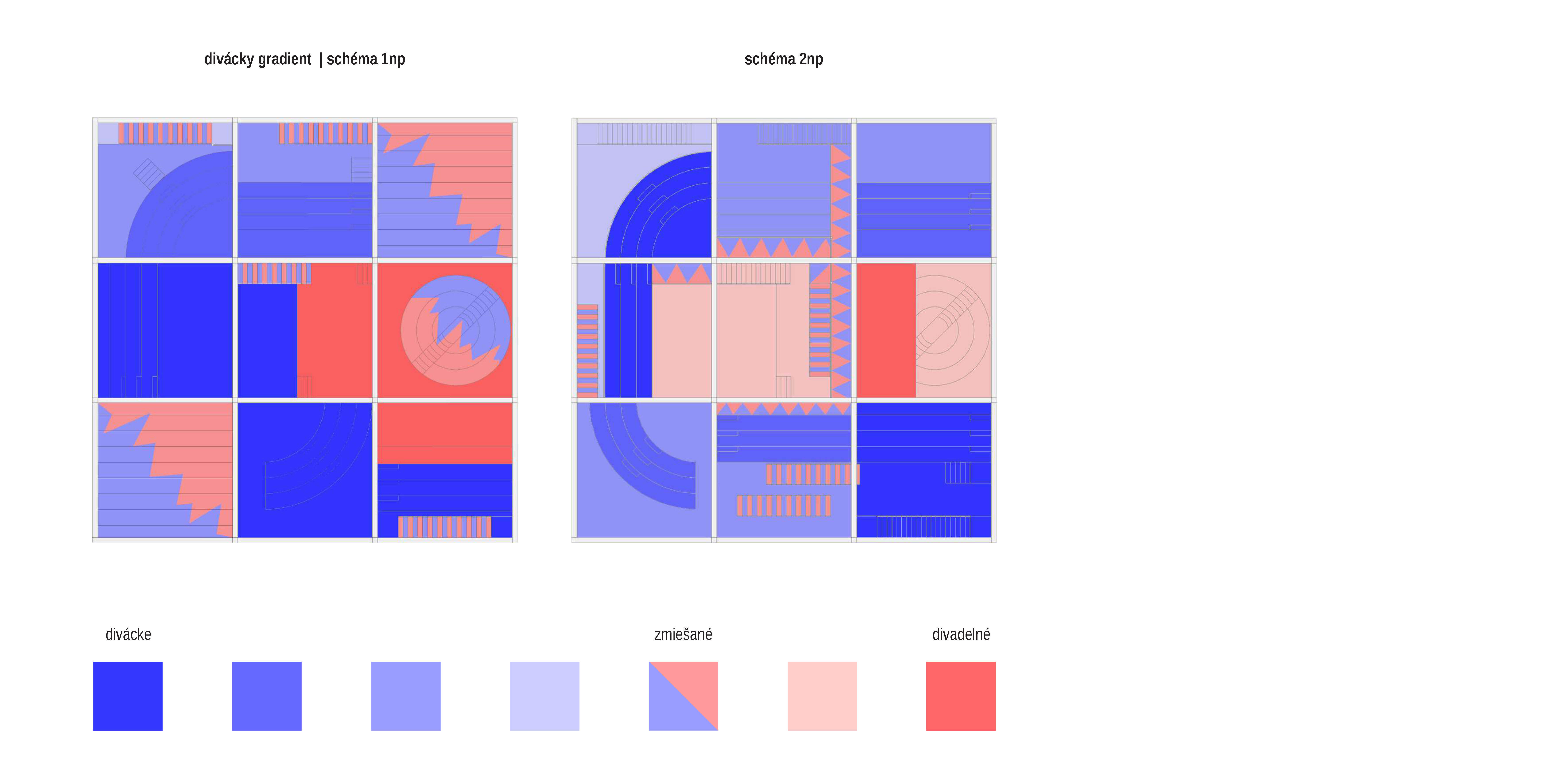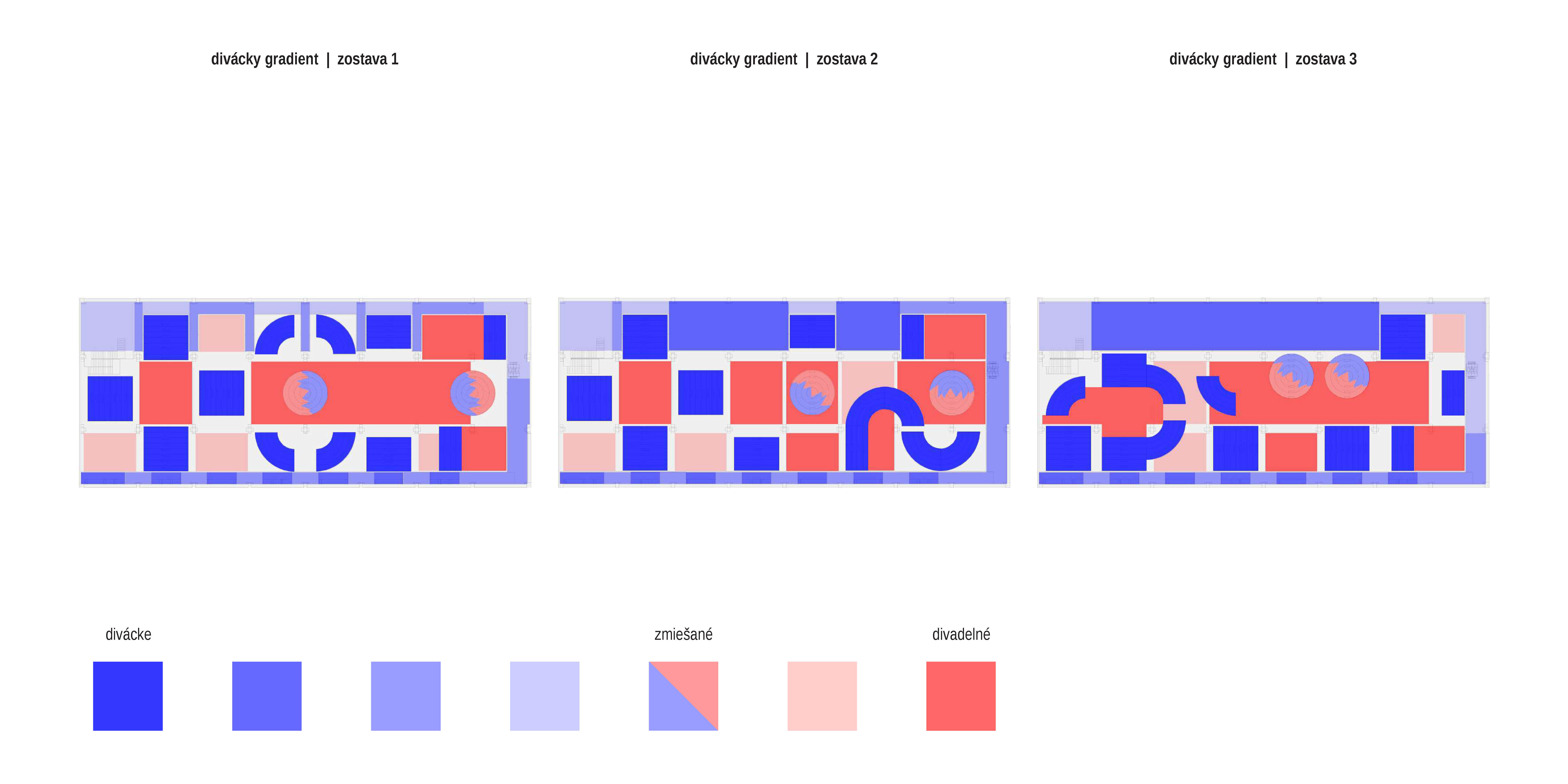 Analýzou viacerých konceptov divadelného priestoru, sústrediac sa na vzťah javiska s hľadiskom, dospievam k výberu niekoľkých divadelných typov, ktoré v praktickej časti pretváram do jednoduchej geometrie a uvádzam do nových súvislostí. Moduly, navrhnuté v javiskovej, hľadiskovej a zmiešanej geometrii tvoria priestor, ktorého (ne)determinácia spočíva v priestorovej vrstevnatosti, v rozochvení hraníc divadelnej dispozície, kedy sa stierajú rozmedzia medzi divadelným a diváckym, diváckym a verejným, verejným a divadelným a divák sa mimovoľne stáva horizontom performačného diania. Mojim záujmom je sprostredkovať divadelný zážitok širokej skupine obyvateľstva na rôznych diváckych úrovniach, v rôznej miere interaktivity a v rôznom čase, vzbudiť diskusiu o (re)forme súčasnej divadelnej architektúry."