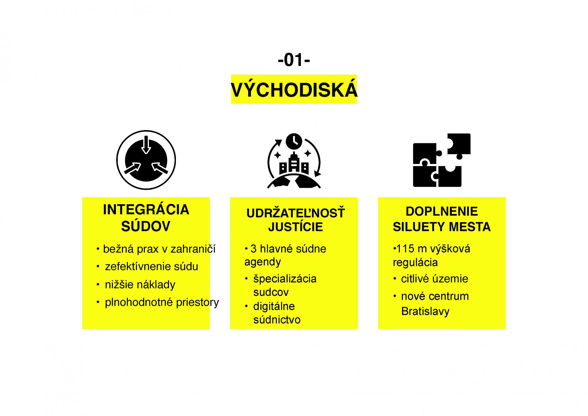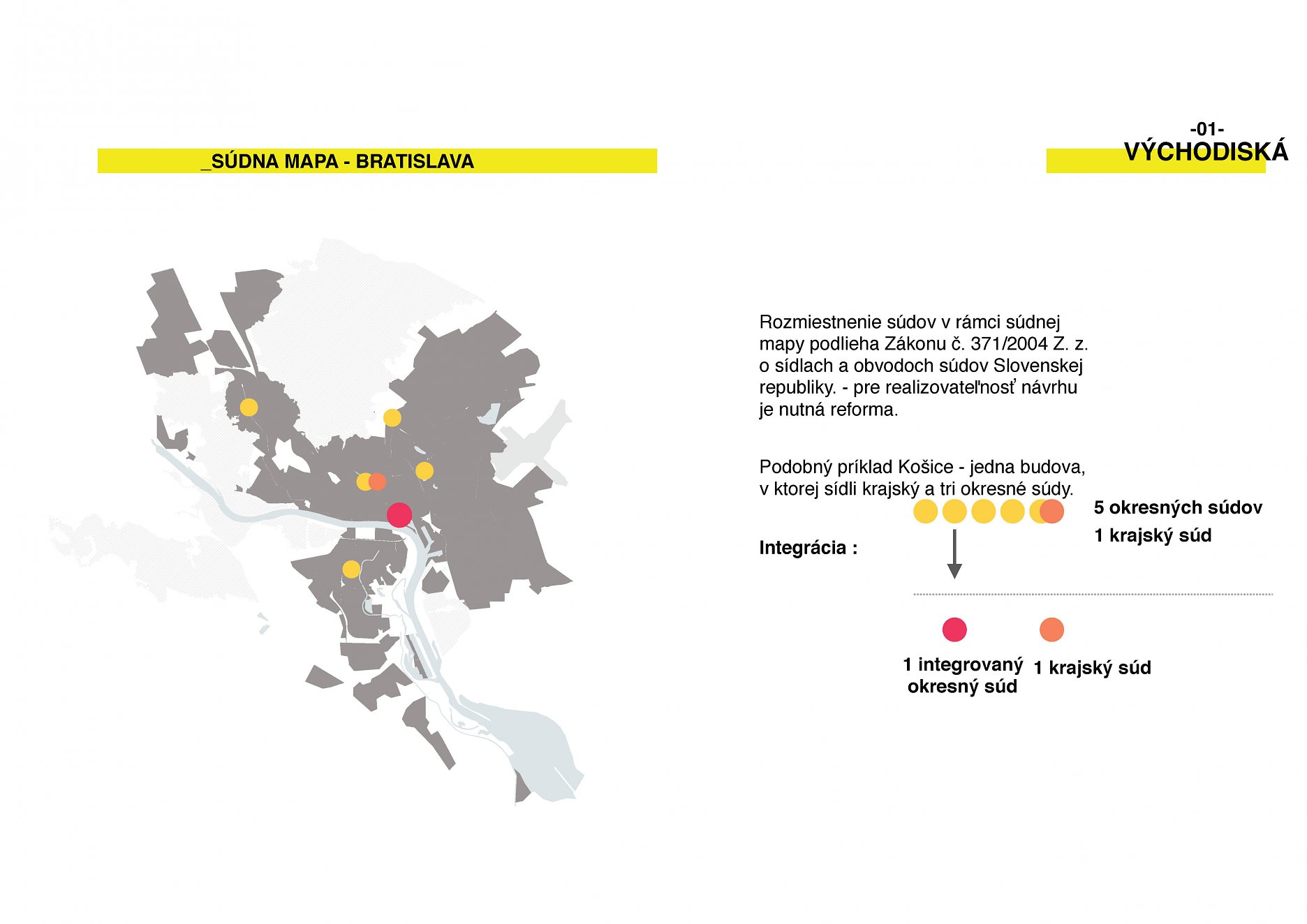 Navrhovaná budova mestského súdu integruje päť okresných súdov v rámci Bratislavy. Trend zlučovania justičných budov je v rozvinutých európskych krajinách veľmi silný. Podľa odborných analýz, posudkov a správ o stavoch súdnictva sa týmto spôsobom vie zefektívniť justičný systém a najmä skvalitniť rozhodovacia činnosť sudcov.