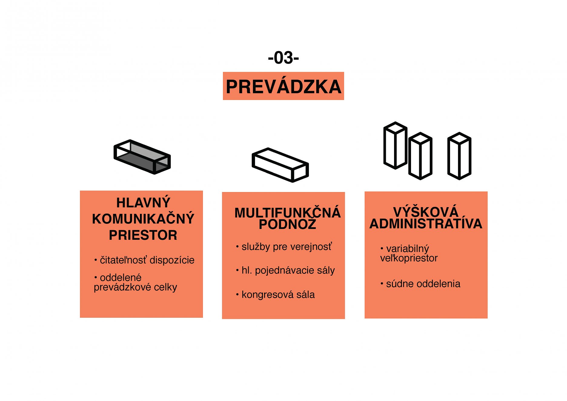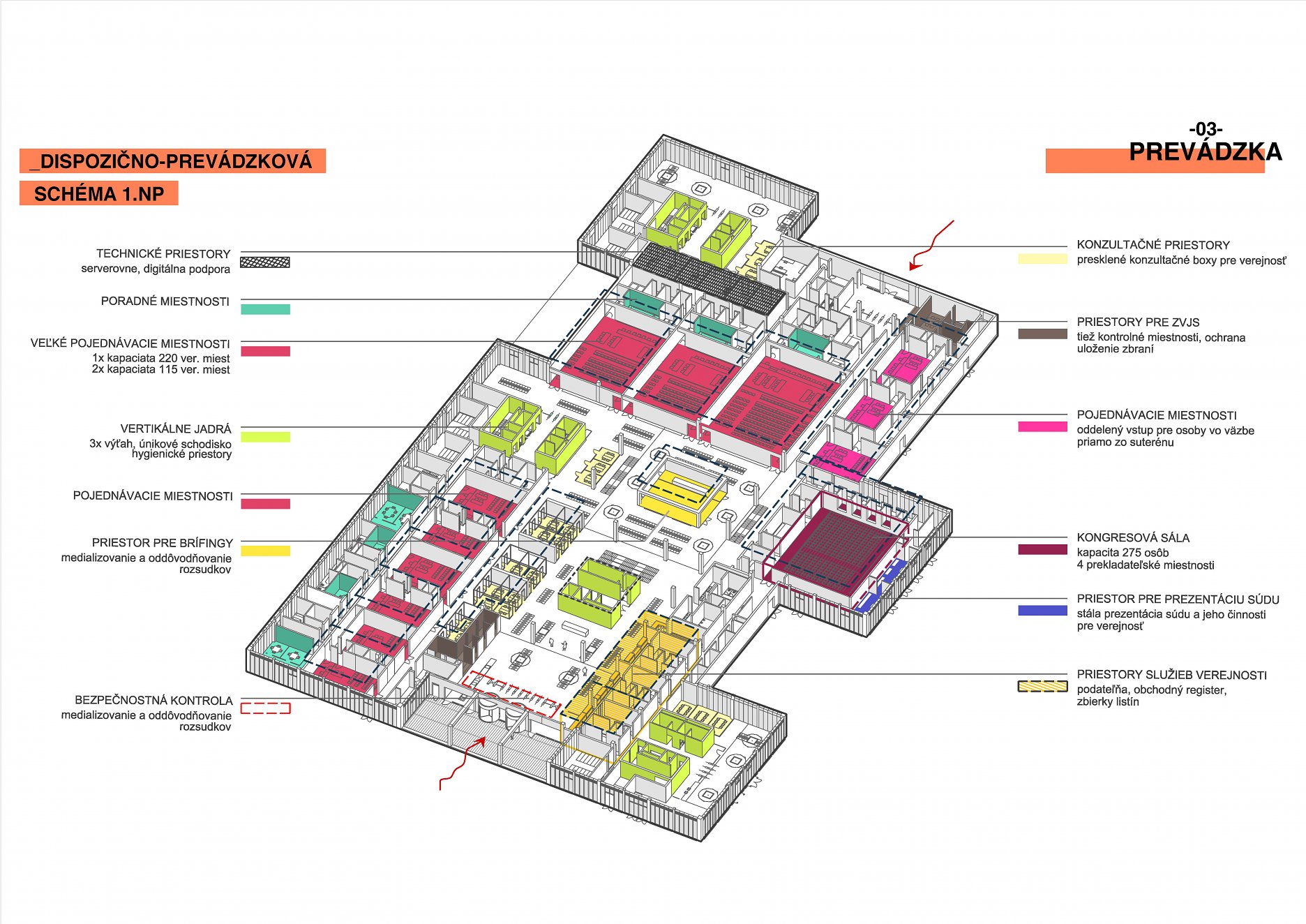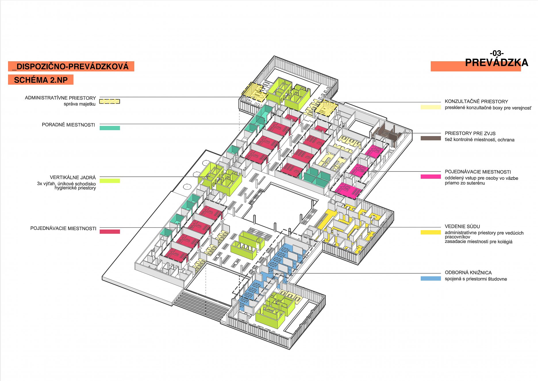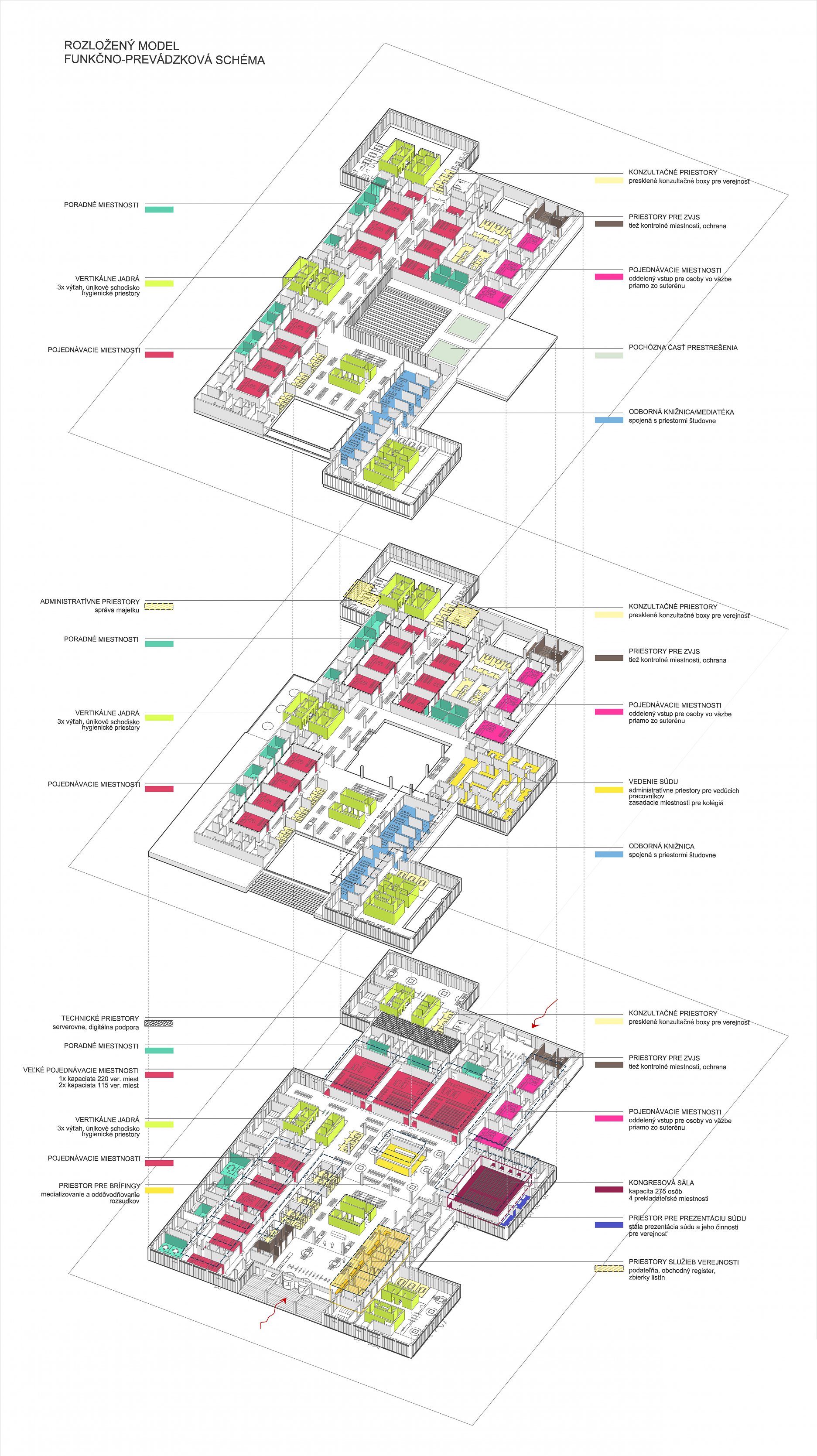 Objekt tvorí trojpodlažná obdĺžniková podnož, do ktorej sú pravidelne vysadené štyri kubusy so štvorcovým pôdorysom - tri výškové budovy a hmota pre kongresovú sálu. Stavba je rozdelená na tri špecializované súdne úseky podľa jednotlivých súdnych agend. Do troch výškových budov sú umiestnené administratívne priestory pre spomínané súdne úseky. V podnoži budovy sú situované pojednávacie miestnosti, súdny úrad, vedenie súdu, služby pre verejnosť, kongresové a obslužné priestory.