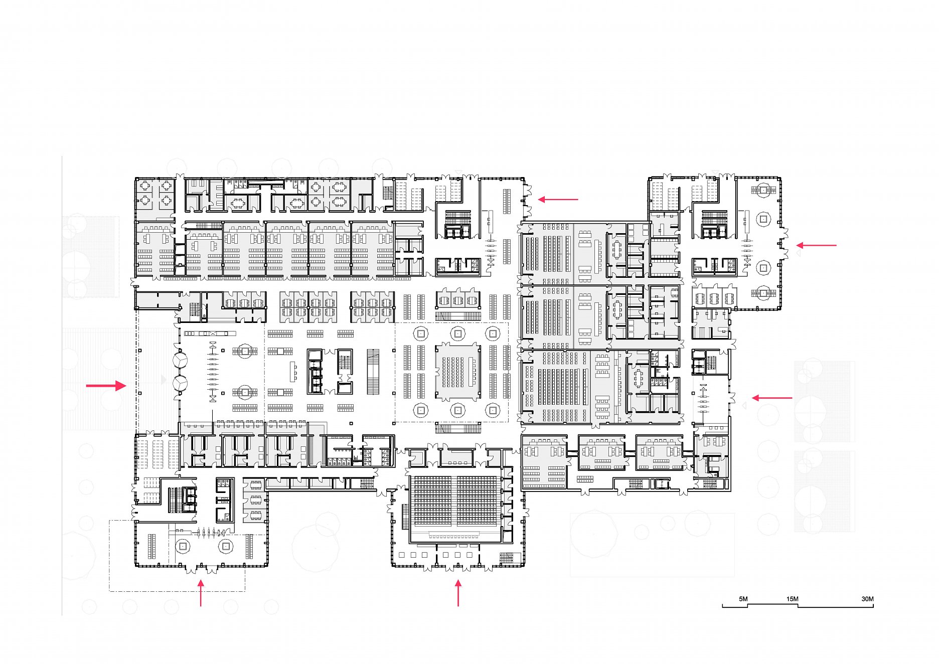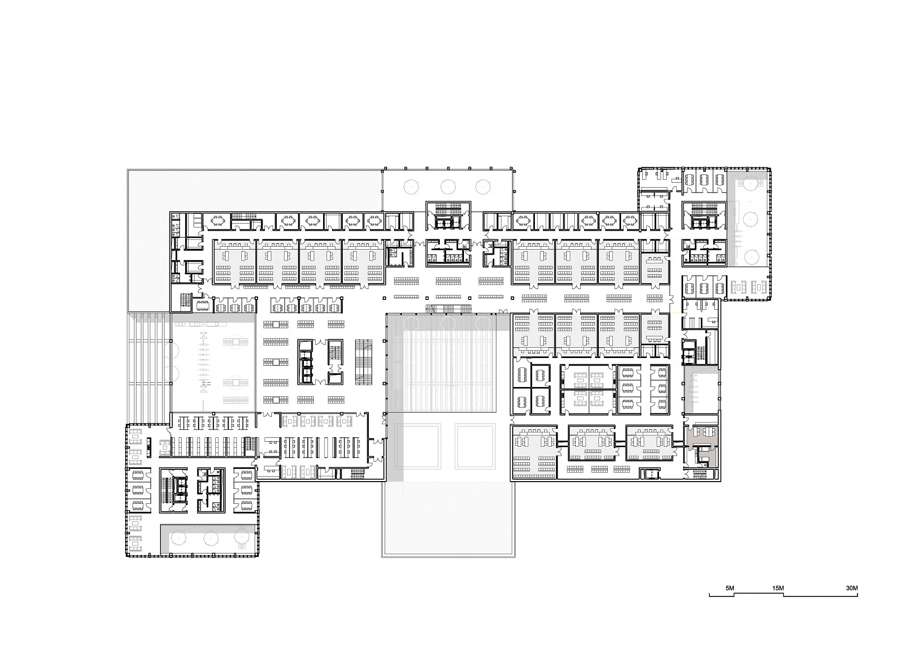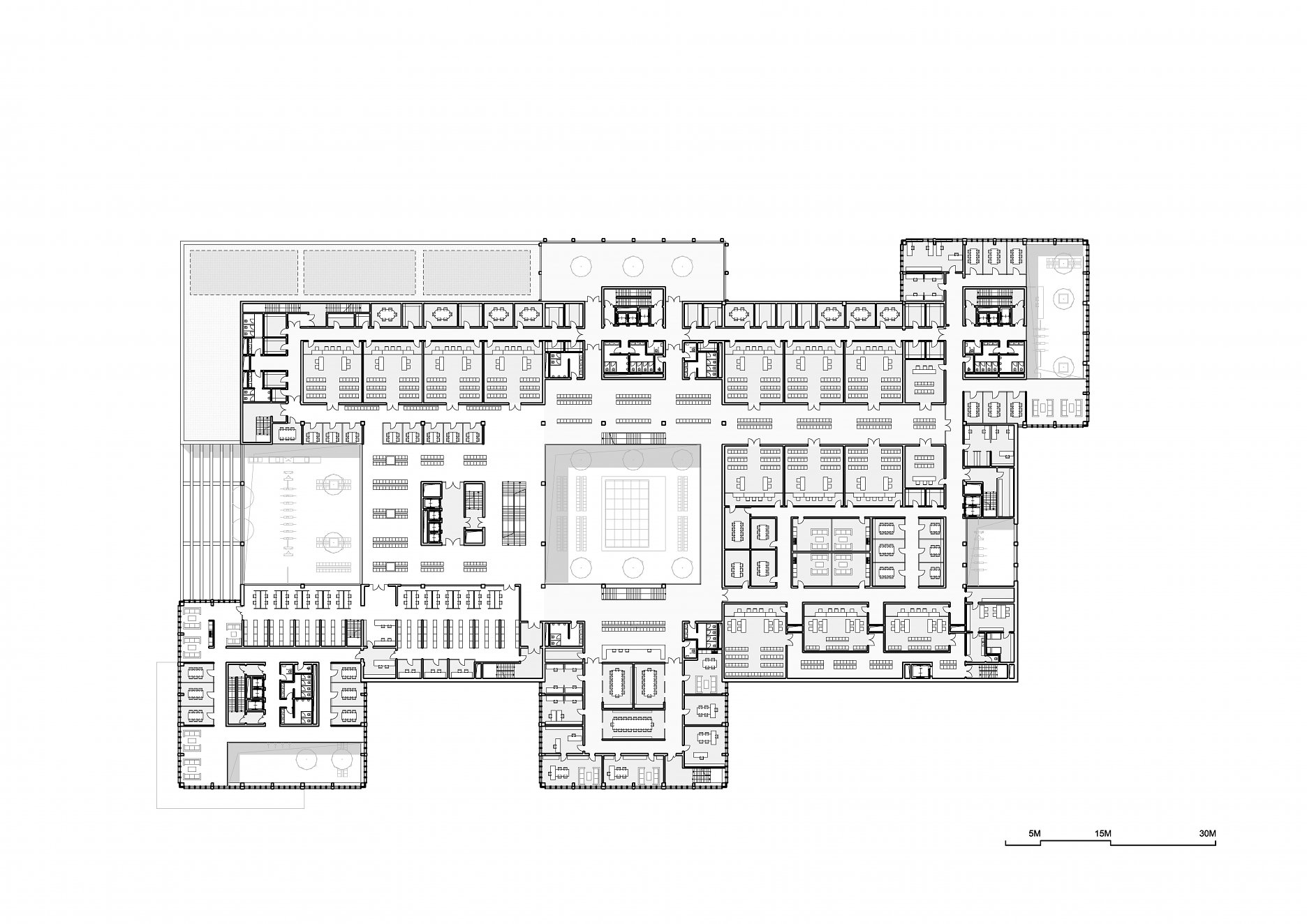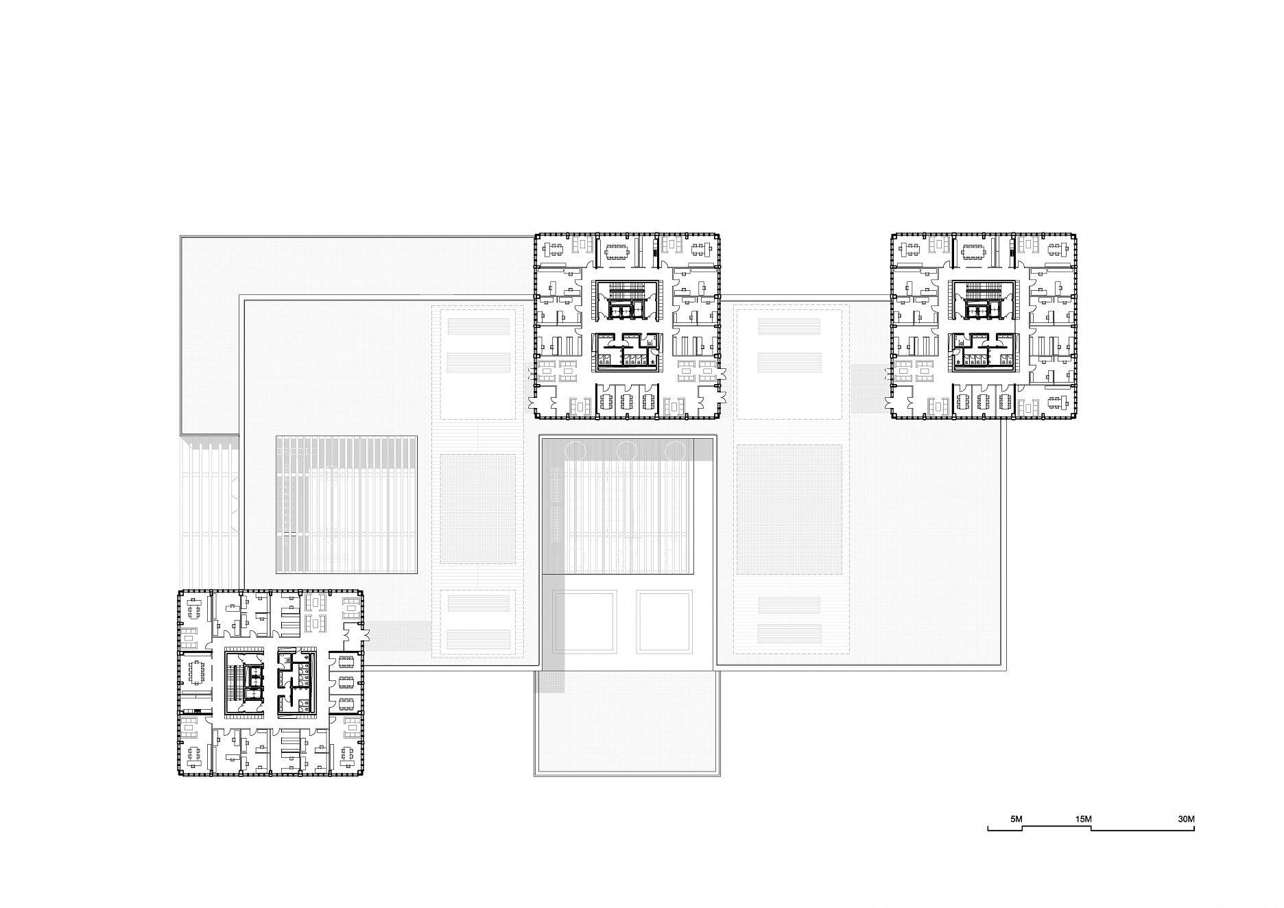 Objekt tvorí trojpodlažná obdĺžniková podnož, do ktorej sú pravidelne vysadené štyri kubusy so štvorcovým pôdorysom - tri výškové budovy a hmota pre kongresovú sálu. Stavba je rozdelená na tri špecializované súdne úseky podľa jednotlivých súdnych agend. Do troch výškových budov sú umiestnené administratívne priestory pre spomínané súdne úseky. V podnoži budovy sú situované pojednávacie miestnosti, súdny úrad, vedenie súdu, služby pre verejnosť, kongresové a obslužné priestory.