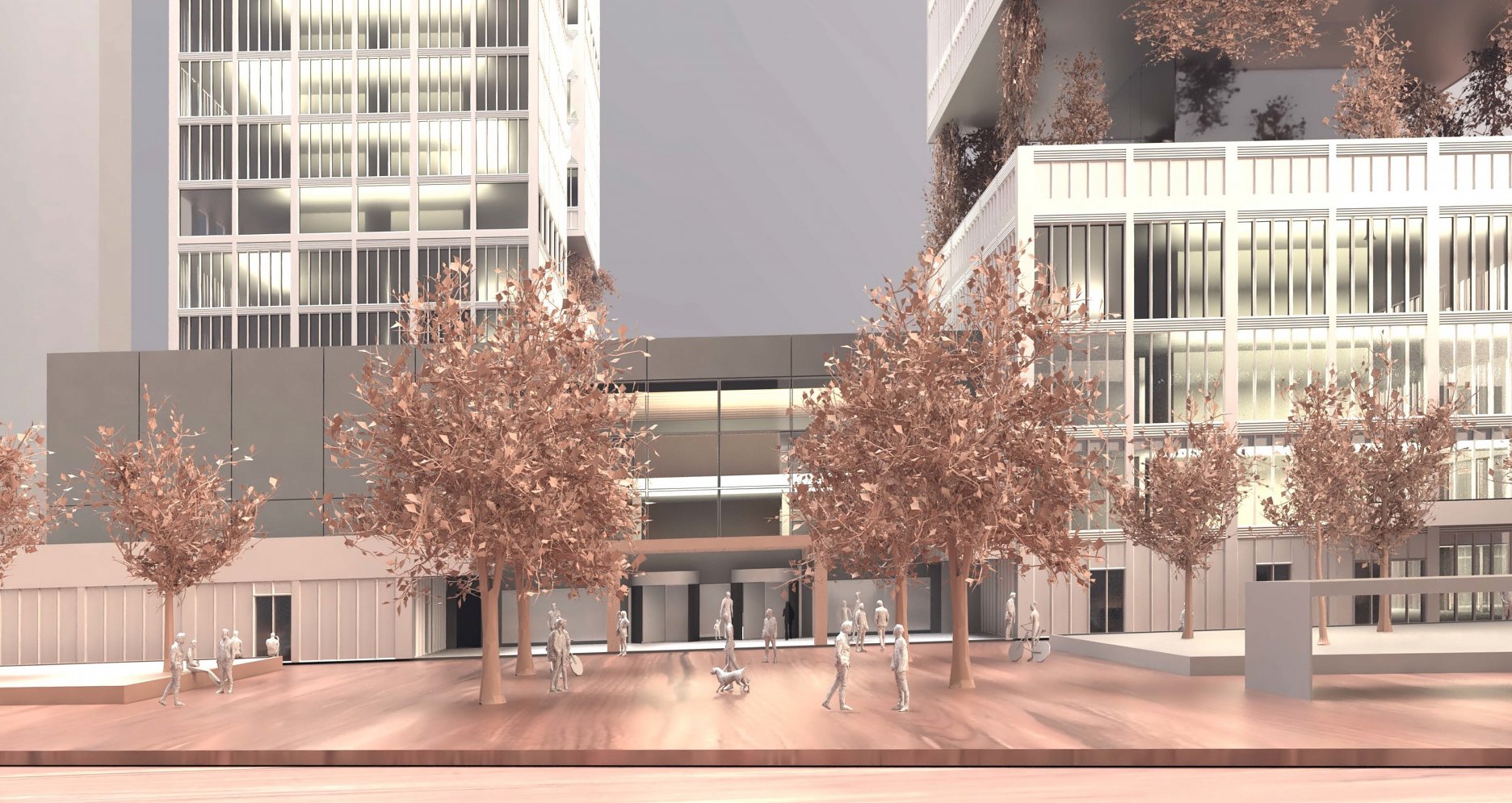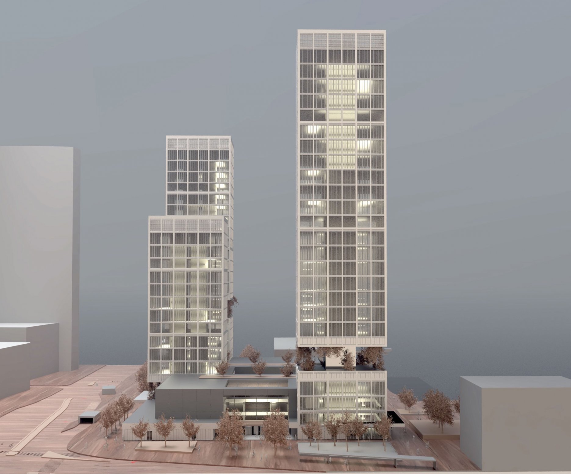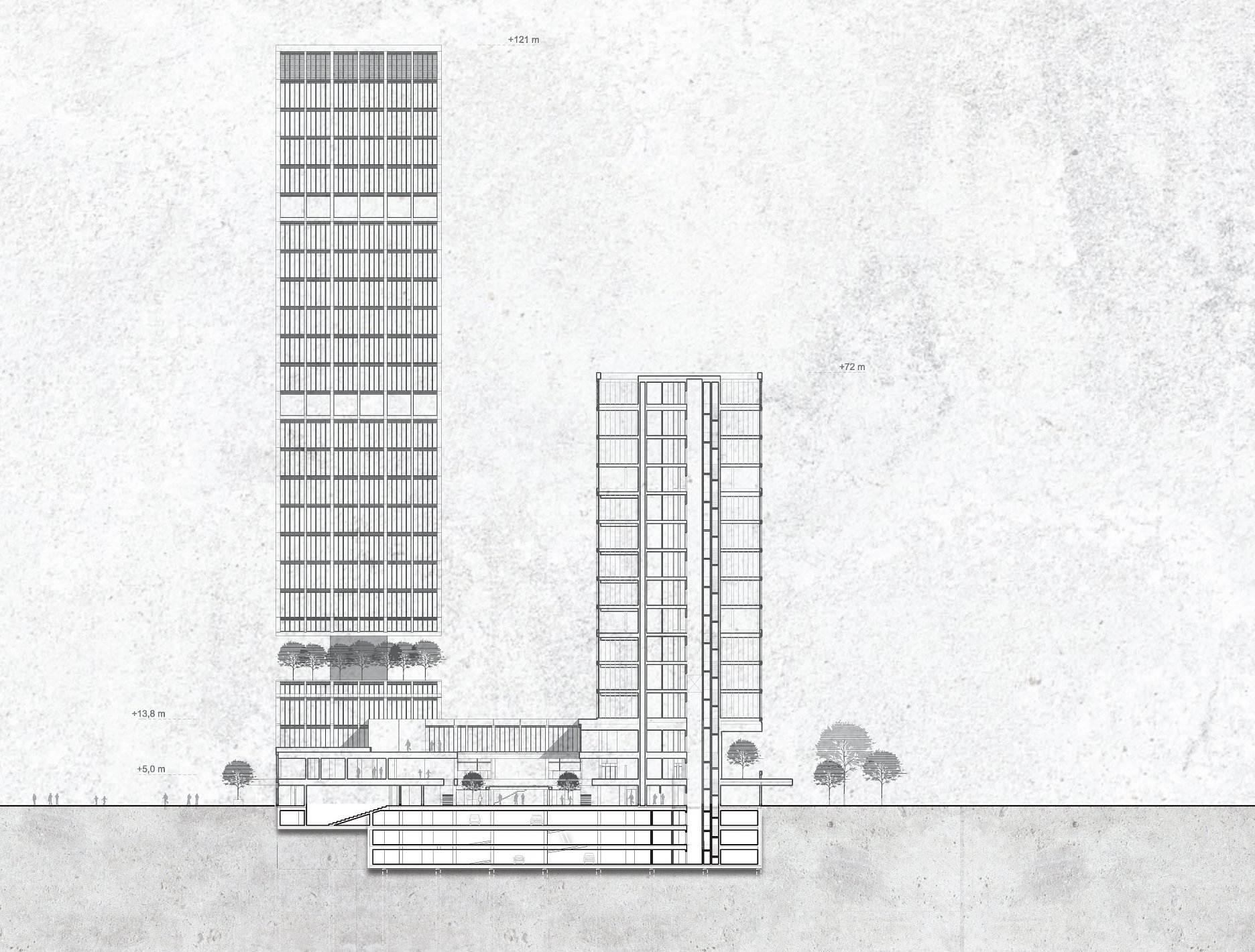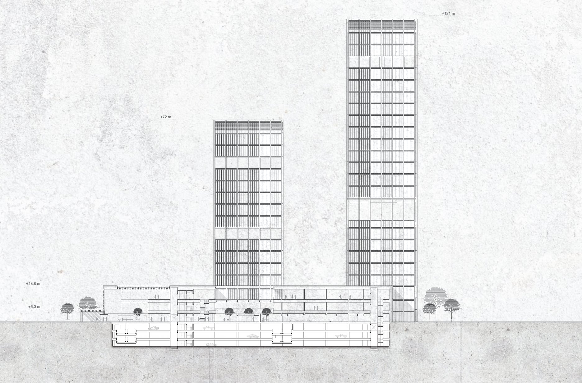 Veľkoformátové vláknocementové dosky, použité na fasáde podnože, sú uchytené do predsadeného oceľového roštu. Fasáda výškových budov je riešená ako dvojplášťová panelová, s integrovanými tienidlami. Panely sú kotvené na oceľové prvky, zapustené do železobetónových stropných dosiek.