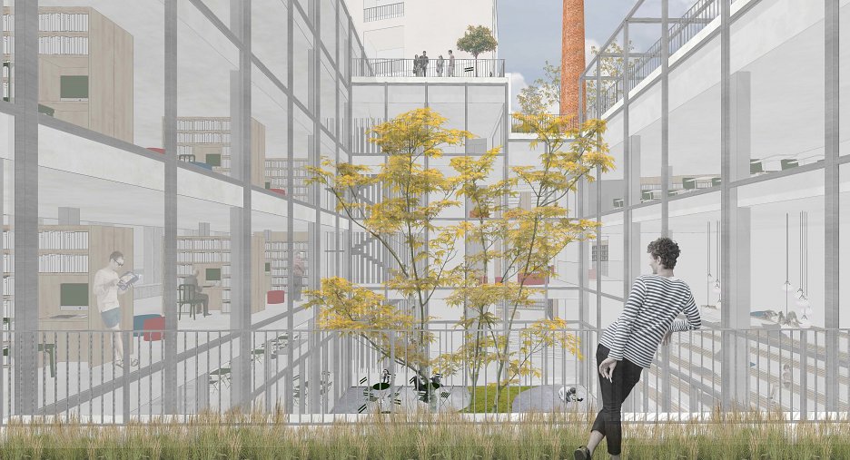 Hlavnou navrhovanou funkciou v objekte prístavby (a prieluky) je mestská knižnica s kaviarňou a kníhkupectvom na prízemí, a zachovanou funkciou bývania na 4. – 7. podlaží. Prieluku tvorí subtílna oceľová konštrukcia s dominantným priestorom átria. Zámerom bolo vytvoriť viacúrovňovú modulovú konštrukciu, nadväzujúcu na rôznorodú strešnú krajinu bloku ponúkajúcu množstvo svetla, otvorených priestorov a zelene, ktorá sa objavuje na všetkých postupne ustupujúcich strechách. Návrh ponúka množstvo komunitných aj súkromných priestorov pre štúdium, záujmové aktivity a relax. Knižnicu na 2. a 3. podlaží dopĺňajú priestory pre co-working, dielne, študovne a pobytové schodisko.