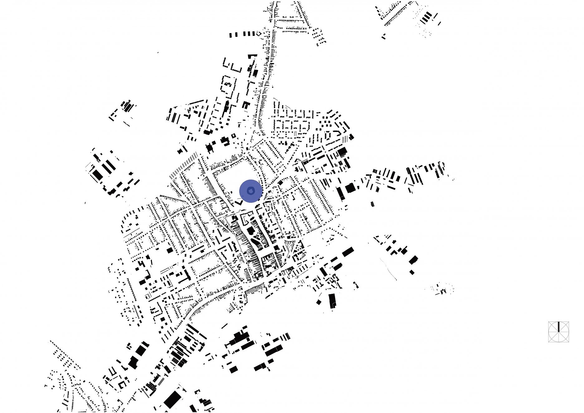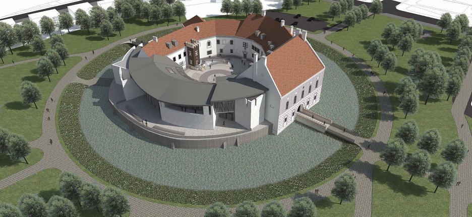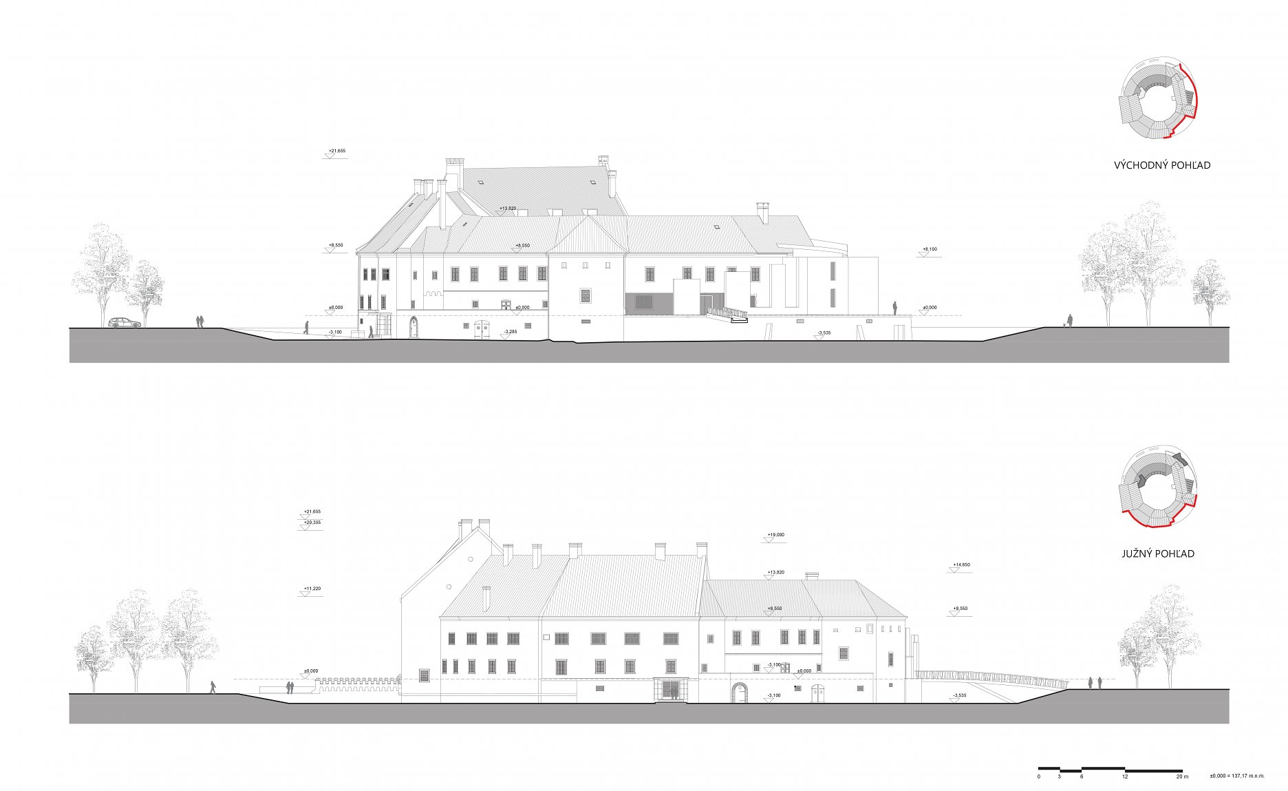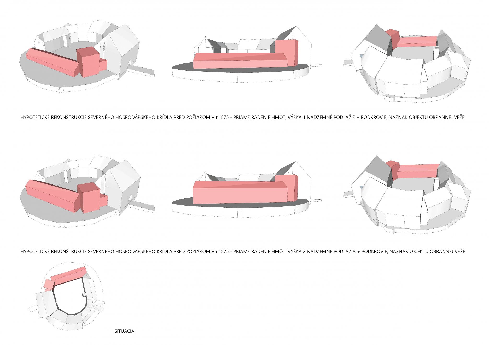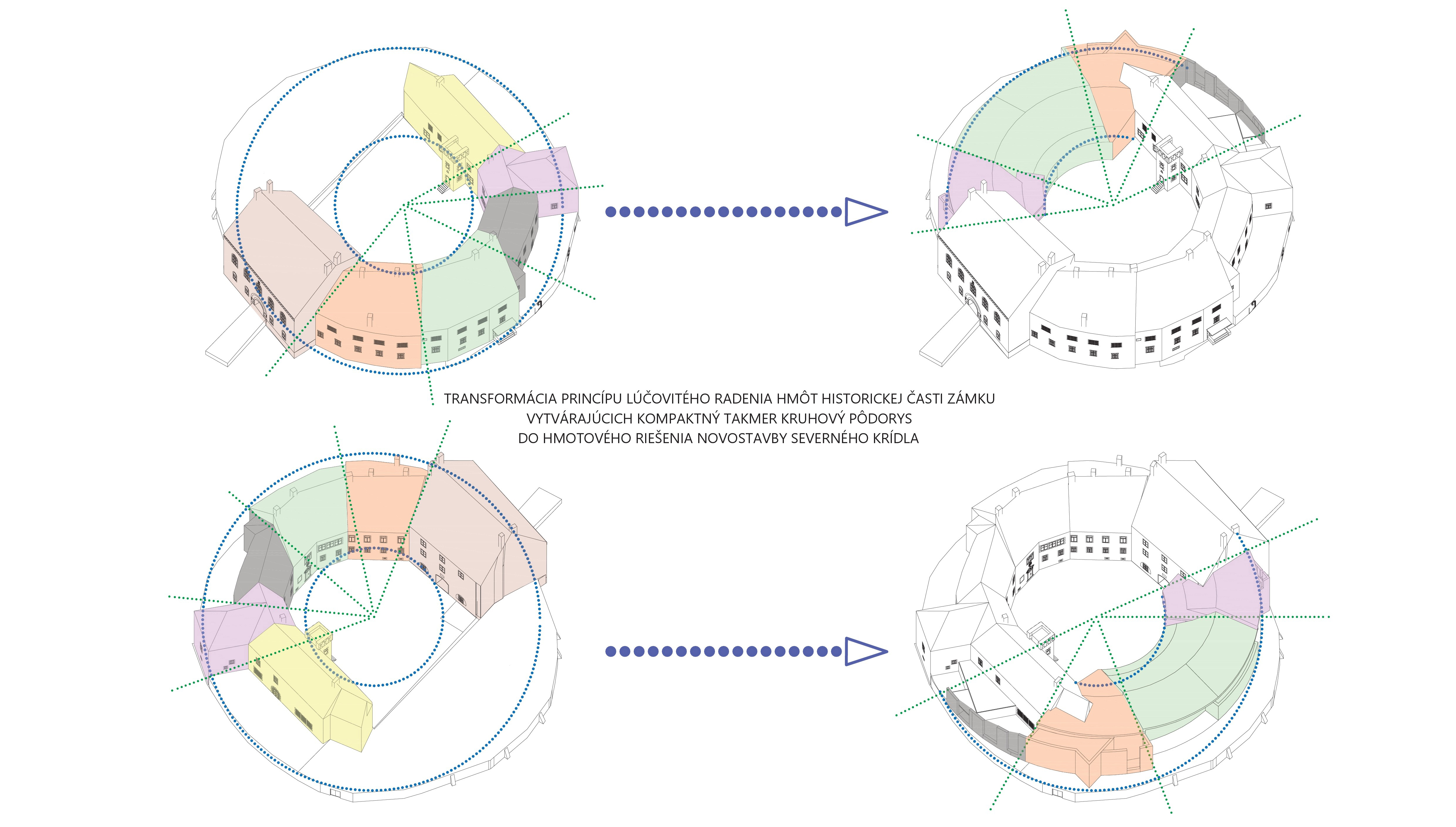 Koncept tvarovania hmoty novostavby je inšpirovaný práve týmto princípom, jasne čitateľným v hmote historickej časti objektu. Počiatočný bod priamok vymedzujúcich hlavnú hmotovo-priestorovú skladbu novostavby bol posunutý po kompozičnej osi smerom ku hlavnému vstupu do južného krídla z nádvoria. Samotné tvarovanie hrubých obrysov vychádza z prienikov týchto priamok s kruhmi opisujúcimi pôvodnú hmotu zámku v niekoľkých rovinách, od prízemia, cez poschodie až po tvarovanie strešnej roviny. V dotyku na renesančný palác je navrhnutý komunikačno-hygienický uzol ako odpoveď na pravdepodobné umiestnenie obrannej veže.