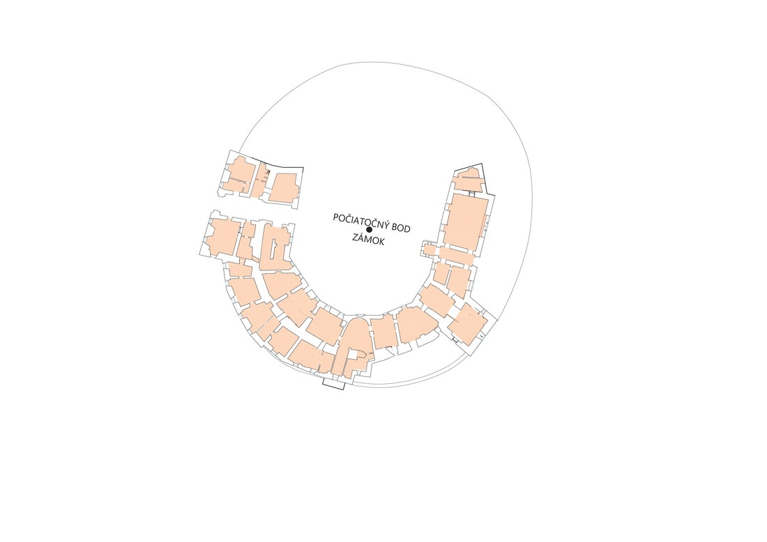 Urbanistické usporiadanie vnútorného mesta jednoznačne vymedzuje kompozičnú os, na vyústení ktorej je situovaný objekt zámku. Ďalšiu kompozičnú os možno stanoviť ako os prejazdu pod dominantnou hmotou západného krídla. Priesečník týchto dvoch osí vytvára stred, počiatočný bol hmotovo-priestorovej skladby zámku, ktorého objem je „vpísaný“ do sústredných kružníc so stredom v spomínanom počiatočnom bode. Radenie interiérových priestorov je akoby vnútri lúčových výsekov zo sústredných kružníc.
