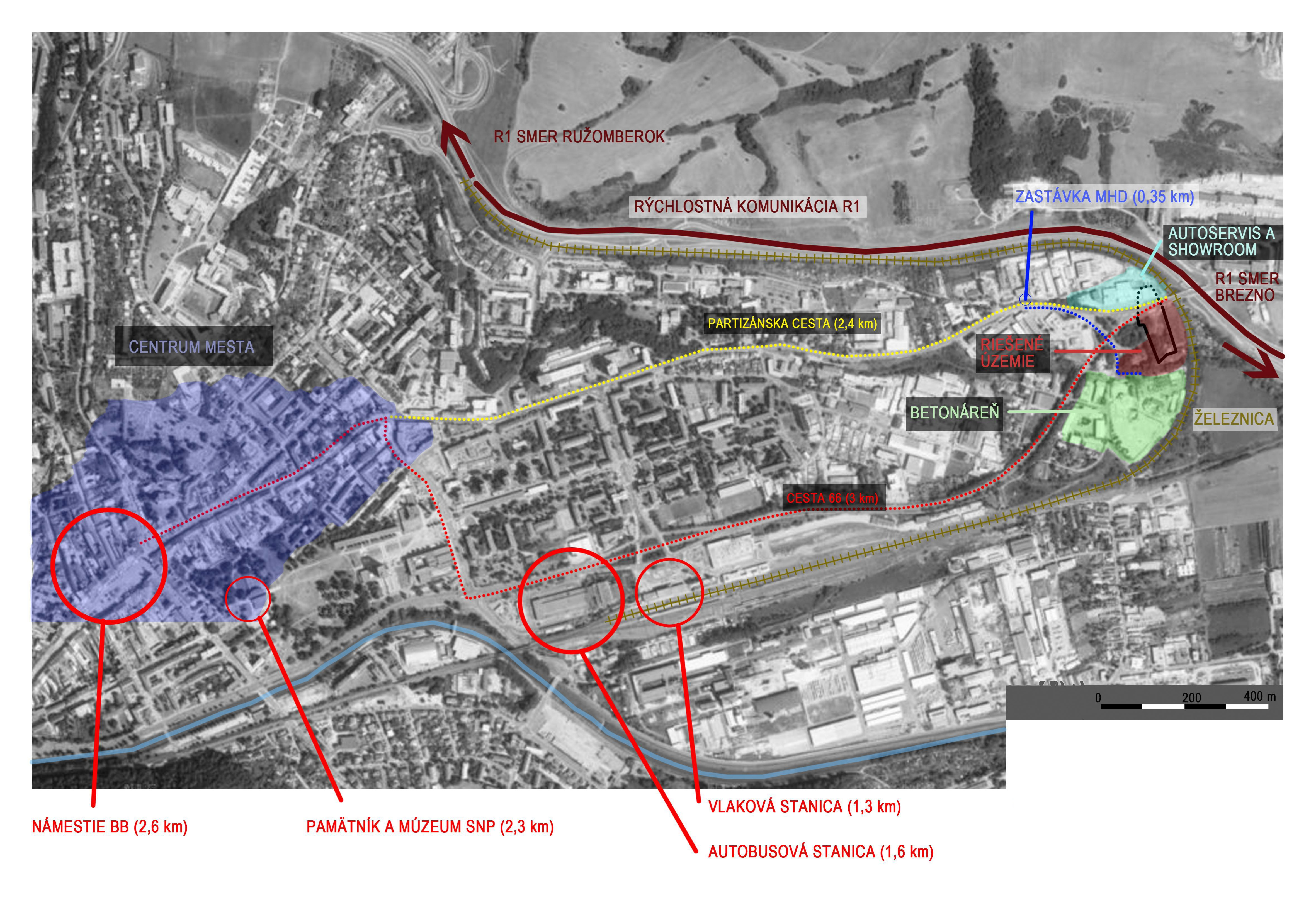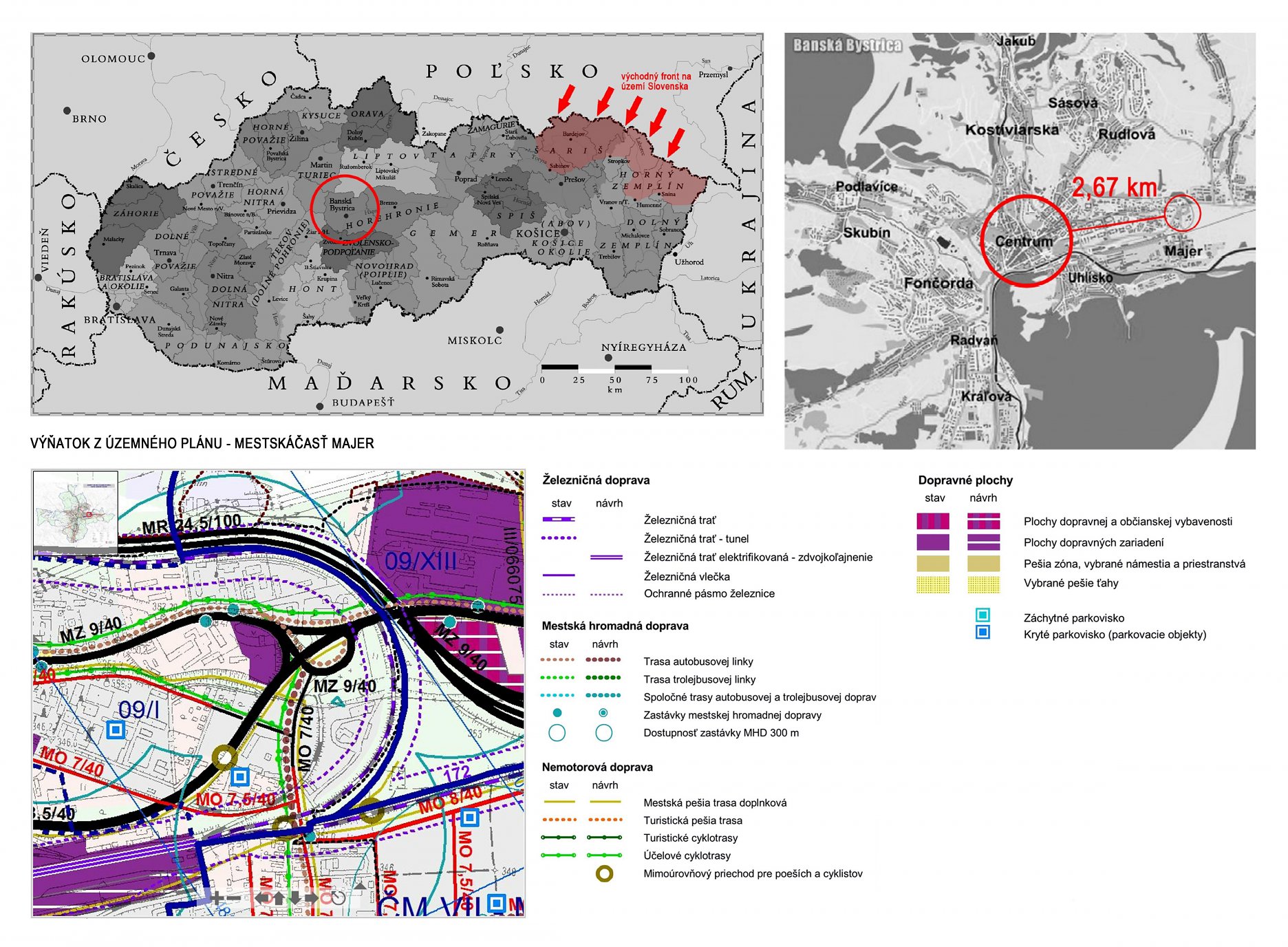 V súčasnosti niekdajší vojenský cintorín križujú dva významné cestné ťahy. Prvým z nich je z juhu smerujúca cesta 66, ktorá vedie popri vlakovej a autobusovej stanici popri nami riešenom území smerom do Brezna. Východne od riešeného územia táto komunikácia prechádza do nadjazdu ponad jej privádzač smerujúci z priemyselnej zóny situovanej južne od cintorína. Druhým významným dopravným ťahom je Partizánska cesta smerujúca z centra Banskej Bystrice a spája sa s cestou 66 práve v tesnej blízkosti cintorína v Majeri. Spomínaná križovatka je predmetnou križovatkou, ktorej projekt z roku 1976 zničil značnú časť cintorína. Nami navrhovaný objekt múzea je vzdialený menej ako 350 metrov od najbližšej zastávky MHD. Územný plán mesta Banská Bystrica však ráta s návrhom novej autobusovej linky smerujúcej po ulici Stavbárska v smere na centrum mesta. Na tento návrh bude projekt cintorína reagovať doplnením zastávky MHD v tesnej blízkosti parkoviska pod cintorínom, po dôkladnom zvážení dopravnej situácie v danom území. Parkovanie v blízkosti objektu je realizované na parcele 5670/1 a zahŕňa jedno autobusové státie a päť státí pre osobné automobily, čo predstavuje asi počet, 60 návštevníkov. K riešenej parcele smeruje aj mestom vybudovaná účelová cyklotrasa smerujúca po Stavebnej ulici smerom k navrhovanému parkovisku. Objekt múzea je navrhovaný v ochrannom pásme železnice nachádzajúcej sa na východ od riešeného územia a ráta s udelením výnimky na výstavbu v ňom.