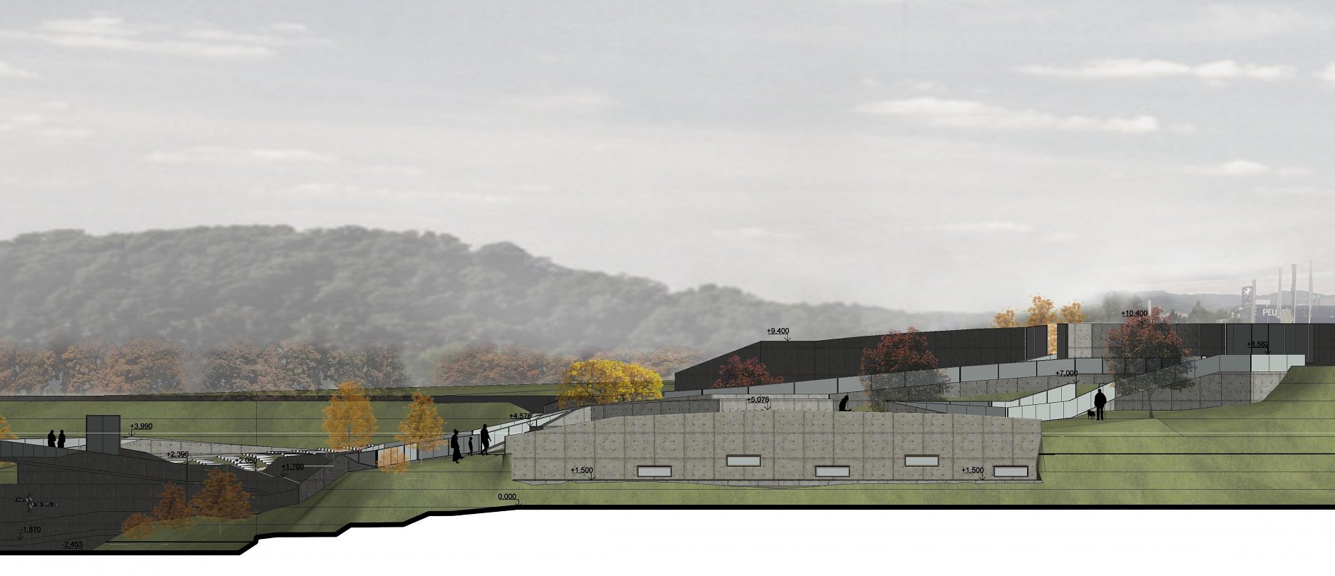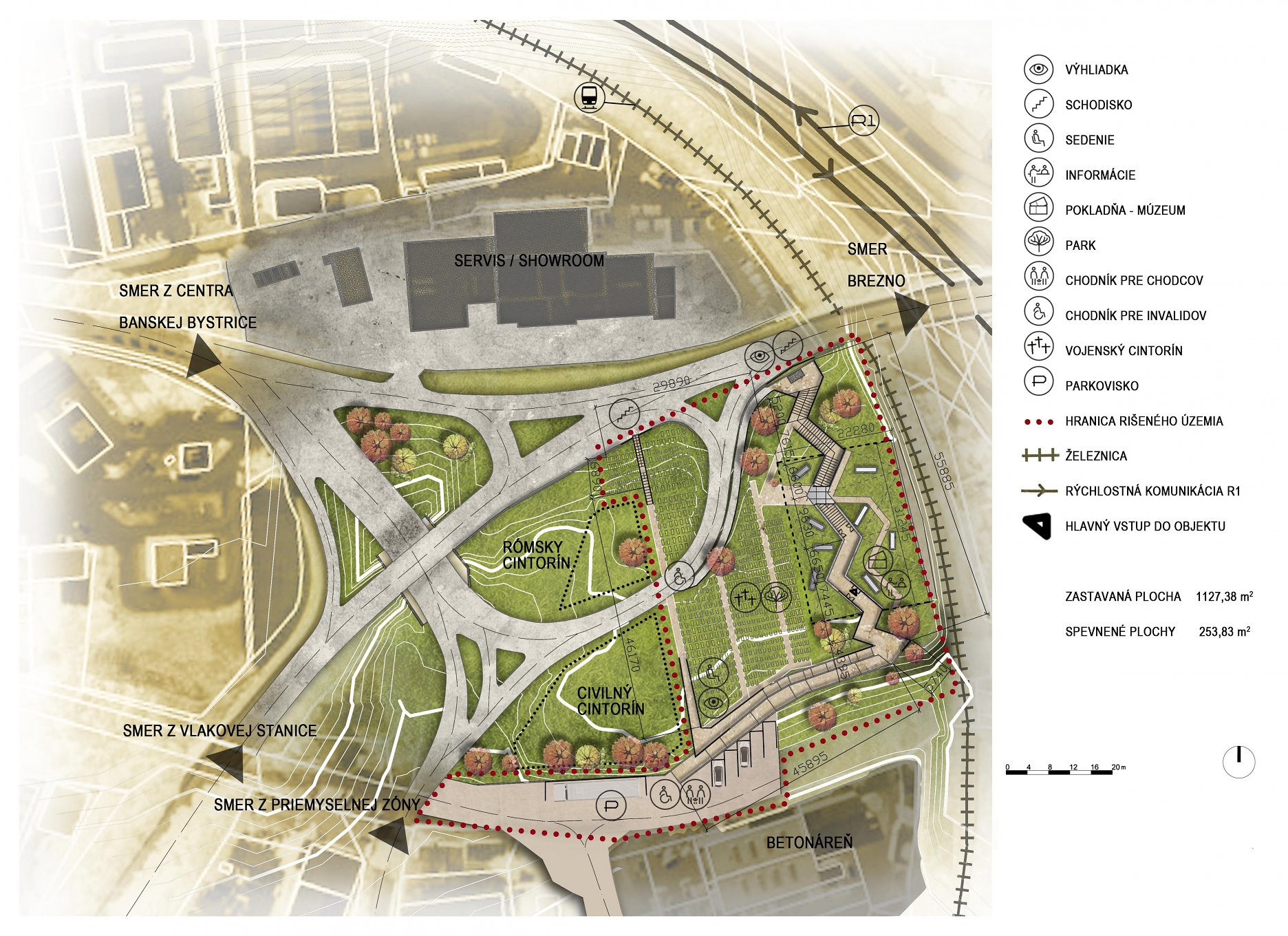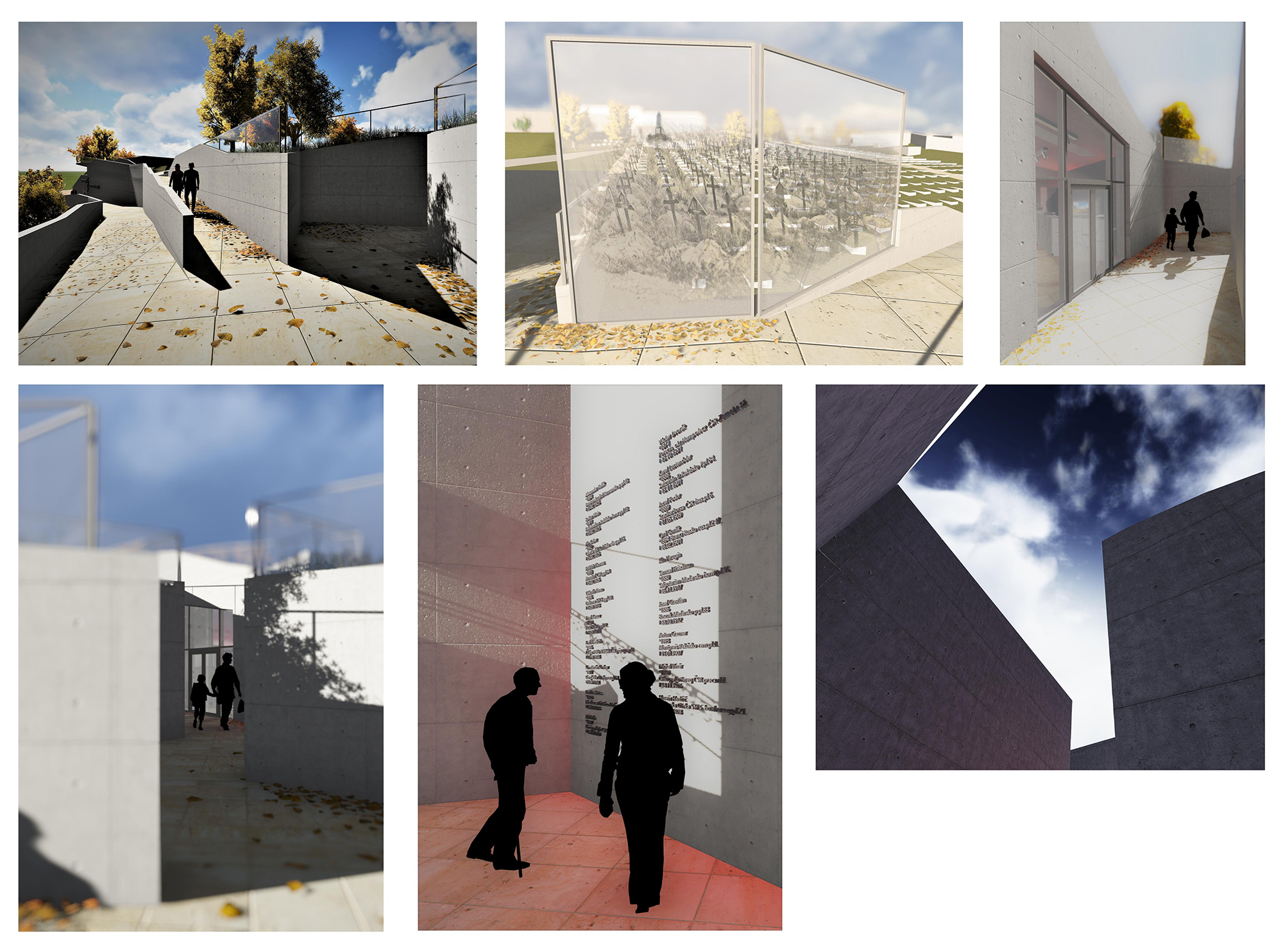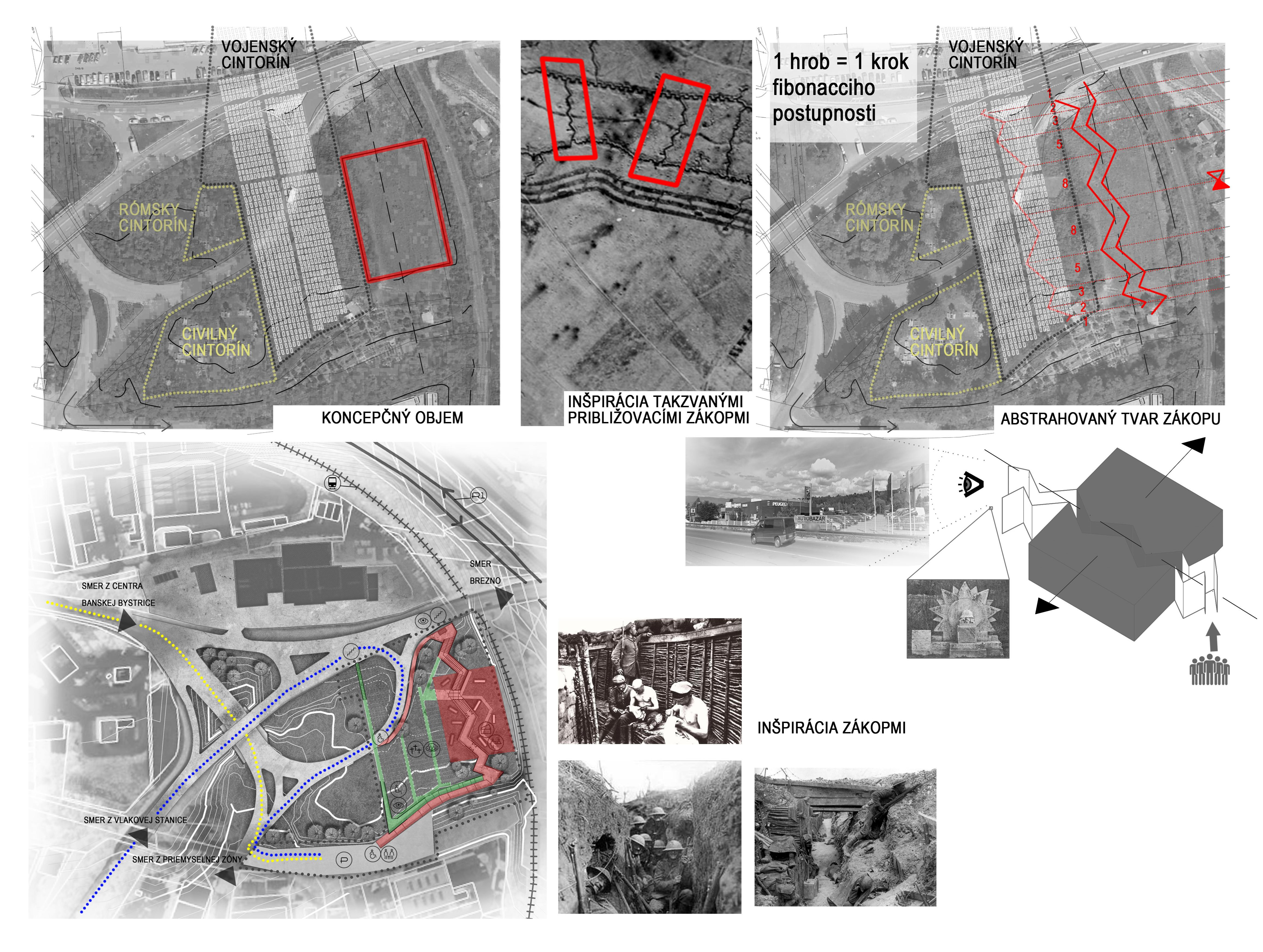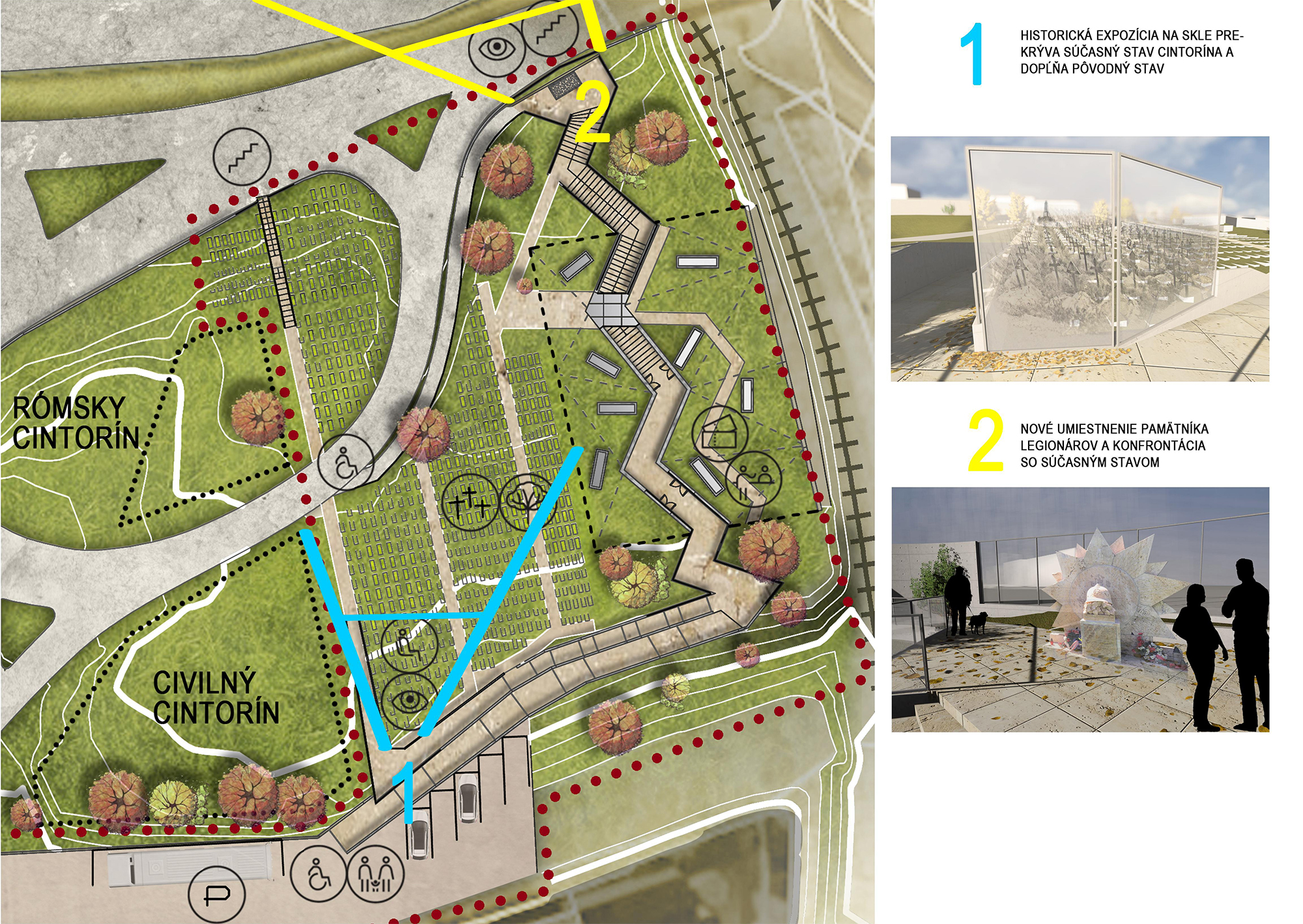 Zadanie spomínanej verejnej súťaže sme si prepožičali ako tému diplomovej práce a rozšírili ho o prístavbu expozície 1. svetovej vojny. Pre spomínanú prístavbu sme si vybrali priľahlú parcelu susediacu s cintorínom. Diplomová práca teda rieši obnovu cintorína, prístavbu expozície a komplexný návrh spevnených plôch, dopravného napojenie a parkovania v riešenom území.