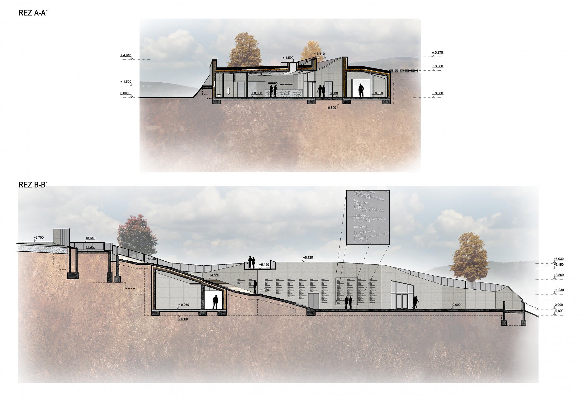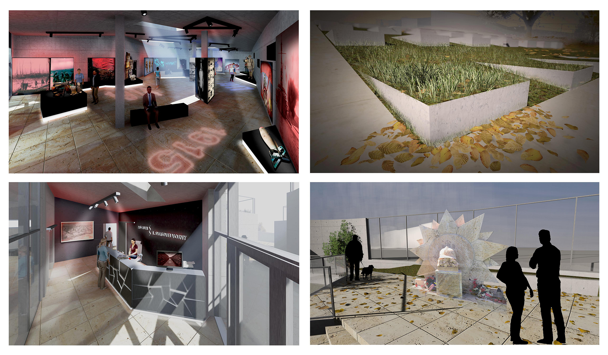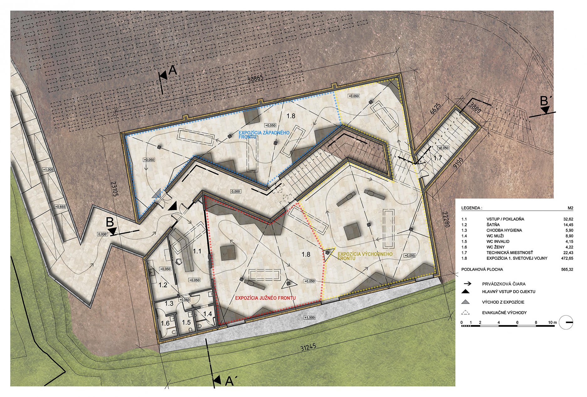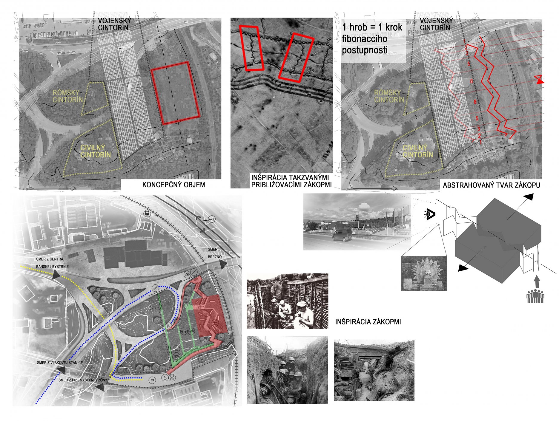 Navrhovaná budova múzea je hmotovo jednoduchá, v podstate ide o jednoduchú hmotu kvádra umiestnenú na parcele nachádzajúcej sa vedľa cintorína. Táto hmota paralelná s cintorínom je preseknutá chodníkom, ktorý vznikol abstrahovaním z tvaru takzvaného približovacieho zákopu, často využívaného v zákopových bitkách 1.svetovej vojny. Pri určovaní dĺžky úsekov medzi zalomeniami zákopu nám poslúžila fibonacciho postupnosť, pričom základnou jednotkou miery bola dĺžka hrobového miesta v priľahlom vojenskom cintoríne v Majeri. Nakoľko bolo našou snahou čo najmenej zasahovať do nivelety terénu riešeného územia, hmotu objektu sme umiestnili pod terén. Zákop, ktorý pretína hmotu objektu a tak vyrezáva z neho dve hmoty, prekonáva výškový rozdiel medzi začiatkom a koncom zárezu schodiskom. Spomínané dve časti hmoty sú spojené komunikáciou prebiehajúcou práve pod spomínaným schodiskom a taktiež priestory technického zázemia navrhovaného objektu sú situované pod týmto schodiskom.