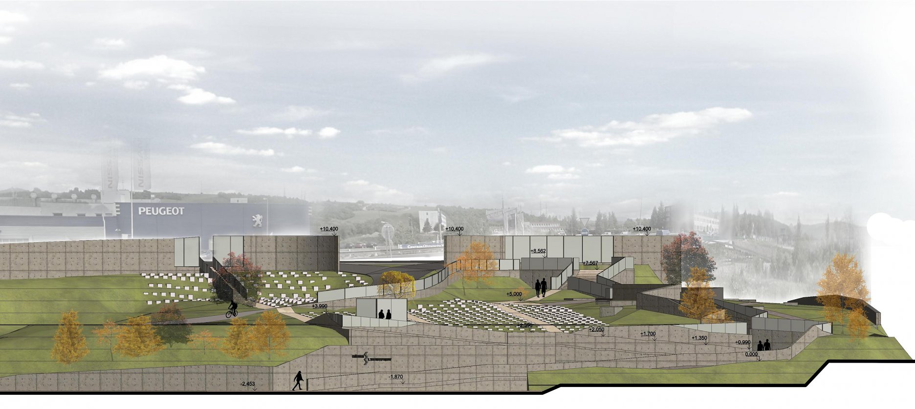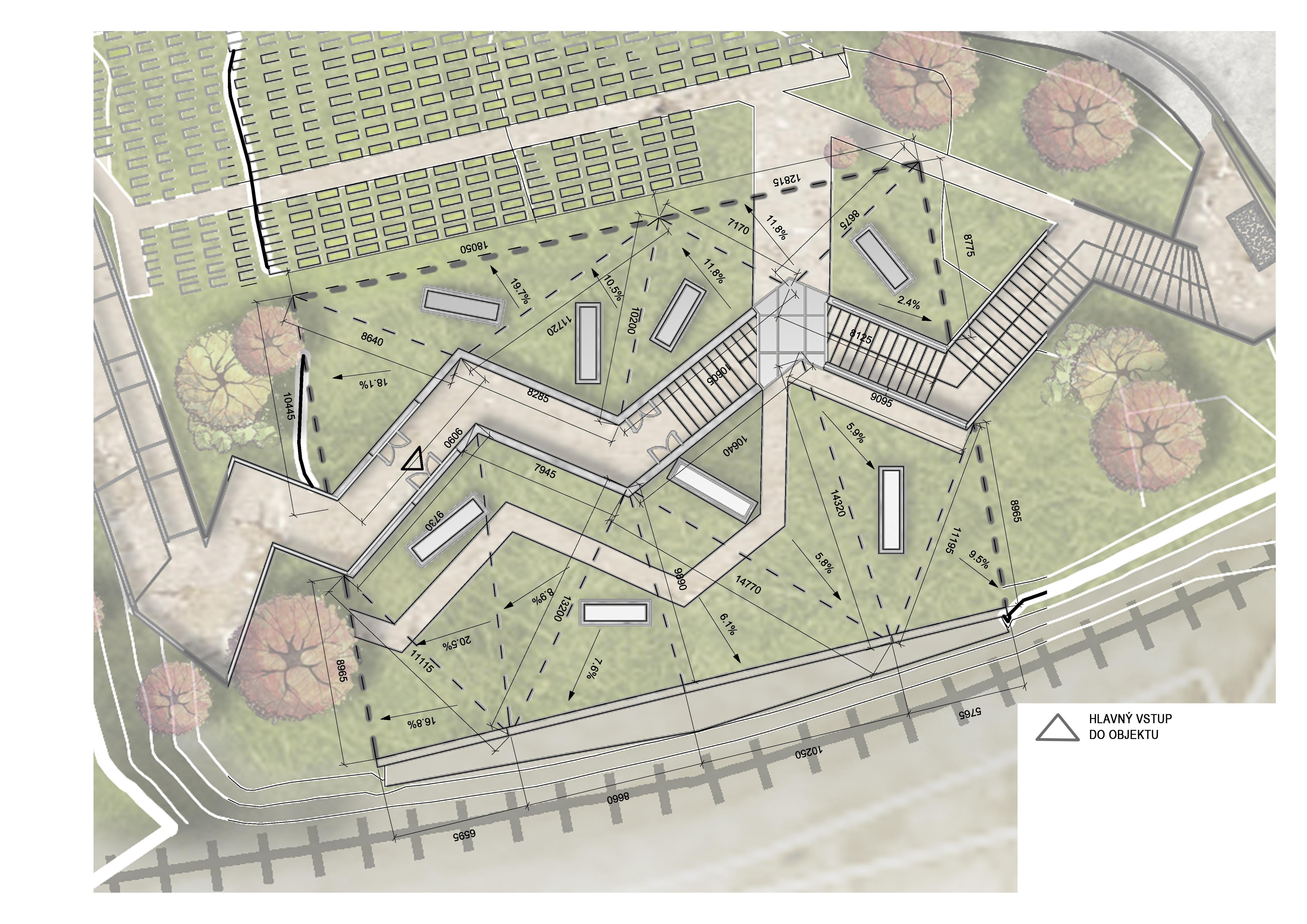 Od parkoviska situovaného medzi cintorínom a priľahlou betonárňou sa dostávame rampou, ktorá slúži aj ako komunikácia pre invalidné osoby a osoby so sťaženým pohybom, do spomínaného zárezu ktorý akoby presekával navrhnutú hmotu objektu. Zákopom je možné defilovať po schodisku smerom hore k najvyššiemu bodu terénu, kde sa nachádza pamätník legionárov. K pamätníku sa invalidné osoby dostanú chodníkom vedeným pozdĺž privádzača cesty 66, ktorý cintorín pretína. Zo zákopu je možné sa dostať aj na výhliadku, ktorá je situovaná v juhozápadnom rohu cintorína v Majeri a je realizovaná ako chodník, ktorého úroveň je len podvihnutá voči okolitému terénu a tak je zabezpečená bezbariérovosť tejto výhliadky. Výhliadka poskytuje výhľad cez sklo, na ktorom je vyobrazená polotransparentná fotografia historického vzhľadu cintorína a po postavení sa na určený bod sa prekrytím fotografie a reality naskytne návštevníkovi pohľad na podobu cintorína spred roku 1976. okrem pohľadu na cintorín poskytuje výhliadka aj pohľady na južnú stranu kotliny v ktorej sa mesto Banská Bystrica nachádza.