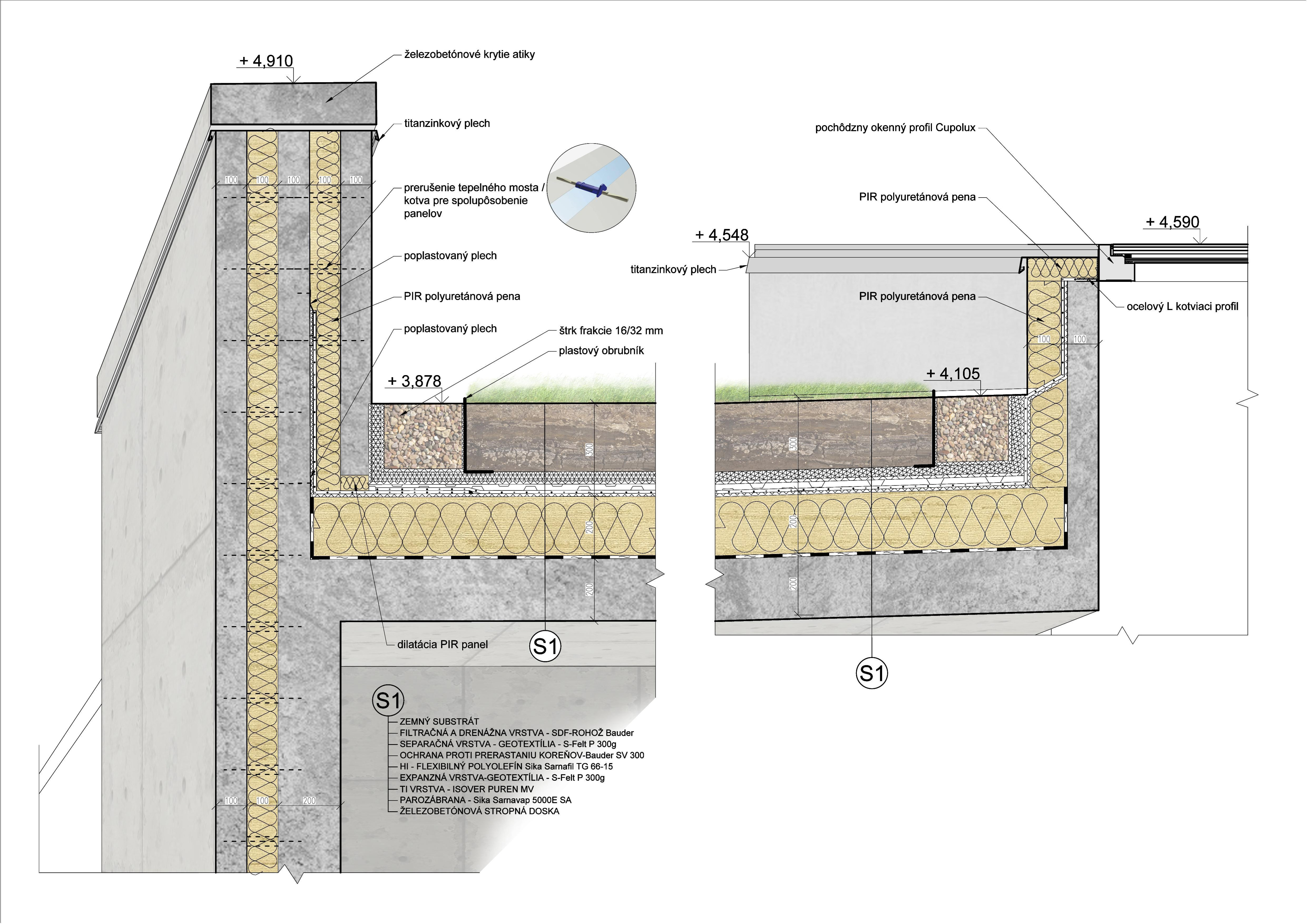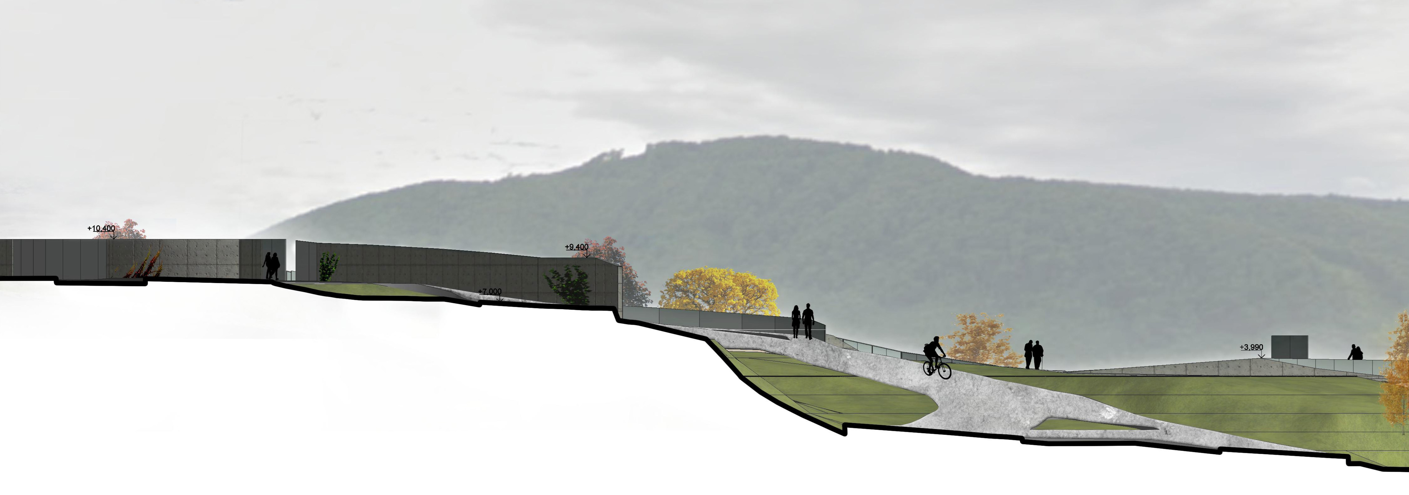 Keďže sme sa v návrhu snažili pokiaľ možno čo najviac rešpektovať pôvodný terén, simulovali sme jeho tvar zalamovaním hornej roviny objemu.