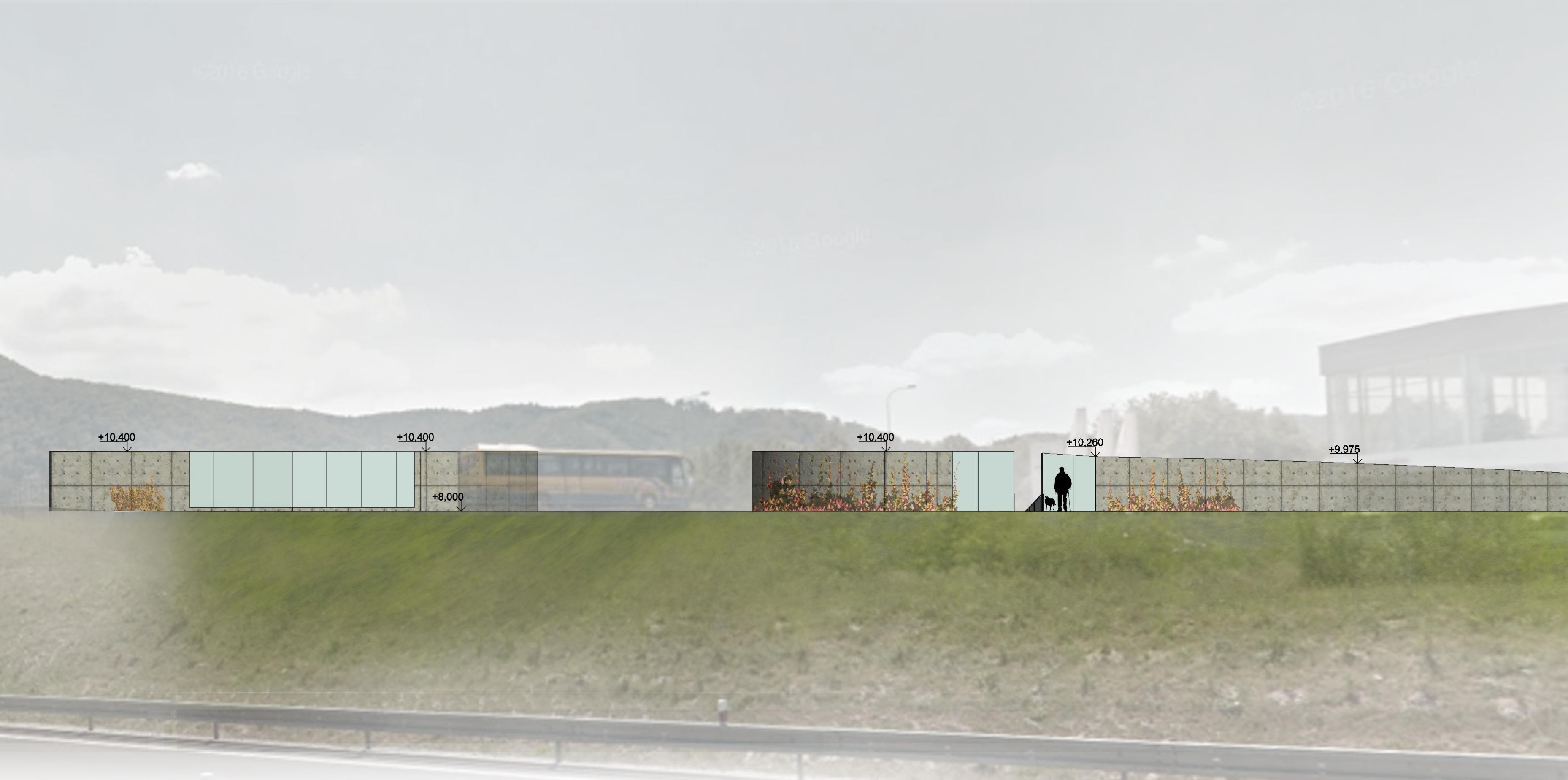 Z dôvodu presvetlenia bolo potrebné uvažovať s odkrytím pravej, teda východnej časti hmoty, zo strany železničnej trate a taktiež túto hmotu doplniť z hornej strany o kvádrové hmoty, ktoré poslúžia ako svetlíky. Nakoľko západná časť hmoty objektu priamo susedí s cintorínom, nemohla byť odkrytá a jej presvetlenie realizujeme pomocou kvádrových svetlíkov.