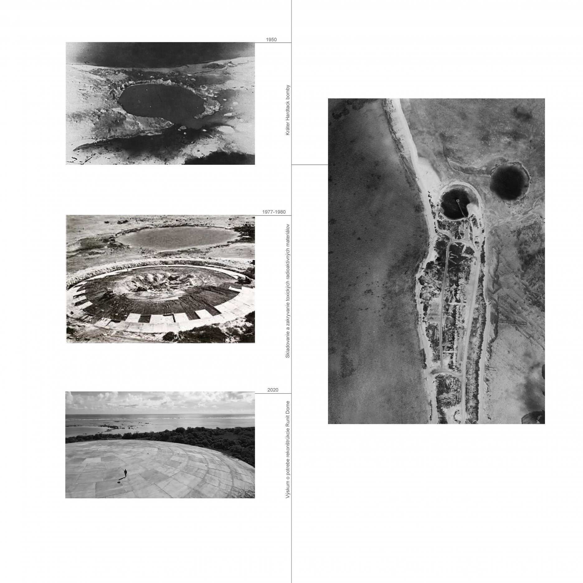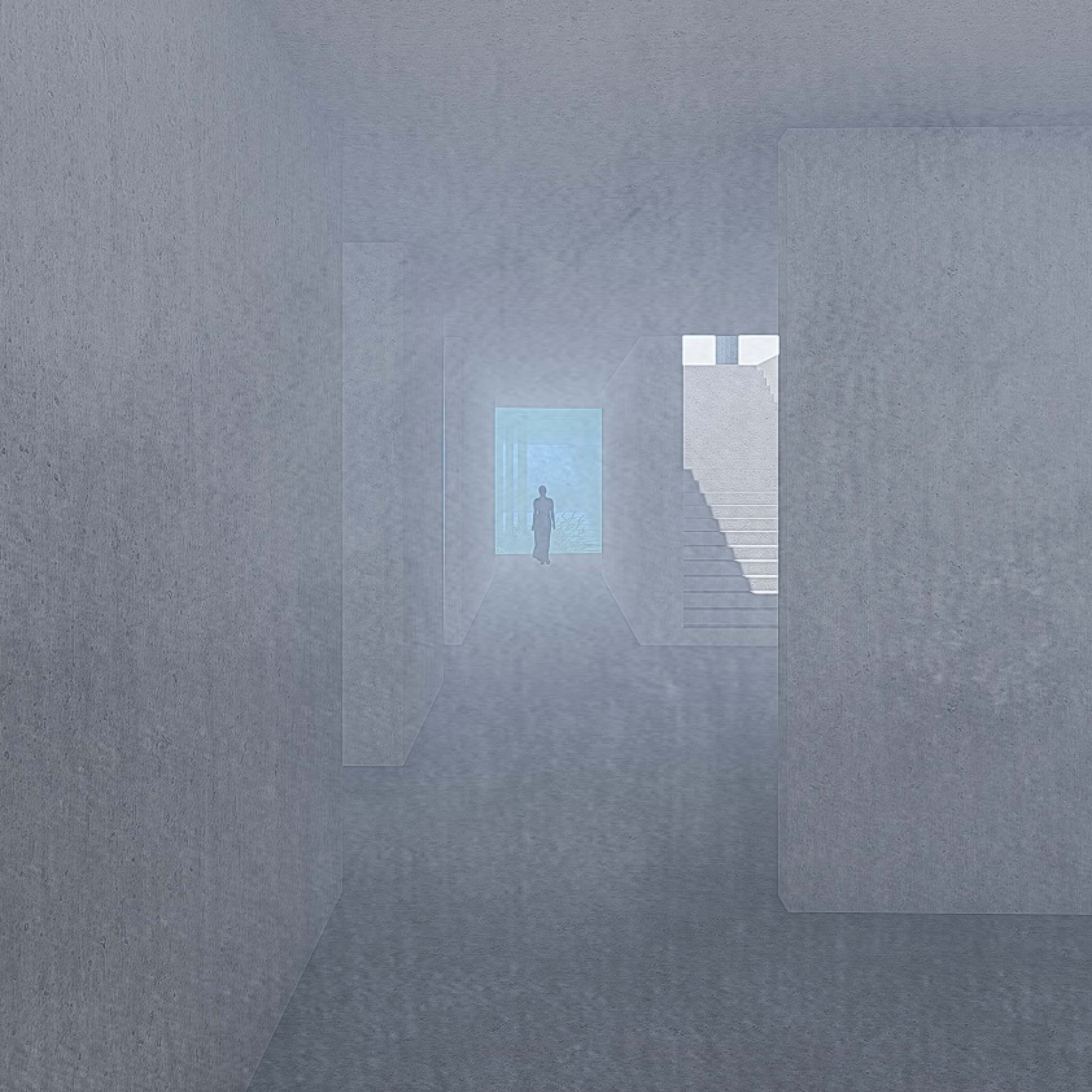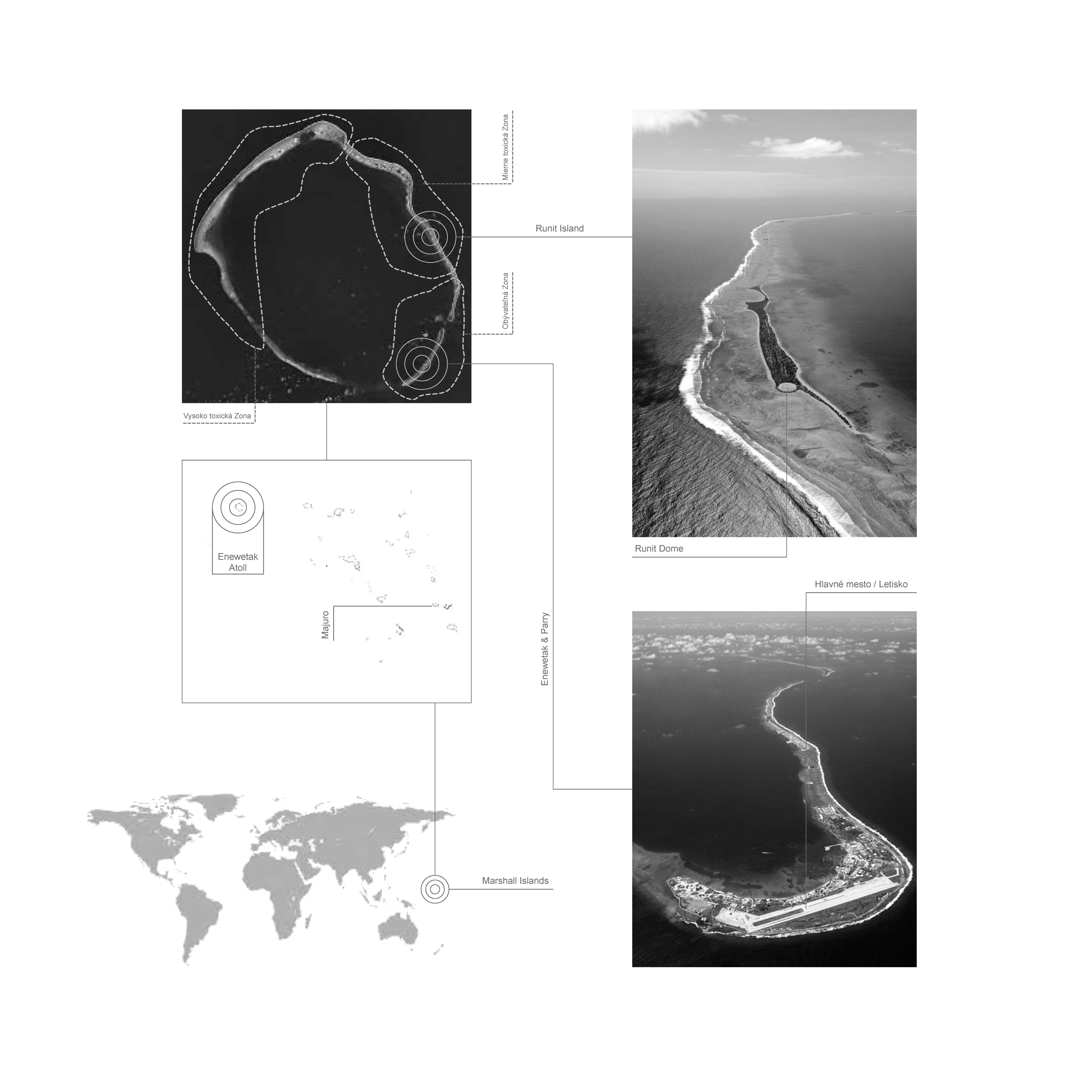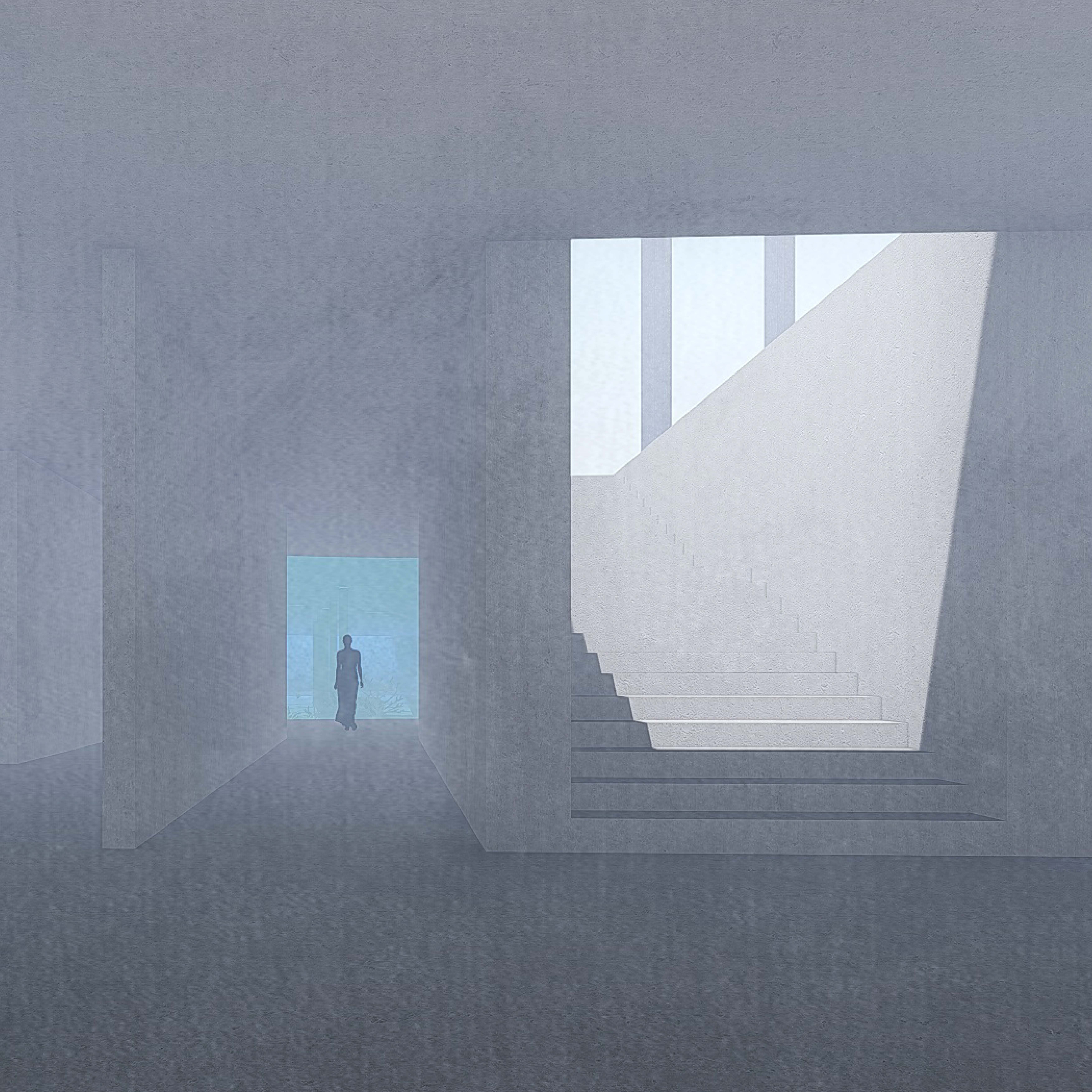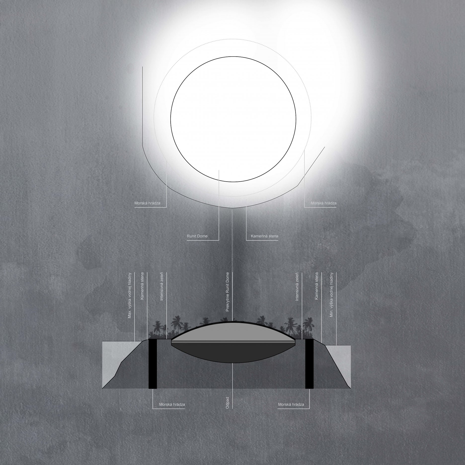 The aim of the diploma thesis is to create a conceptual architectural object located in a nuclear testing site that would symbolize the overall cycle of nuclear energy: from the aspiration to the massive destruction, it brought to human civilization, with the final aim to sensitize the visitor of the damage of the nuclear bomb by its own abstract form and volume and space and its communication with the nature around. The chosen site: Runit Island, Marshall Islands is a paradox within itself: a paradise made by nature, full of life and sun and surrounded by water, chosen to be destroyed with nuclear bombs, made inhabitable for humans by the human hand, invisibly deadly-visibly breathtaking. The Memorial should coexist within this paradox, by creating a balance for Runit Dome - the tomb in the island, and by hosting the „journey“ of catharsis of the island in its structure through different dichotomies made of scale, shape, shadow and light, materiality and nature. The Memorial, due to the still-present contamination and specific weather conditions of the island, can be visited only shortly during certain period of the year in small numbers of visitors. Therefore, the atmosphere of the Memorial should serve as the language of the sensitization itself. If the Runit Dome is a reminder of the past, a marked spot, an abstract tomb in this paradise island, the Memorial is designed to be the Anti-Tomb, the Upside-Down Tomb, the missing balance, the Tholos and Anti-Tholos, the entrance to the island which leads to the tomb and back to the Memorial. The overall journey mimics the religious forms of pilgrimage, a journey far away from civilization, which aims to explore existential questions of the human nature, the human role, ambition, modesty, ethics, aesthetics, time, temporality, hope, rebirth, life and death.