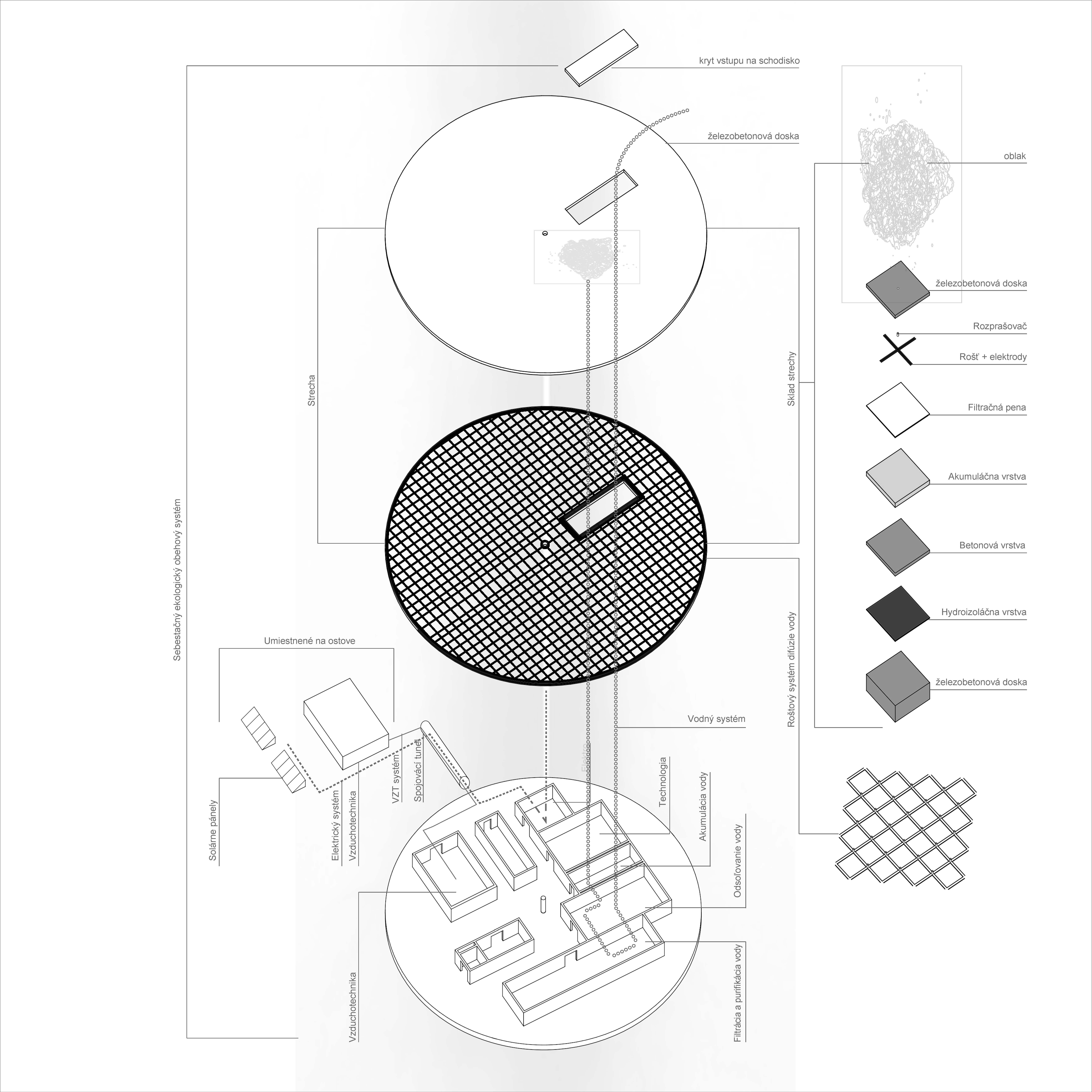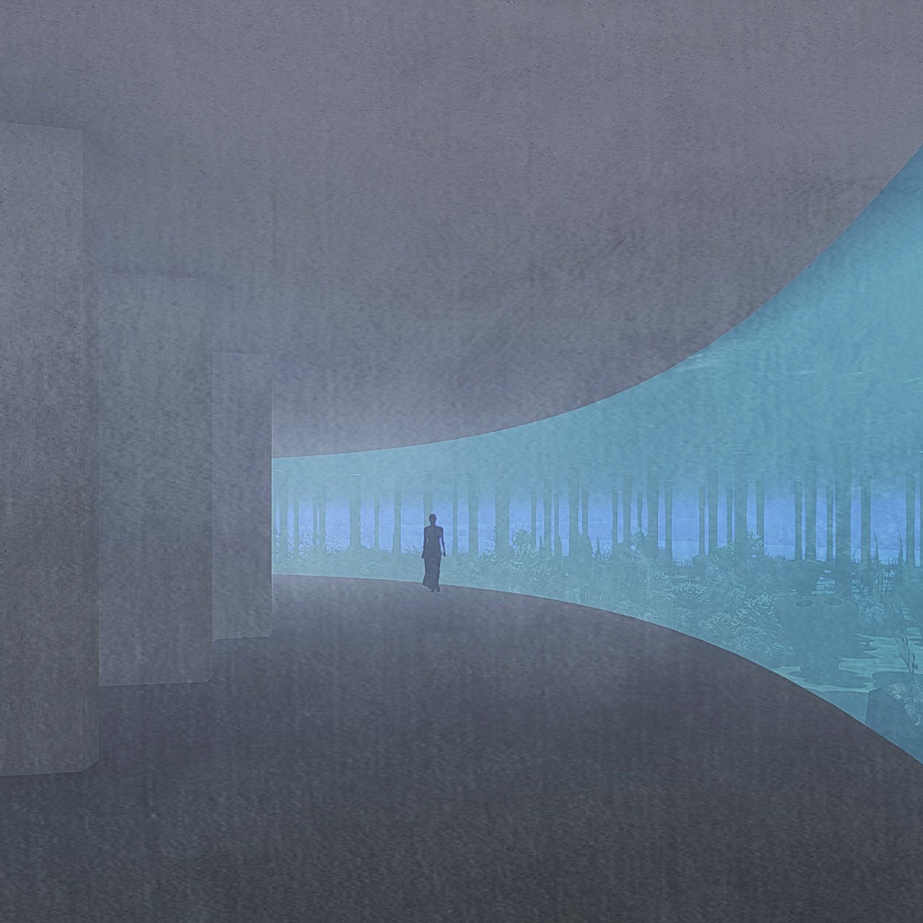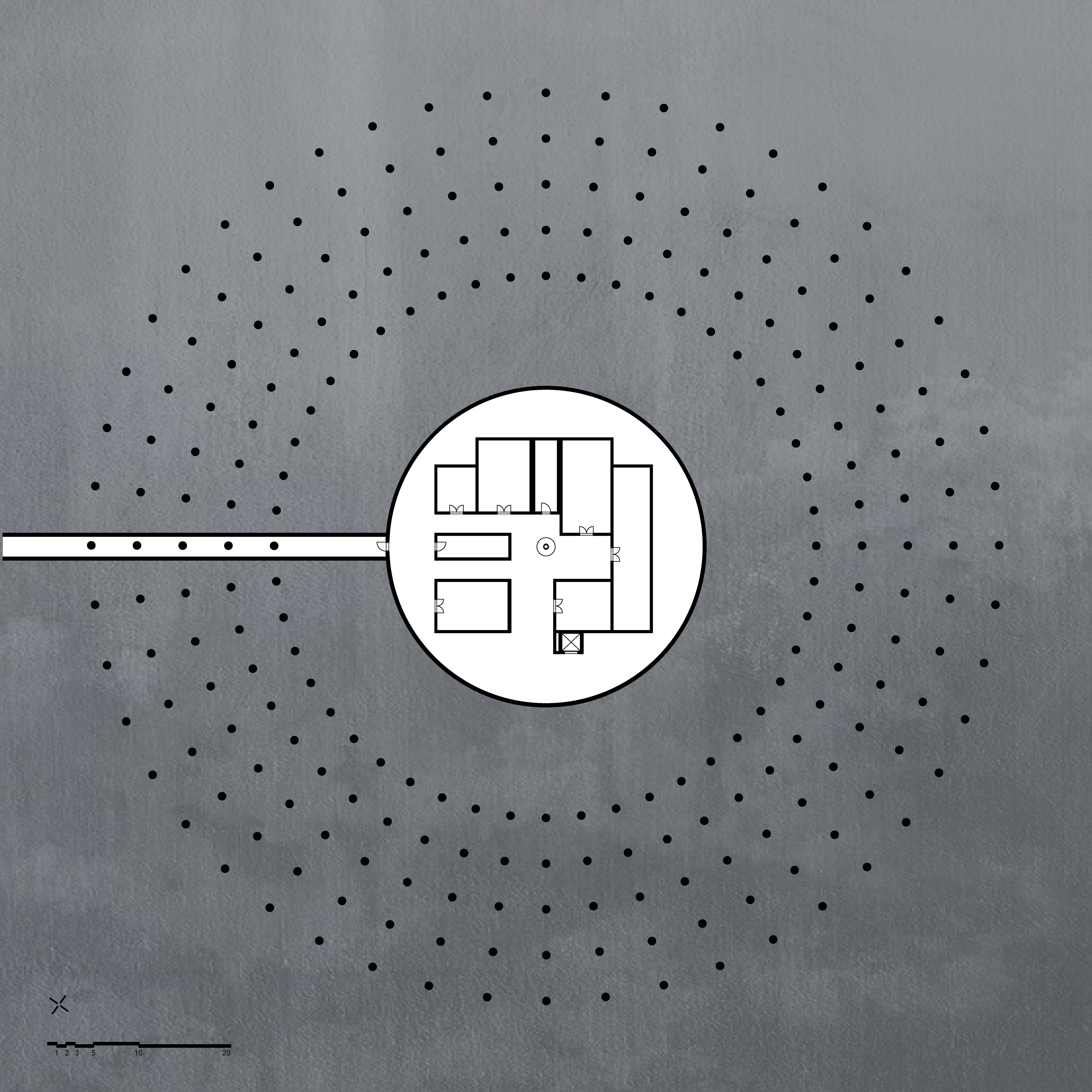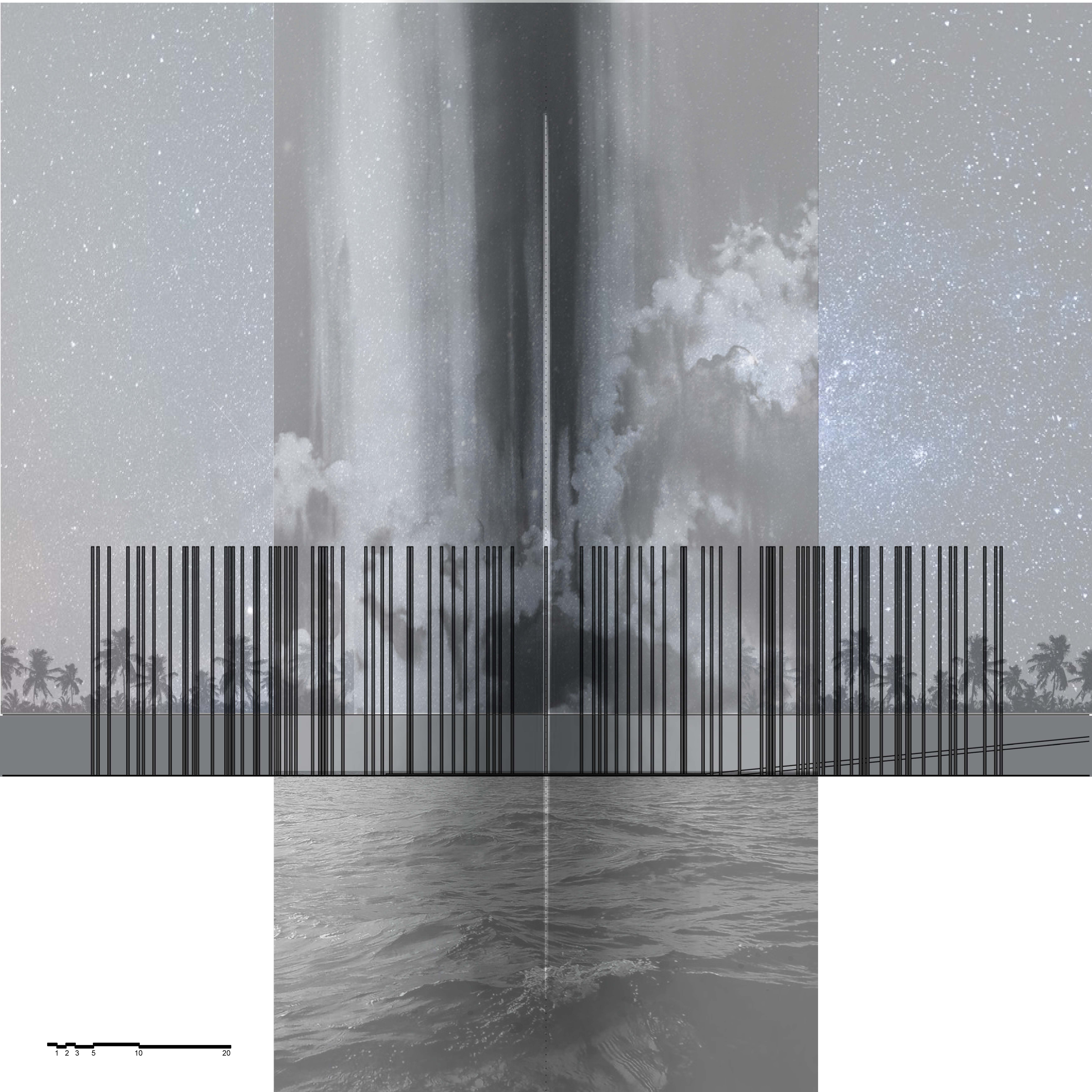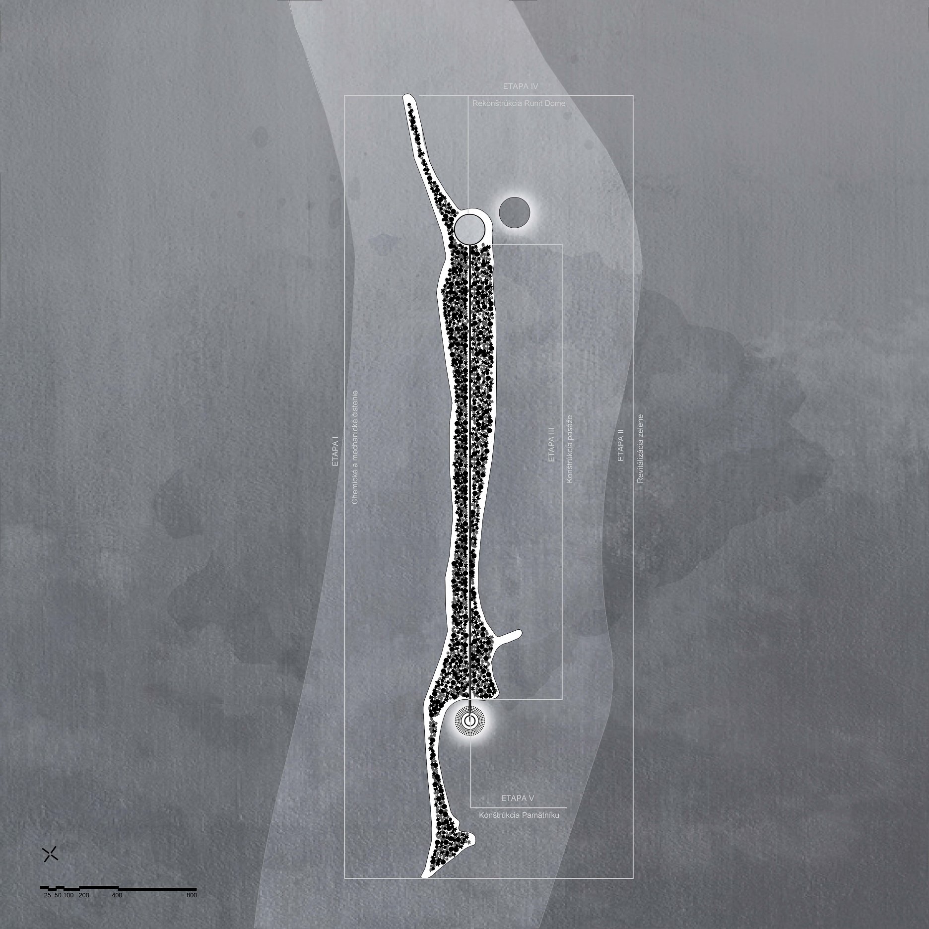 The aim of the diploma thesis is to create a conceptual architectural object located in a nuclear testing site that would symbolize the overall cycle of nuclear energy: from the aspiration to the massive destruction, it brought to human civilization, with the final aim to sensitize the visitor of the damage of the nuclear bomb by its own abstract form and volume and space and its communication with the nature around. The chosen site: Runit Island, Marshall Islands is a paradox within itself: a paradise made by nature, full of life and sun and surrounded by water, chosen to be destroyed with nuclear bombs, made inhabitable for humans by the human hand, invisibly deadly-visibly breathtaking. The Memorial should coexist within this paradox, by creating a balance for Runit Dome - the tomb in the island, and by hosting the „journey“ of catharsis of the island in its structure through different dichotomies made of scale, shape, shadow and light, materiality and nature. The Memorial, due to the still-present contamination and specific weather conditions of the island, can be visited only shortly during certain period of the year in small numbers of visitors. Therefore, the atmosphere of the Memorial should serve as the language of the sensitization itself. If the Runit Dome is a reminder of the past, a marked spot, an abstract tomb in this paradise island, the Memorial is designed to be the Anti-Tomb, the Upside-Down Tomb, the missing balance, the Tholos and Anti-Tholos, the entrance to the island which leads to the tomb and back to the Memorial. The overall journey mimics the religious forms of pilgrimage, a journey far away from civilization, which aims to explore existential questions of the human nature, the human role, ambition, modesty, ethics, aesthetics, time, temporality, hope, rebirth, life and death.
