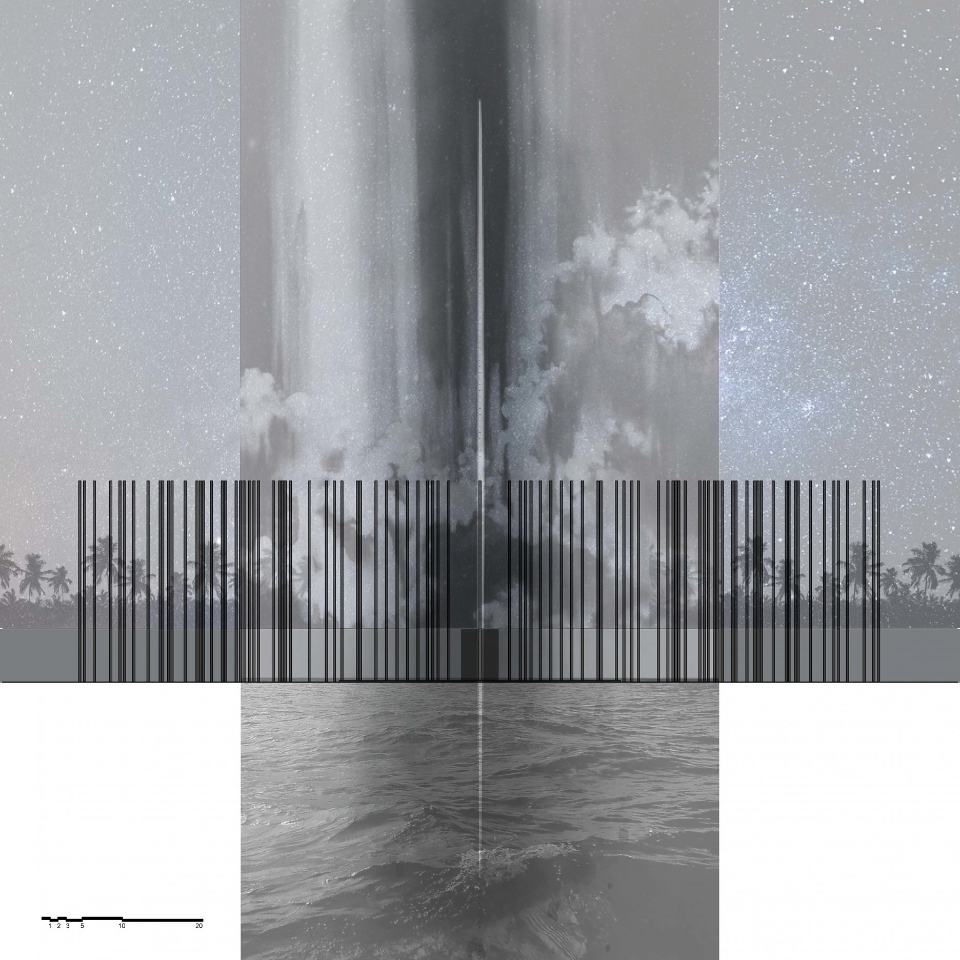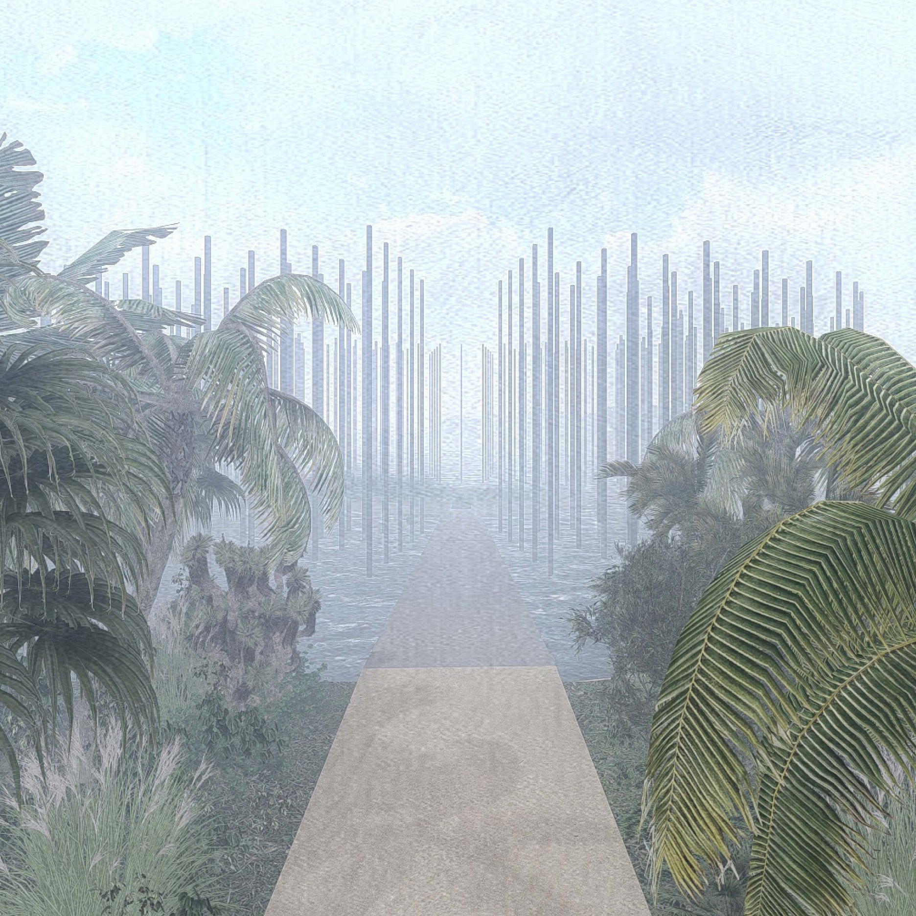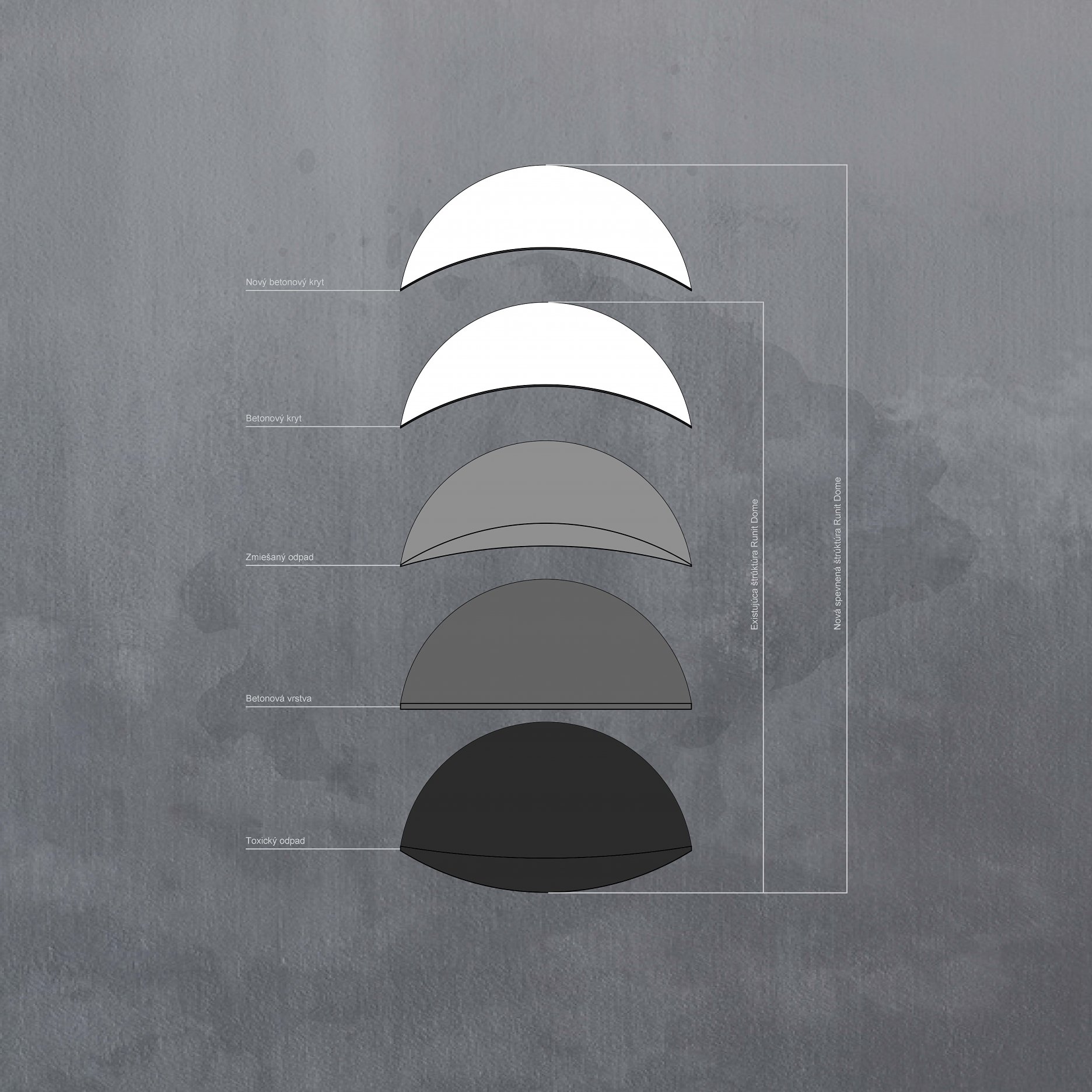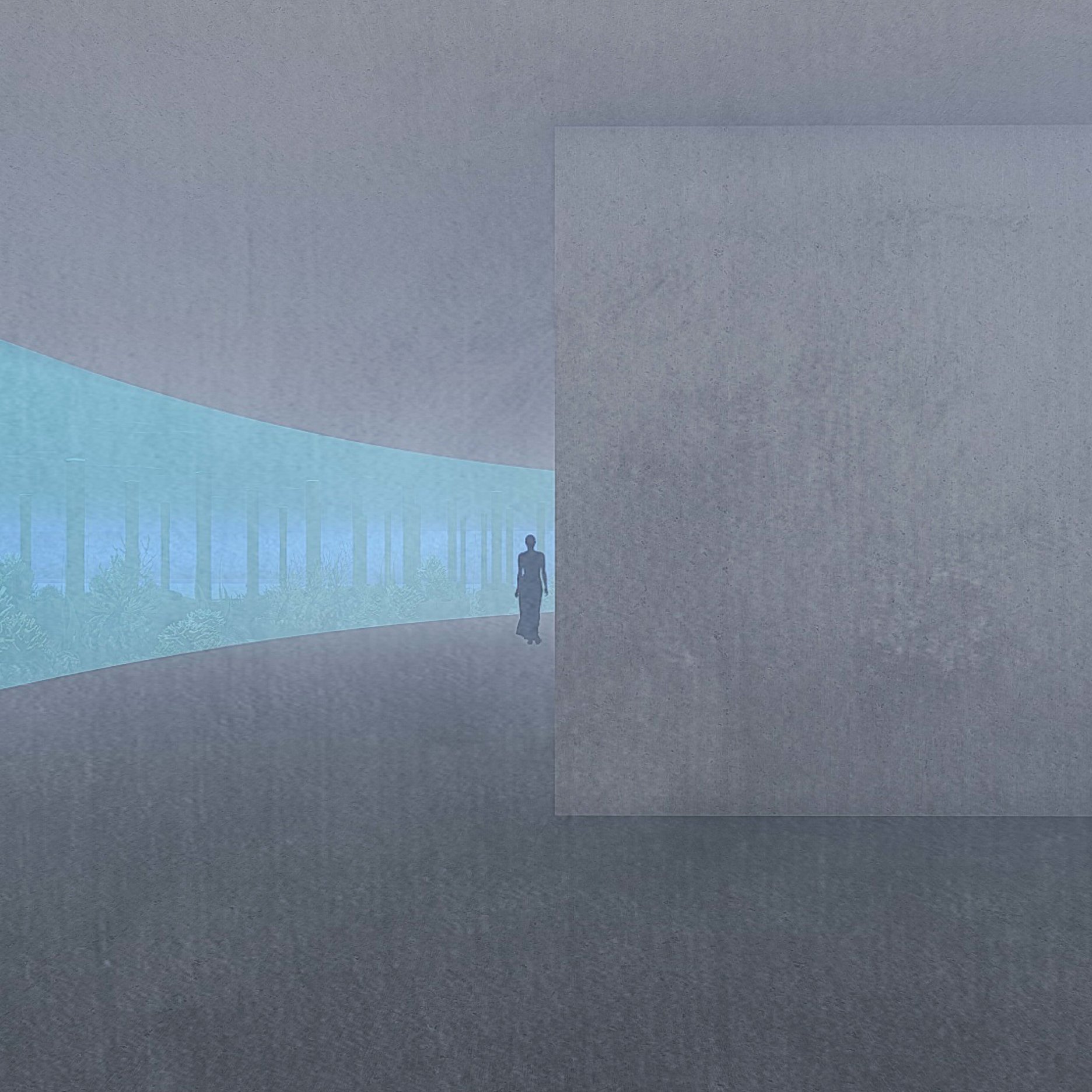 The aim of the diploma thesis is to create a conceptual architectural object located in a nuclear testing site that would symbolize the overall cycle of nuclear energy: from the aspiration to the massive destruction, it brought to human civilization, with the final aim to sensitize the visitor of the damage of the nuclear bomb by its own abstract form and volume and space and its communication with the nature around. The chosen site: Runit Island, Marshall Islands is a paradox within itself: a paradise made by nature, full of life and sun and surrounded by water, chosen to be destroyed with nuclear bombs, made inhabitable for humans by the human hand, invisibly deadly-visibly breathtaking. The Memorial should coexist within this paradox, by creating a balance for Runit Dome - the tomb in the island, and by hosting the „journey“ of catharsis of the island in its structure through different dichotomies made of scale, shape, shadow and light, materiality and nature. The Memorial, due to the still-present contamination and specific weather conditions of the island, can be visited only shortly during certain period of the year in small numbers of visitors. Therefore, the atmosphere of the Memorial should serve as the language of the sensitization itself. If the Runit Dome is a reminder of the past, a marked spot, an abstract tomb in this paradise island, the Memorial is designed to be the Anti-Tomb, the Upside-Down Tomb, the missing balance, the Tholos and Anti-Tholos, the entrance to the island which leads to the tomb and back to the Memorial. The overall journey mimics the religious forms of pilgrimage, a journey far away from civilization, which aims to explore existential questions of the human nature, the human role, ambition, modesty, ethics, aesthetics, time, temporality, hope, rebirth, life and death.