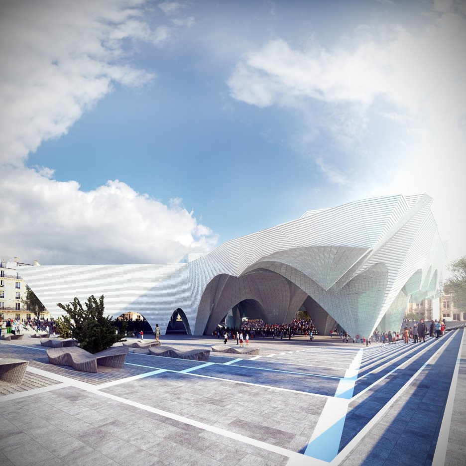 The structure engages with the public via its sculptural grace. The public is provided with glimpses of the interior programmatic in order to engender curiosity. If one enters the interior they are provided with views of the ever changing plaza below, natural sunlight from above, and performances that occur inside. The public is free to create their own performances, when and wherever they please.