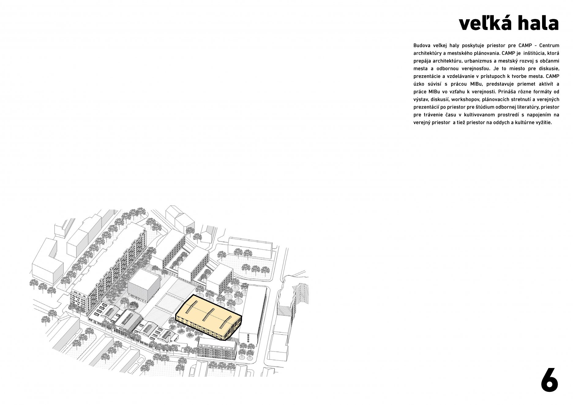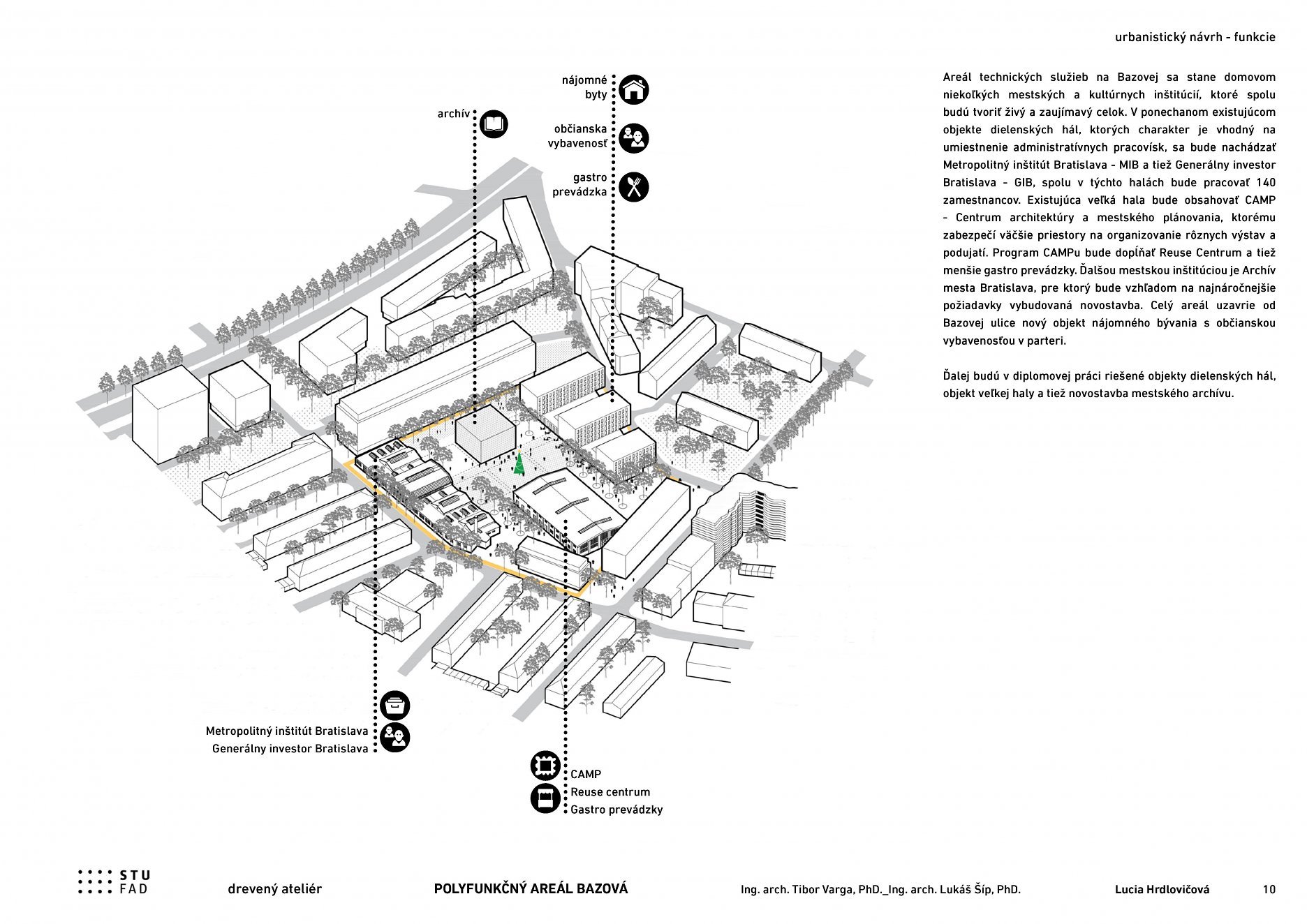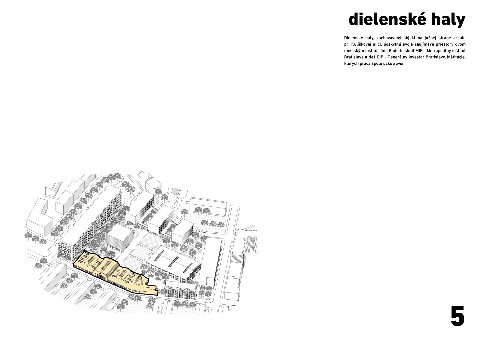 "Chátrajúce územie má vďaka vďaka výbornej polohe v rámci hlavného mesta potenciál stať sa novým kultúrnym centrom, kde dôjde k stretu mnohých zaujímavých mestských inštitúcií - nachádzať sa tu bude MIB – Metropolitný inštitút Bratislava, CAMP - Centrum architektúry a mestského plánovania, nový Archív mesta Bratislava a GIB - Generálny investor Bratislavy. Mestské inštitúcie doplnenia ďalšie funkcie: mestské nájomné bývanie, občianska vybavenosť, gastro prevádzky či Reuse centrum... Spomínané funkcie majú v tejto polohe potenciál vytvoriť živú, fungujúcu a atraktívnu lokalitu. V areáli budú revitalizované existujúce objekty hál a taktiež budú doplnené novostavby mestského archívu a nájomných bytov," vysvetľuje v abstrakte svoj pohľad na ideálnu budúcnosť areálu Lucia Hrdlovičová.
