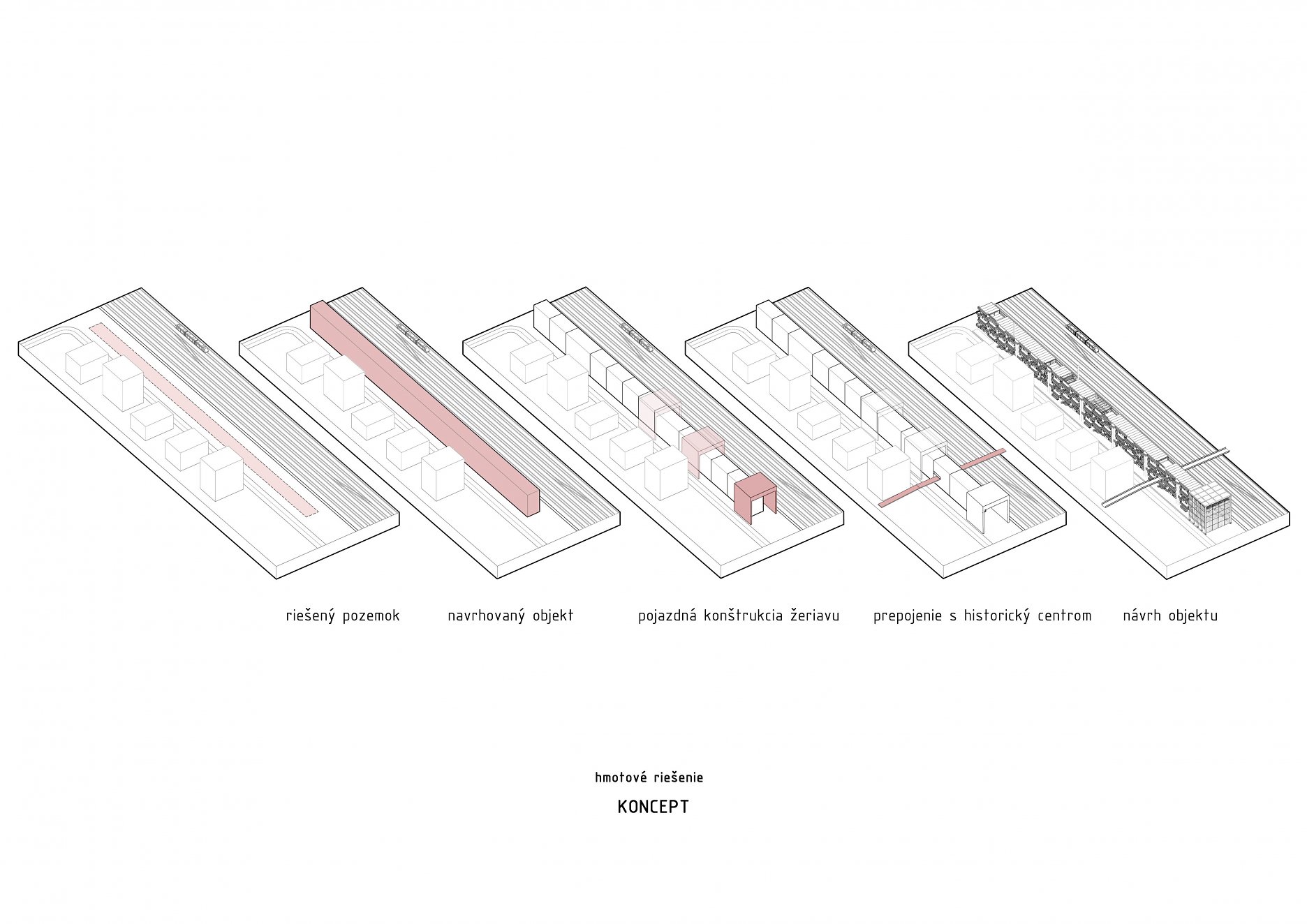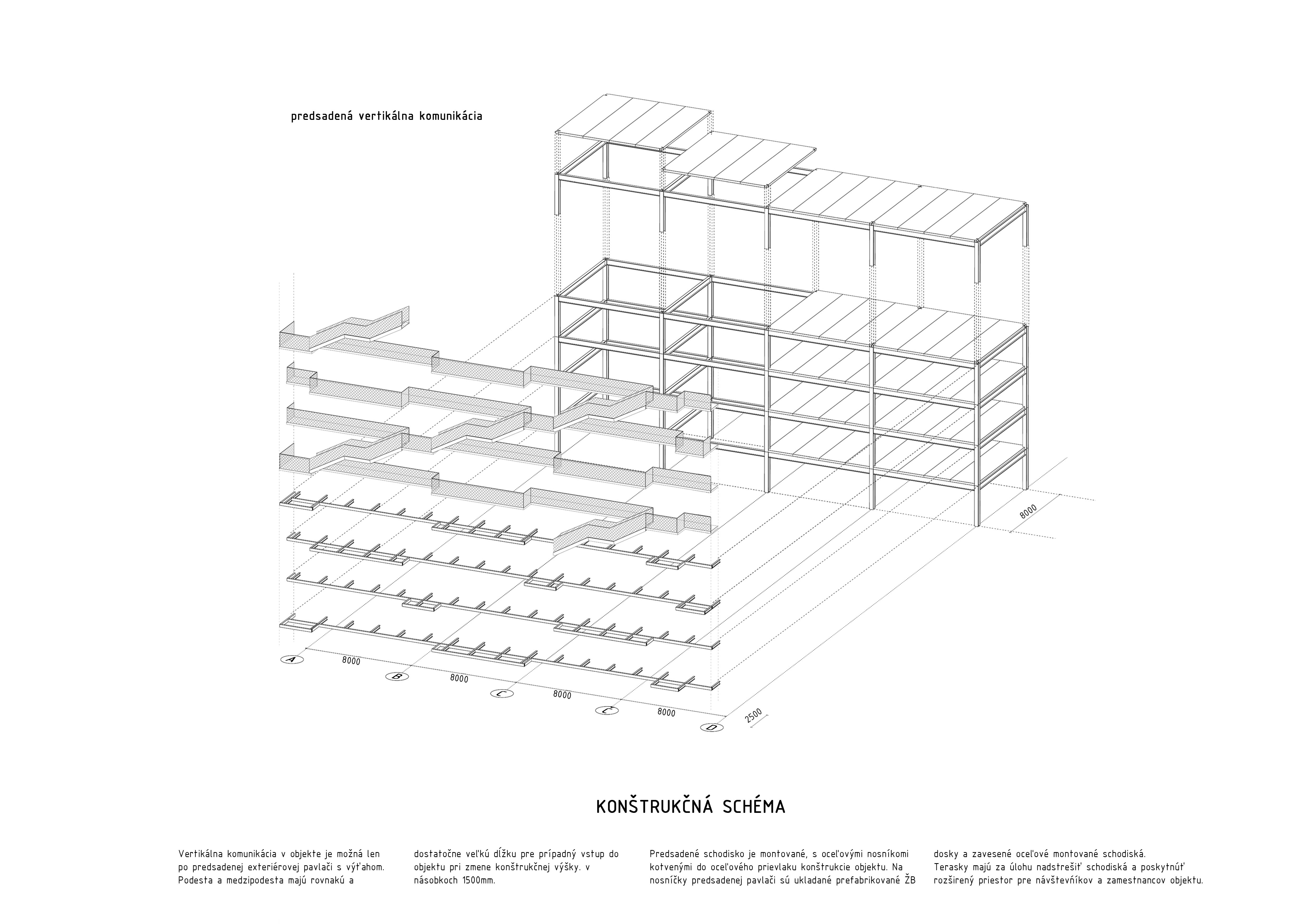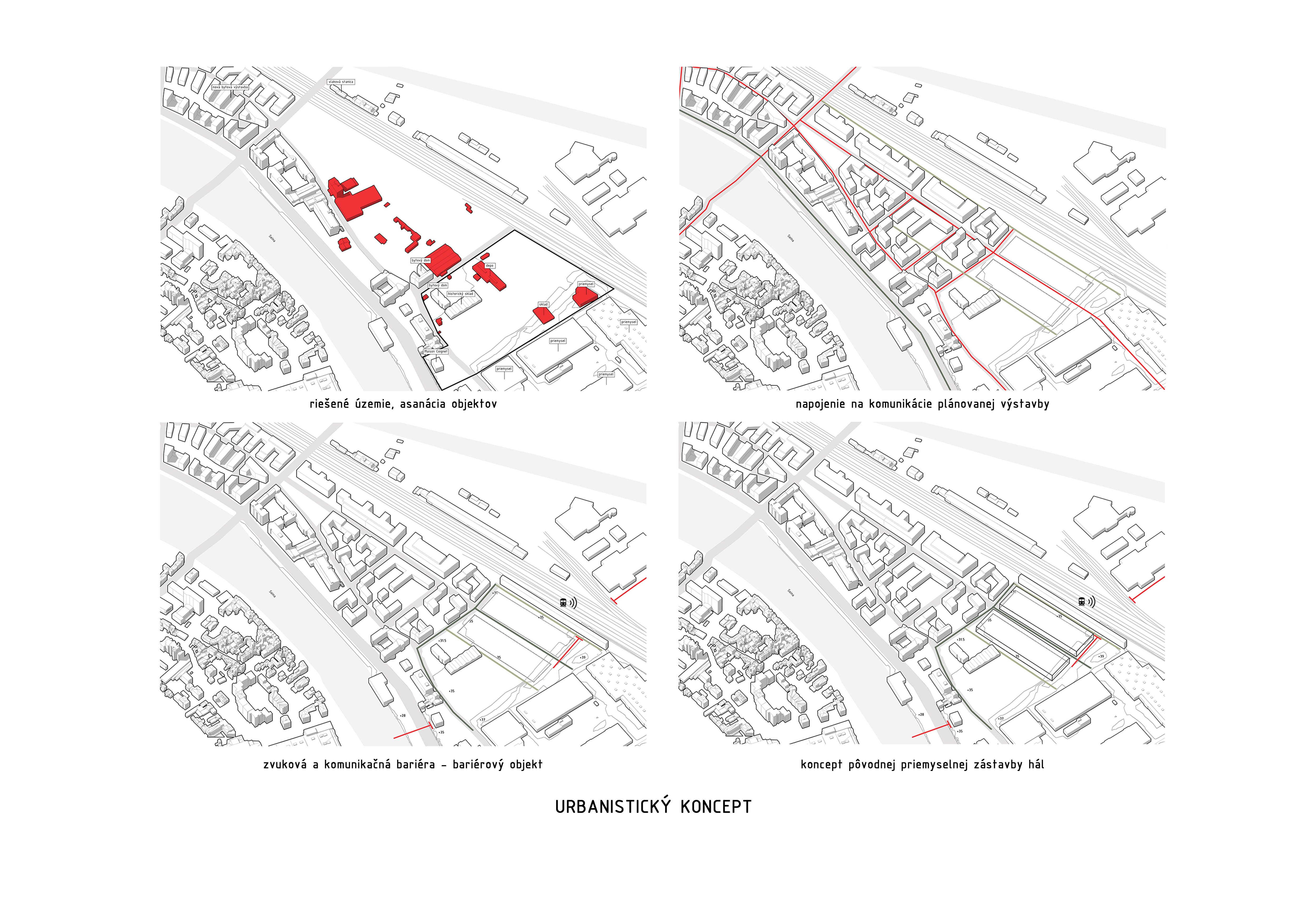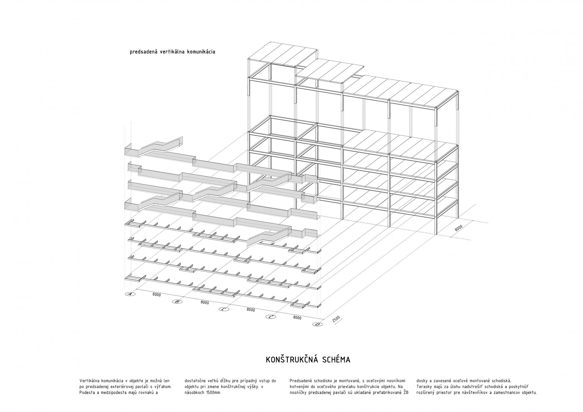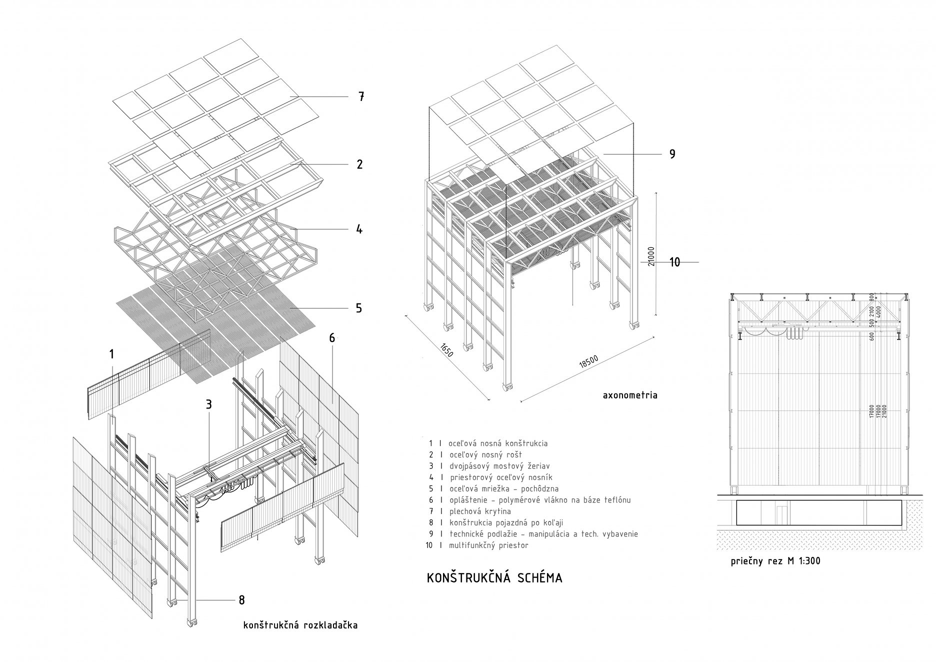 Postindustriálna zóna ovplyvnila konštrukciu navrhovaného objektu a pretavila sa do návrhu v podobe prefabrikácie.