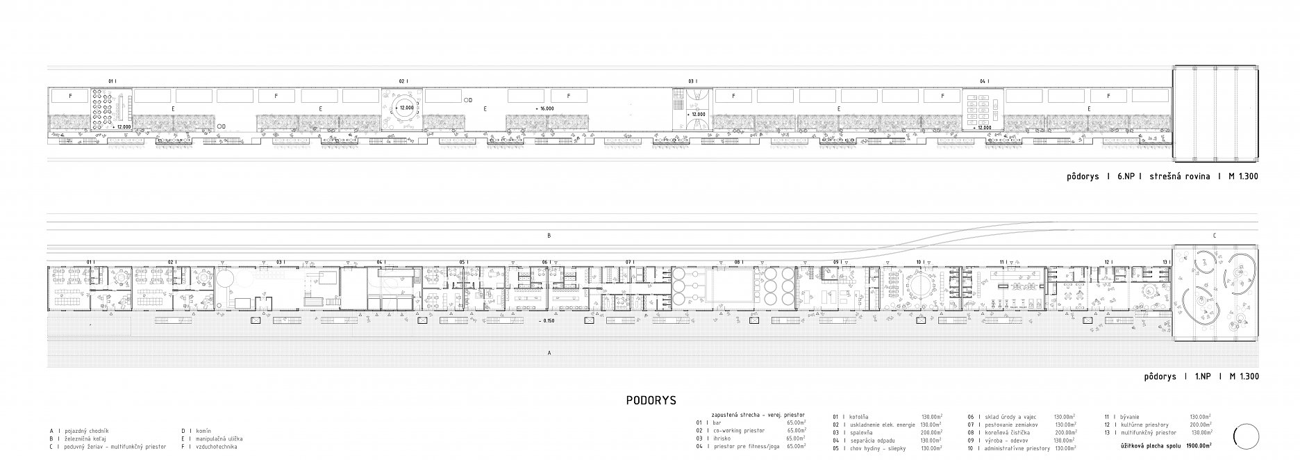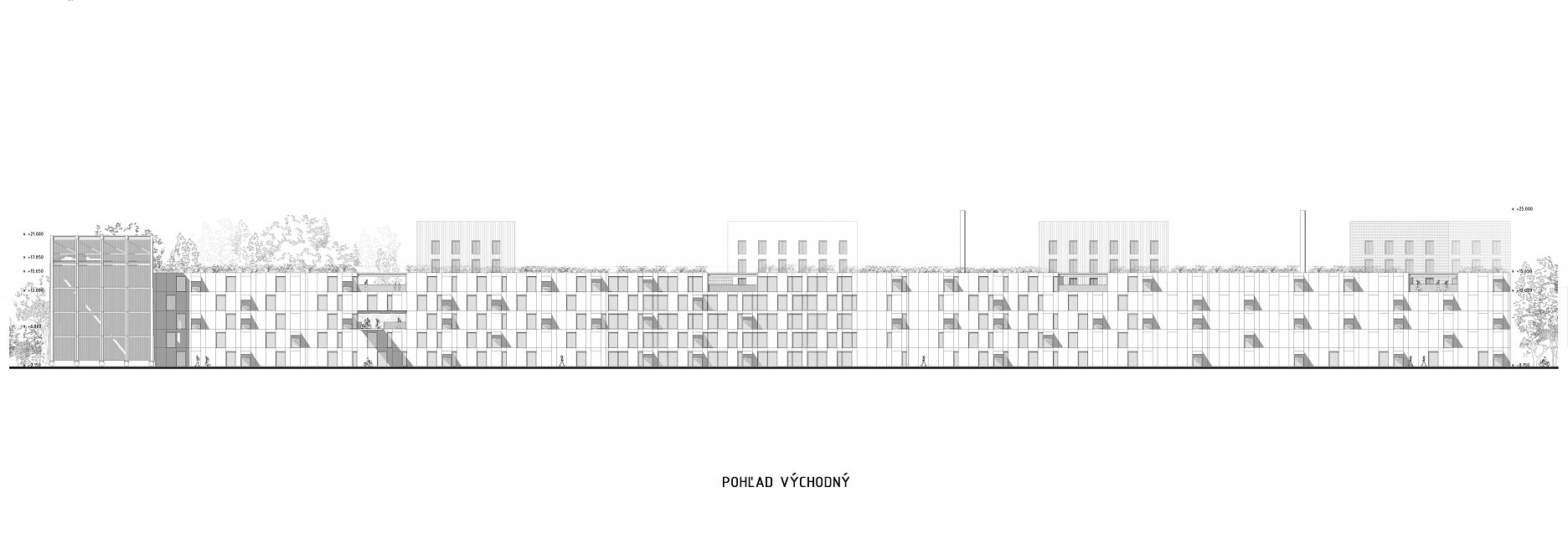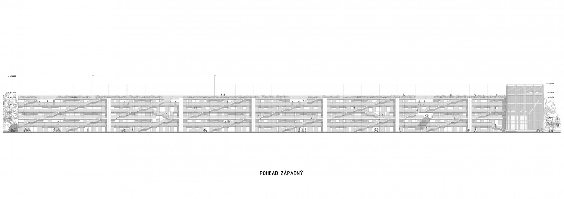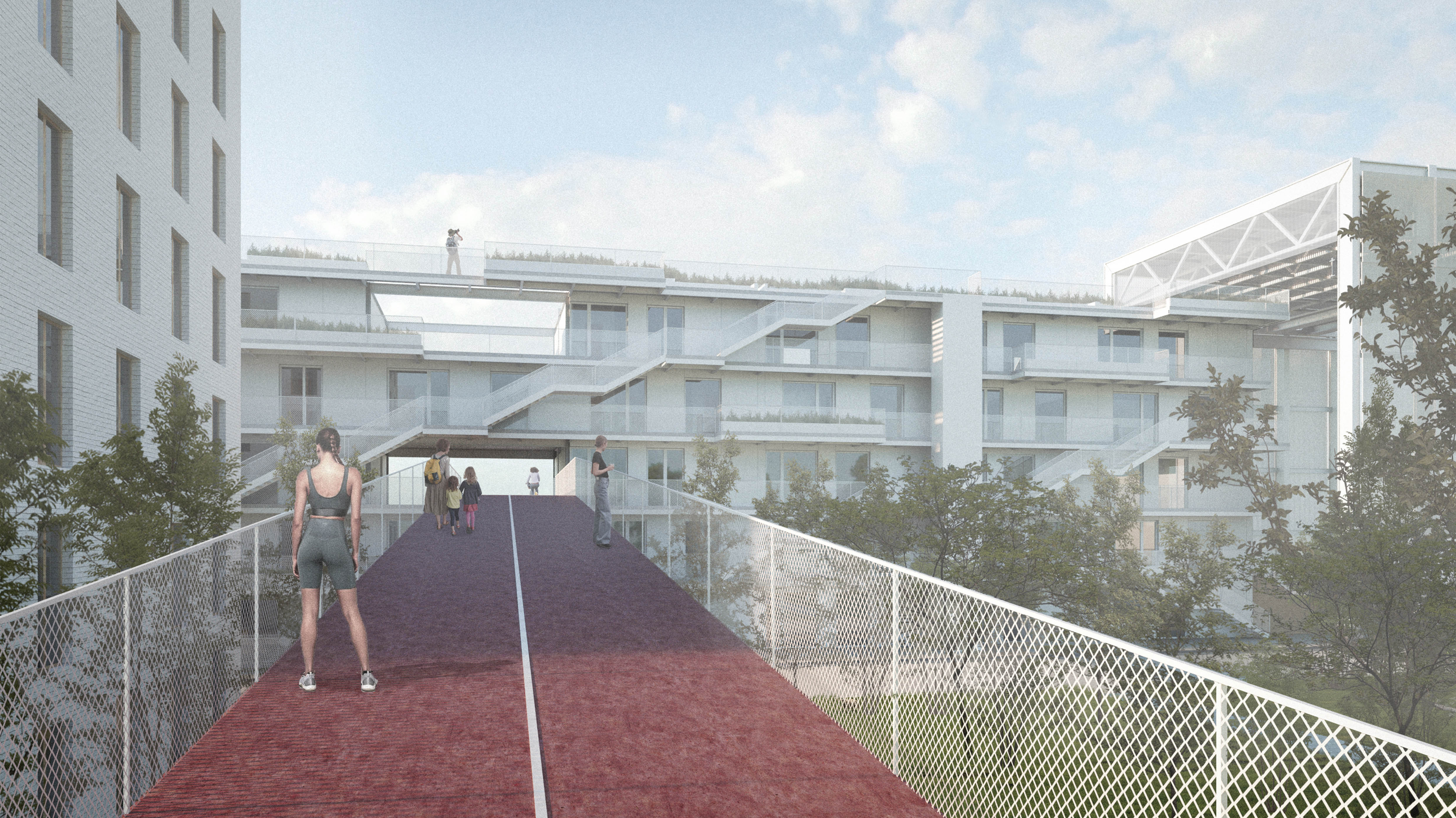 Objekt sa nachádza na rozhraní riešeného územia a železničnej trati a zohráva úlohu bariérového domu, ktorý má zabezpečiť vhodné akustické podmienky navrhovanej rezidenčnej oblasti. Typologicky objekt predstavuje dlhý dom, ktorý bol špecifickou ideovou figúrou v 20. storočí a za inšpiráciou som nemusela ísť ďaleko. Ako napríklad v Paríži Montparnasse alebo Ríme Corviale alebo rezidenčný komplex Les Courtilliéres priamo v Saint Denis. Všetky spomenuté objekty naprieč históriou tohto typologického druhu boli navrhované ako prevažne monofunkčné stavby. V práci navrhujem nový typologický druh, tzv. typologický hybrid. Zamýšľam sa ale aj nad úvahami utopistického ideálu dlhej a polyfunkčnej hybridnej formy. V práci som zistila, že sa vraciam k ideálu Corviale, ale v zmysle udržateľnosti a novým potrebám spoločnosti, ktorá smeruje k efektívnejšiemu a ekologickejšiemu fungovaniu obytnej zóny.
