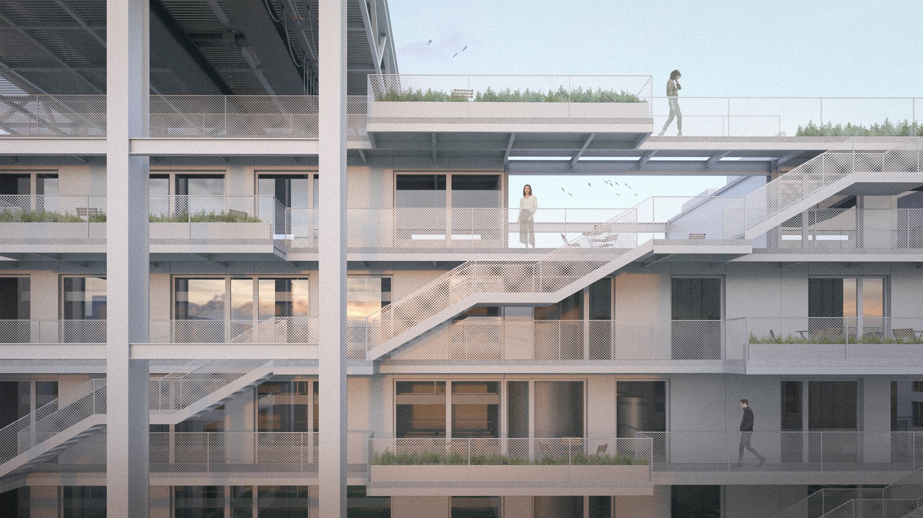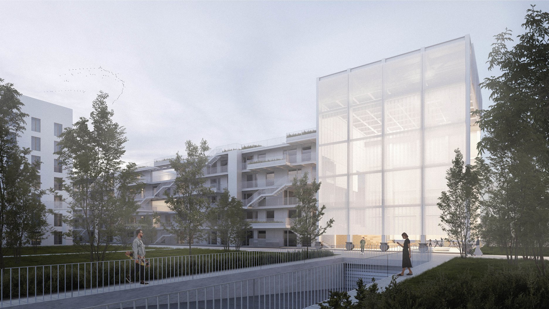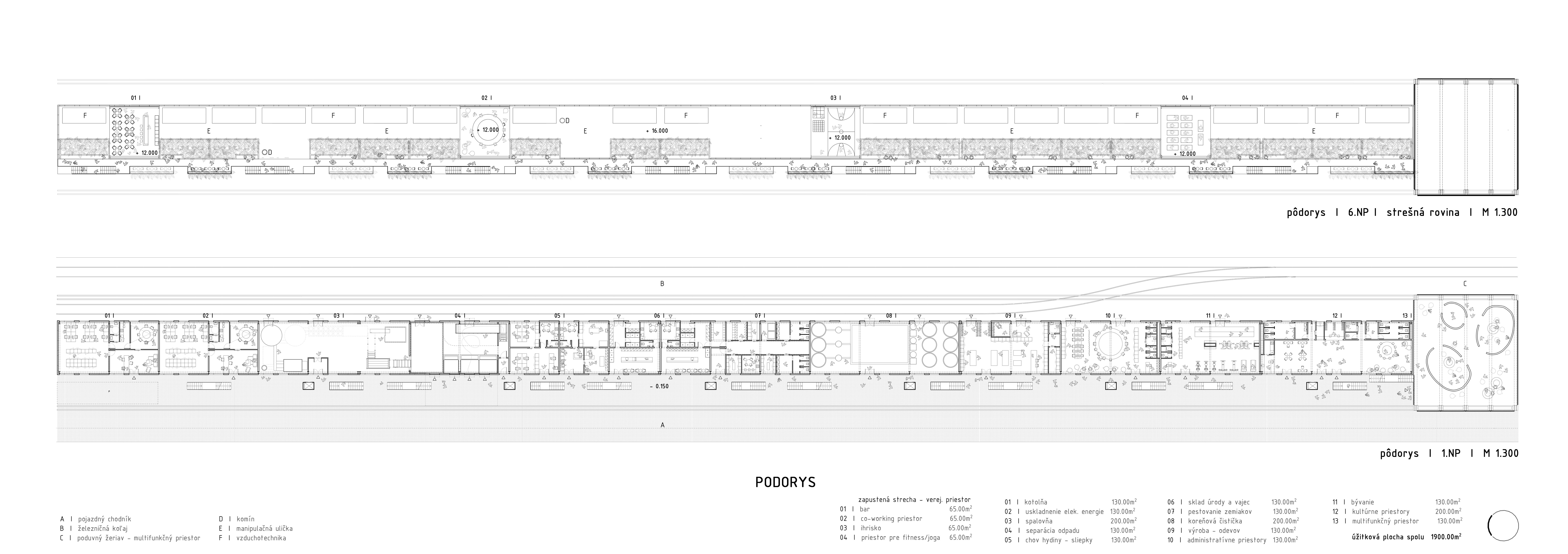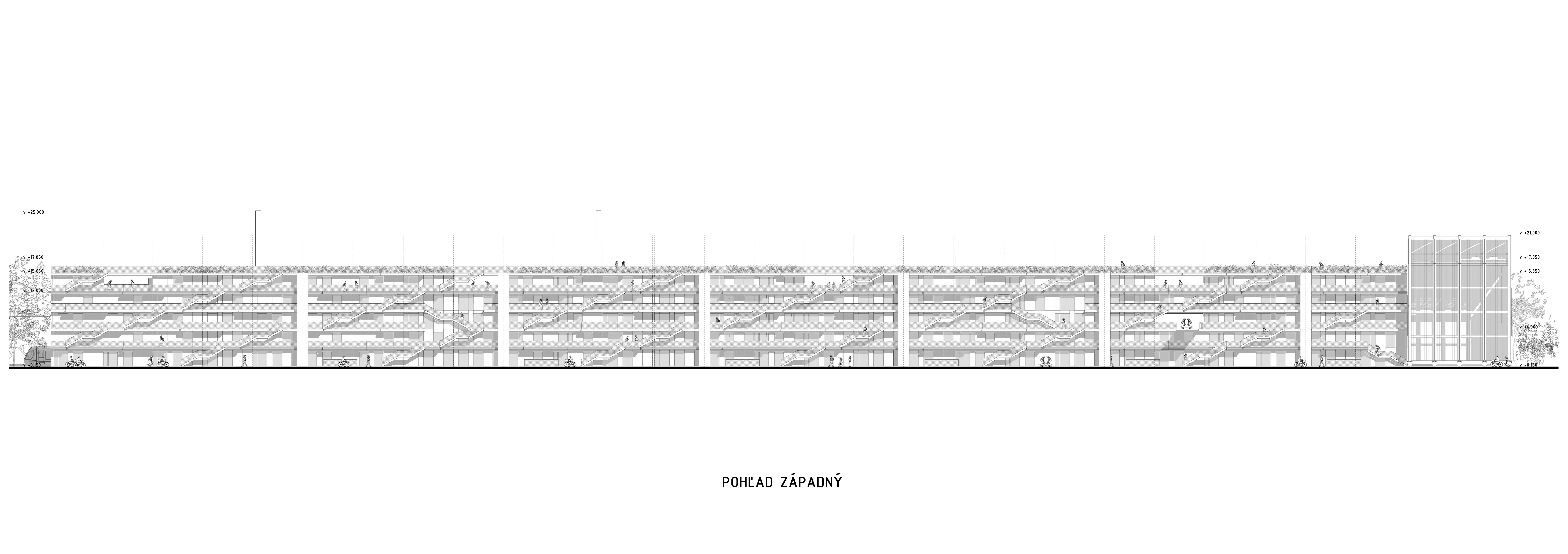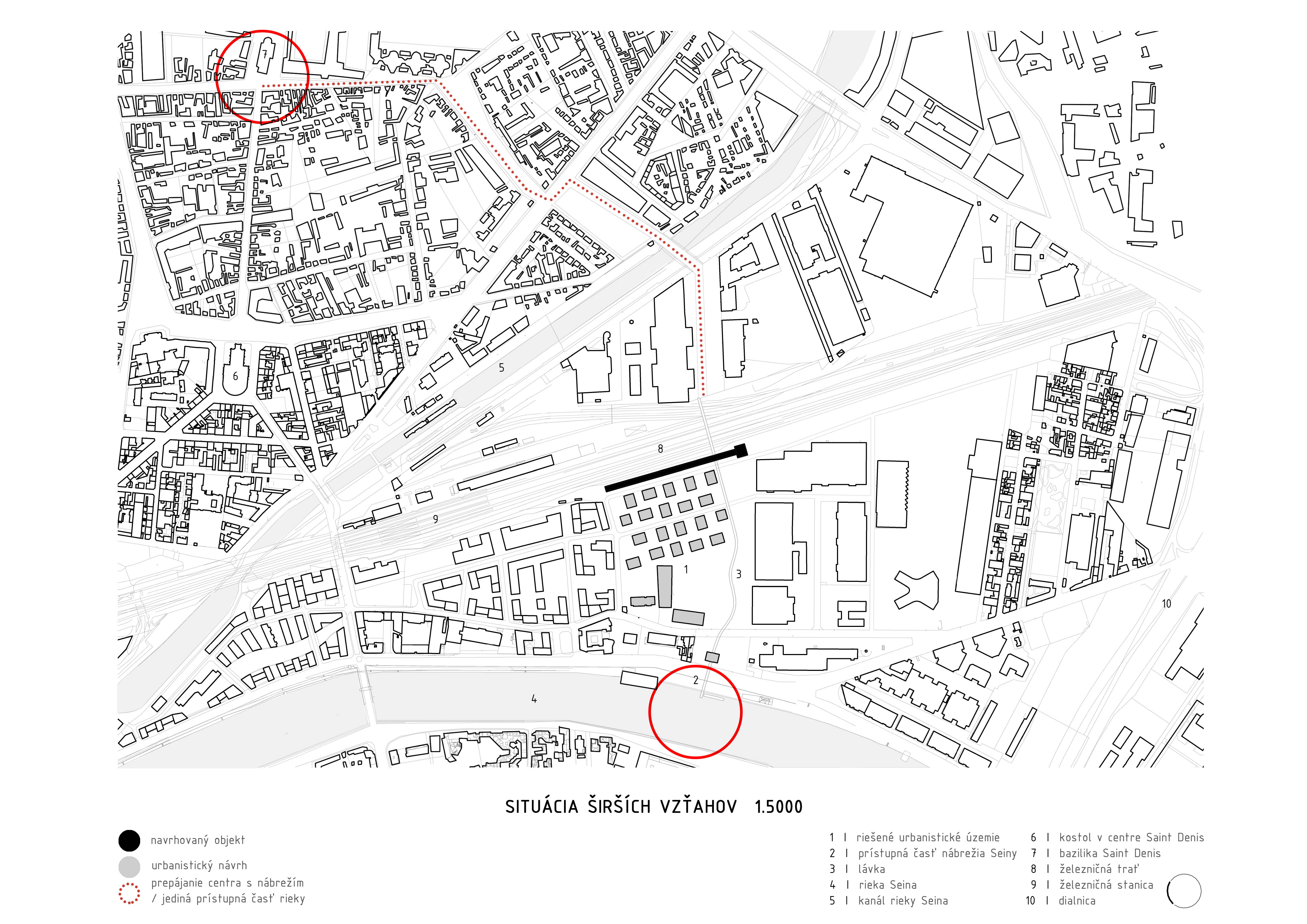 Objekt sa nachádza na rozhraní riešeného územia a železničnej trati a zohráva úlohu bariérového domu, ktorý má zabezpečiť vhodné akustické podmienky navrhovanej rezidenčnej oblasti. Typologicky objekt predstavuje dlhý dom, ktorý bol špecifickou ideovou figúrou v 20. storočí a za inšpiráciou som nemusela ísť ďaleko. Ako napríklad v Paríži Montparnasse alebo Ríme Corviale alebo rezidenčný komplex Les Courtilliéres priamo v Saint Denis. Všetky spomenuté objekty naprieč históriou tohto typologického druhu boli navrhované ako prevažne monofunkčné stavby. V práci navrhujem nový typologický druh, tzv. typologický hybrid. Zamýšľam sa ale aj nad úvahami utopistického ideálu dlhej a polyfunkčnej hybridnej formy. V práci som zistila, že sa vraciam k ideálu Corviale, ale v zmysle udržateľnosti a novým potrebám spoločnosti, ktorá smeruje k efektívnejšiemu a ekologickejšiemu fungovaniu obytnej zóny.