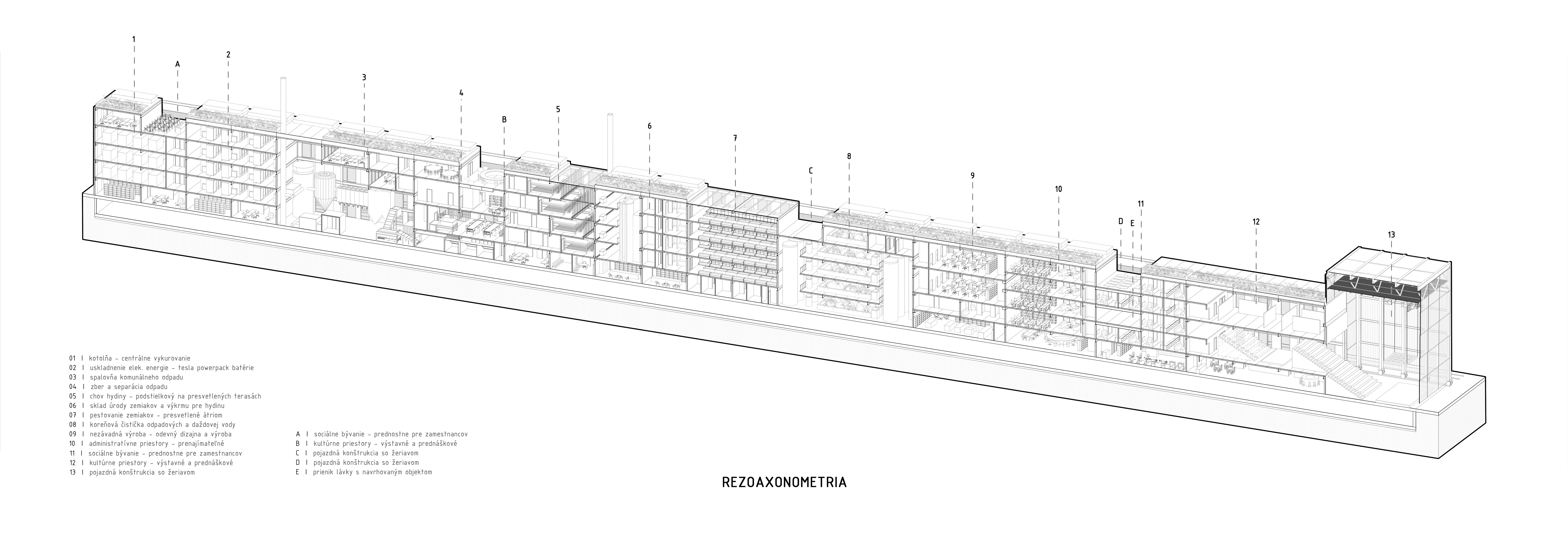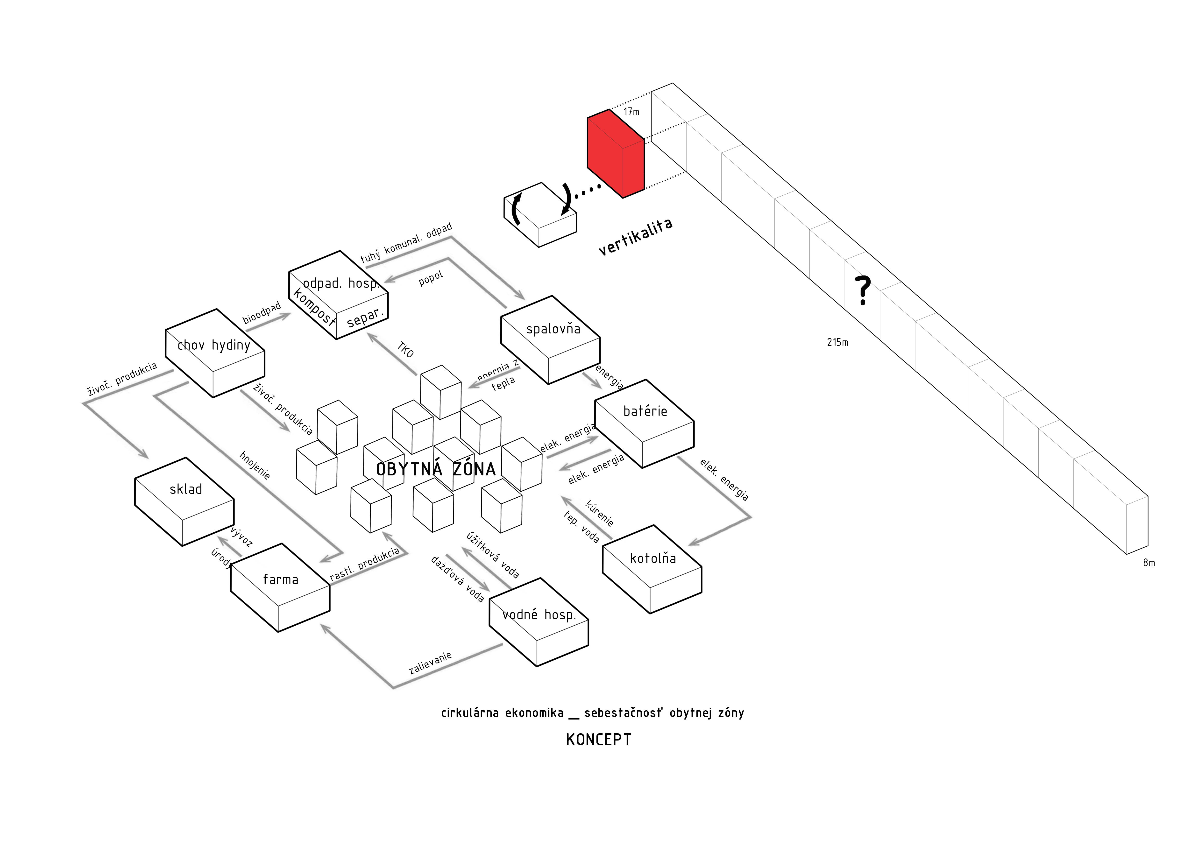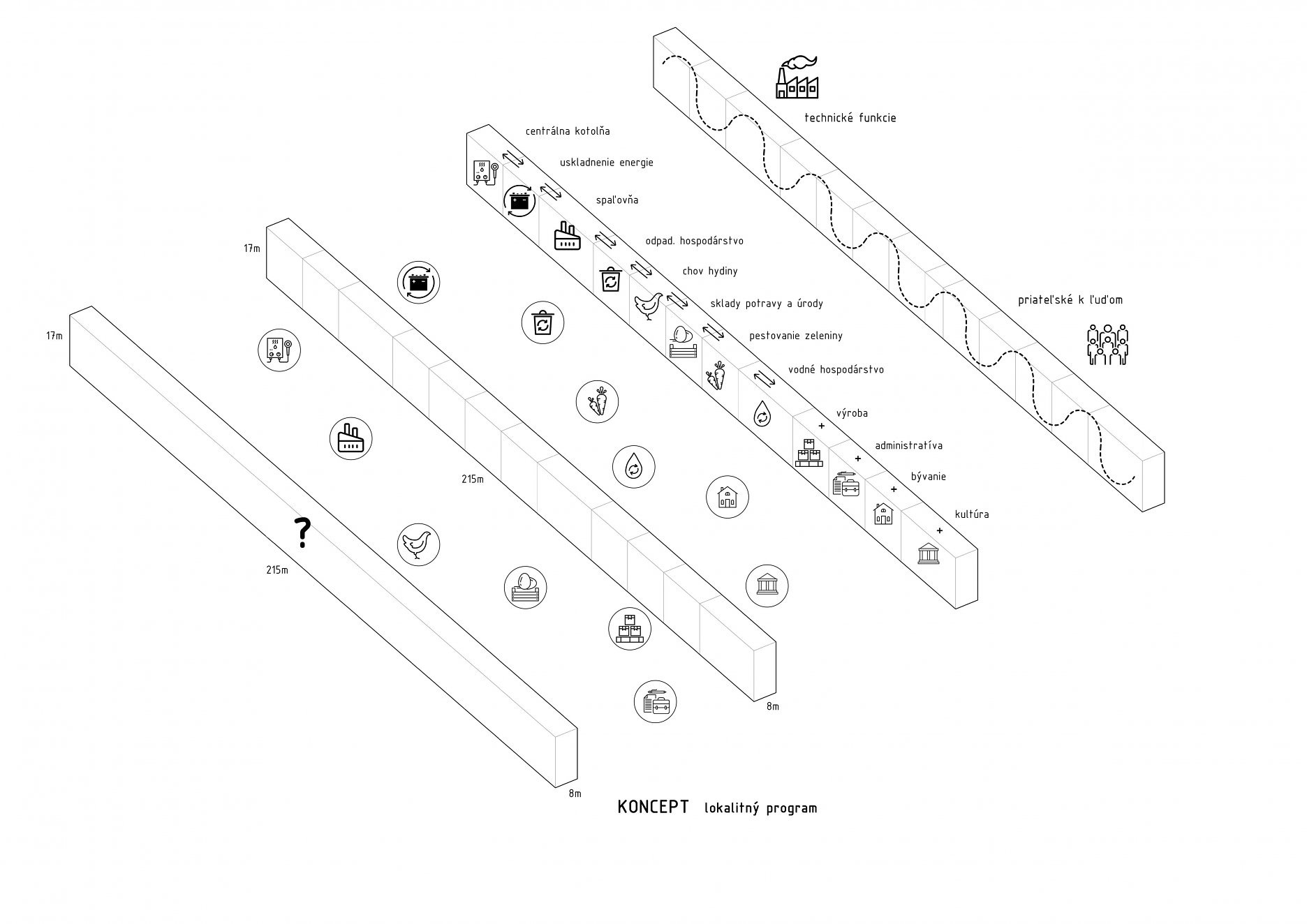 Úlohou bolo experimentovanie s funkciami, ktoré bežne figurujú skôr v extraviláne mestských štruktúr. Program polyfunkčného objektu pozostáva z funkcií ako pestovanie zemiakov, chov hydiny, odpadové či vodné hospodárstvo, nezávadná výroba, čistička odpadových vôd či spaľovňa odpadu. No nachádzajú sa tu aj typické mestotvorné funkcie ako sú služby, bývanie, administratívne priestory, či kultúra. Jednotlivé prevádzky boli dimenzované na kapacitu navrhovanej zóny pre 300 bytov s cca 1000 obyvateľmi a cieľom bolo zabezpečiť energetickú nezávislosť obytnej zóny v čo najvyššej miere. Výzvou bolo hľadanie architektonického výrazu, ktorý by plnil potreby jednotlivých hospodárskych a technických prevádzok a zároveň by objekt vedel zapadnúť do atmosféry obytnej štruktúry. Radenie a rozličnosť funkcii je viditeľný aj na samotnom dizajne fasády, vzhľadom na rôzne potreby presvetlenia. Na prvý pohľad nevýhodná poloha železnice je využívaná v prospech objektu - na dovoz a vývoz.
