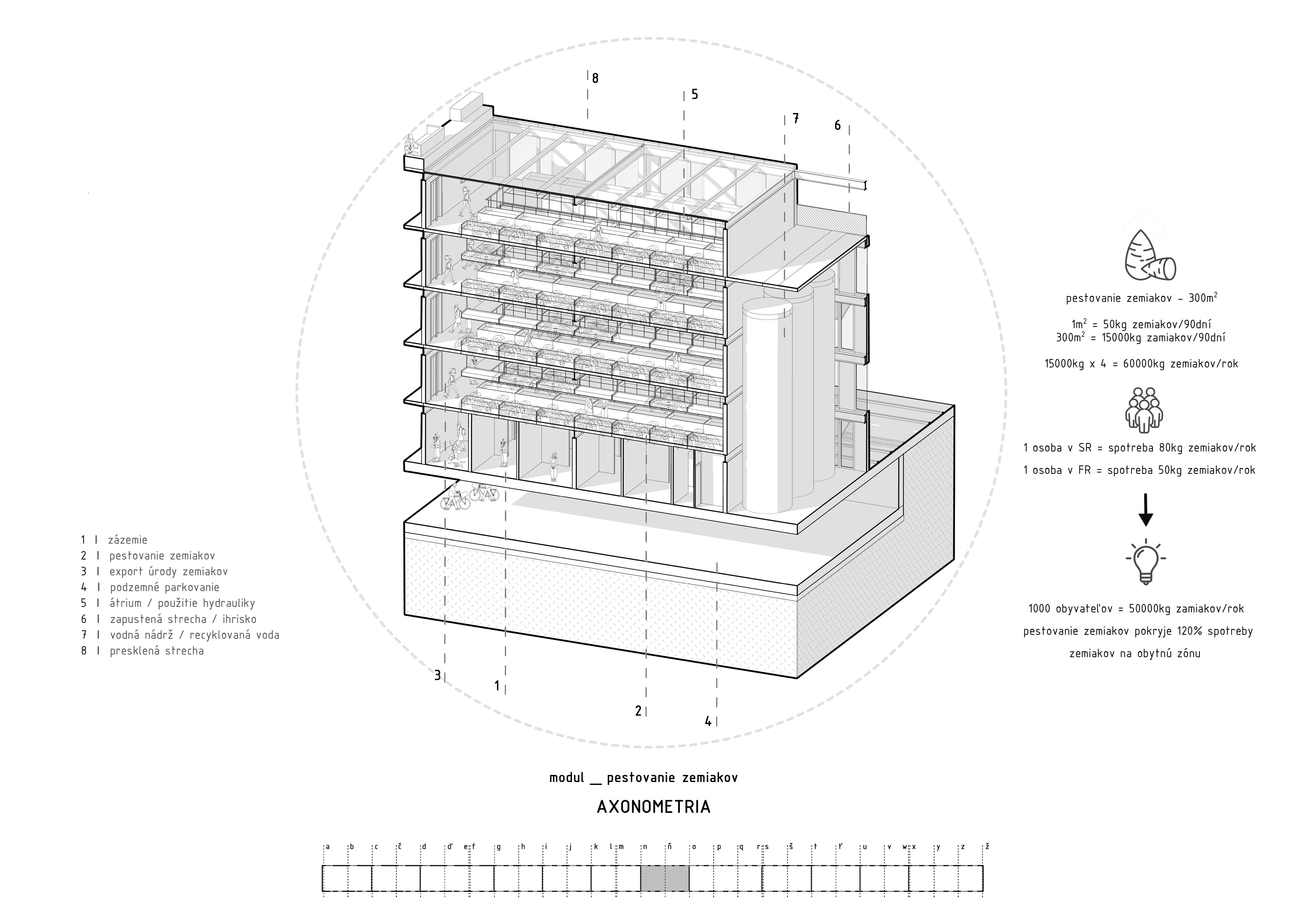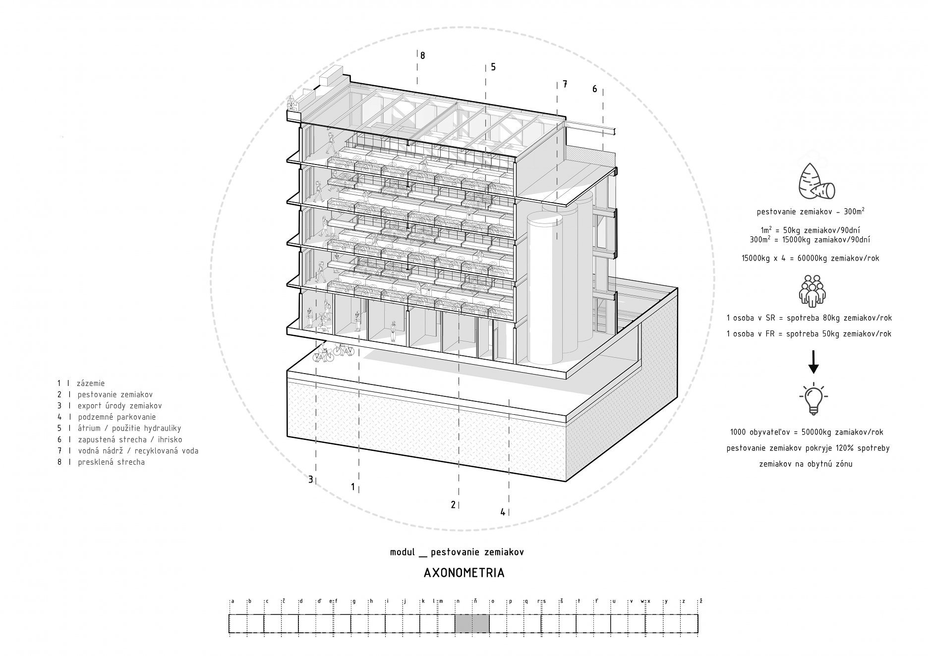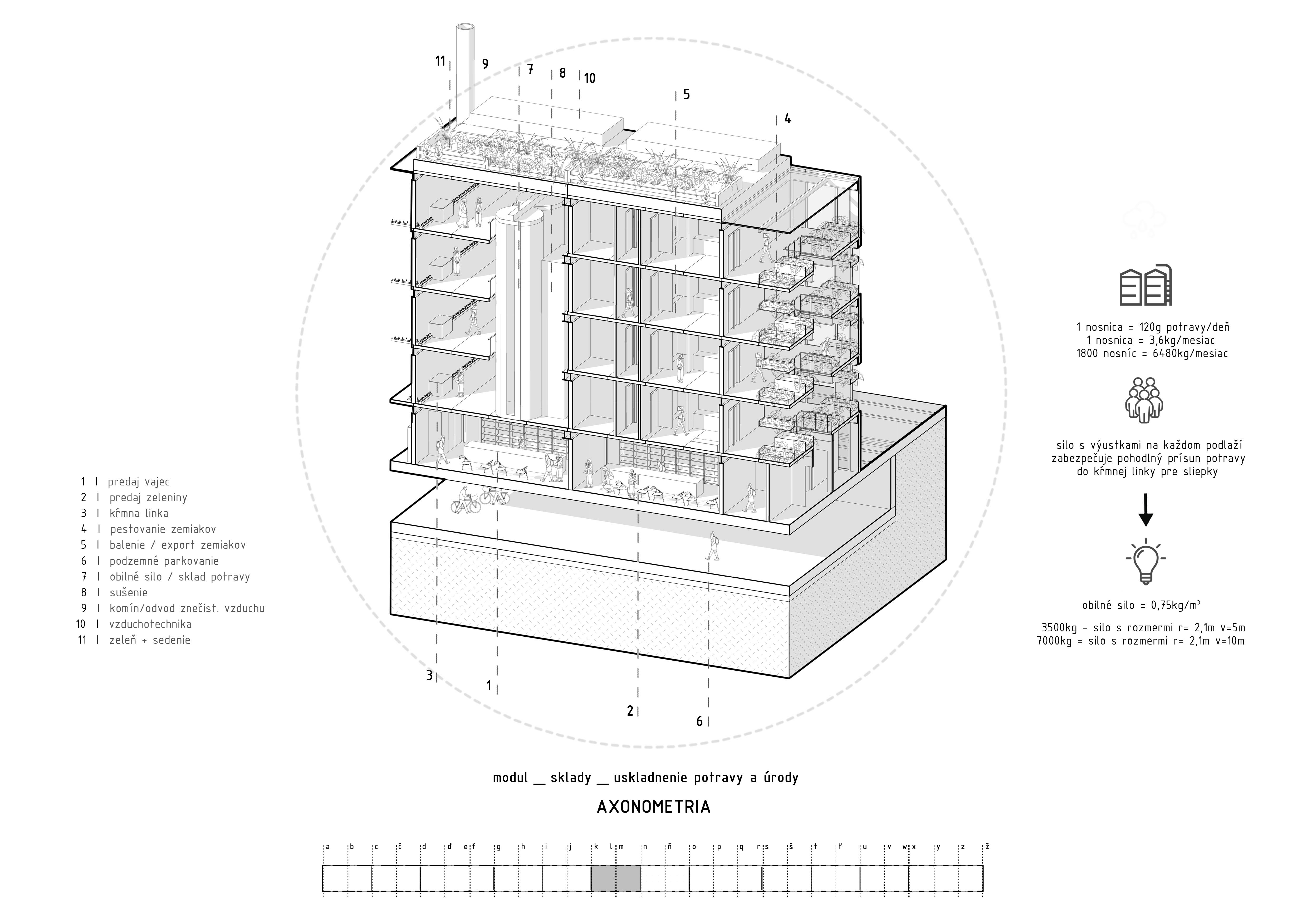 Úlohou bolo experimentovanie s funkciami, ktoré bežne figurujú skôr v extraviláne mestských štruktúr. Program polyfunkčného objektu pozostáva z funkcií ako pestovanie zemiakov, chov hydiny, odpadové či vodné hospodárstvo, nezávadná výroba, čistička odpadových vôd či spaľovňa odpadu. No nachádzajú sa tu aj typické mestotvorné funkcie ako sú služby, bývanie, administratívne priestory, či kultúra. Jednotlivé prevádzky boli dimenzované na kapacitu navrhovanej zóny pre 300 bytov s cca 1000 obyvateľmi a cieľom bolo zabezpečiť energetickú nezávislosť obytnej zóny v čo najvyššej miere. Výzvou bolo hľadanie architektonického výrazu, ktorý by plnil potreby jednotlivých hospodárskych a technických prevádzok a zároveň by objekt vedel zapadnúť do atmosféry obytnej štruktúry. Radenie a rozličnosť funkcii je viditeľný aj na samotnom dizajne fasády, vzhľadom na rôzne potreby presvetlenia. Na prvý pohľad nevýhodná poloha železnice je využívaná v prospech objektu - na dovoz a vývoz.