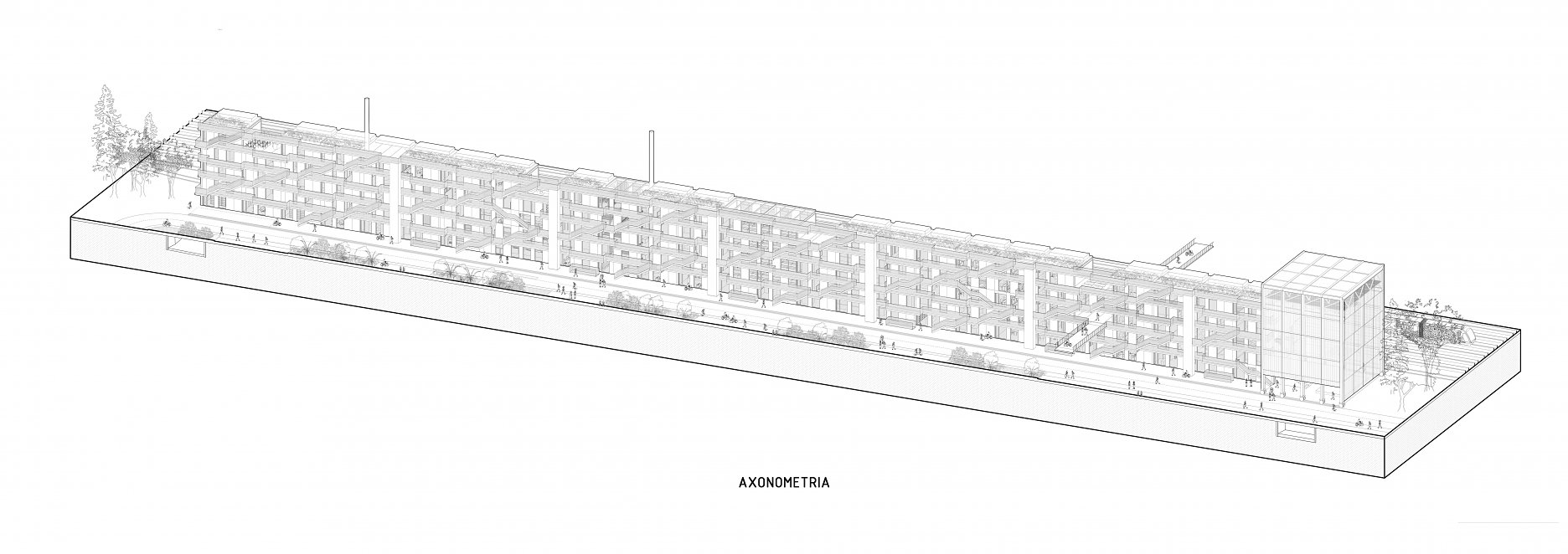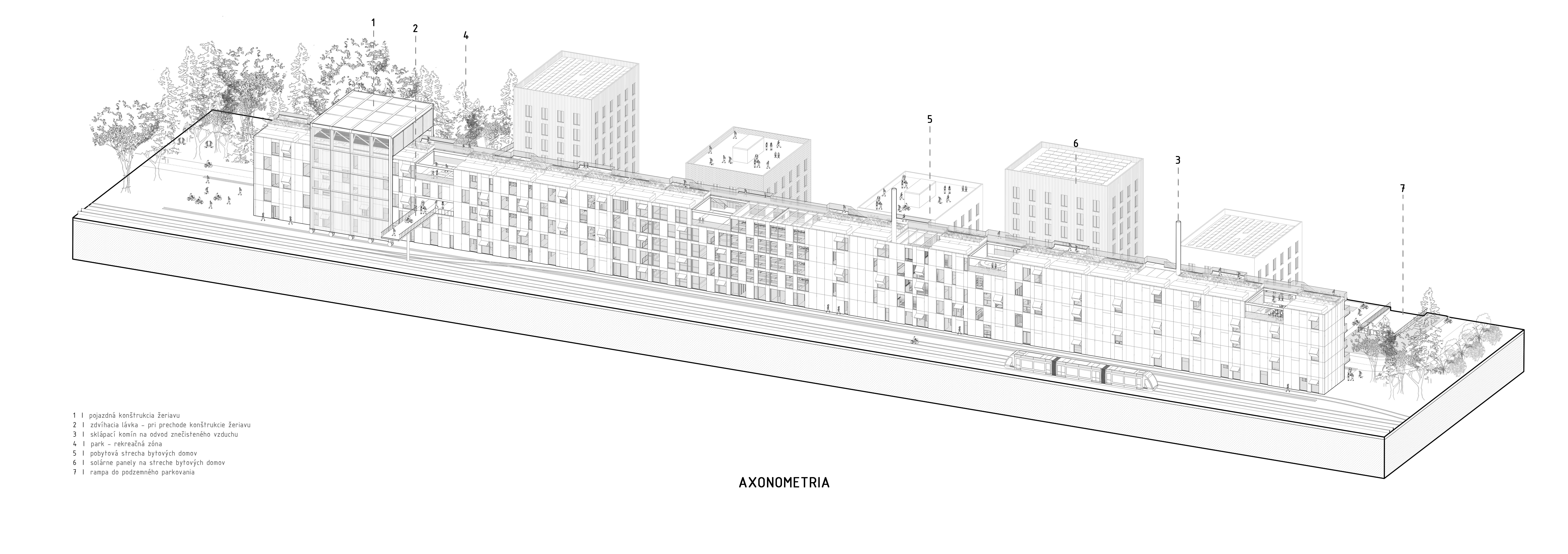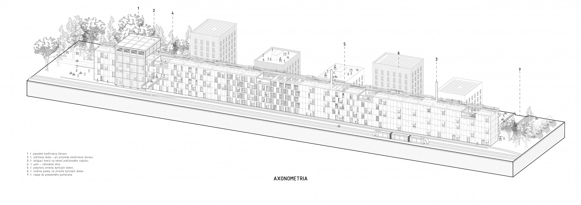 Urbanisticky ide o okrajovú štruktúru súboru, ktorej funkcia je akustická aj rozhraničujúca. V architektonickej mierke ide vlastne o infraštruktúru-technické mesto. Na jednej strane poskytuje servis rezidenčnej zóne, na druhej strane je obsaditeľná samostatným programom. Od utópie ruských konštruktivistov a kolektívnych domov sa táto líniová štruktúra dostala až k súčasným možnostiam prefabrikácie a montáže oceľových konštrukcií. Žeriav ako ich súčasť ich môže stavať, udržovať aj prestavovať (nech je mechanický či robotický). V tomto zmysle je to štruktúra radikálne polyfunkčná a inovujúca: ná/strojovo, konštrukčne aj materiálovo.