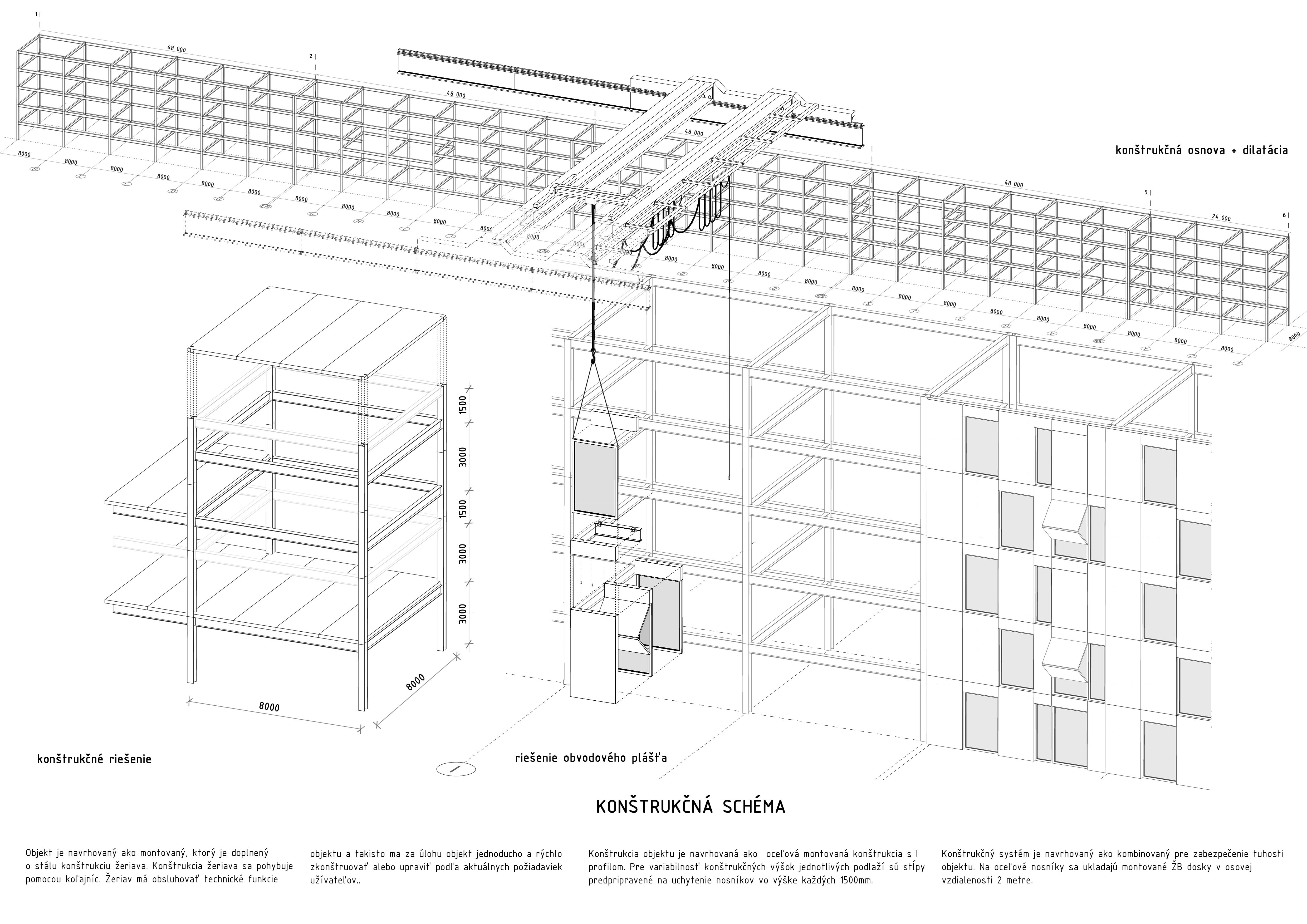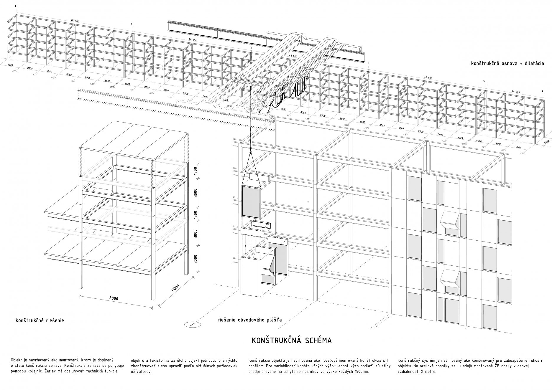 Diplomantka navrhla postupne všetky sekcie líniovej štruktúry, ale rovnako je dôležité, že každá sekcia by mohla byť aj prebudovaná, vymeniteľná či obsadená novými funkciami. „Objekt“ je zdanlivo stabilne rozvrhnutý, v skutočnosti je jeho montovateľnosť a skladobnosť zárukou možných nových členení a skladobnosti (ktoré by sa dali nakresliť do scenára). Poukazuje na to rozvrh, obsluha aj údržba štruktúry pojazdnou halou so žeriavom ale aj komunikácia po predsadenej pavlači s výťahmi a zavesenými schodiskami. Ide o inovatívne, originálne riešenie, ktoré je treba v plnej miere oceniť!