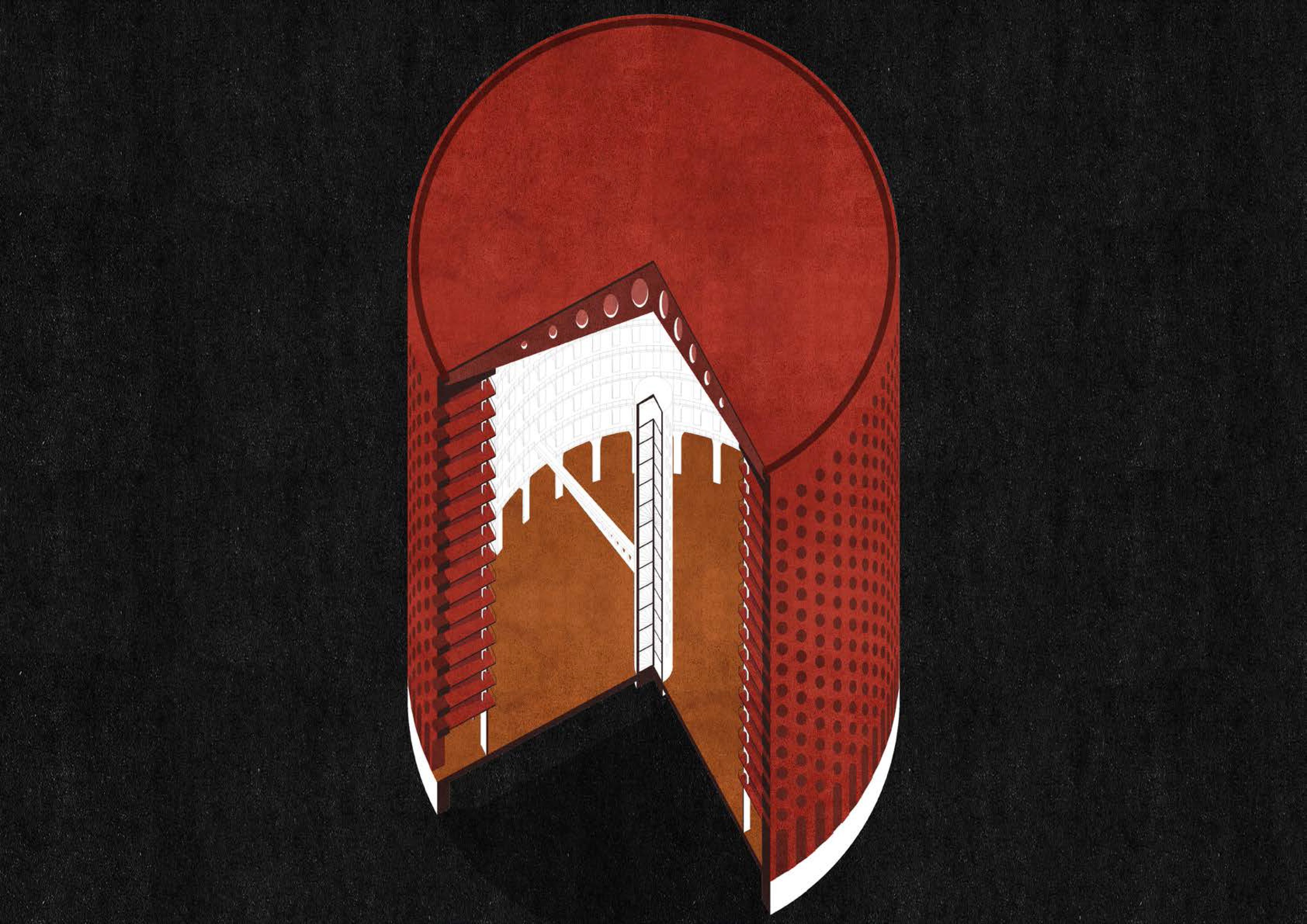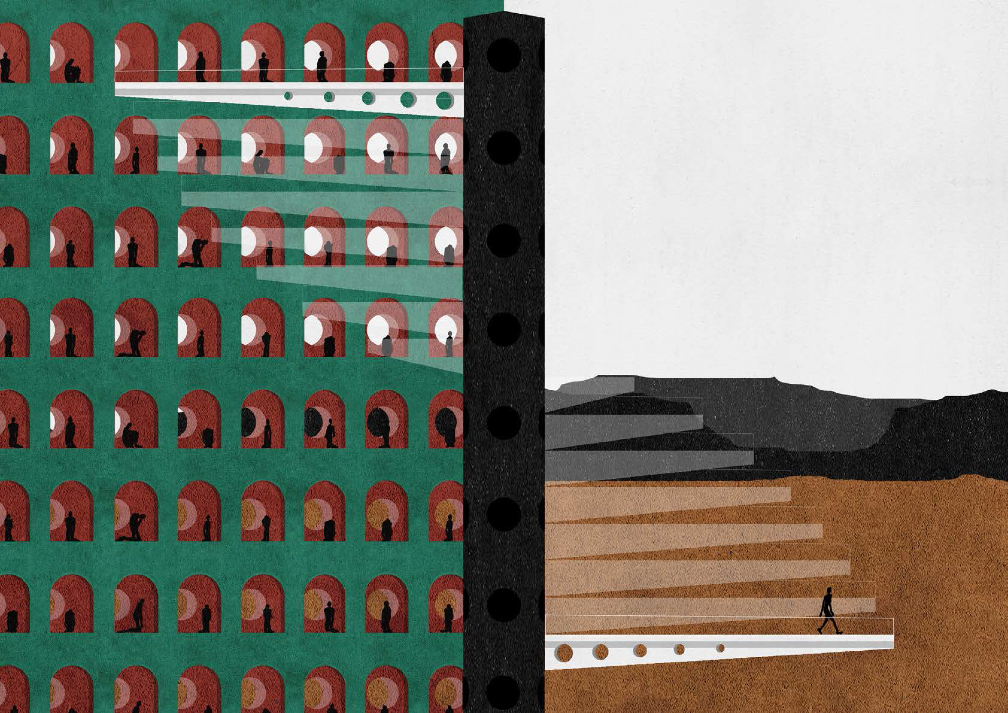 Prvá fáza väzenia je inšpirovaná projektom Panoptika od Jeremy Benthama. Je to budova kruhového pôdorysu, v ktorej osi je veža - rozhľadňa dozorcu - veľkého brata, ktorý má dokonalý prehľad o každom uväznenom vďaka presvetleniu jednotlivých ciel, kde sedia väzni v izolovaných celách. Tu sa väzni celkom poddávajú autorite na základe princípu, že svetlo prezrádza viac ako tma - sú dokonale videní a preto dokonale podriadený vyššiemu princípu. Je to fáza, kde sa väzeň dostáva pod kontrolu - jedinou prístupovou cestou dnu a von z cely je obrovské rameno, ktoré krúži okolo veže a distribuuje väzňov po celách. Táto fáza trvá len krátko - niekoľko týždňov, mesiacov. Je to obdobie zamyslenia, pokorenia, utlmenia. V jeho pozadí je stáleprítomná nádej skorého odchodu. Krátkodobá samota vie často naučiť omnoho viac ako prísna drezúra v skupine. Budova je prispôsobená ťažkým púštnym podmienkam - jej steny sú hrubé, odolávajú klimatickej záťaži. v jej streche je vytvorený komínový efekt, ktorý umožňuje prirodzenú ventiláciu. Okná smerujúce do voľnej krajiny neustále pripomínajú nekonečnosť, odrezanosť od predchádzajúceho života.