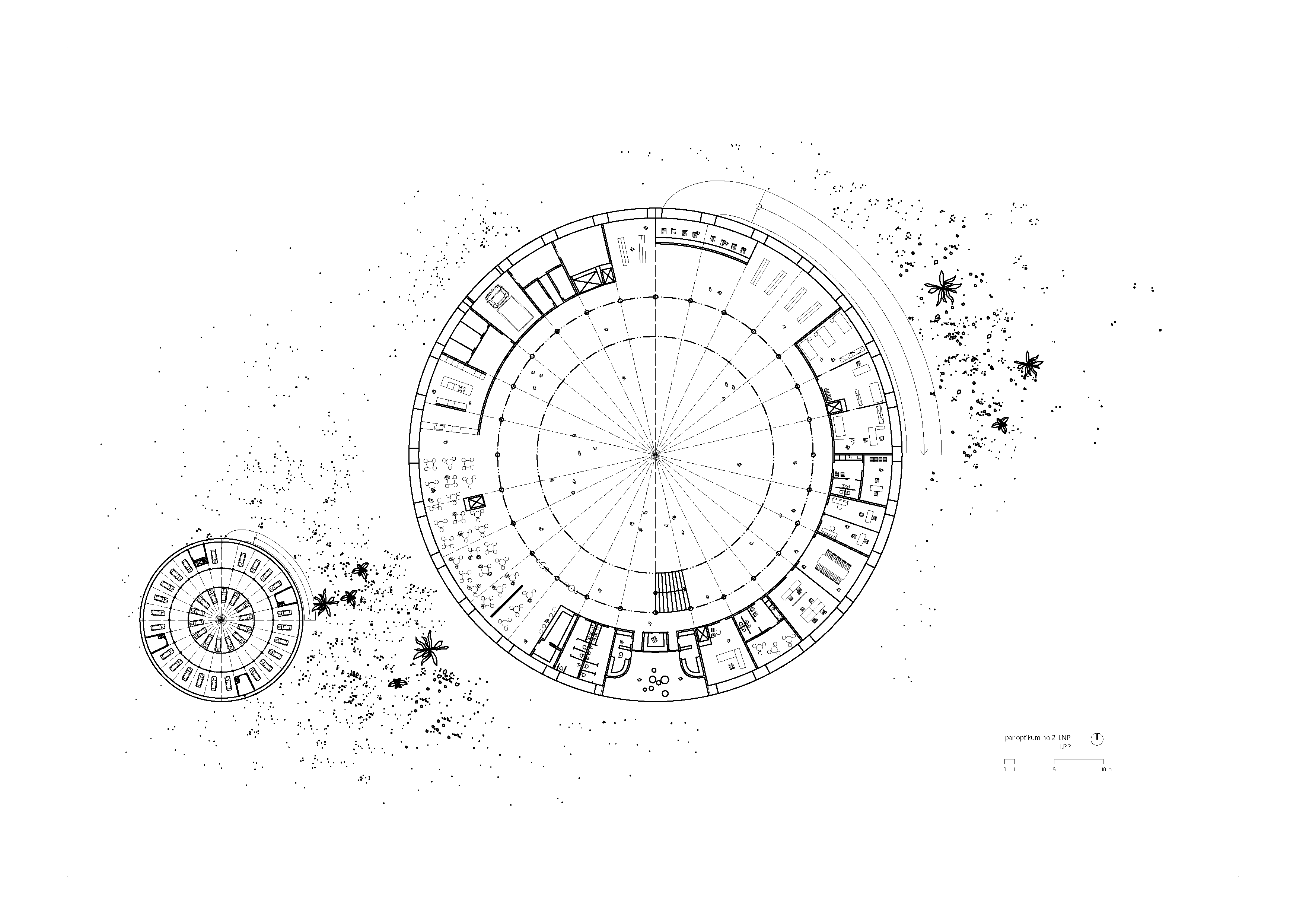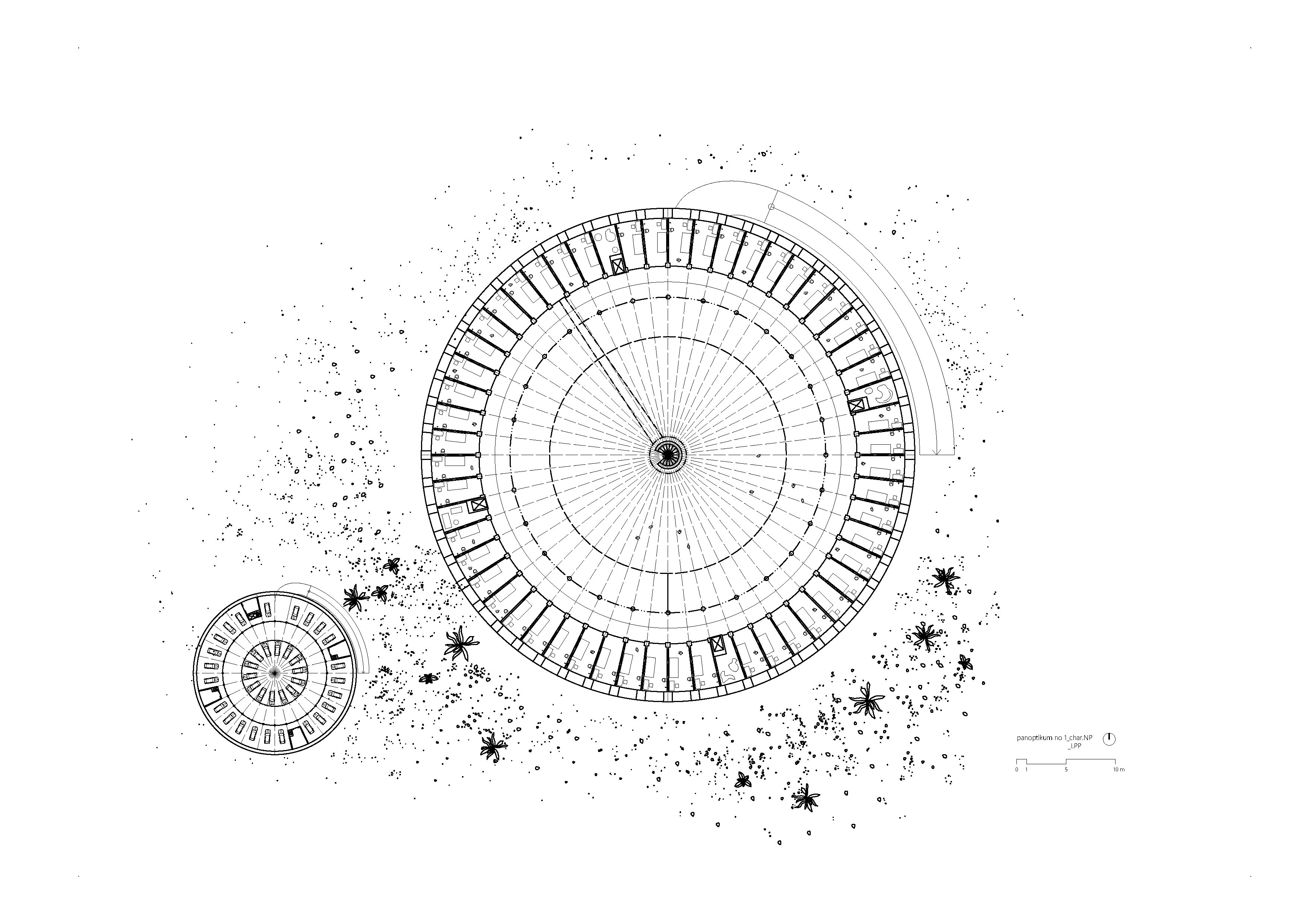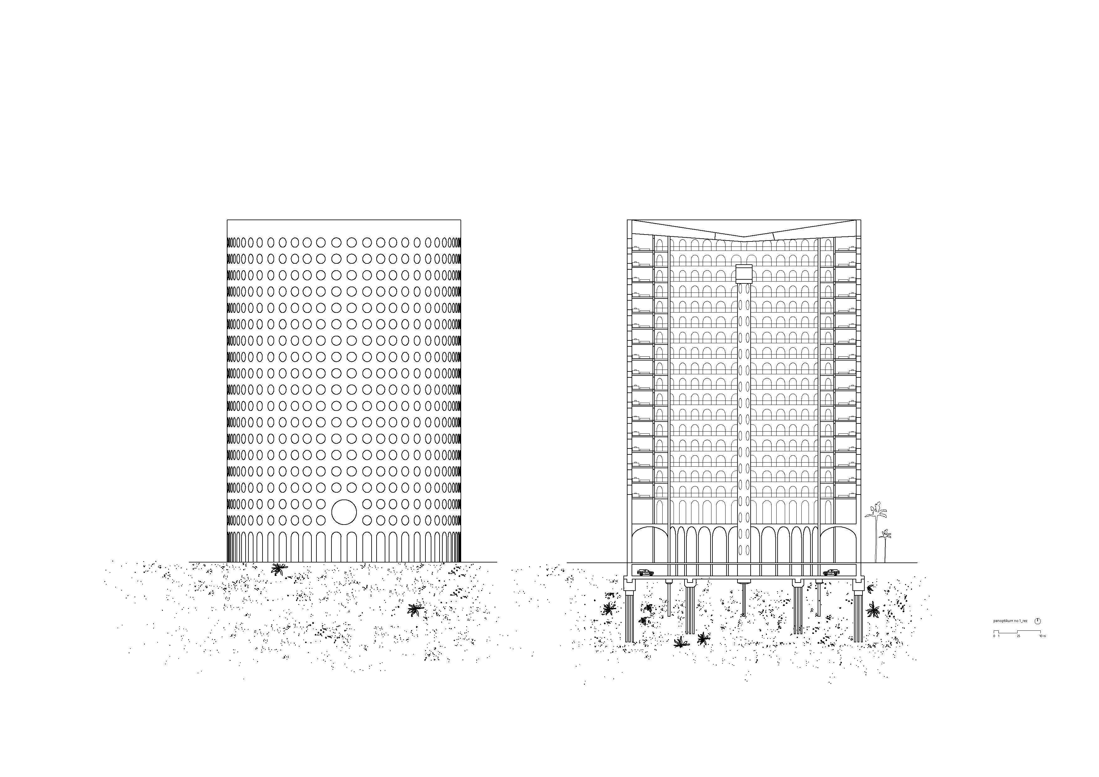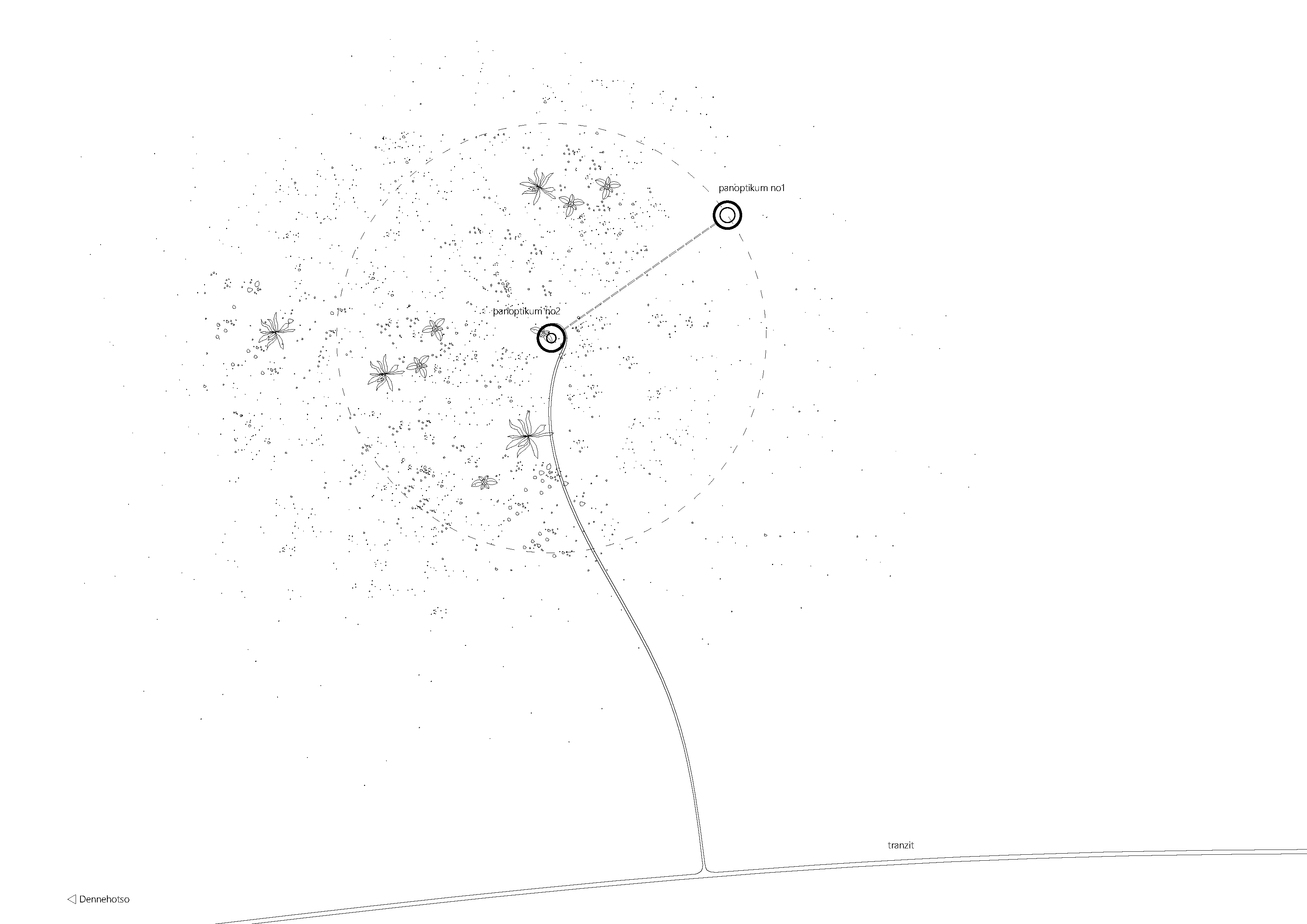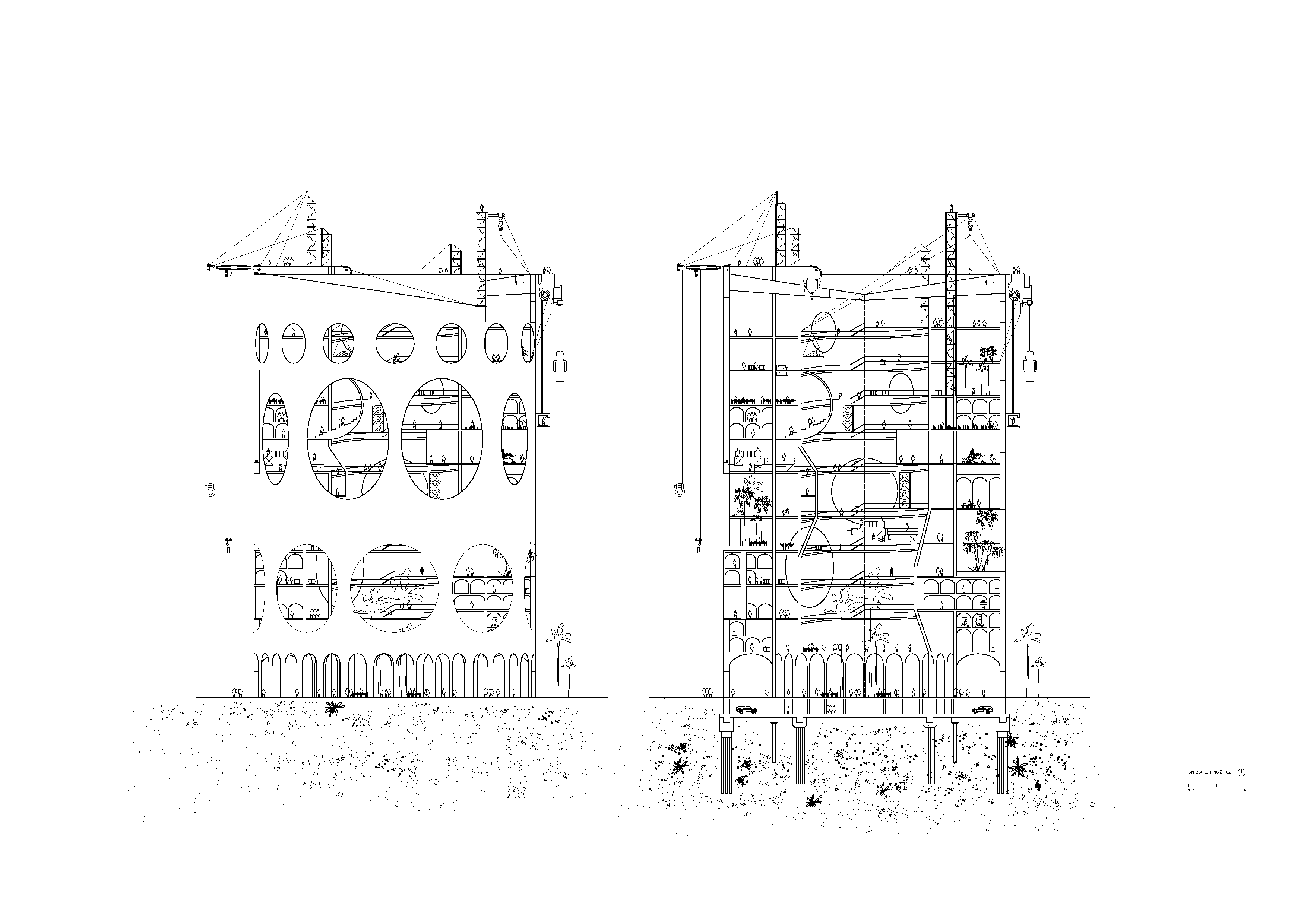 Objekt Panoptika 1 je ukončený v čase 0, menia sa len jeho rezidenti. Konštrukčná schéma objektu Panoptika 2 je tvorená dvoma vrstvami - pevný, betónový skelet, v čase 0 (zač. prevádzky väznice) je daný a v čase ukončený, a druhá vrstva tvorí menlivú časť - je to vnútorné prostredie, živé v čase tvorené štruktúrou vykladanou tvárnicami z nepálených tehál. Štruktúra sa mení jej obyvateľmi podľa vnútornej potreby väznice.