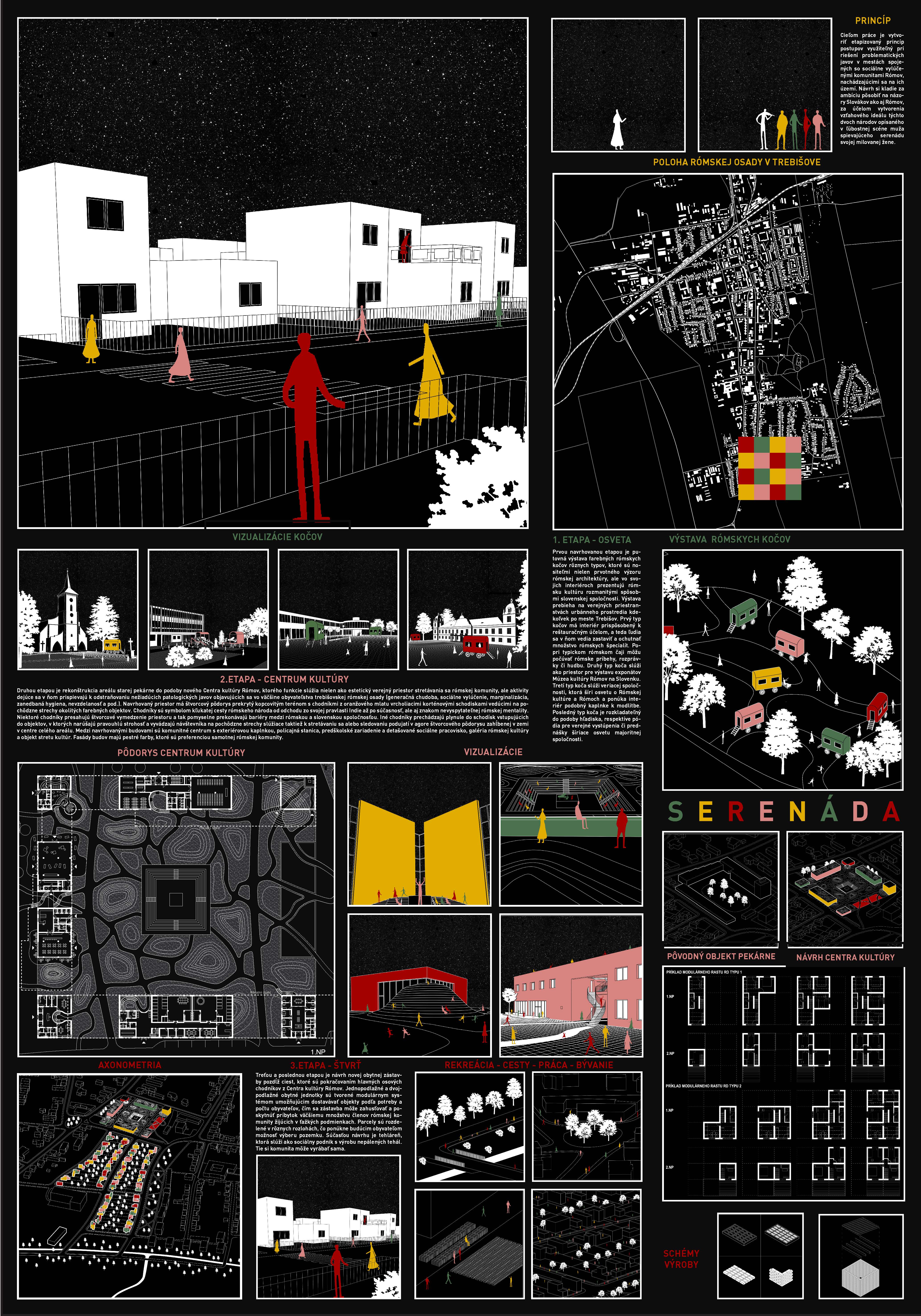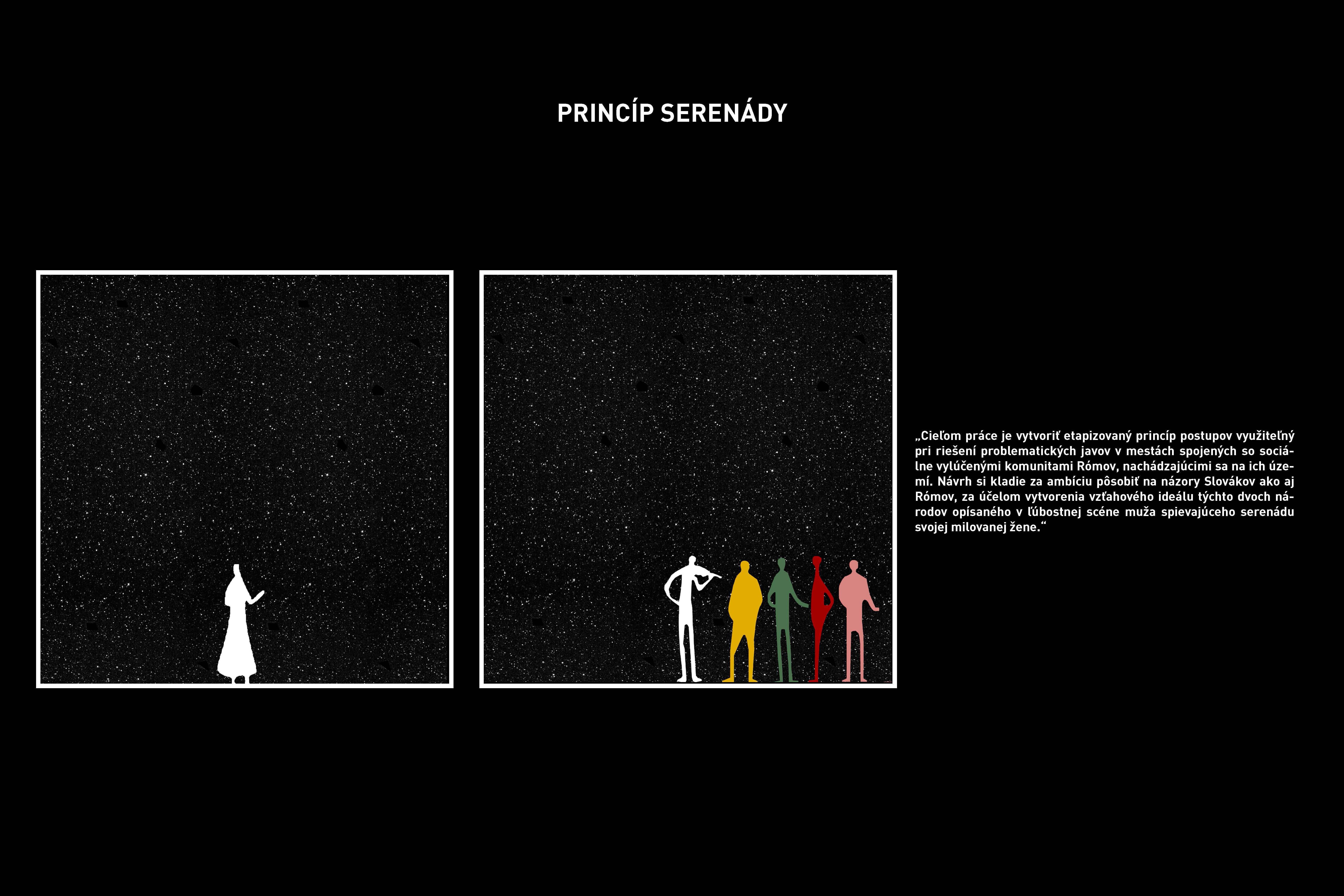Cieľom práce je vytvoriť etapizovaný princíp postupov využiteľný pri riešení problematických javov v mestách spojených so sociálne vylúčenými komunitami Rómov, nachádzajúcimi sa na ich území. Návrh si kladie za ambíciu pôsobiť na názory Slovákov ako aj Rómov, za účelom vytvorenia vzťahového ideálu týchto dvoch národov opísaného v ľúbostnej scéne muža spievajúceho serenádu svojej milovanej žene. V prvej kapitole sa práca zaoberá vážnosťou problému v rôznych prístupoch k vzťahu Rómov a Slovákov vyúsťujúceho do obrovskej polarizácie spoločnosti. V ďalších troch kapitolách predstavuje analýzy, výskumy a teórie, ktoré na konci pretavuje do konkrétnej architektúry, prinášajúcej v troch etapách úplnú premenu prostredia, správania, ale aj vnímania konkrétneho mesta Trebišov a jeho obyvateľstva. Prvou etapou je putovná výstava rómskej kultúry v podobe historizujúcich rómskych kočov, ktorá nielen prebúdza mesto k životu, ale tvorí aj osvetu o málo poznanej kultúre Rómov pre Slovenskú majoritnú spoločnosť. Druhou etapou je vytvorenie Centra kultúry Rómov, ktoré v sebe nesie potrebné priestory pre spoluprácu Rómov a Slovákov pri riešení problémov vyskytujúcich sa v sociálne vylúčených rómskych komunitách, ale aj v meste, v ktorom sa nachádzajú. Treťou etapou je návrh urbanistického riešenia novej štvrte bývania so sociálnym podnikom pre členov komunity, ktorý dotvorí proces premeny uskutočnený v druhej etape a prepojí hlavné osi mesta so segregovanou oblasťou rómskej osady.