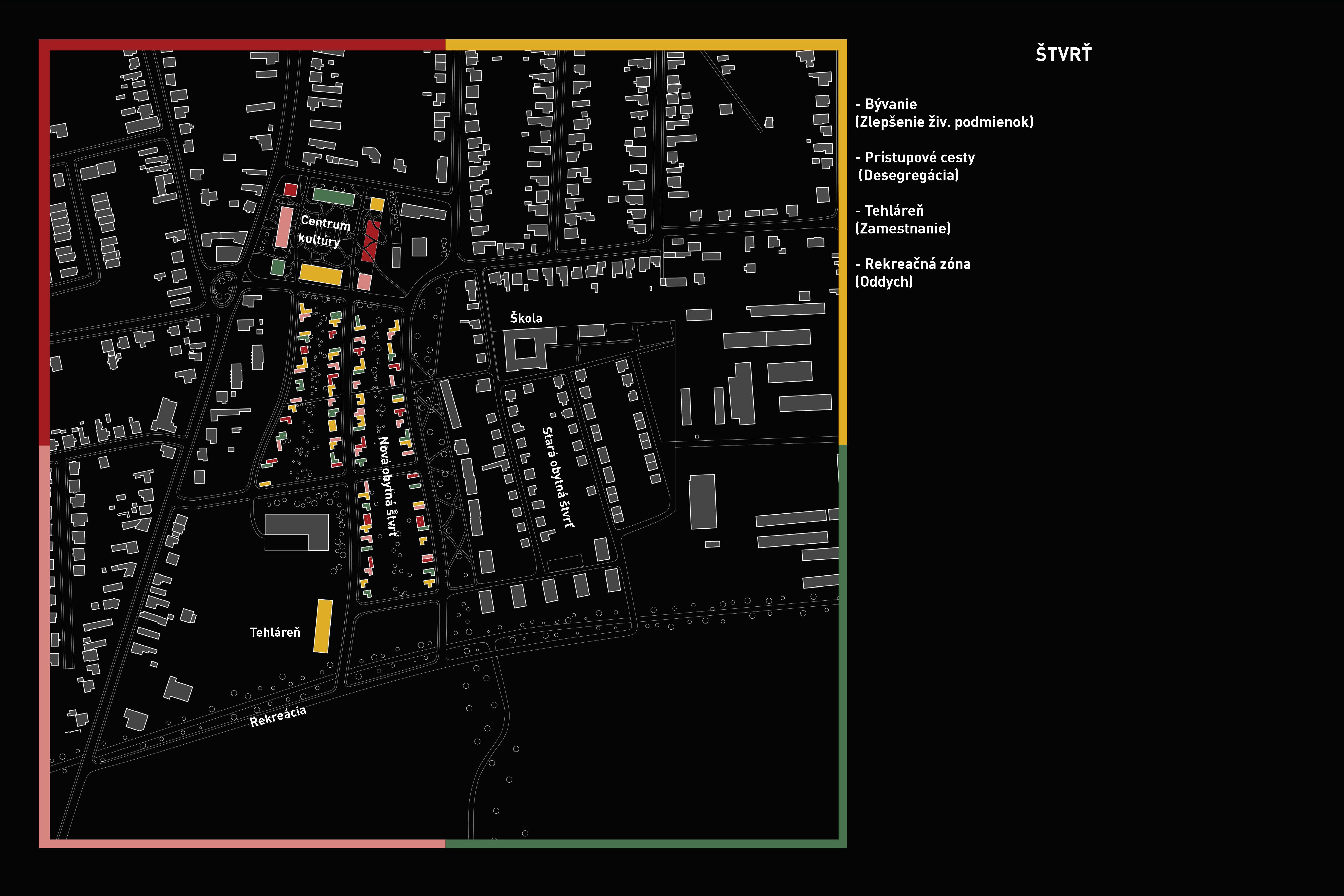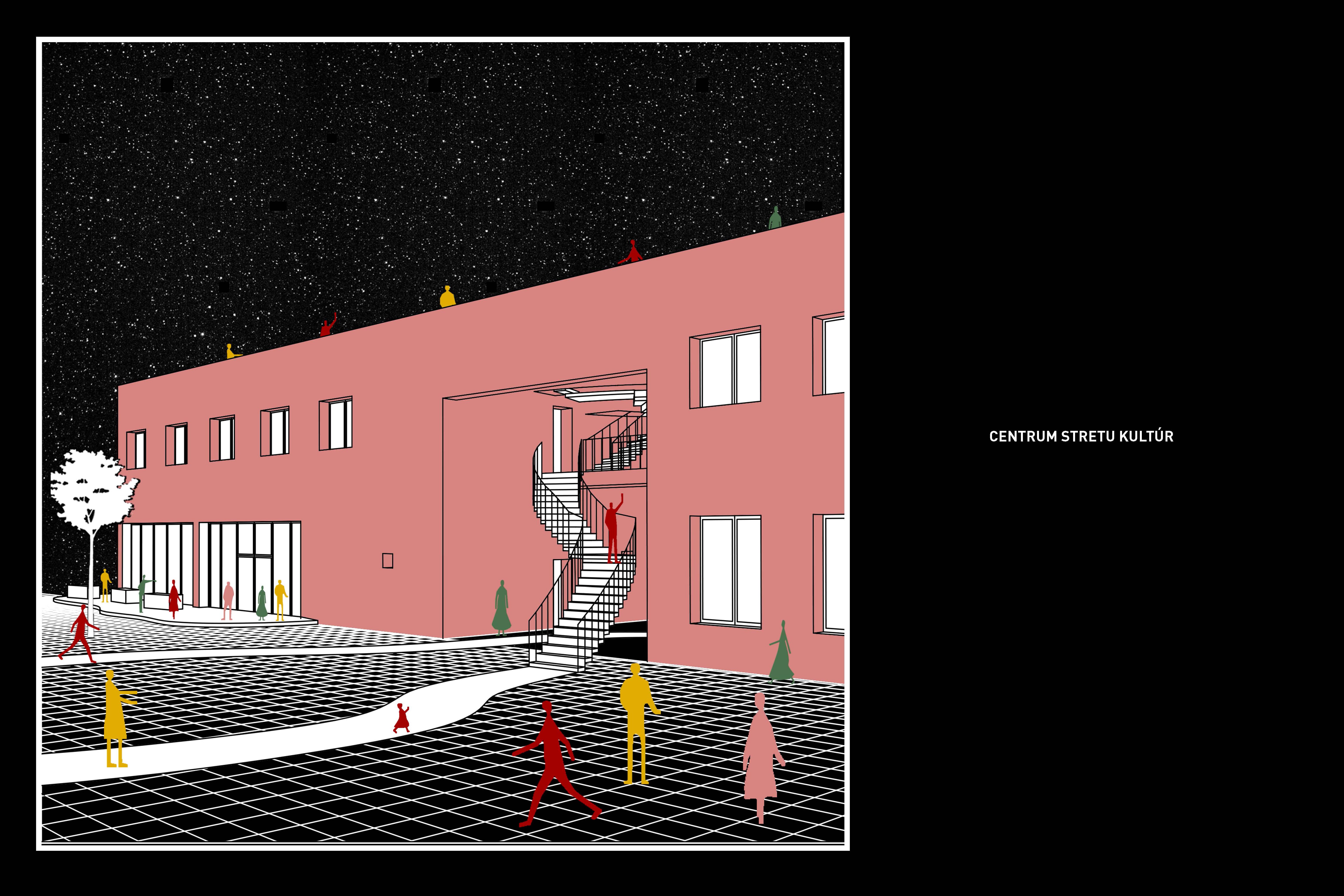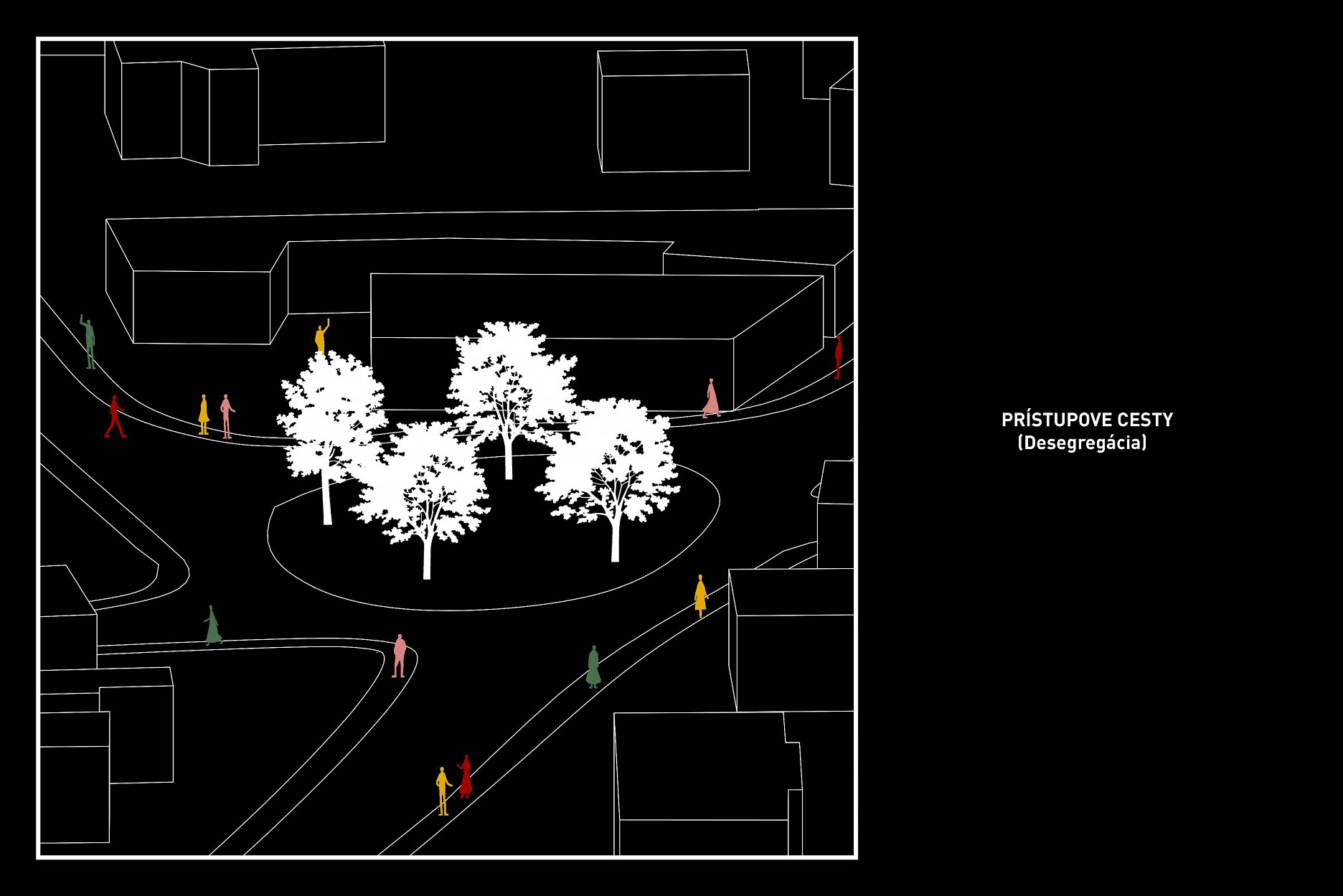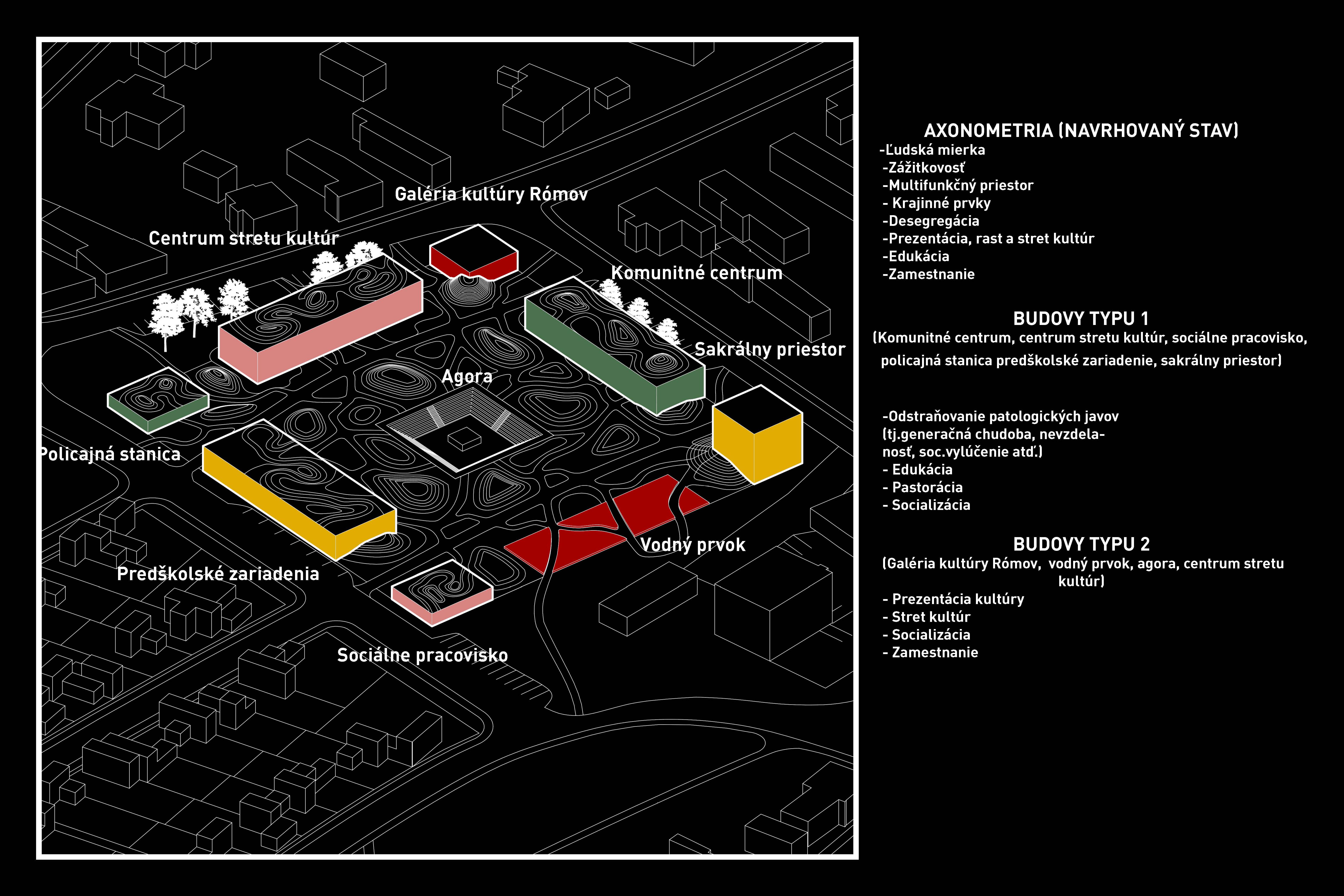Výsledným urbanistickým riešením je štúdia Centra kultúry Rómov tvoreného z niekdajšieho areálu starej pekárne. Jeho navrhovanou súčasťou je priestranné námestie, uprostred ktorého sa nachádza agora štvorcového pôdorysu zahĺbená do zeme. Tá môže slúžiť rôznym rómskym festivalom, „bašavelom“ alebo len na spoločné stretnutia. Celý areál so štvorcovým pôdorysom je pokrytý kopcovitým trávnatým terénom s úzkymi chodníčkami z oranžového mlatu, ktoré reprezentujú kľukaté cesty života Rómov v priebehu dejín, ale aj nevyspytateľnosť a spontánnosť rómskej mentality. Slúžia k voľnému stretávaniu sa v exteréri. Niektoré chodníčky plynule prechádzajú do exteriérových korténových schodísk vychádzajúcich na strechy okolitých farebných budov, ktoré sú súčasťou návrhu. Budovy sú taktiež pokryté kopcovitými pochôdznými strechami, takže sú prístupné verejnosti a pri podujatiach odohrávajúcich sa v stredovej agore slúžia divákom ako pozorovateľne.