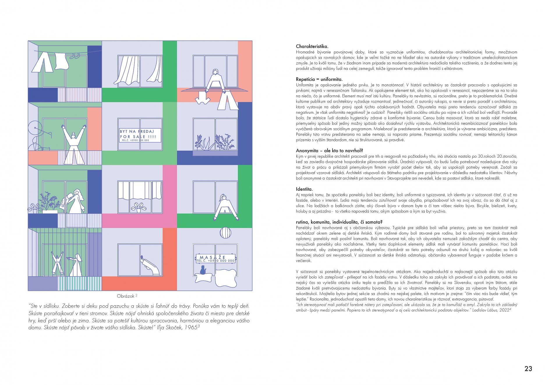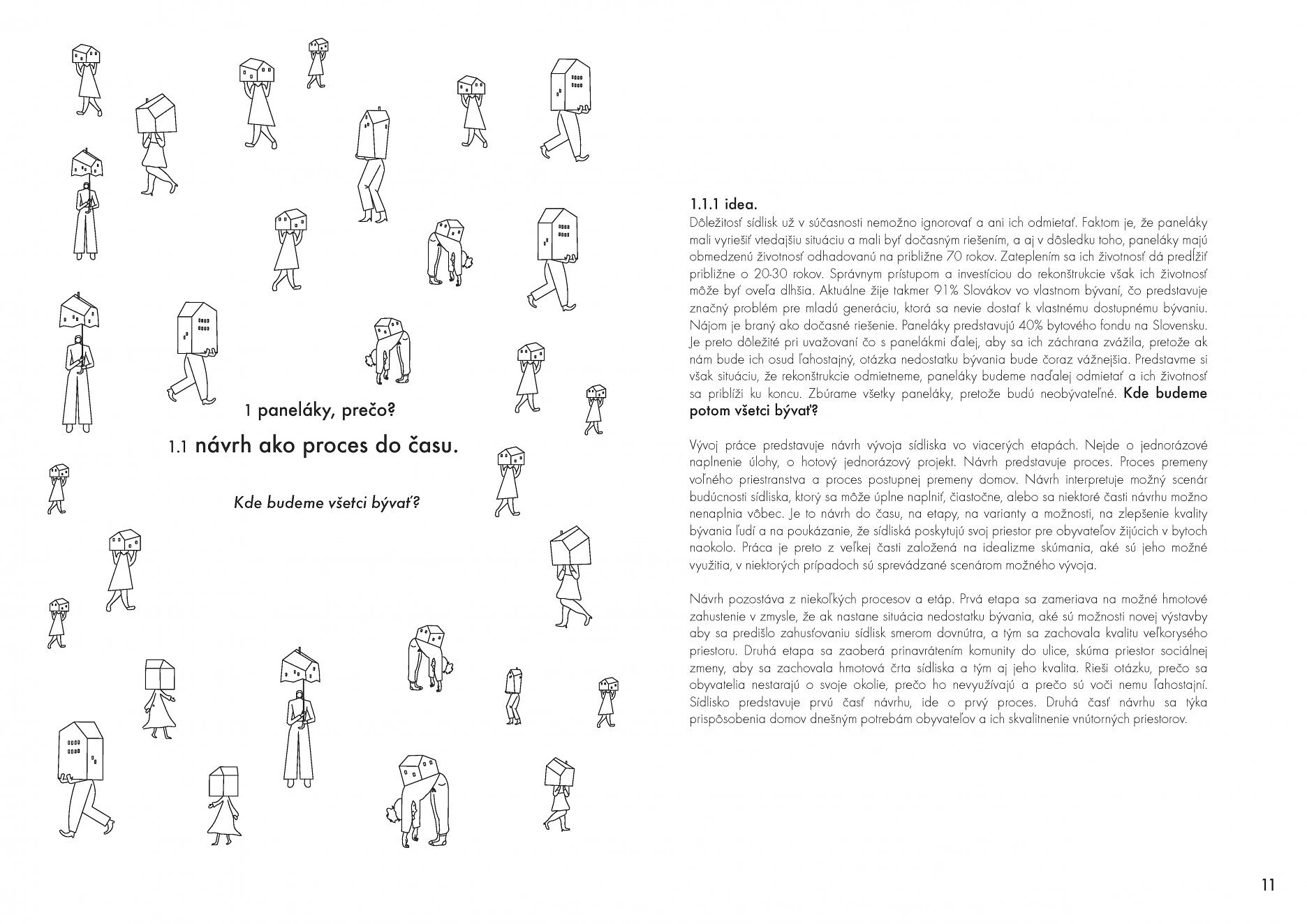 "Sídliská v súčasnosti čelia mnohým problémom využitia. Mnohé sa dnes zahusťujú v dôsledku veľkorysého priestoru pre nedostatok bývania, čím sa uberá z kvality bývania a aj z kvality sídliska... ...Faktom je, že paneláky mali vyriešiť vtedajšiu situáciu a mali byť dočasným riešením, a aj v dôsledku toho majú obmedzenú životnosť odhadovanú na približne 70 rokov. Zateplením sa ich životnosť dá predĺžiť približne o 20-30 rokov. Správnym prístupom a investíciou do rekonštrukcie však ich životnosť môže byť oveľa dlhšia. Na Slovensku predstavujú paneláky 40% bytového fondu. Je preto dôležité pri uvažovaní čo s panelákmi ďalej, aby sa ich záchrana zvážila, pretože ak nám bude ich osud ľahostajný, otázka nedostatku bývania bude čoraz vážnejšia. Predstavme si však situáciu, že rekonštrukcie odmietneme, paneláky budeme naďalej odmietať a ich životnosť sa priblíži ku koncu. Zbúrame všetky paneláky, pretože budú neobývateľné. Kde budeme potom všetci bývať?"