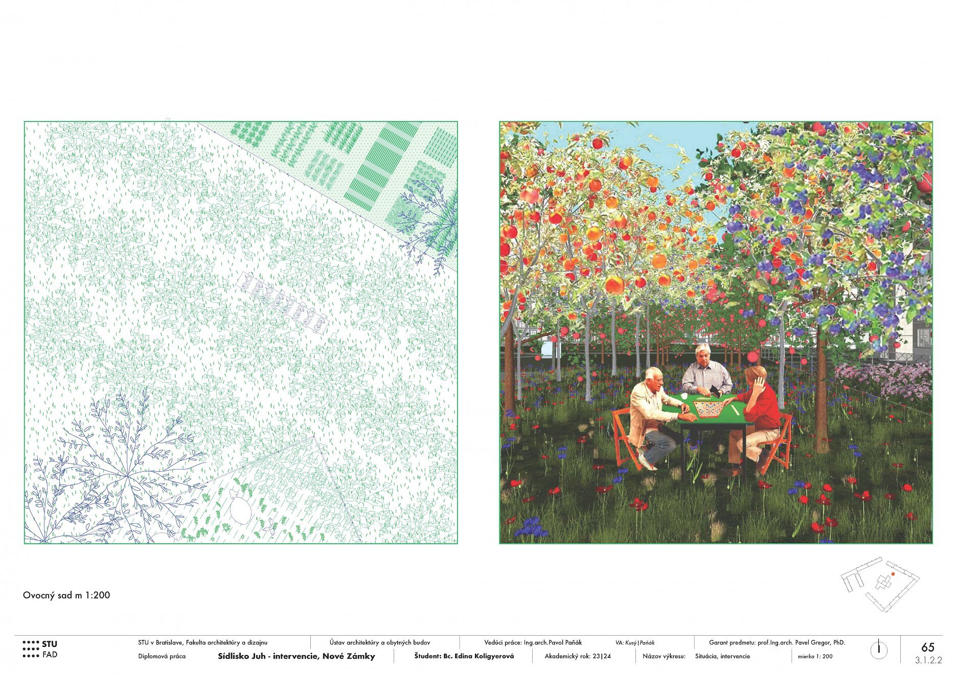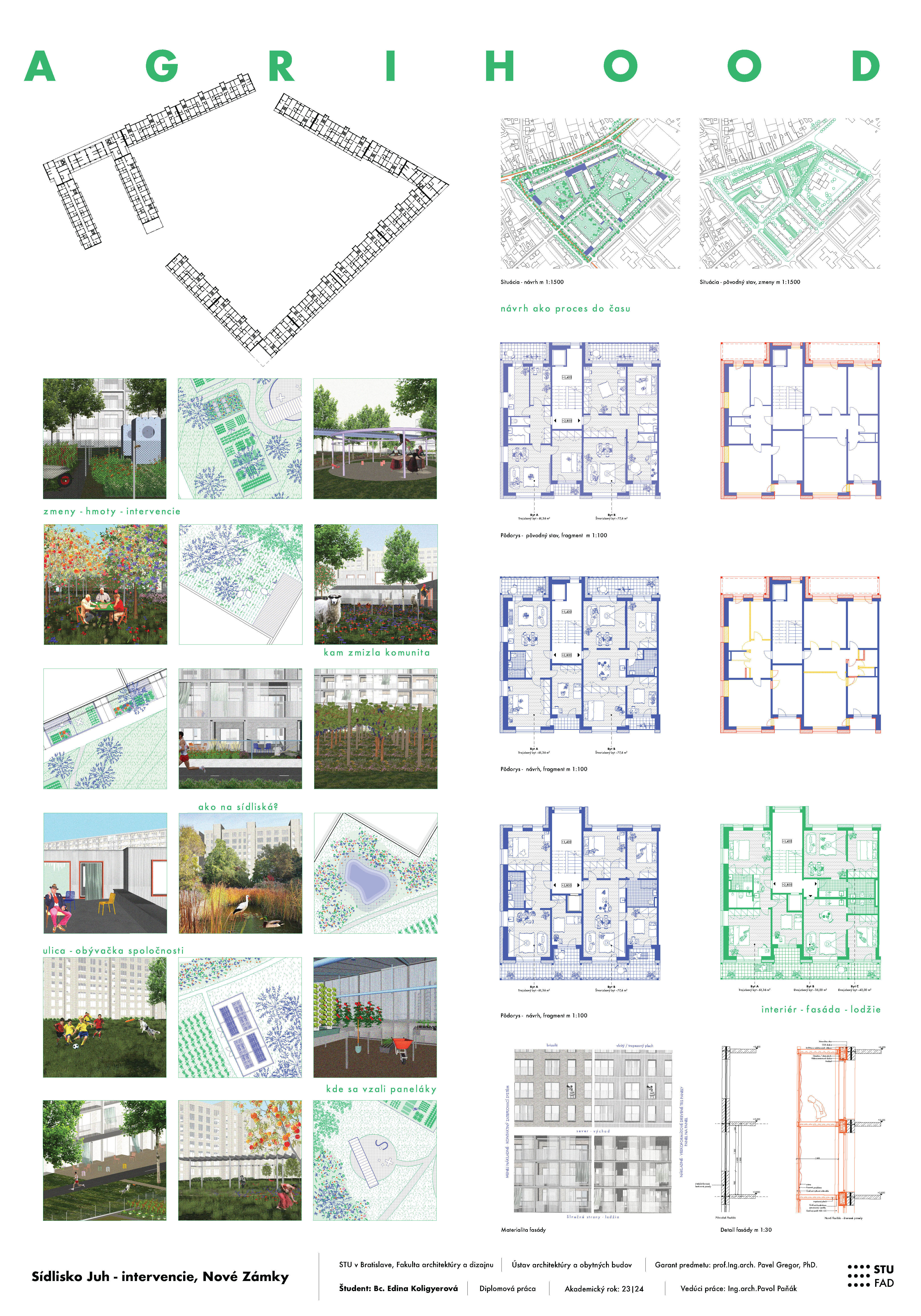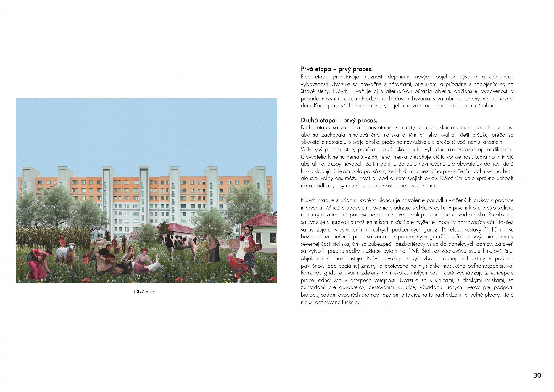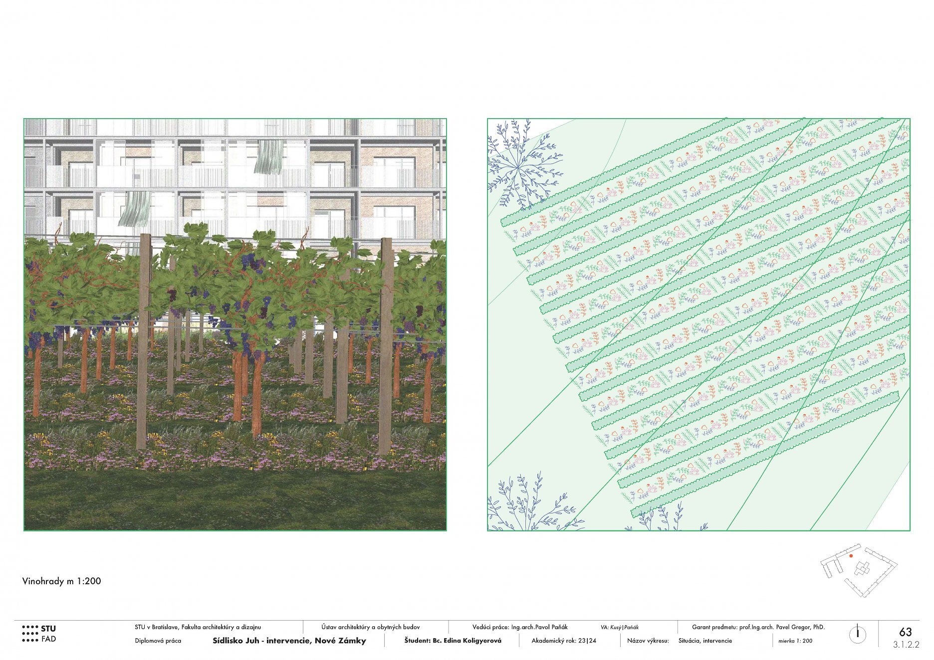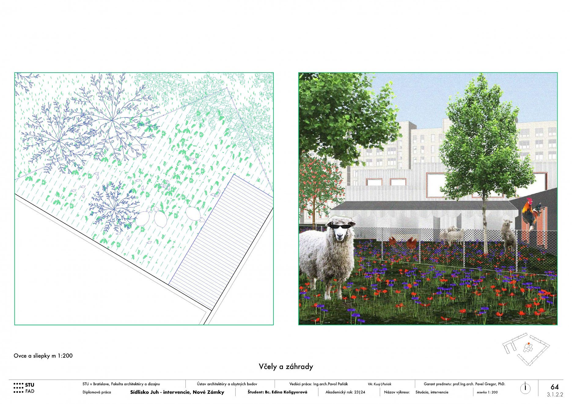 Dnes priblížime prácu "Sídlisko Juh – intervencie, Nové Zámky", ktorá vznikla na pôde Fakulty architektúry STU v Bratislave pod vedením Pavla Paňáka. Edina Koligyerová sa v nej venuje otázke: "Čo tvorí priestor medzi panelákmi a aké sú jeho možnosti využitia?". Interpretuje koexistenciu poľnohospodárstva v meste, zaoberá sa myšlienkou, či je možné sídlisko využívať na pestovanie plodín a chov zvierat. Cieľom práce bolo prinavrátiť sídlisku to, čo mu je vlastné, čo ho charakterizuje a zachovať tým jeho kvalitu. Zároveň prikladá dôležitosť riešenia otázky ako im predĺžiť životnosť.