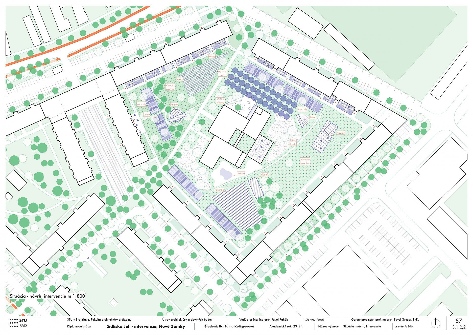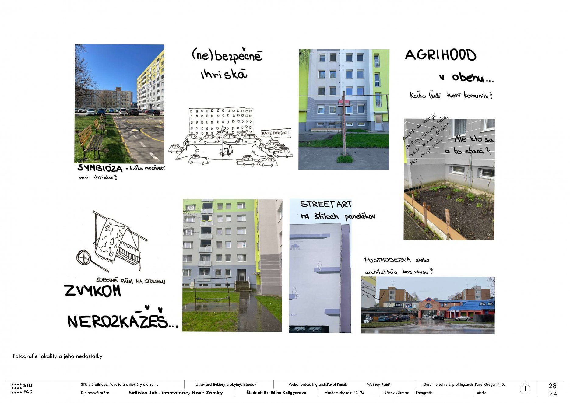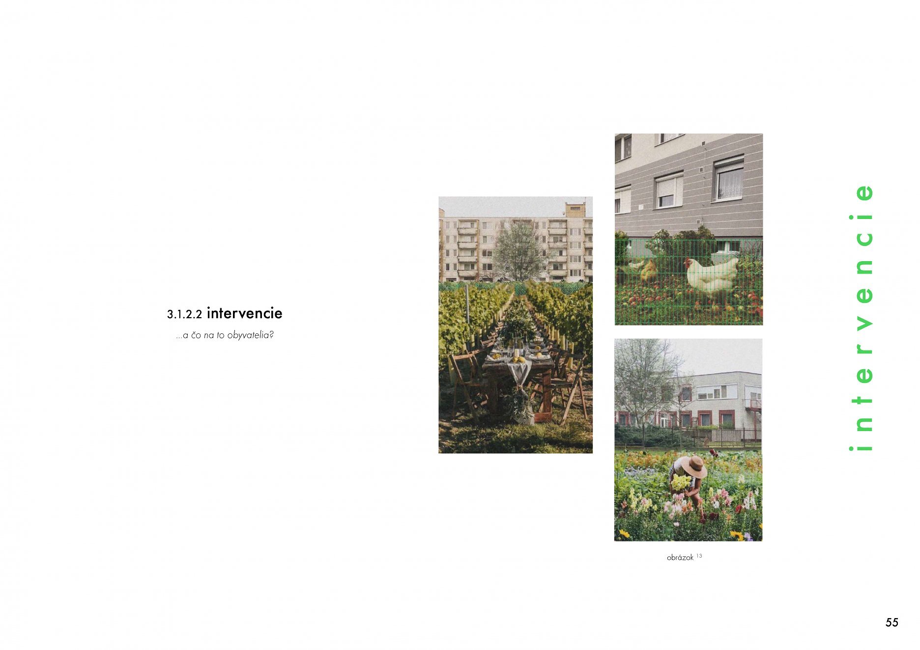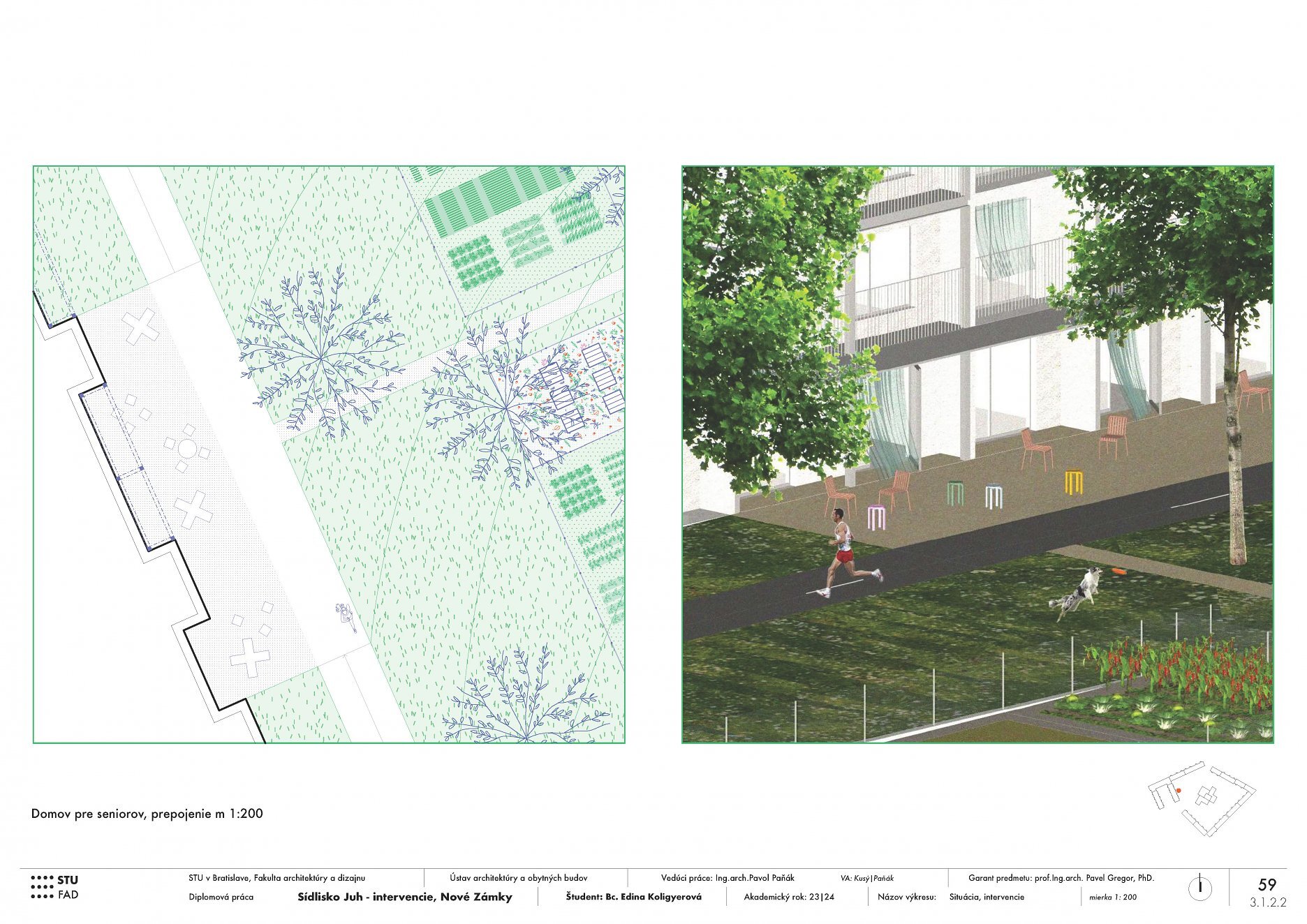 Dnes priblížime prácu "Sídlisko Juh – intervencie, Nové Zámky", ktorá vznikla na pôde Fakulty architektúry STU v Bratislave pod vedením Pavla Paňáka. Edina Koligyerová sa v nej venuje otázke: "Čo tvorí priestor medzi panelákmi a aké sú jeho možnosti využitia?". Interpretuje koexistenciu poľnohospodárstva v meste, zaoberá sa myšlienkou, či je možné sídlisko využívať na pestovanie plodín a chov zvierat. Cieľom práce bolo prinavrátiť sídlisku to, čo mu je vlastné, čo ho charakterizuje a zachovať tým jeho kvalitu. Zároveň prikladá dôležitosť riešenia otázky ako im predĺžiť životnosť.