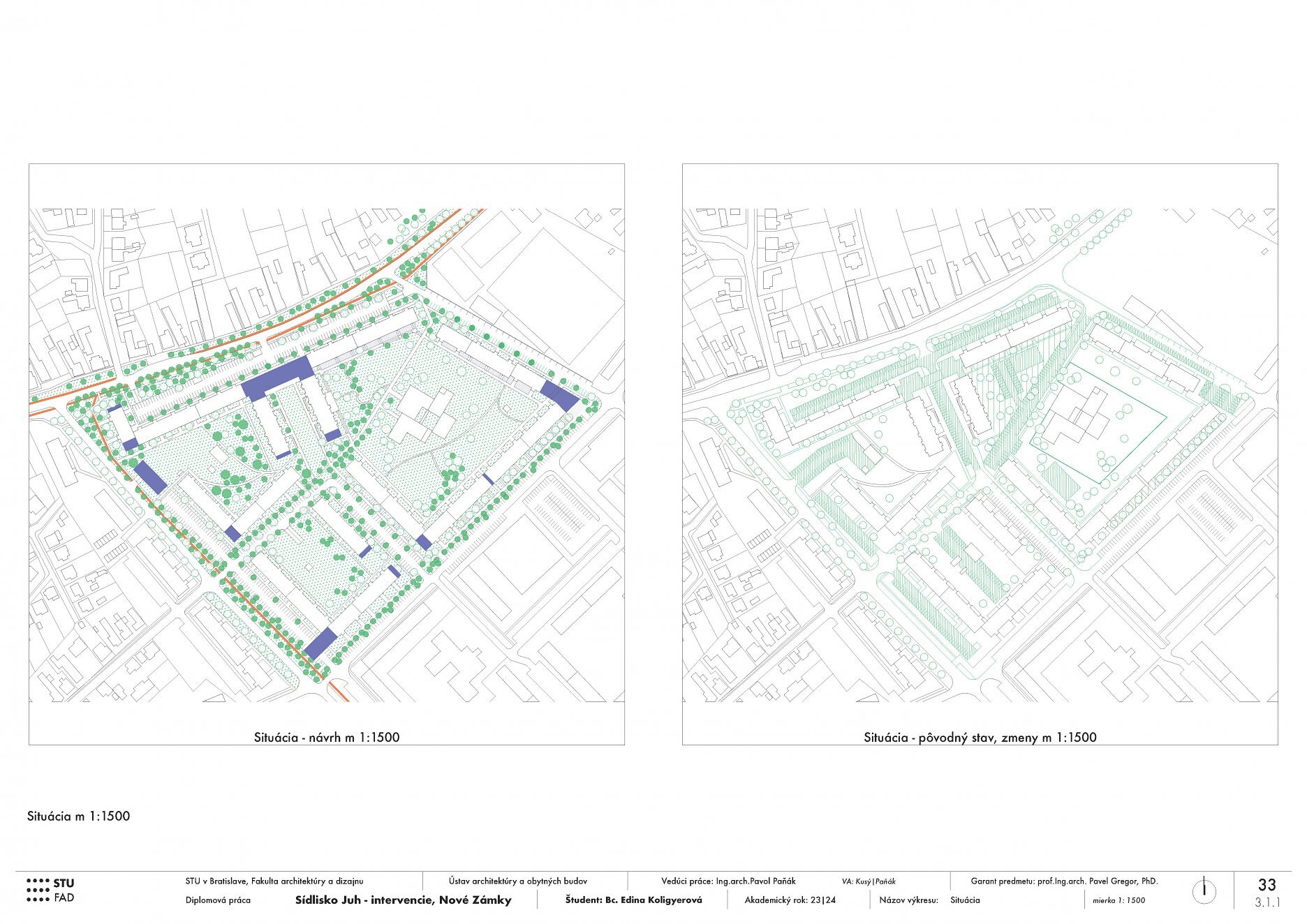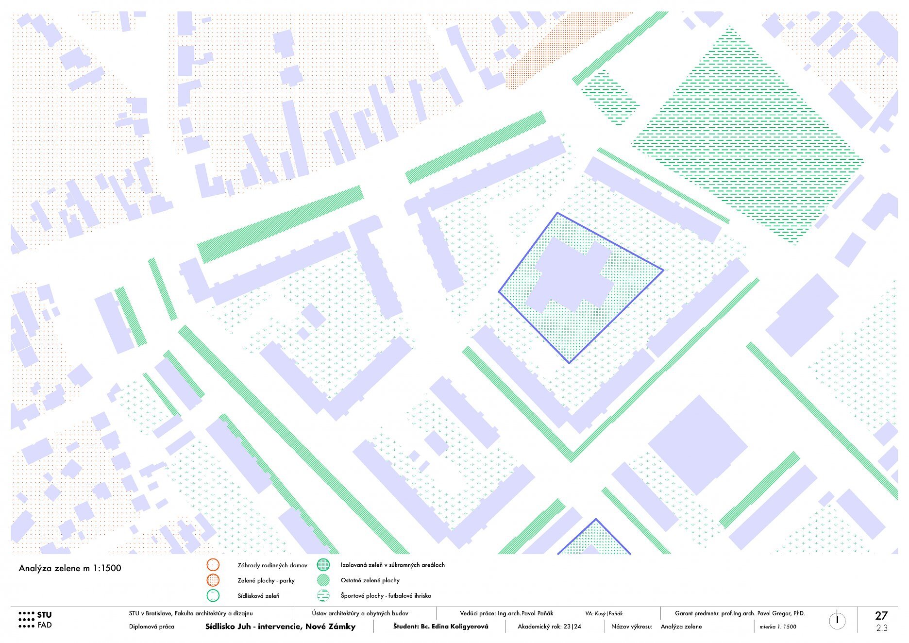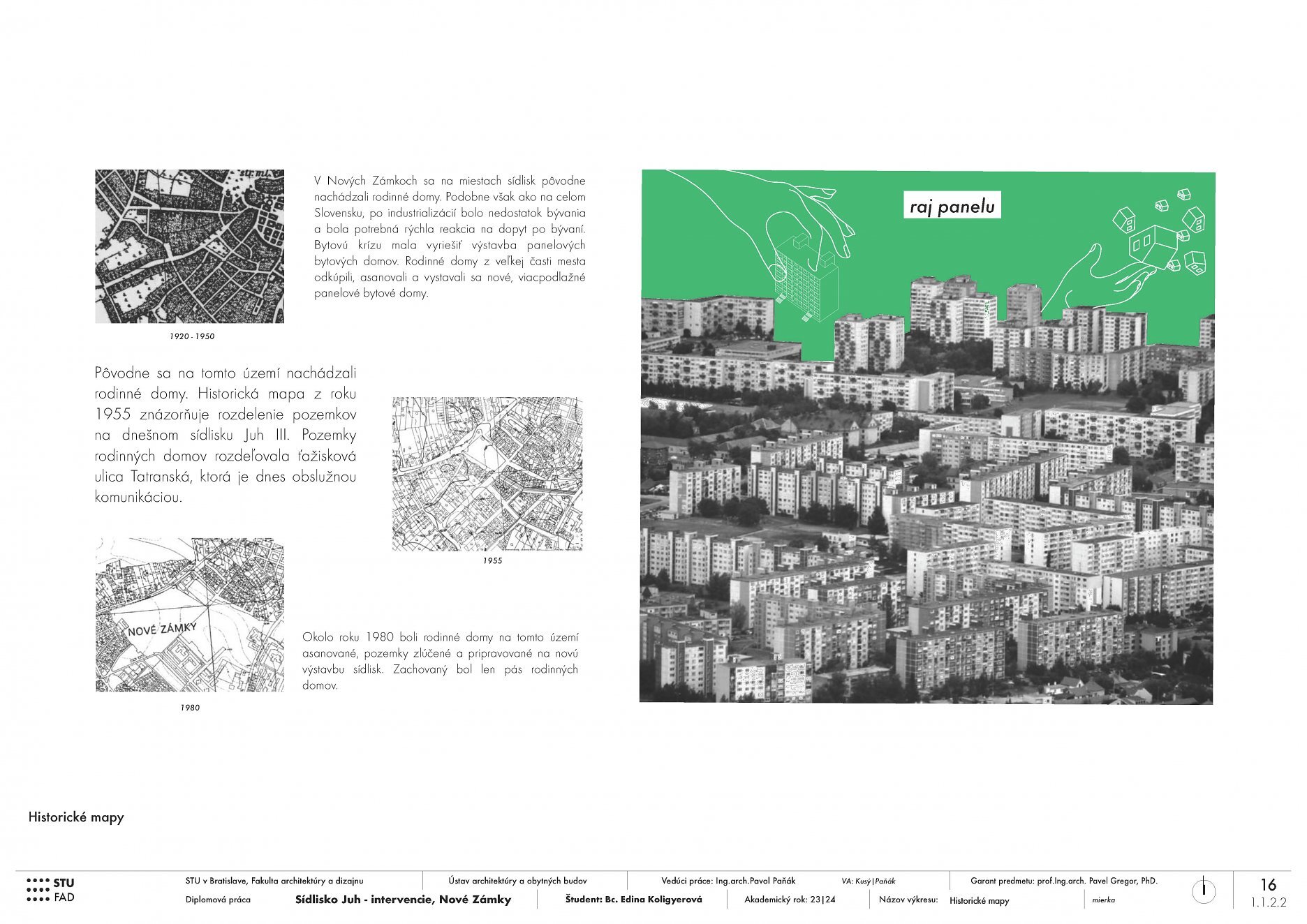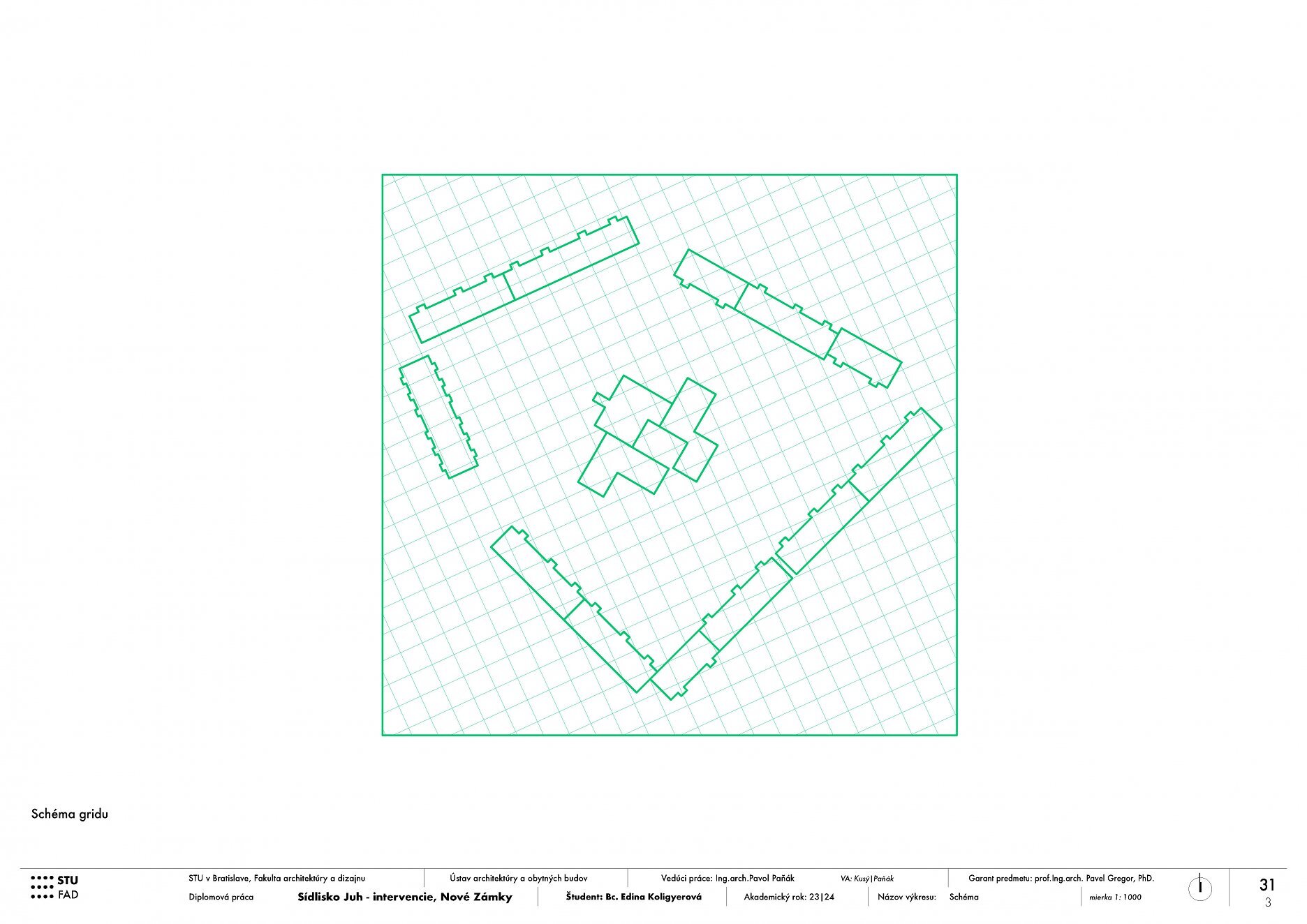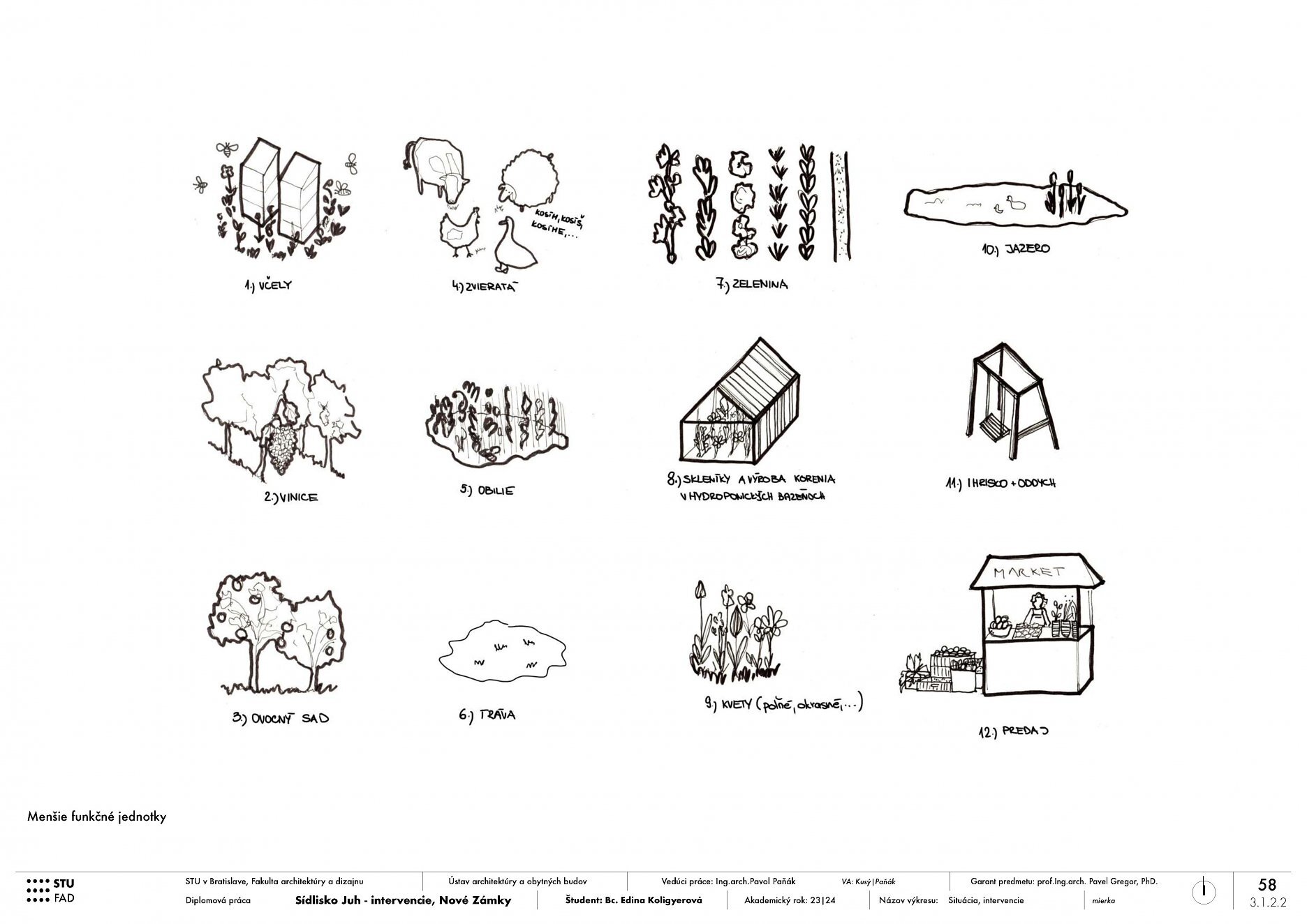 Dnes priblížime prácu "Sídlisko Juh – intervencie, Nové Zámky", ktorá vznikla na pôde Fakulty architektúry STU v Bratislave pod vedením Pavla Paňáka. Edina Koligyerová sa v nej venuje otázke: "Čo tvorí priestor medzi panelákmi a aké sú jeho možnosti využitia?". Interpretuje koexistenciu poľnohospodárstva v meste, zaoberá sa myšlienkou, či je možné sídlisko využívať na pestovanie plodín a chov zvierat. Cieľom práce bolo prinavrátiť sídlisku to, čo mu je vlastné, čo ho charakterizuje a zachovať tým jeho kvalitu. Zároveň prikladá dôležitosť riešenia otázky ako im predĺžiť životnosť.