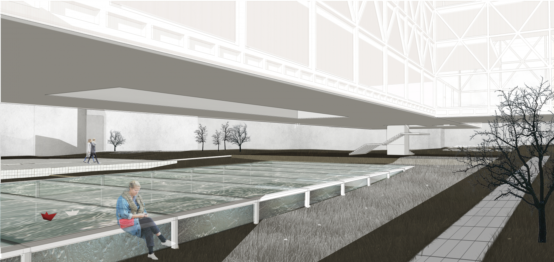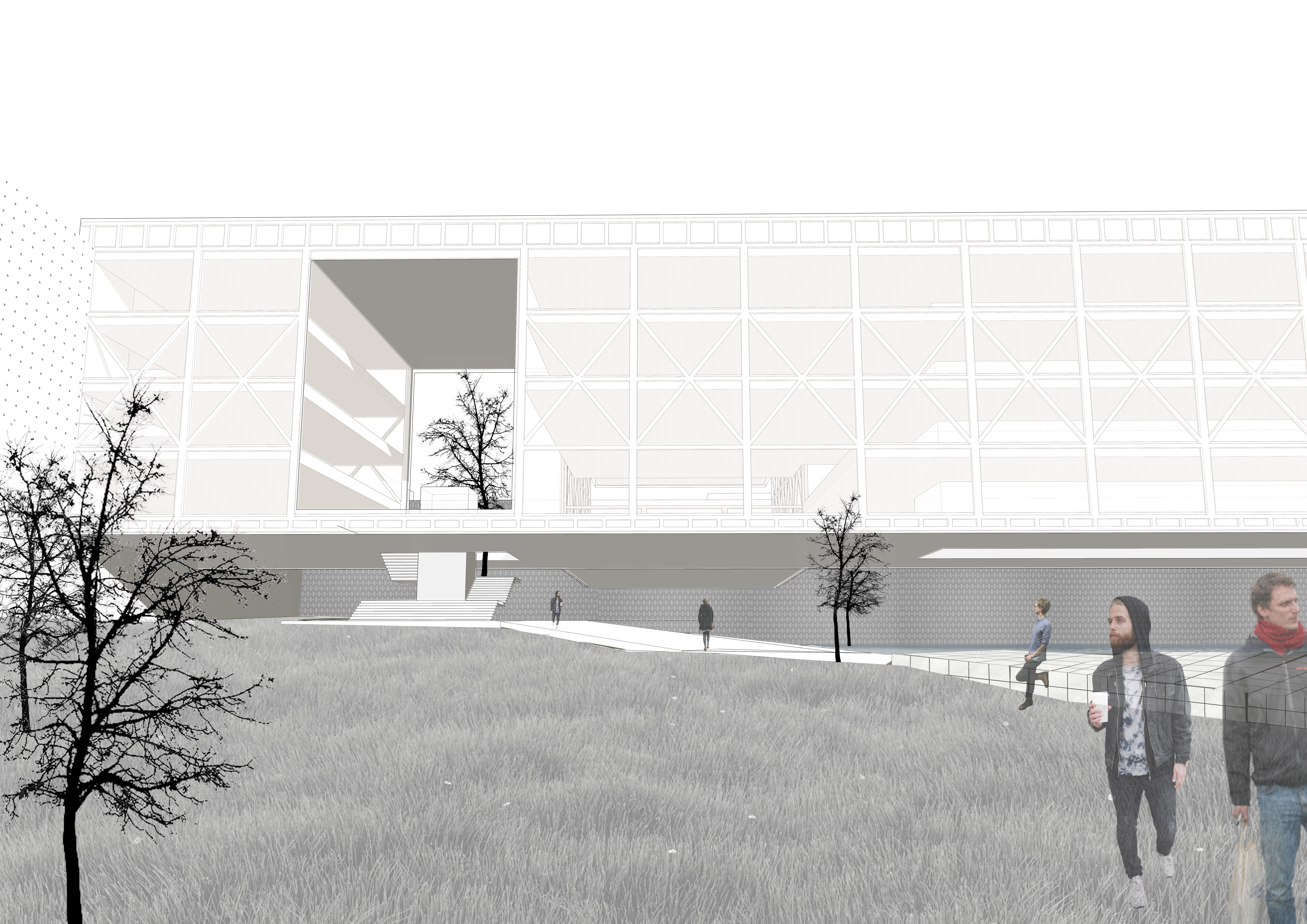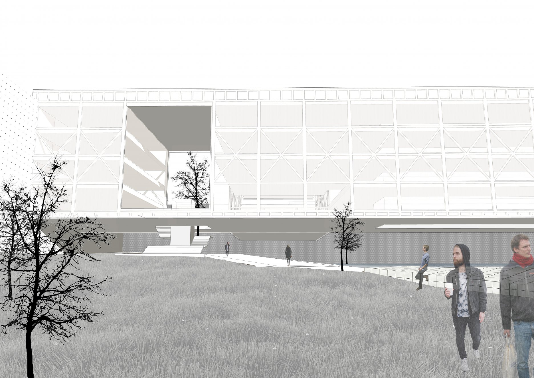 Hlavnou ideou konceptu riešenia budovy a jej okolia sa stalo "prepojenie". Či už je to prepojenie medzi študentmi STU, spolupráca fakúlt, alebo prepojenie s Námestím Slobody. Cieľom bolo vytvorenie vľúdneho mikroprostredia vo vnútri blokovej zástavby areálu STU tak, aby mali študenti, obyvatelia a návštevníci mesta potrebu prechádzať týmto nádvorím nie len kvôli skráteniu si cesty, ale aj kvôli oddychu a sociálnej interakcii s možnosťou vzhliadnutia rôznych druhov moderného umenia, či výdobytkov technológie. Tento koncept nezostal iba v prevádzkovej a teoretickej hladine. Odzrkadľuje sa aj na tvare budovy ako takej. Hmota budovy prepája všetky tri fakulty, no zároveň si zachováva vlastnú funkčnú ako aj formálnu integritu. Osadenie celej hmoty do výšky niekoľko metrov nad terén a použitie translucentného fasádneho plášťa podporuje myšlienku otvorenia areálu voči mestu. Bez zbytočného zaberania verejného priestoru, tvorby ťažkopádnych hmôt, či bránenia prirodzeným peším ťahom.
