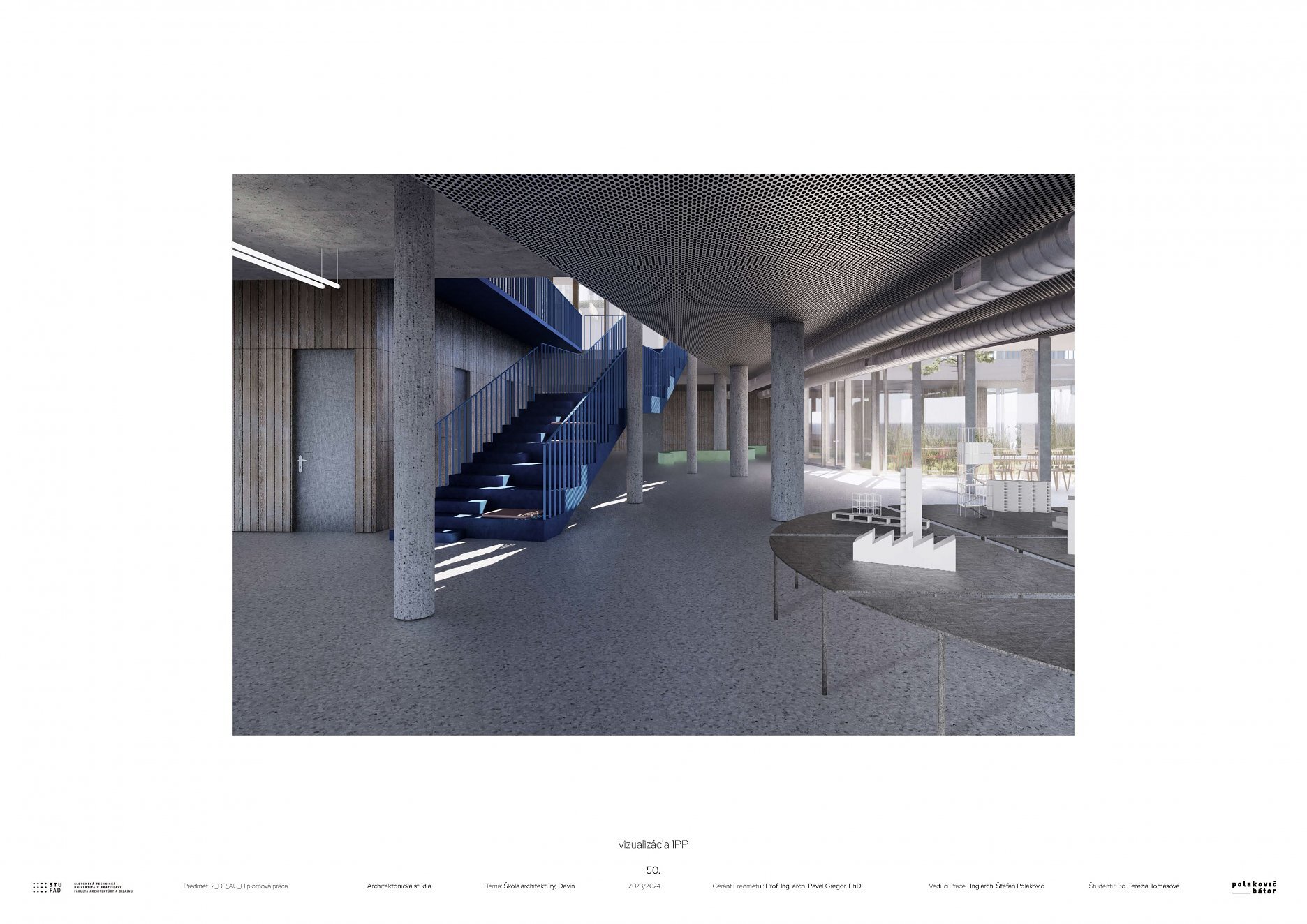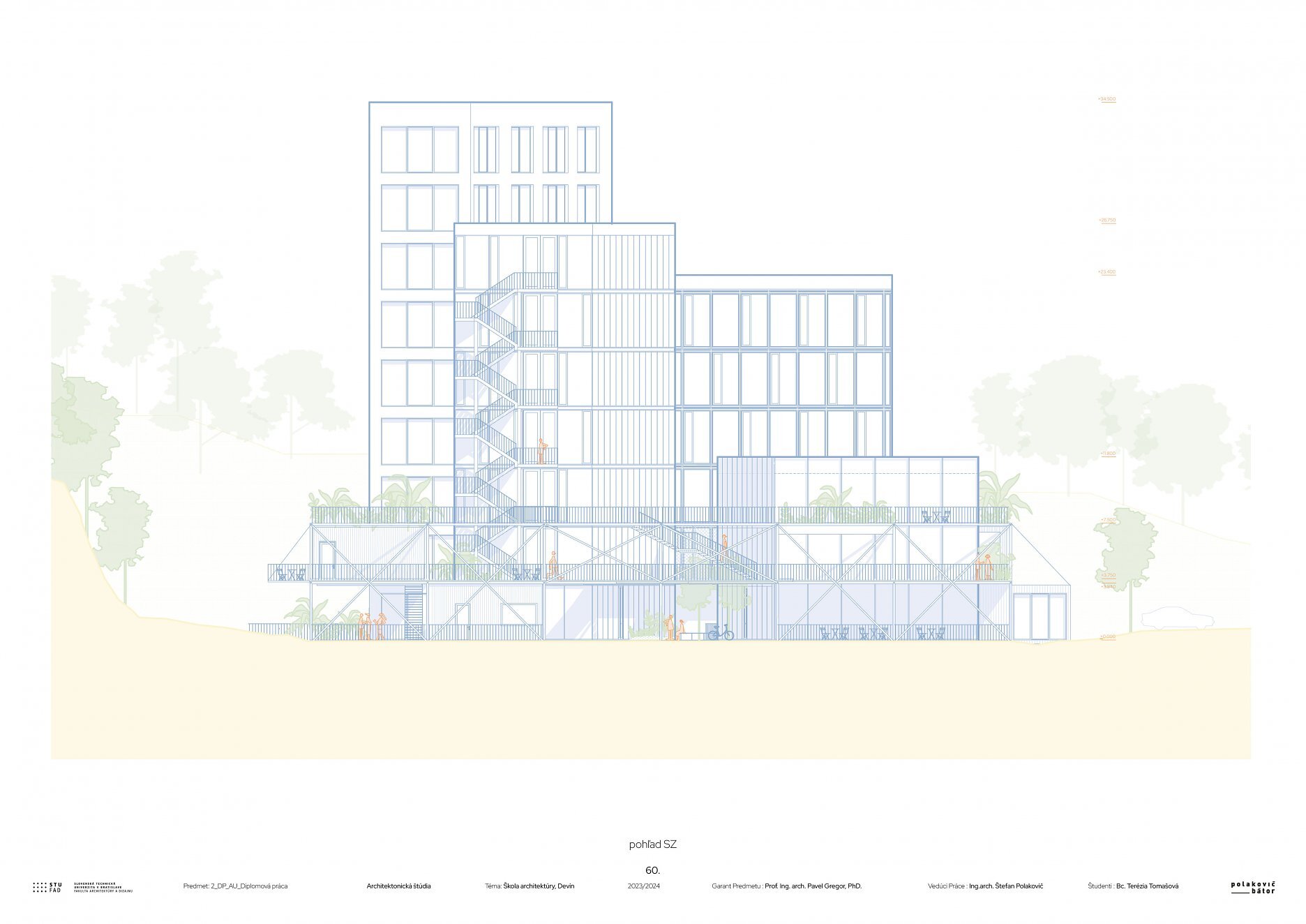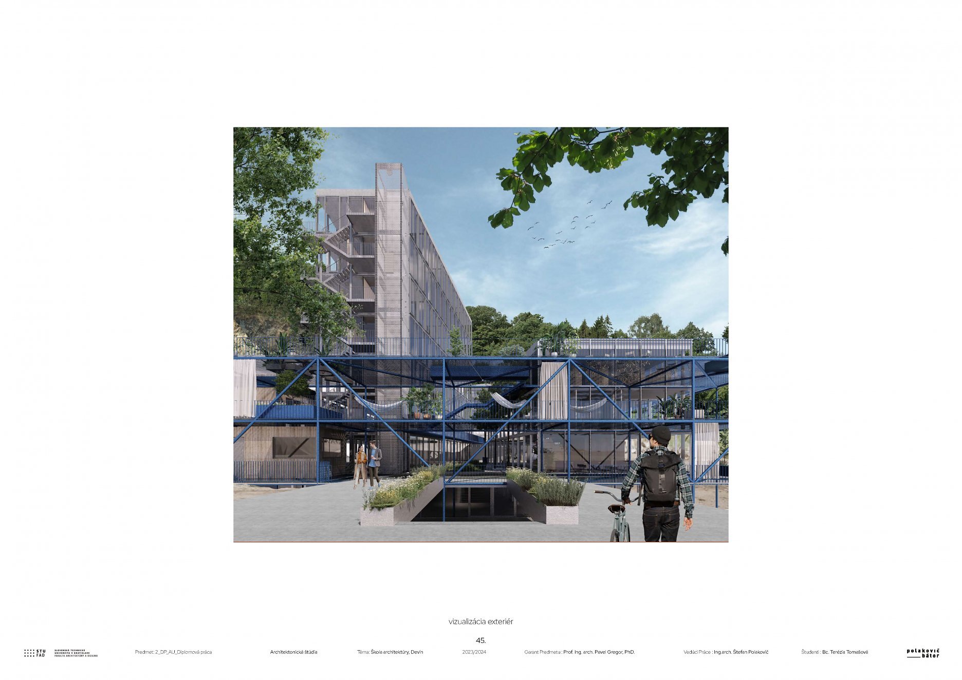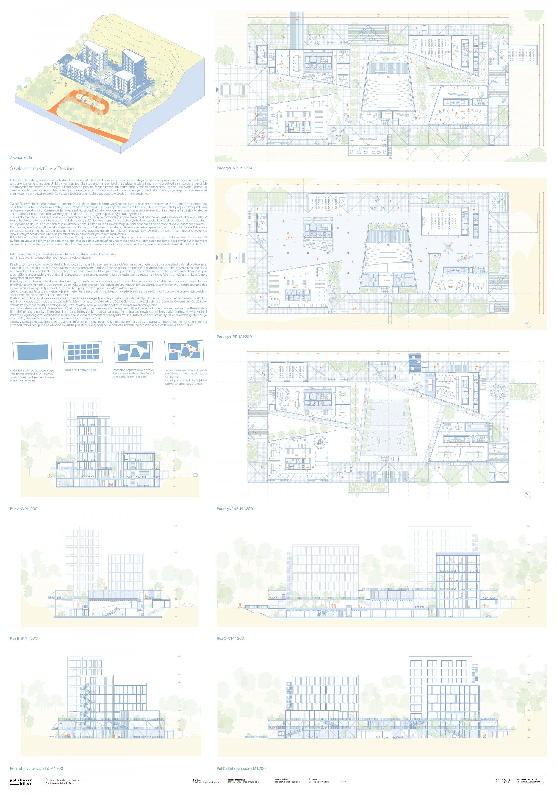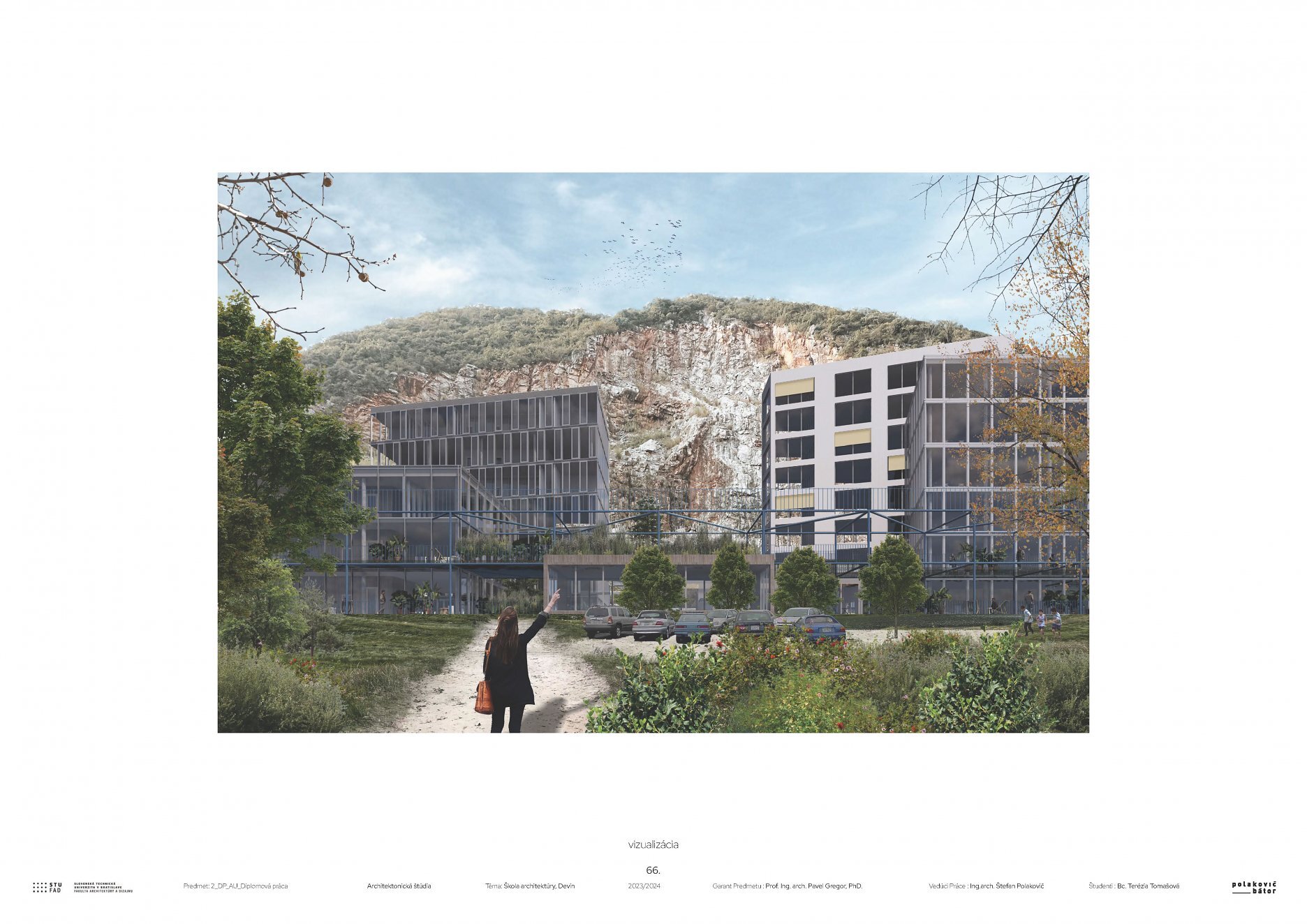 Dnes priblížime prácu "Škola architektúry v Devíne", ktorá vznikla na pôde Fakulty architektúry STU v Bratislave pod vedením Štefana Polakoviča. Diplomantka Terézia Tomašová sa v návrhu zameriava na spojenie vzdelávania, kultúry a prírody. Novonavrhnutá fakulta architektúry a dizajnu je situovaná v prírodnom prostredí Devínskeho kameňolomu. Rozdelenie fakulty na štyri hlavné celky umožňuje efektívne využitie priestoru. Centrálnym bodom je prednášková aula, ktorá slúži ako miesto vzdelávania a stretnutí. Exteriérový priestor plata funguje ako priestor pre aktivity, podporujúce interakciu študentov. Vyššie podlažia sú vyhradené pre študovne, ateliéry a kancelárie, ktoré sú navrhnuté s dôrazom na efektívne využitie svetla a priestoru. "V diplomovej práci som sa snažila pretvoriť želania profesorov a študentov do ideoého návrhu novej školy architektúry. Išlo prevažne o vytvorenie kvalitných, funkčných a reprezentatívnych priestorov pre štúdium v našom odbore," dopĺňa autorka.