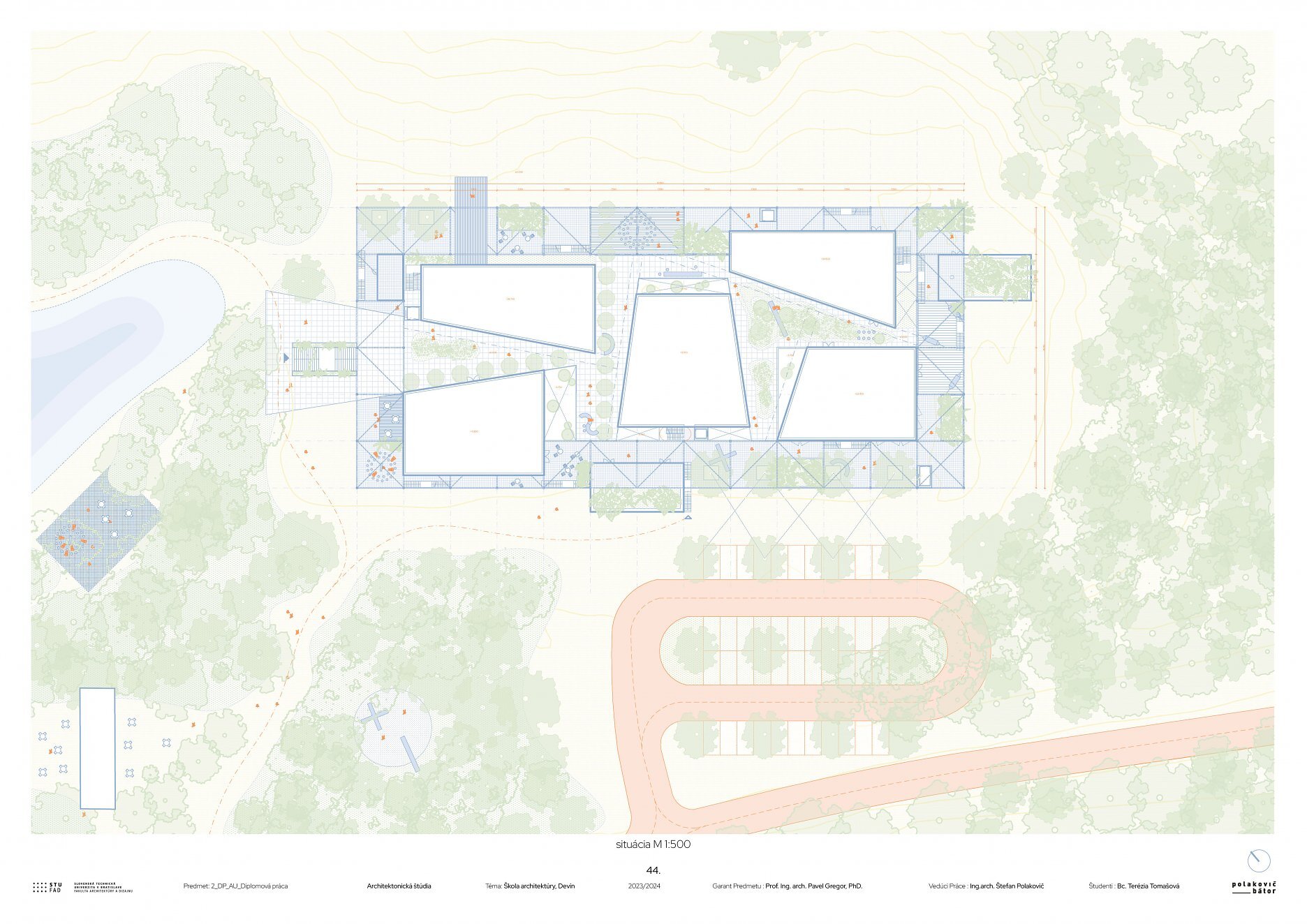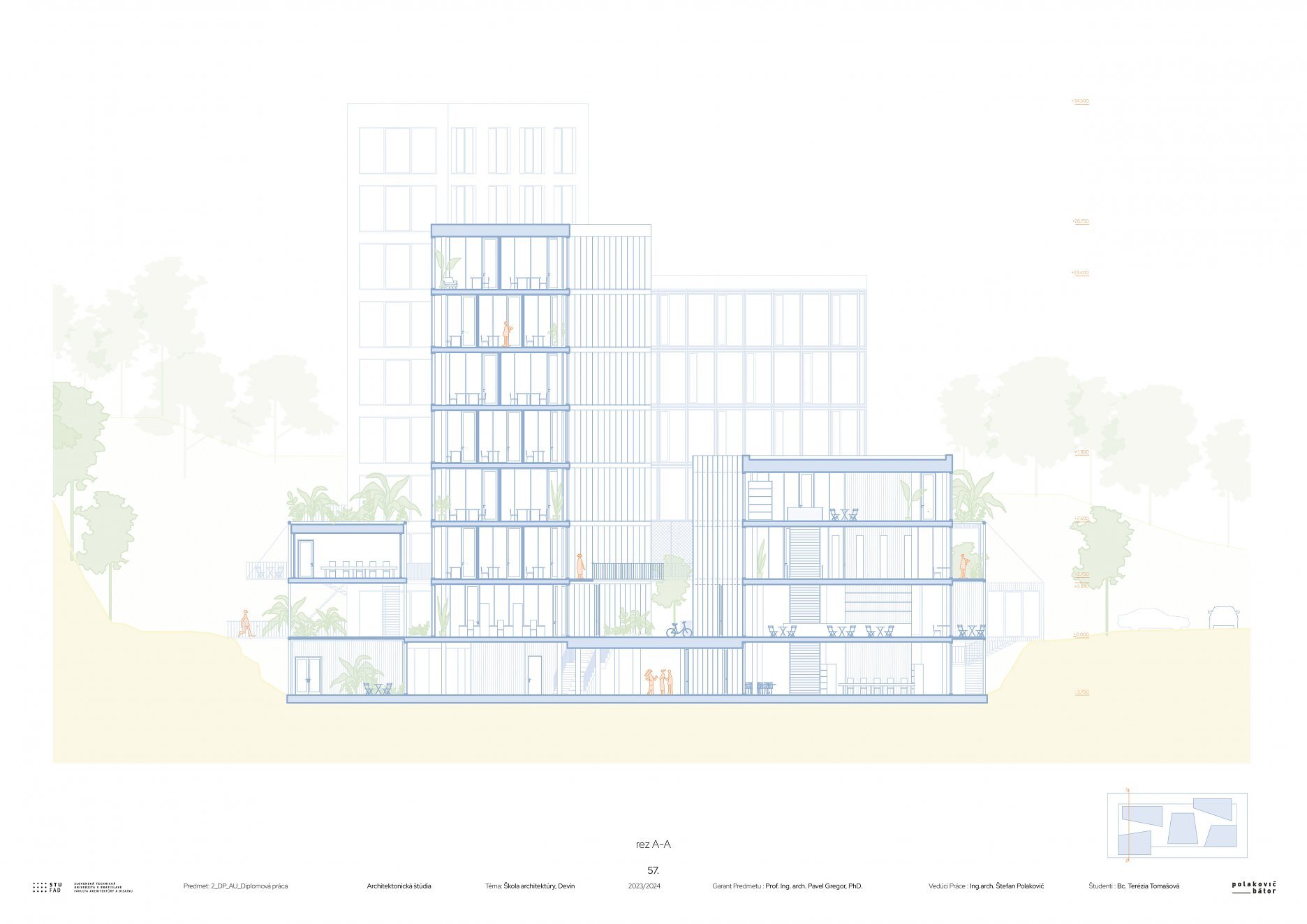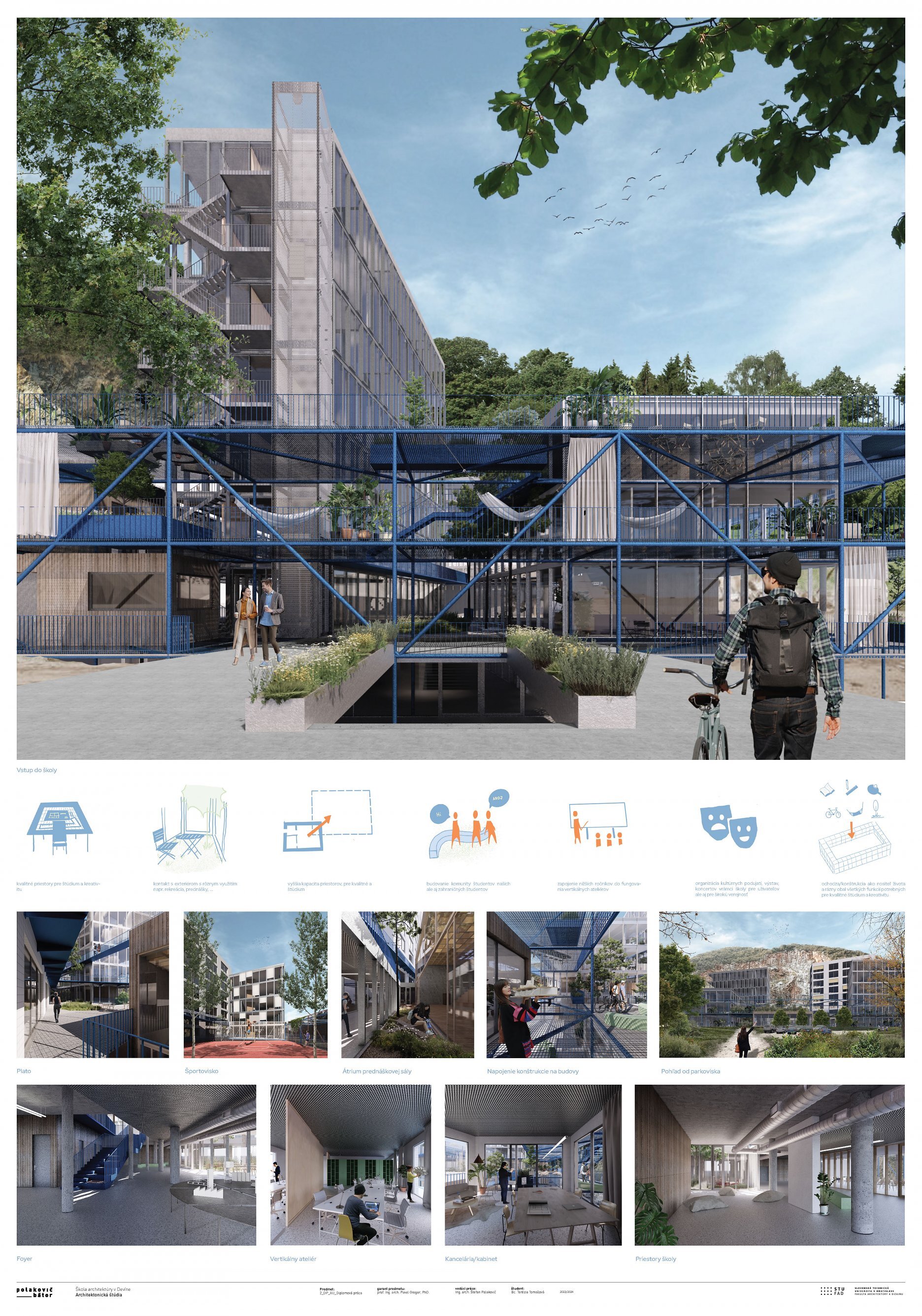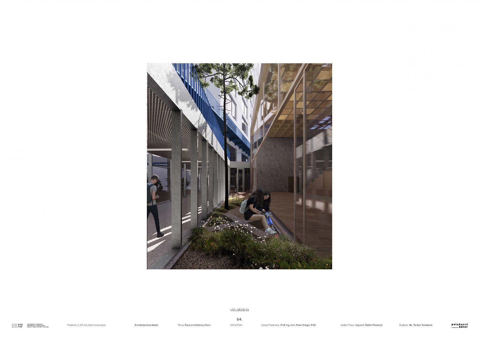 Dnes priblížime prácu "Škola architektúry v Devíne", ktorá vznikla na pôde Fakulty architektúry STU v Bratislave pod vedením Štefana Polakoviča. Diplomantka Terézia Tomašová sa v návrhu zameriava na spojenie vzdelávania, kultúry a prírody. Novonavrhnutá fakulta architektúry a dizajnu je situovaná v prírodnom prostredí Devínskeho kameňolomu. Rozdelenie fakulty na štyri hlavné celky umožňuje efektívne využitie priestoru. Centrálnym bodom je prednášková aula, ktorá slúži ako miesto vzdelávania a stretnutí. Exteriérový priestor plata funguje ako priestor pre aktivity, podporujúce interakciu študentov. Vyššie podlažia sú vyhradené pre študovne, ateliéry a kancelárie, ktoré sú navrhnuté s dôrazom na efektívne využitie svetla a priestoru. "V diplomovej práci som sa snažila pretvoriť želania profesorov a študentov do ideoého návrhu novej školy architektúry. Išlo prevažne o vytvorenie kvalitných, funkčných a reprezentatívnych priestorov pre štúdium v našom odbore," dopĺňa autorka.