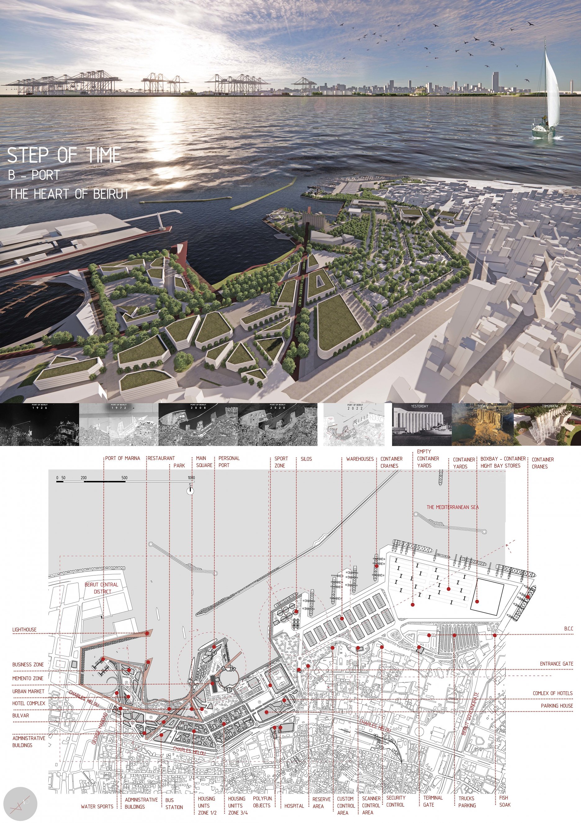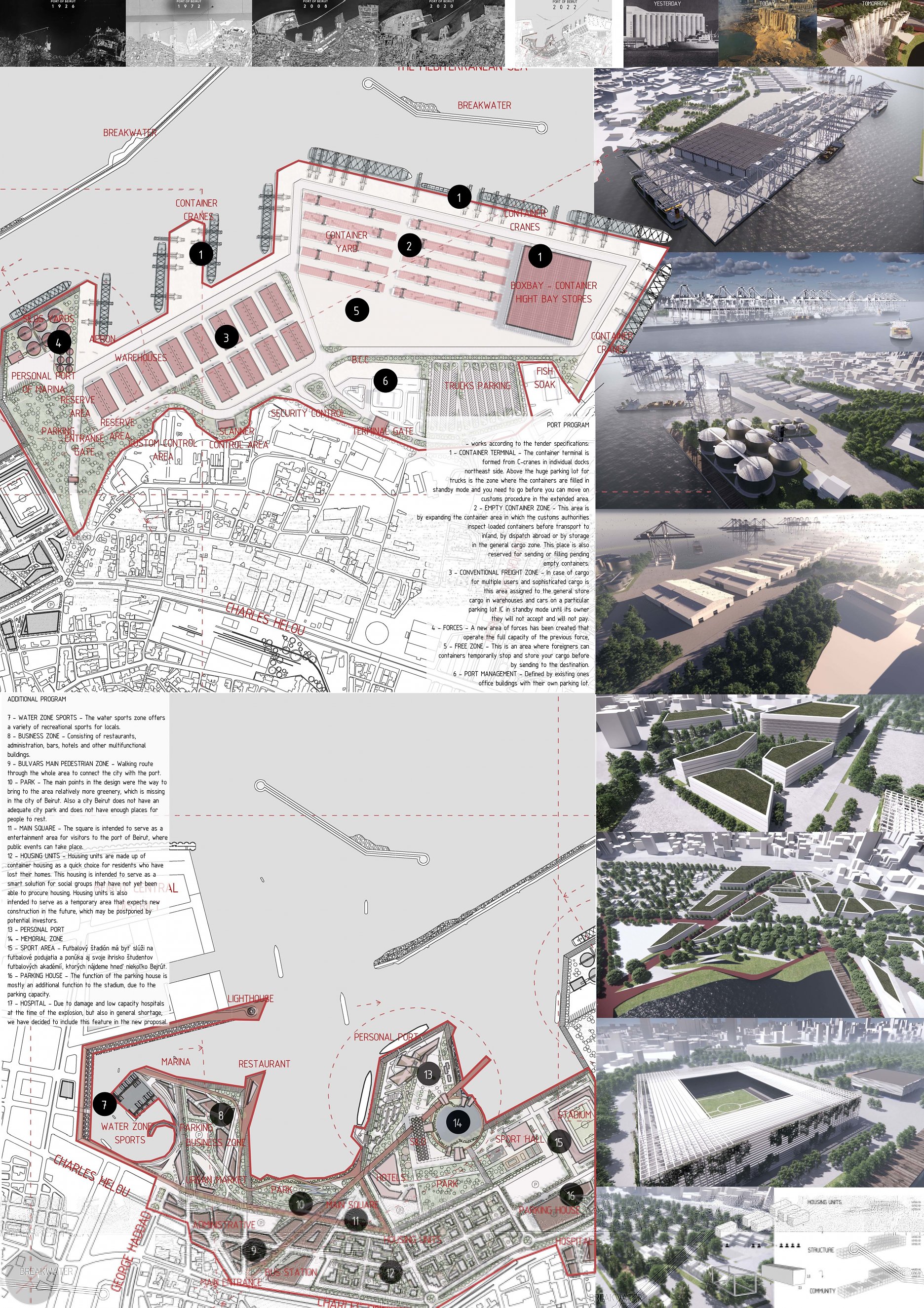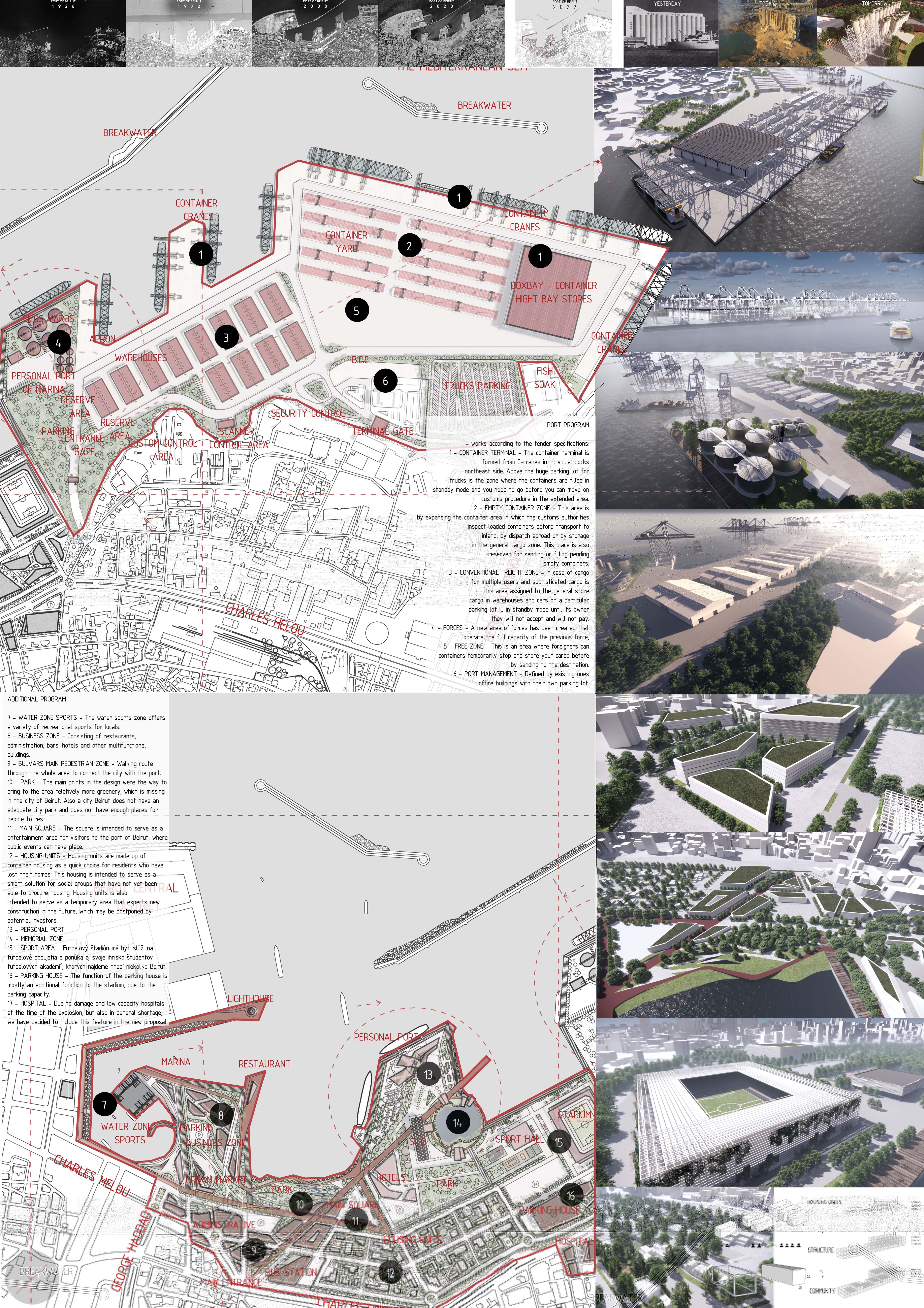 The work was based mainly on the assignment we received from the announcer and the organizer of the competition. The assignment is based on creation of the new port not only as an architectural element but also as a city zoning plan. Use of expensive land to support the economy, the economy, services and trade. The proposed solution is divided into 2 main parts, with the first and main part being the new port and the second part being solved as an additional program for the public. The new port is designed according to the main 7 parts of the Beirut port, which is supplemented by new possibilities that the new port offers us, such as a form of container storage, use of the coast, port management. An important point was to return the port's ability to engage in world trade markets.