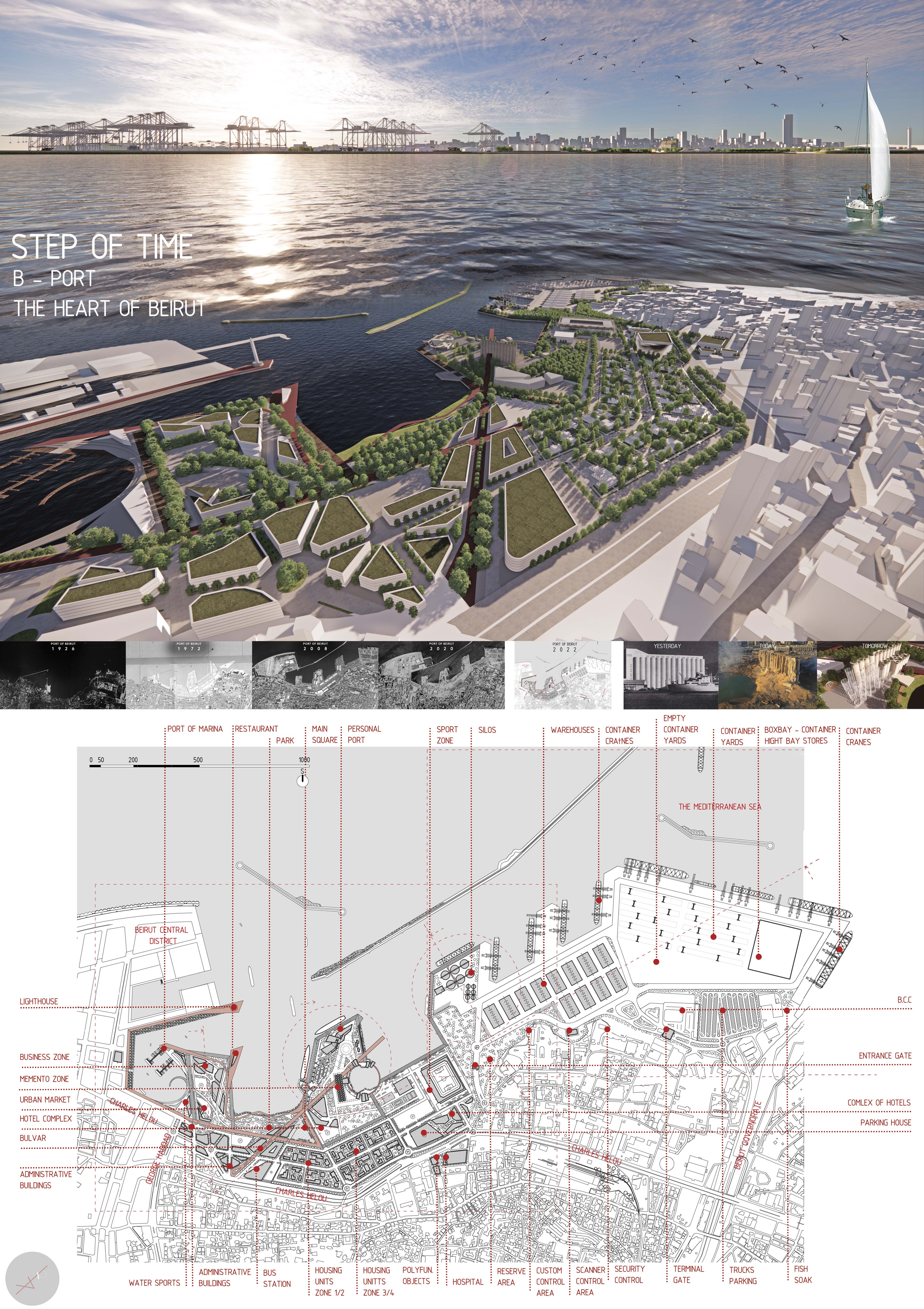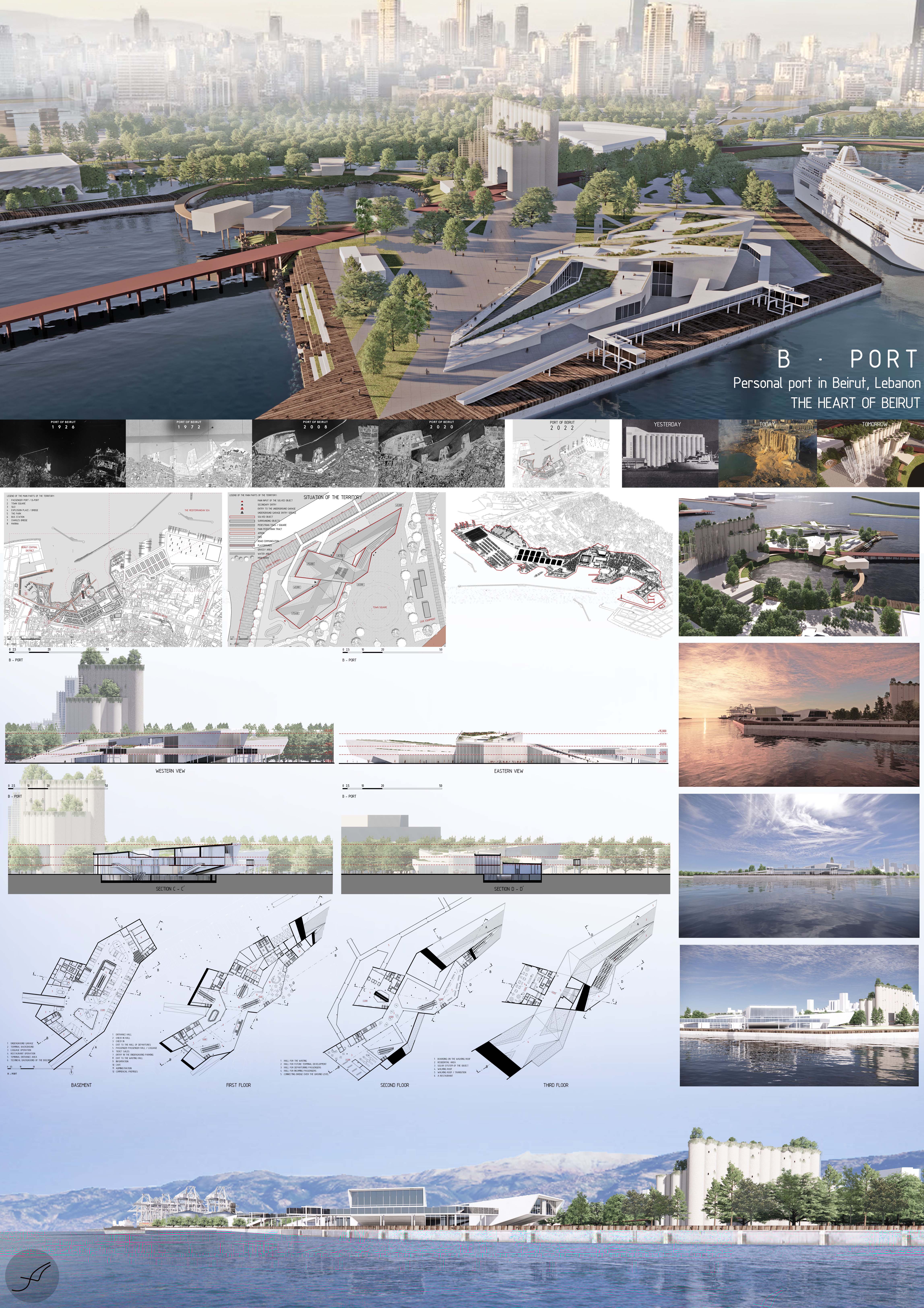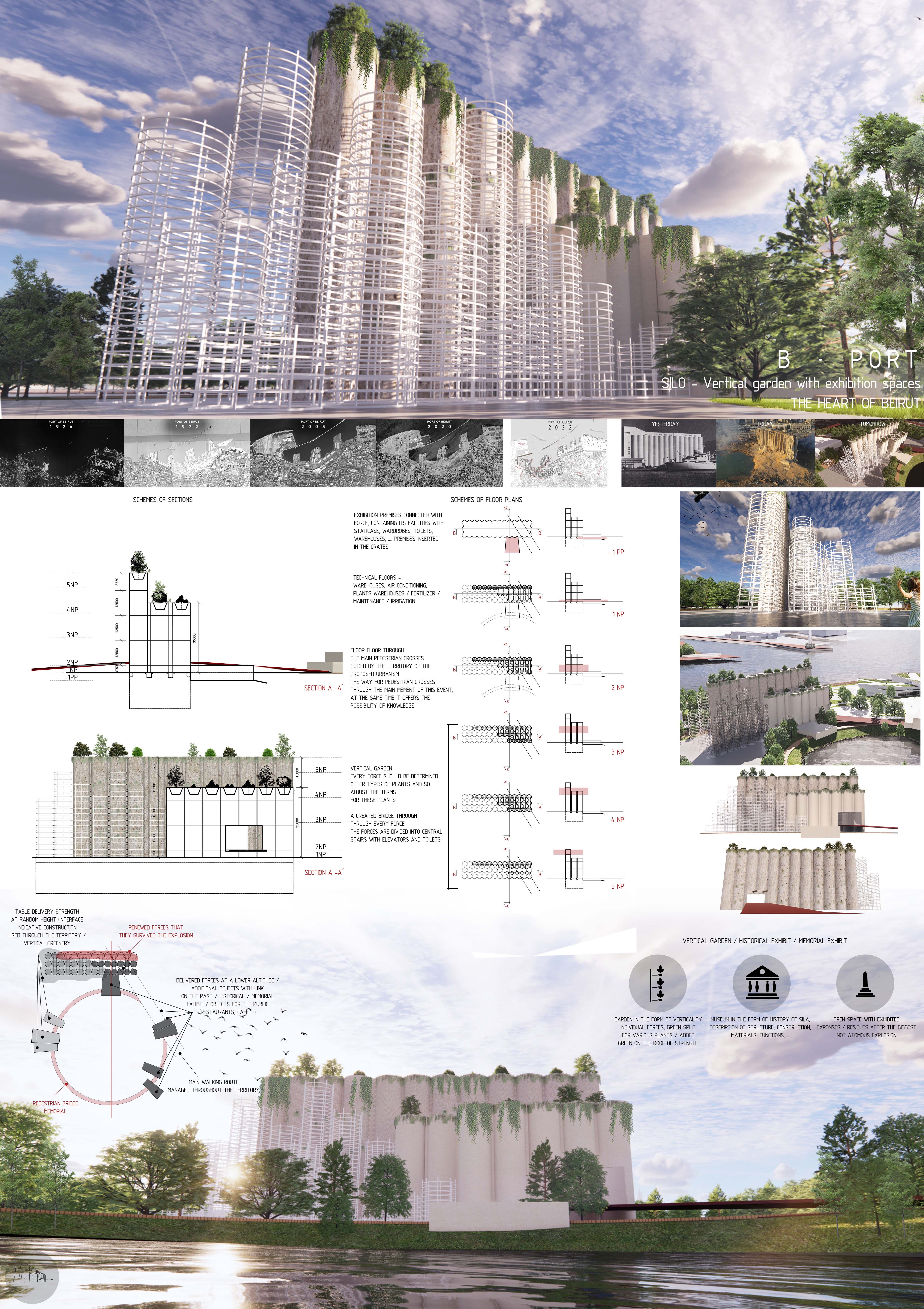 The work was based mainly on the assignment we received from the announcer and the organizer of the competition. The assignment is based on creation of the new port not only as an architectural element but also as a city zoning plan. Use of expensive land to support the economy, the economy, services and trade. The proposed solution is divided into 2 main parts, with the first and main part being the new port and the second part being solved as an additional program for the public. The new port is designed according to the main 7 parts of the Beirut port, which is supplemented by new possibilities that the new port offers us, such as a form of container storage, use of the coast, port management. An important point was to return the port's ability to engage in world trade markets.