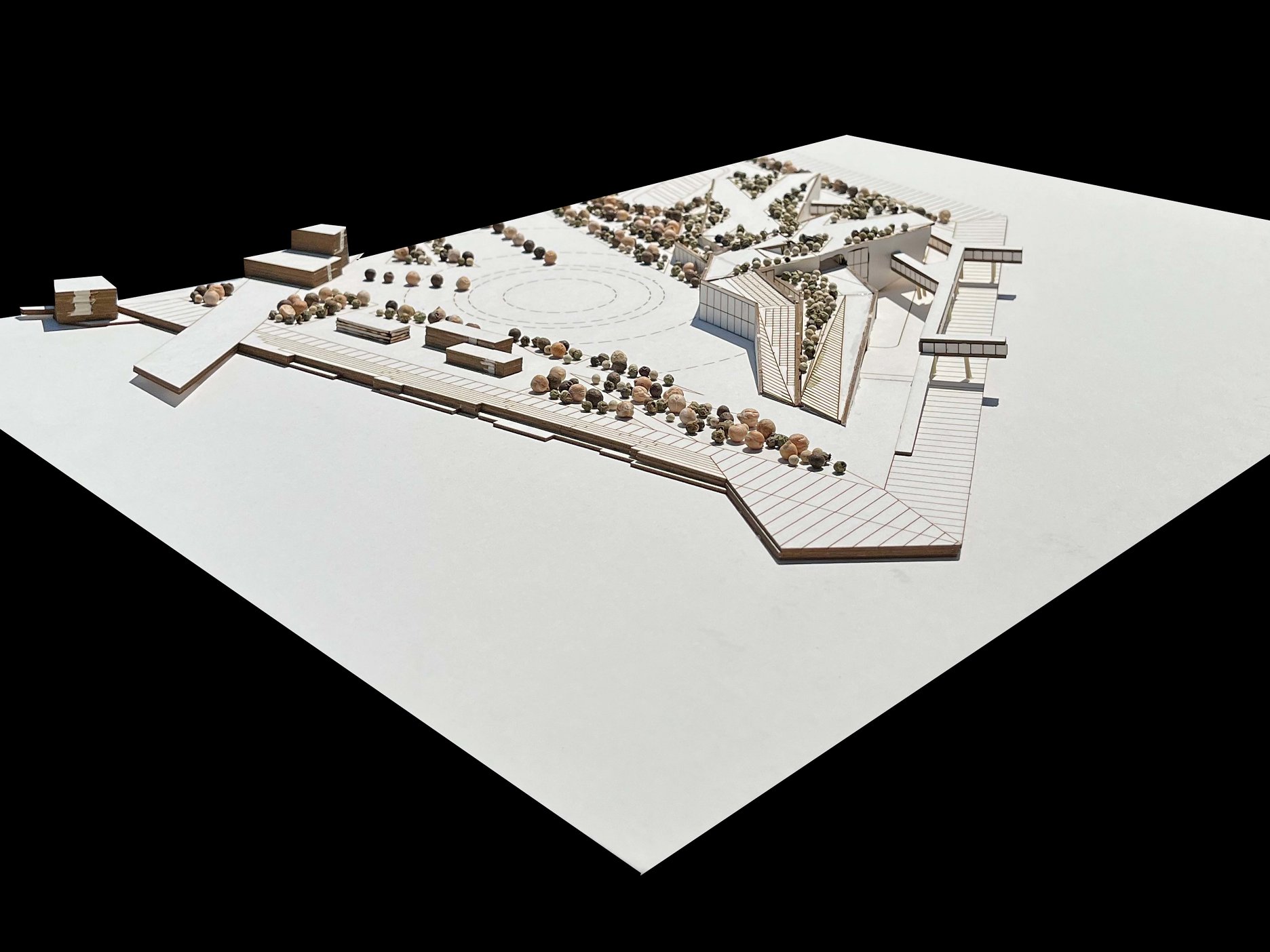 ...Koncepcia terminálu osobného prístavu vychádza z viacerých aspektov. Hmota, pozvoľne vyrastajúca z terénu, umožňuje využiť stúpajúcu strechu so zaujímavými výhľadmi do okolia a hlavným priehľadom na silo a miesto výbuchu...
