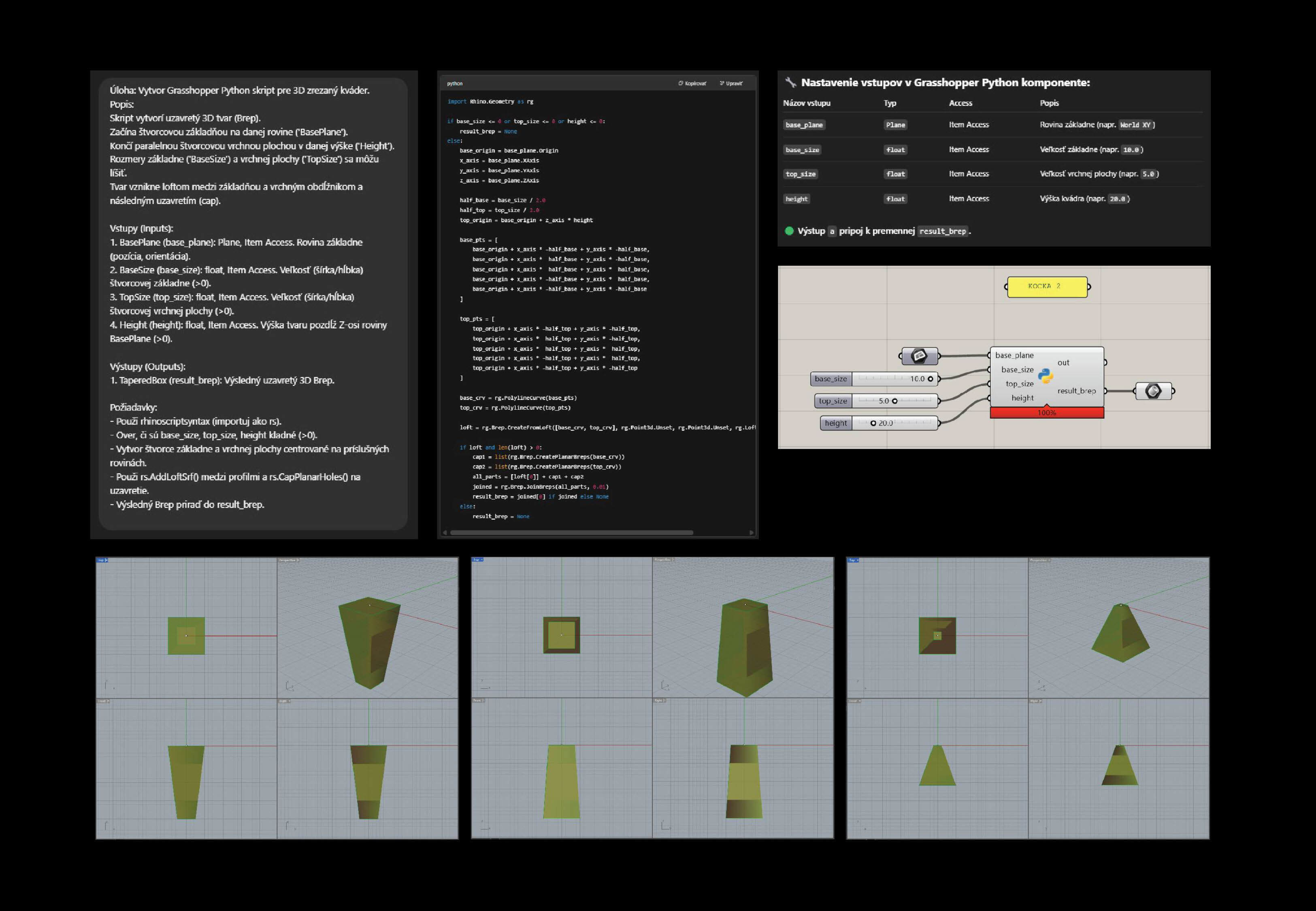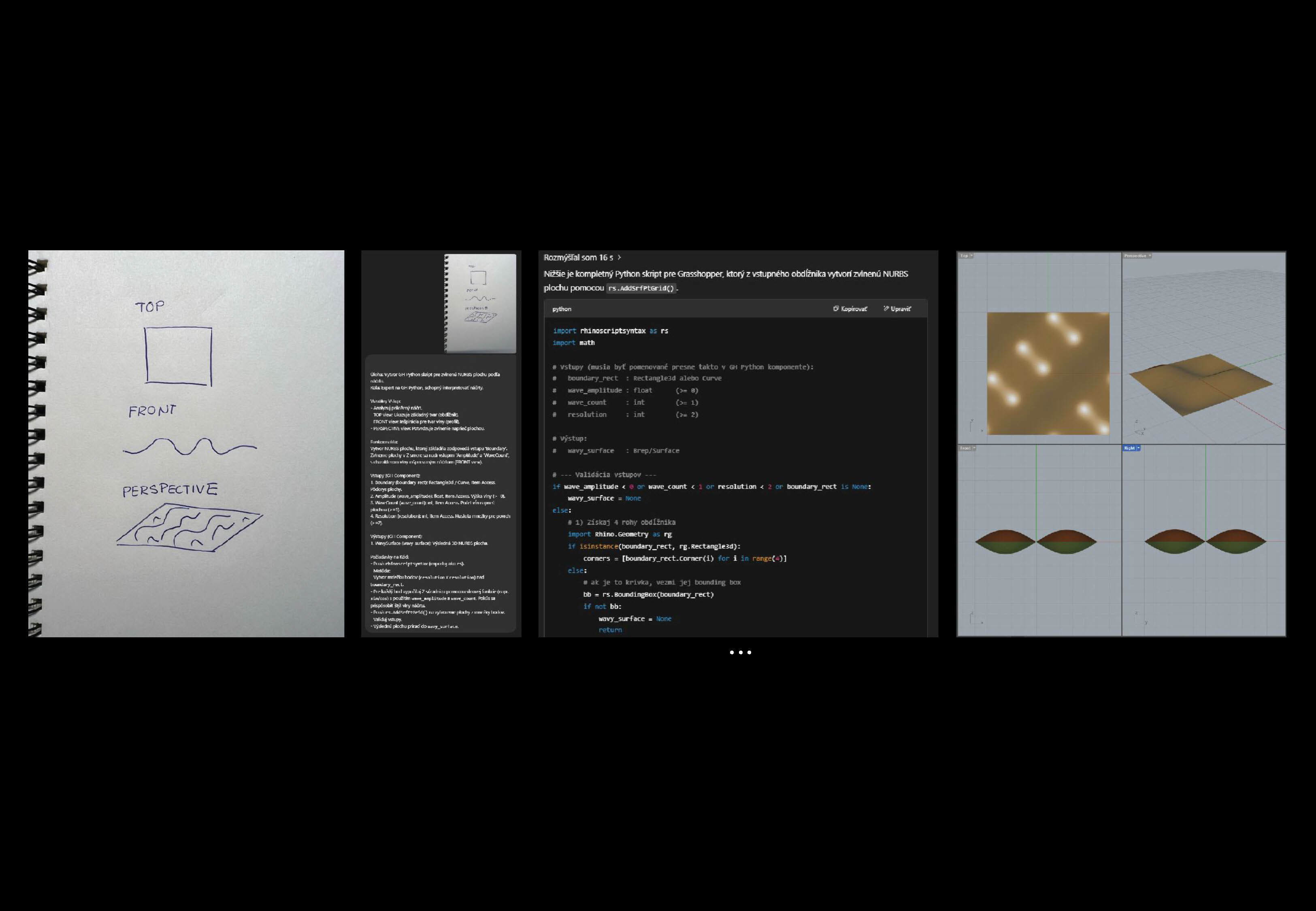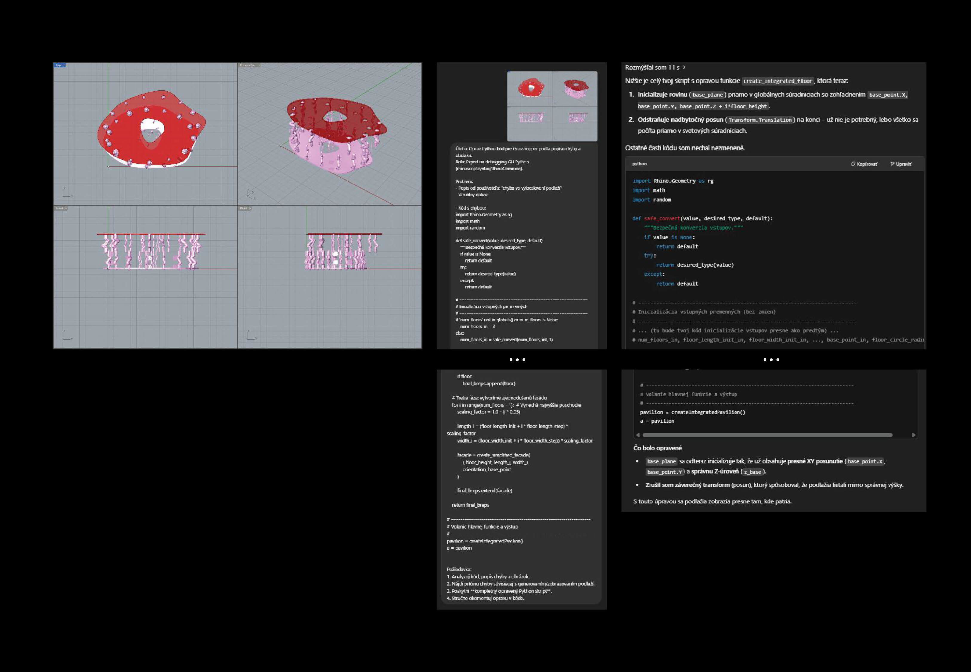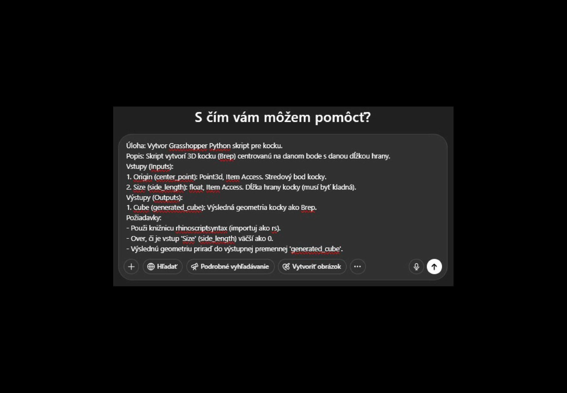 Na základe navrhnutého workflow autorka využíva konverzačného agenta na generovanie Python skriptov pre Rhino a Grasshopper a preklad textového zadania do parametrickej 3D geometrie. Práca mapuje možnosti a limity LLM pri tvorbe a ladení kódu, sleduje vplyv voľby parametrov na výsledný tvar, navrhuje postupy debugovania a porovnáva modely podľa spoľahlivosti a kvality výstupu. Teoretická časť otvára otázky autorstva, zodpovednosti a etiky dát. Cieľom je prakticky ukázať, ako môže AI fungovať ako spolutvorca a zároveň kontrolovateľný nástroj v architektonickej praxi.
