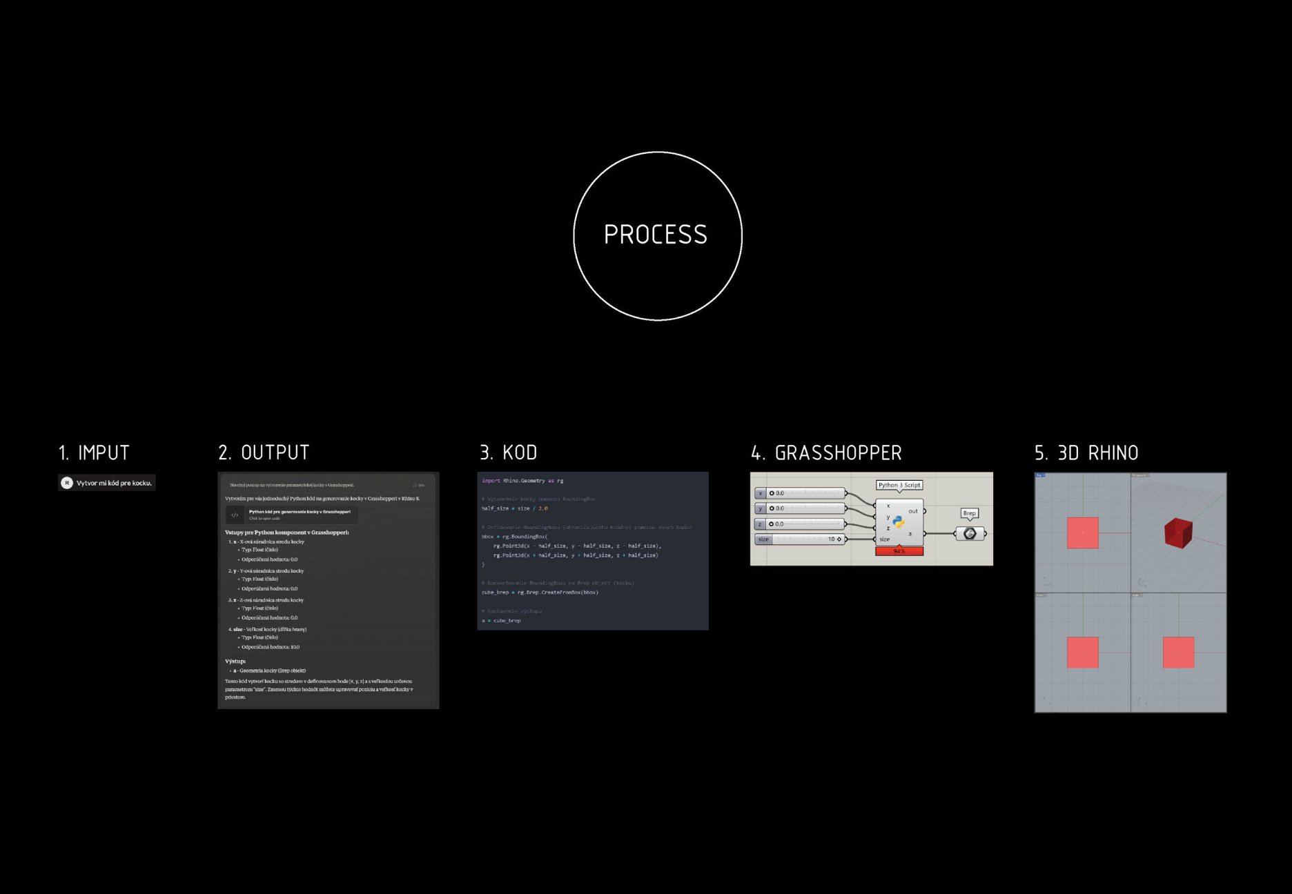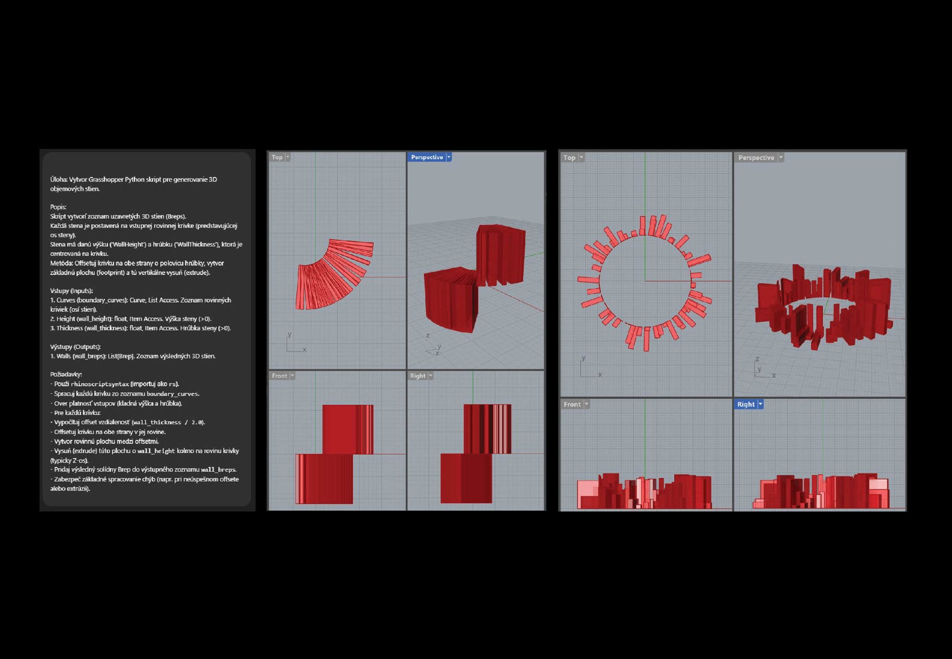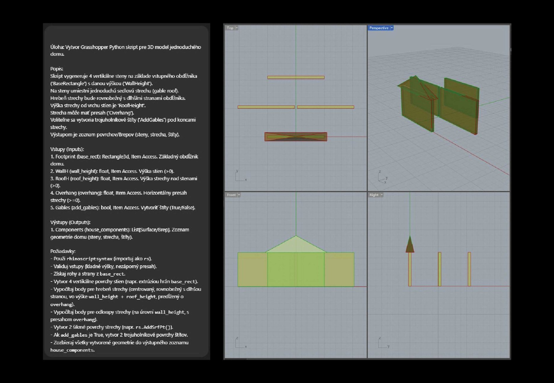 Na základe navrhnutého workflow autorka využíva konverzačného agenta na generovanie Python skriptov pre Rhino a Grasshopper a preklad textového zadania do parametrickej 3D geometrie. Práca mapuje možnosti a limity LLM pri tvorbe a ladení kódu, sleduje vplyv voľby parametrov na výsledný tvar, navrhuje postupy debugovania a porovnáva modely podľa spoľahlivosti a kvality výstupu. Teoretická časť otvára otázky autorstva, zodpovednosti a etiky dát. Cieľom je prakticky ukázať, ako môže AI fungovať ako spolutvorca a zároveň kontrolovateľný nástroj v architektonickej praxi.